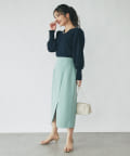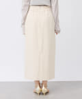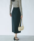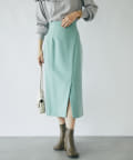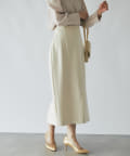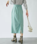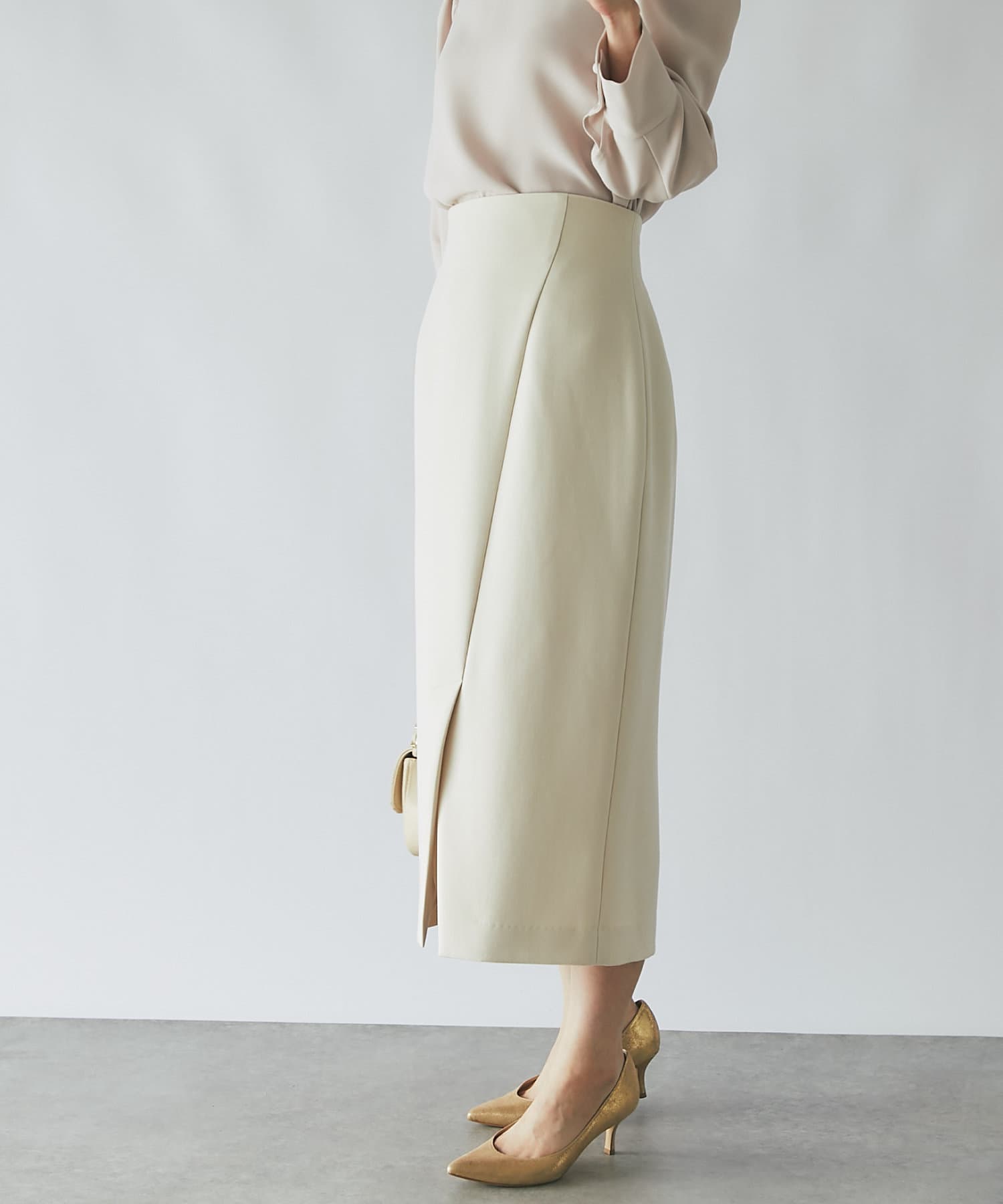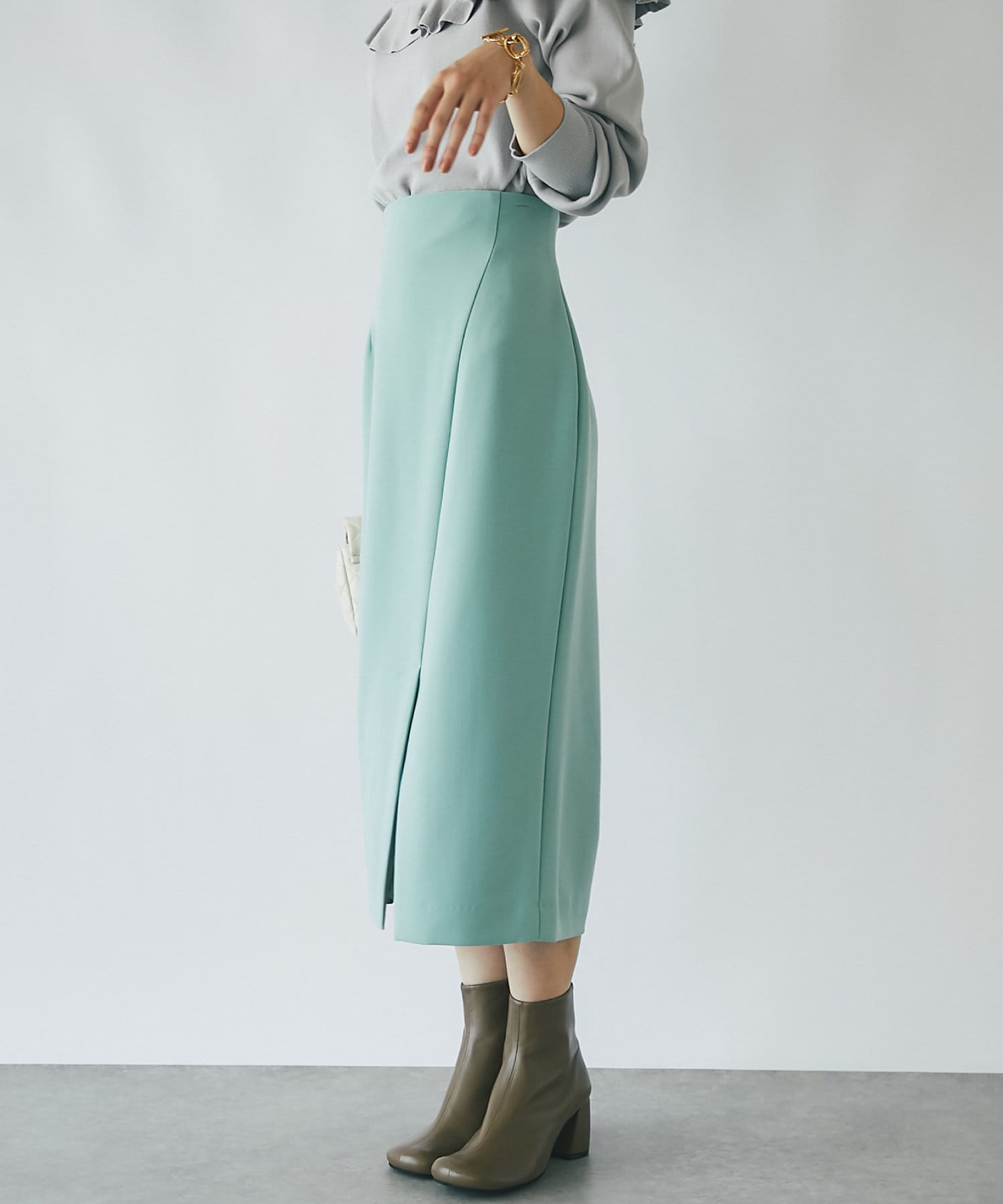 ハイウエストと斜め切り替えのフロントスリット入りのナロースカート。