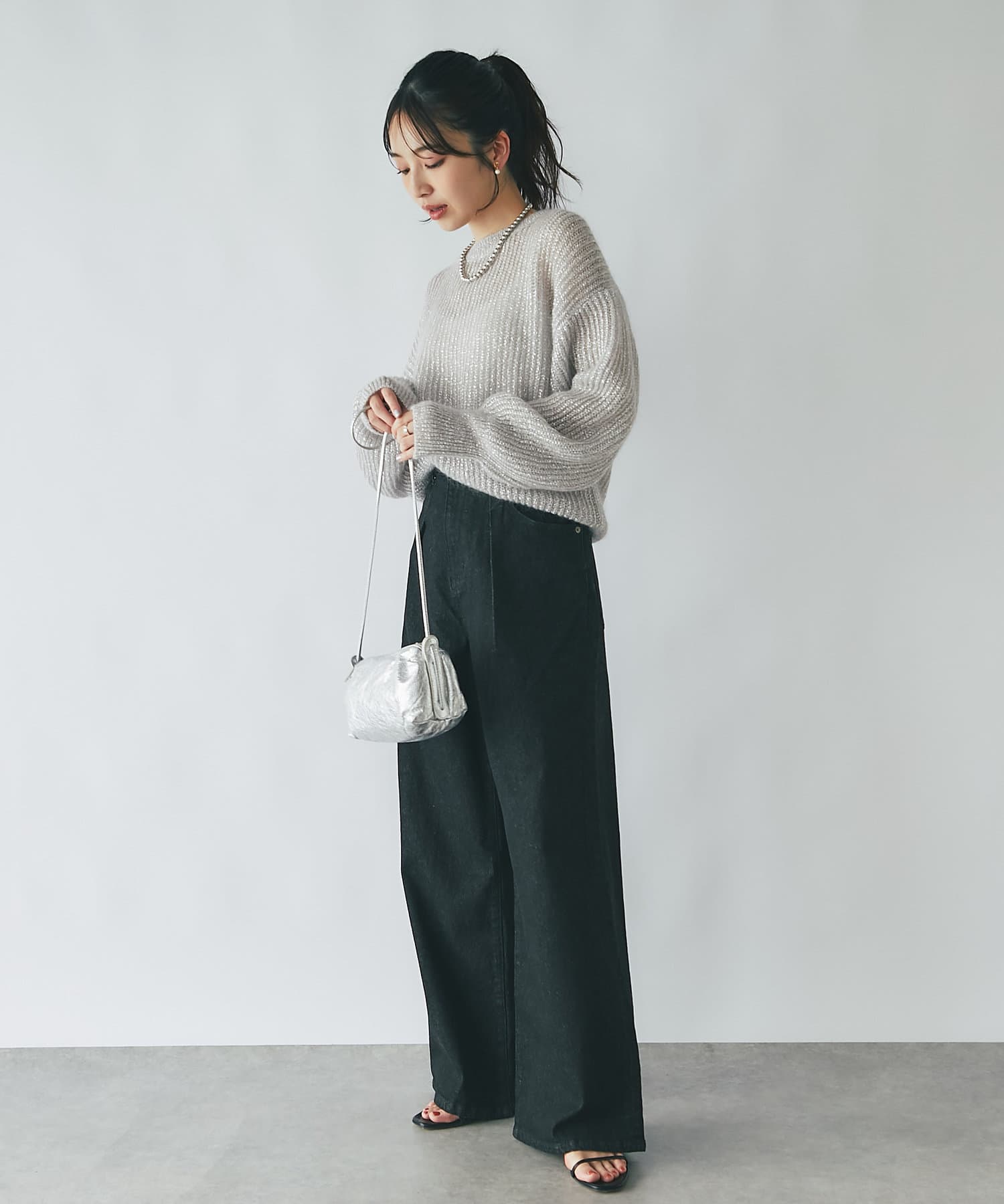 トレンドのクロップド丈トップスに合わせたスタイリングがおすすめです。