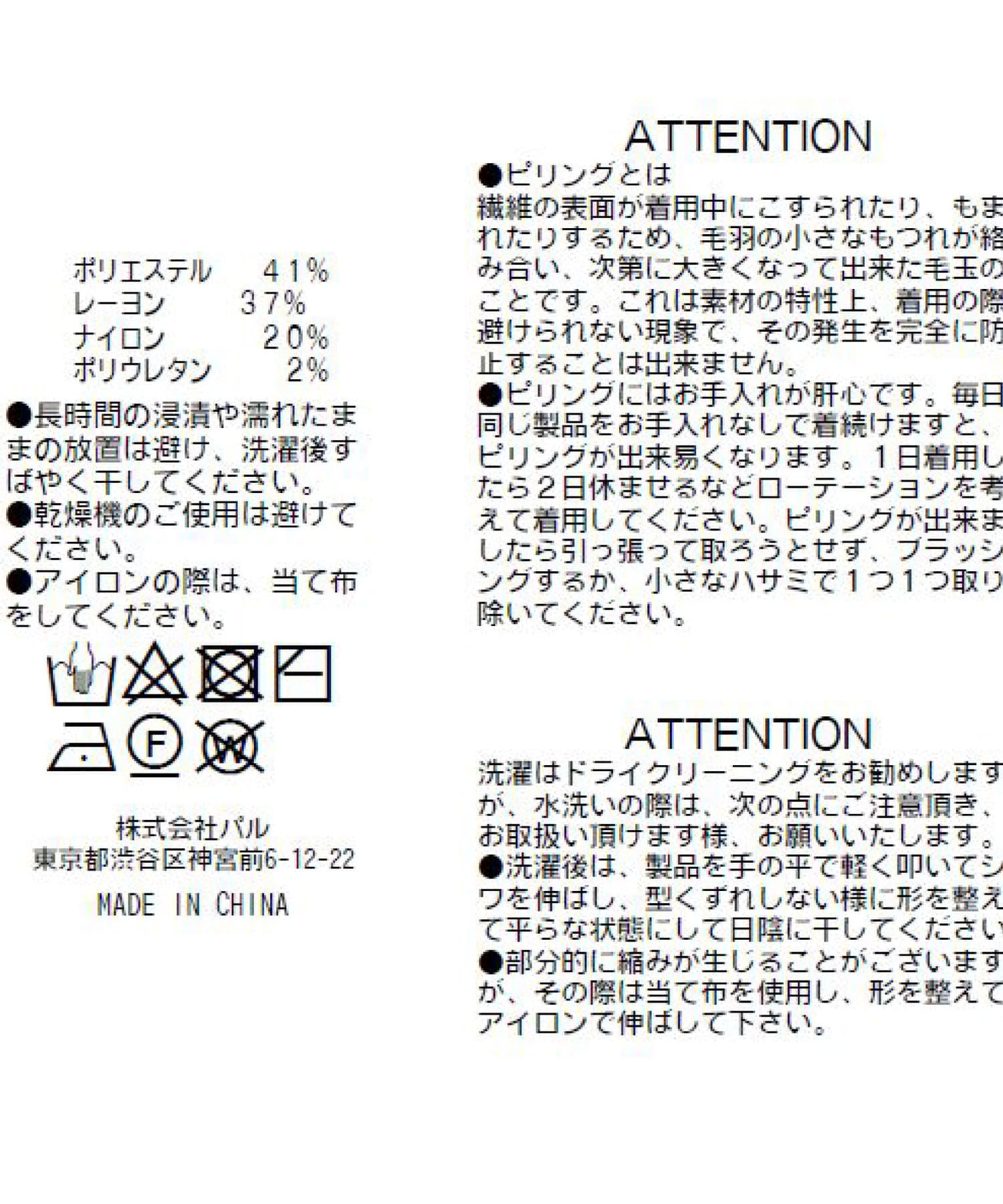ポリエステル41% レーヨン37% ナイロン20% ポリウレタン2%