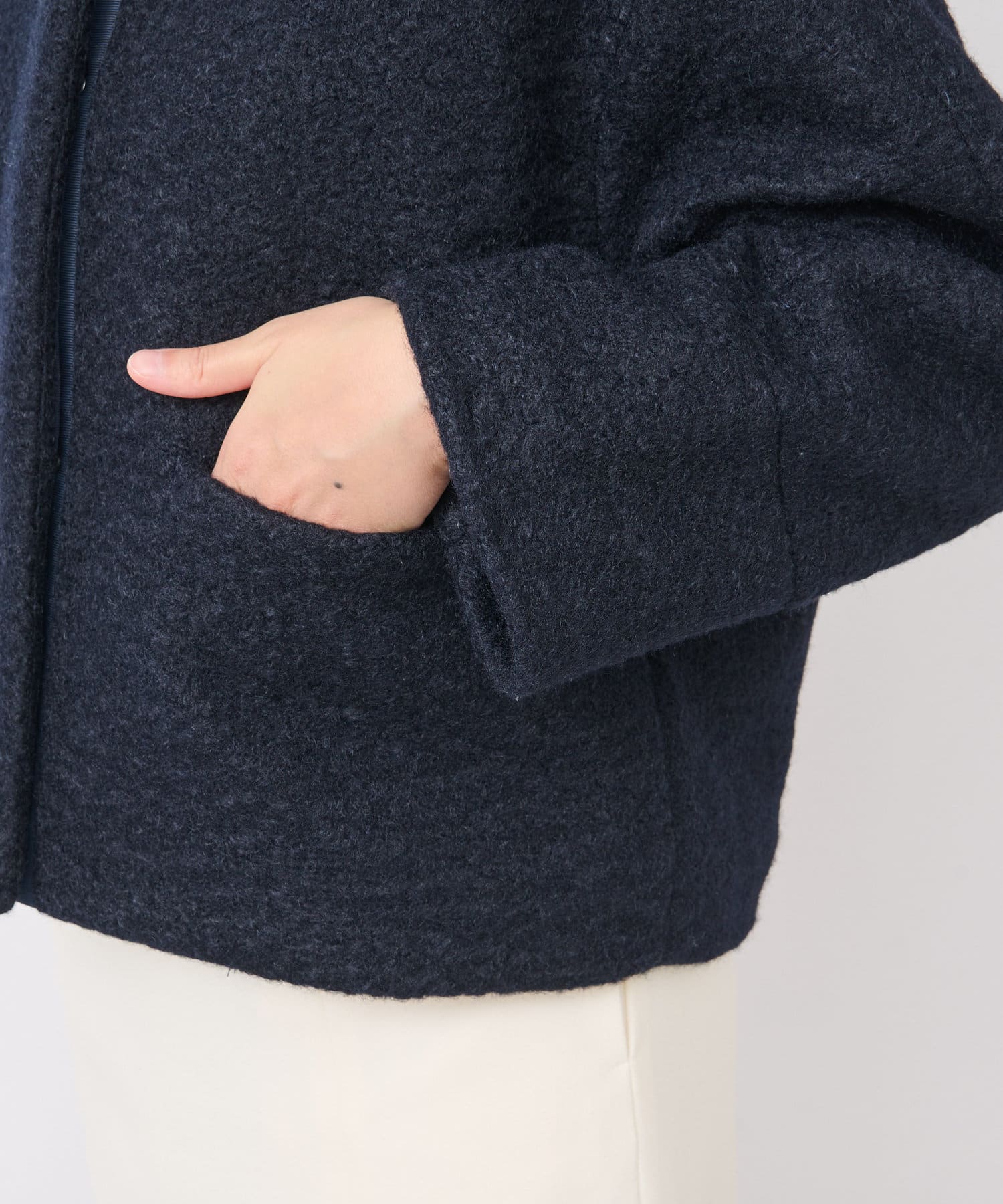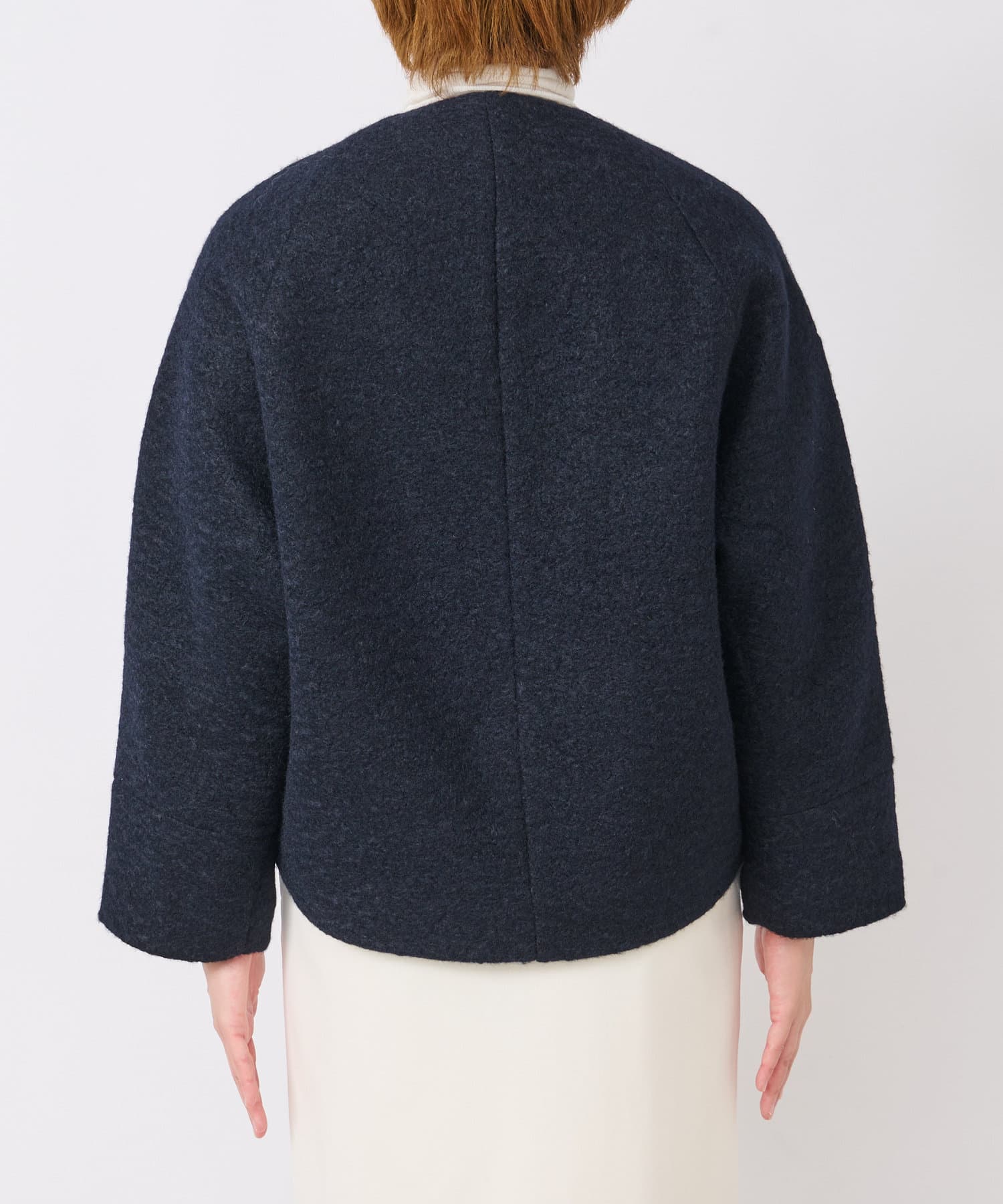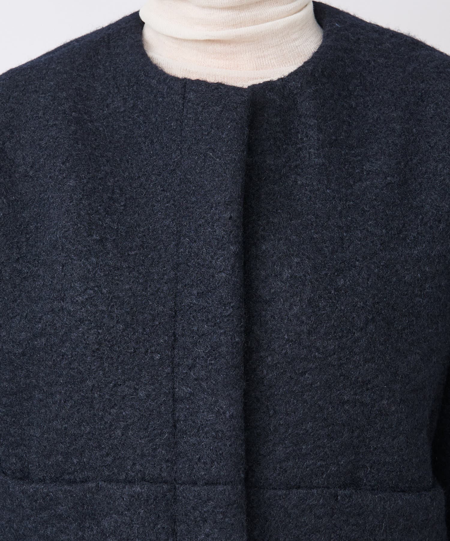 コンパクトなクロップド丈とすっきりノーカラーデザインで