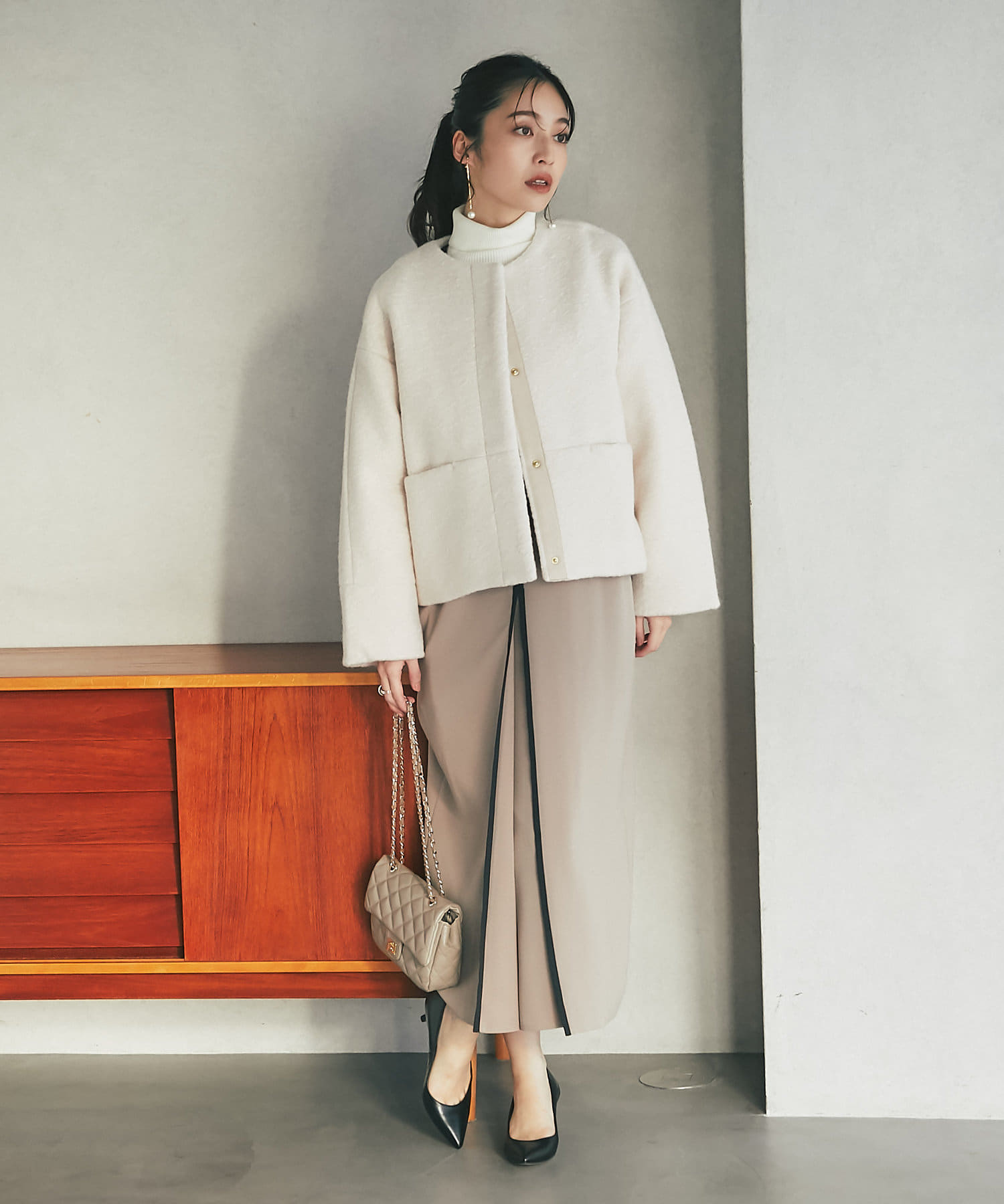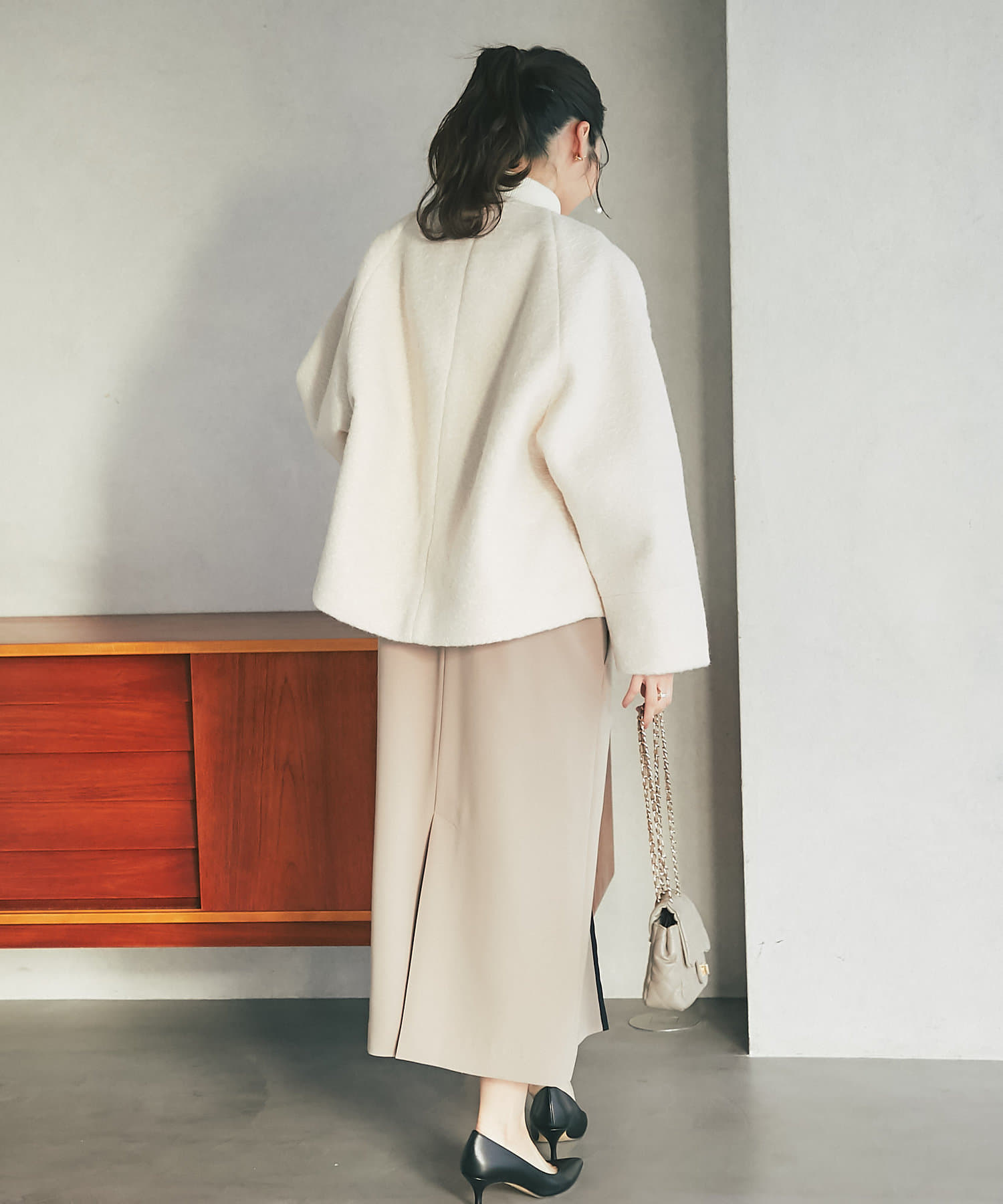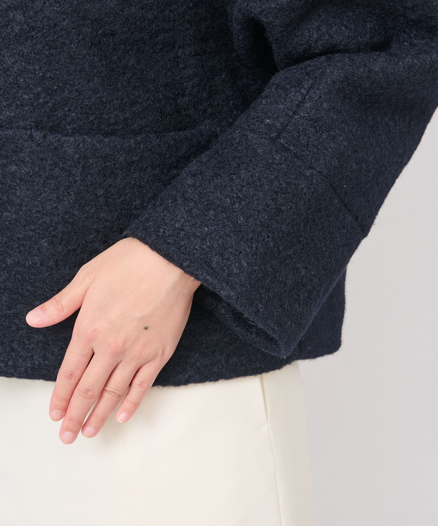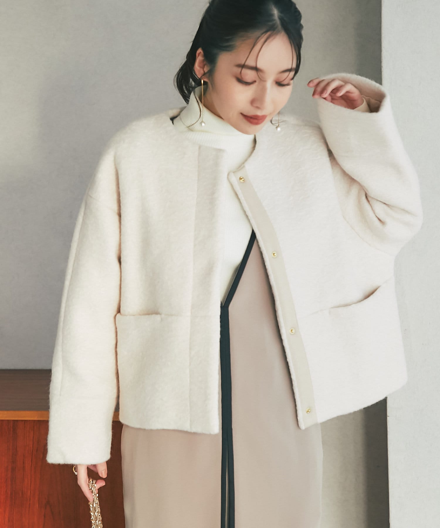 コンパクトなクロップド丈とすっきりノーカラーデザインで