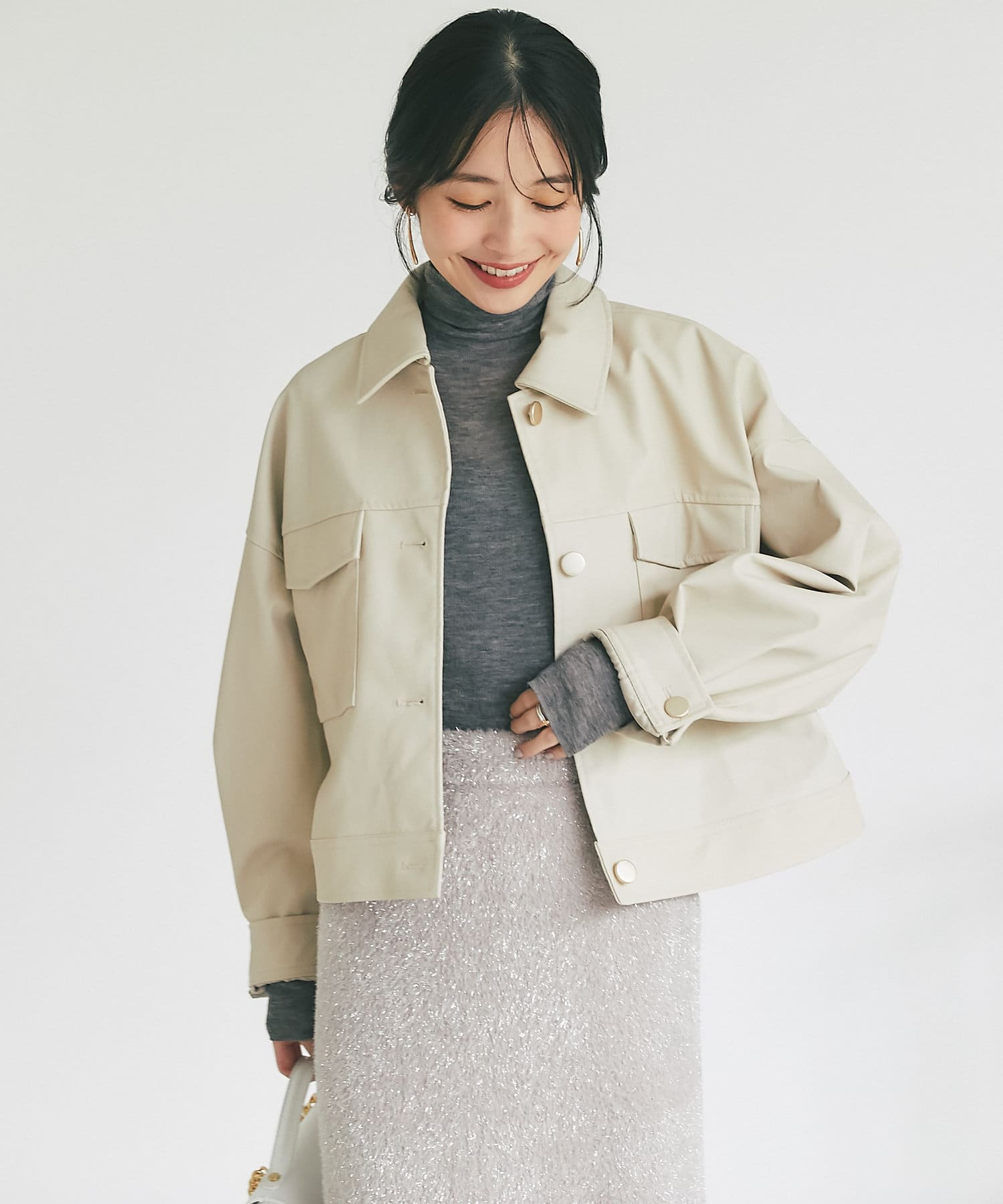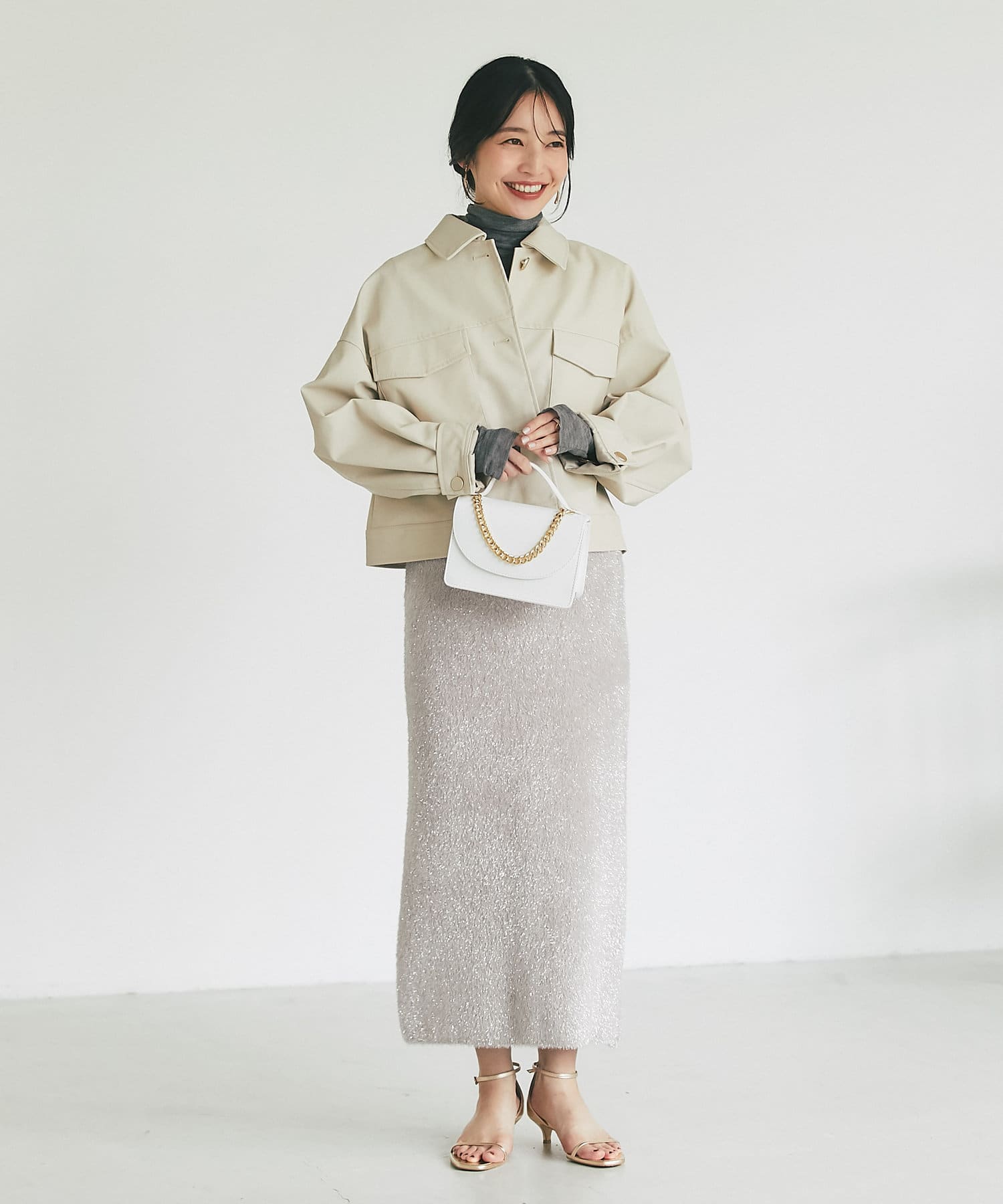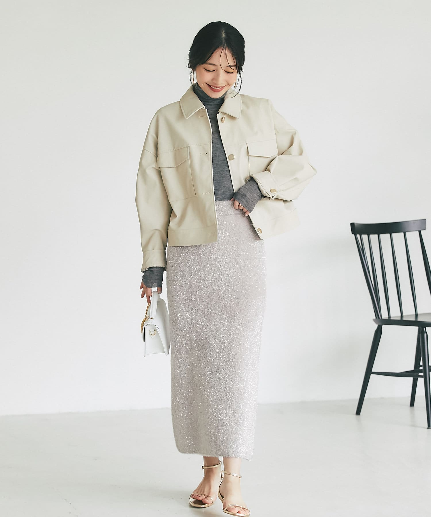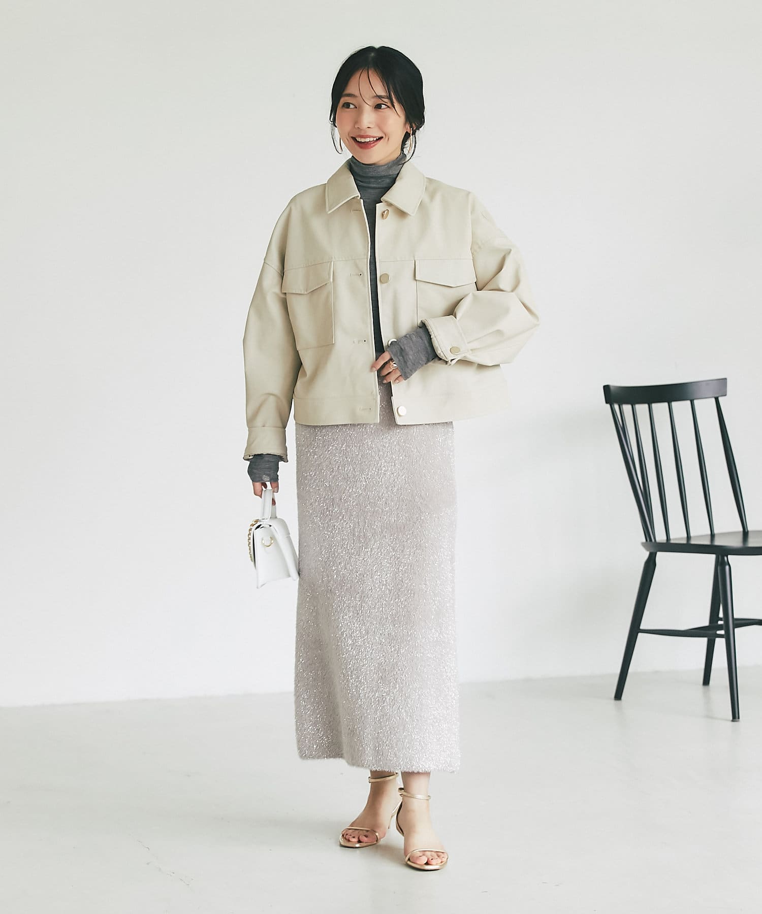クロップド丈を活かして、ハイウエストのボトムやワンピース合わせがおすすめ。