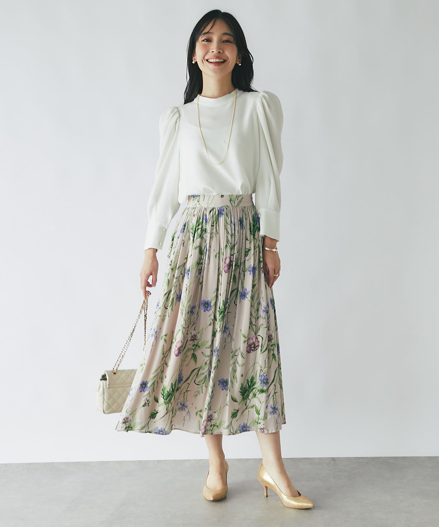 シンプルなトップスを合わせるだけでフェミニンスタイルが完成します。