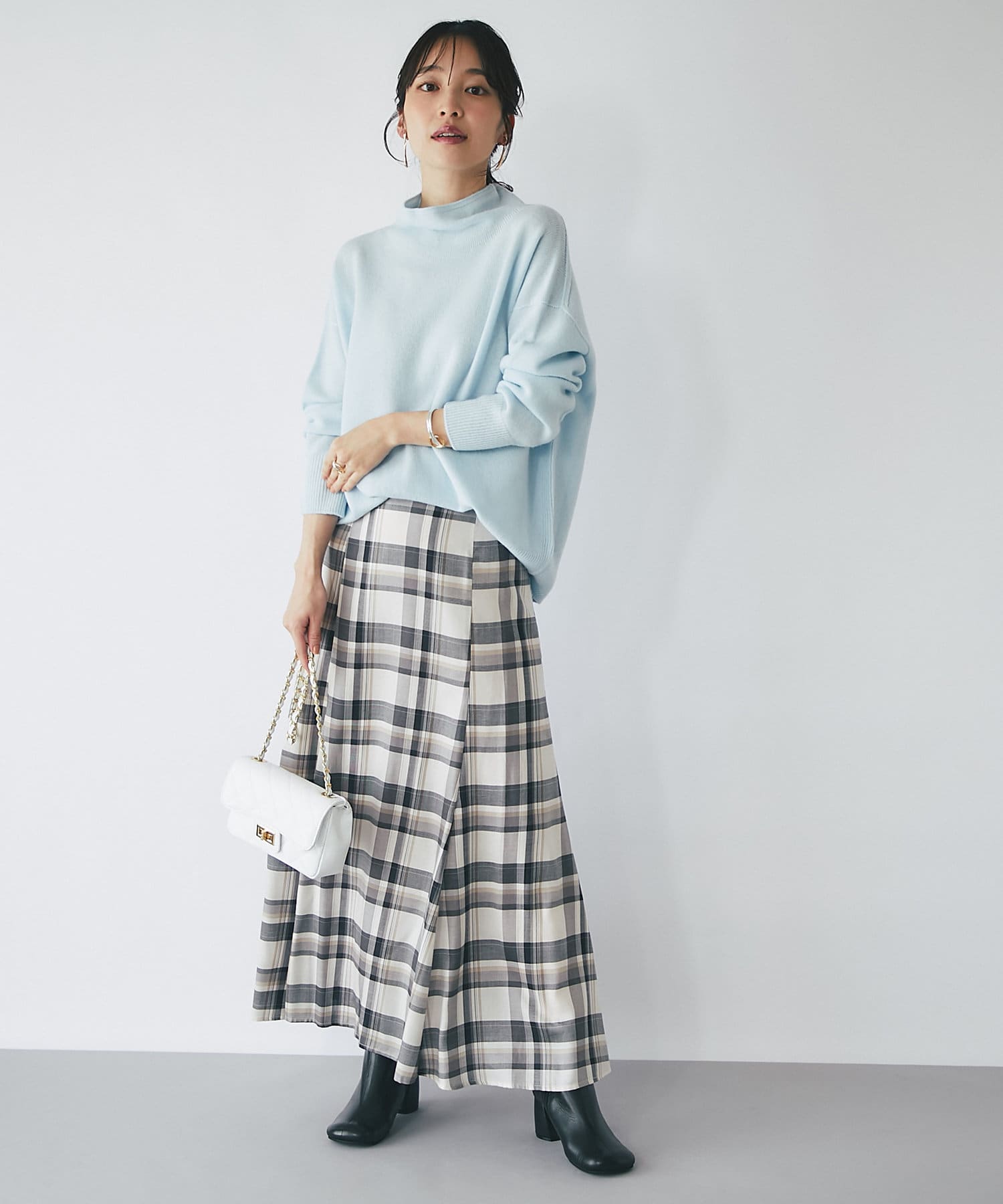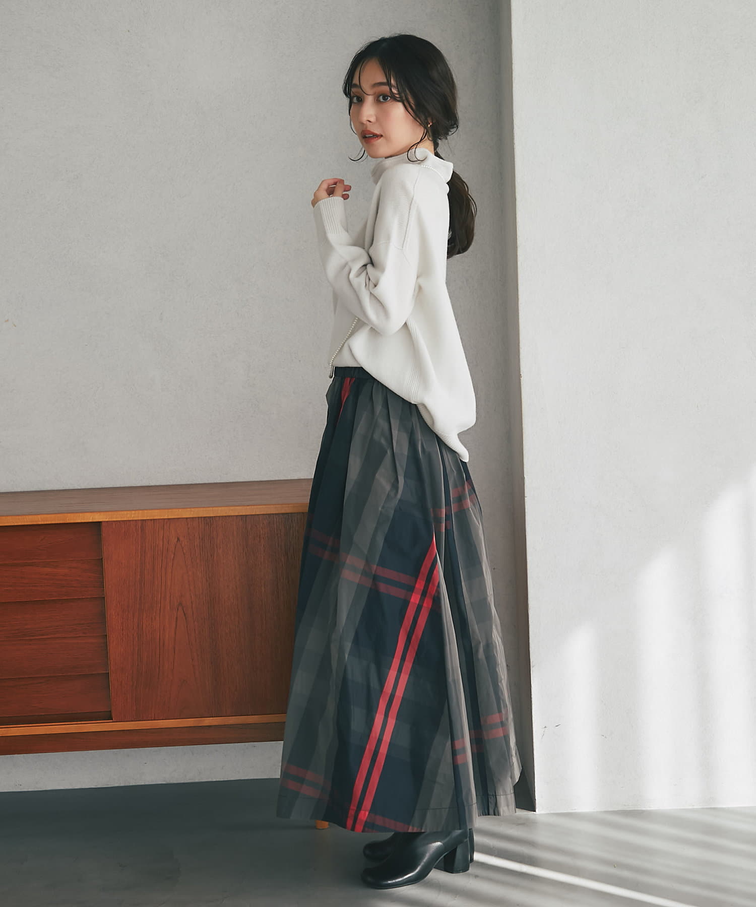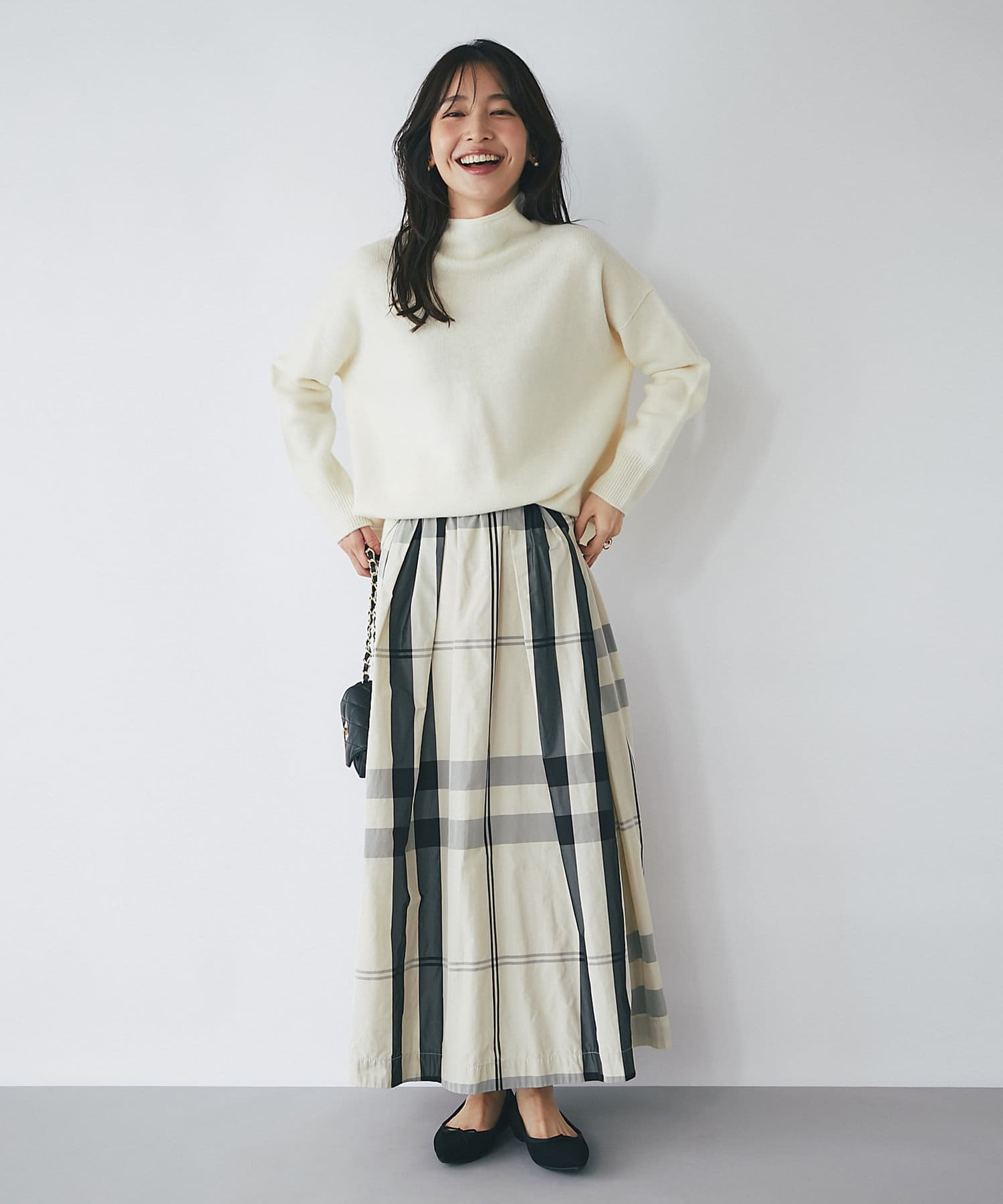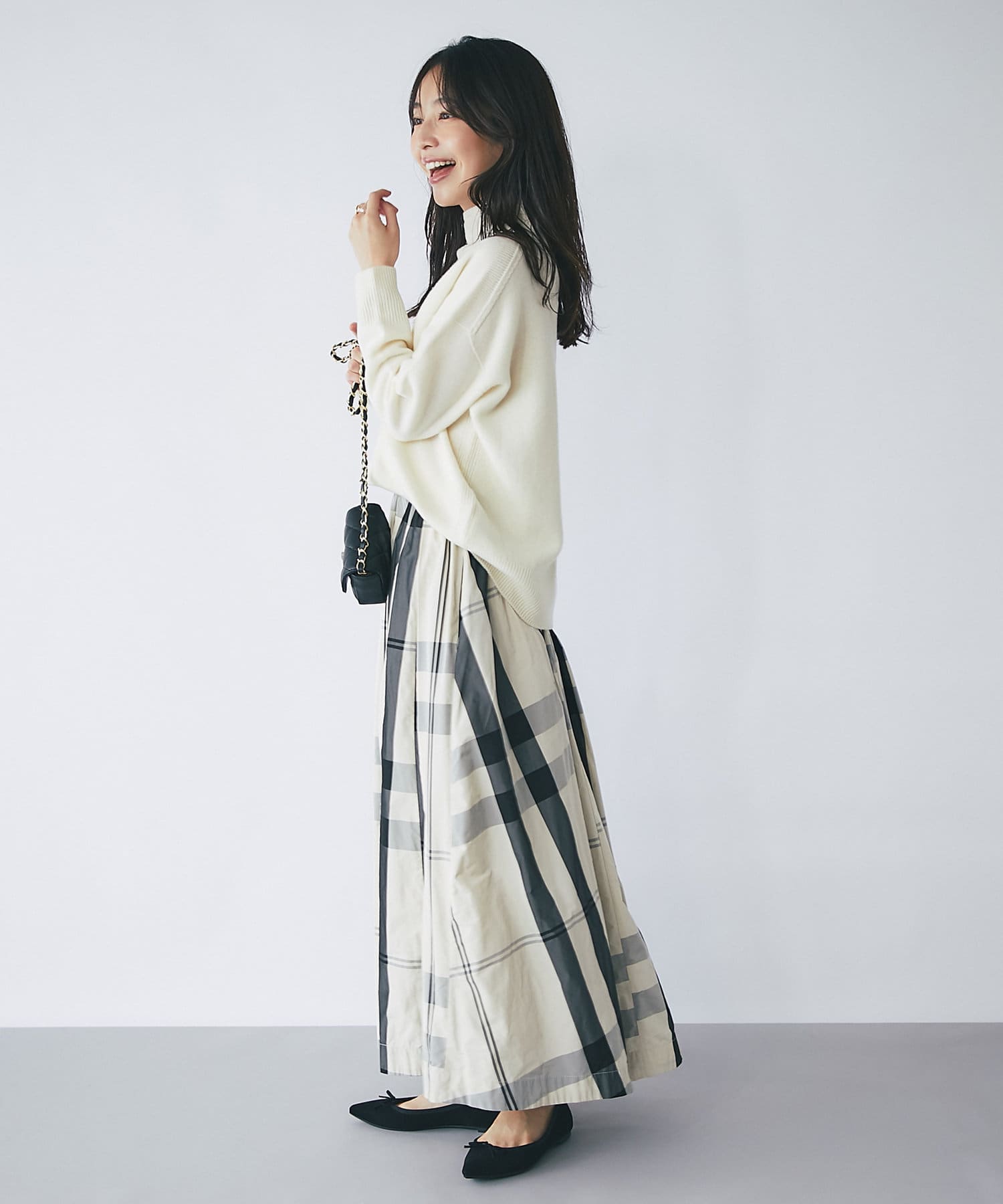 人気のチェックスカートなどボリューム感のあるボトムはもちろん、ナロースカートなどすっきりとしたシルエットのボトムとも好相性。