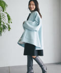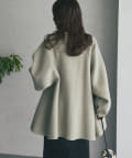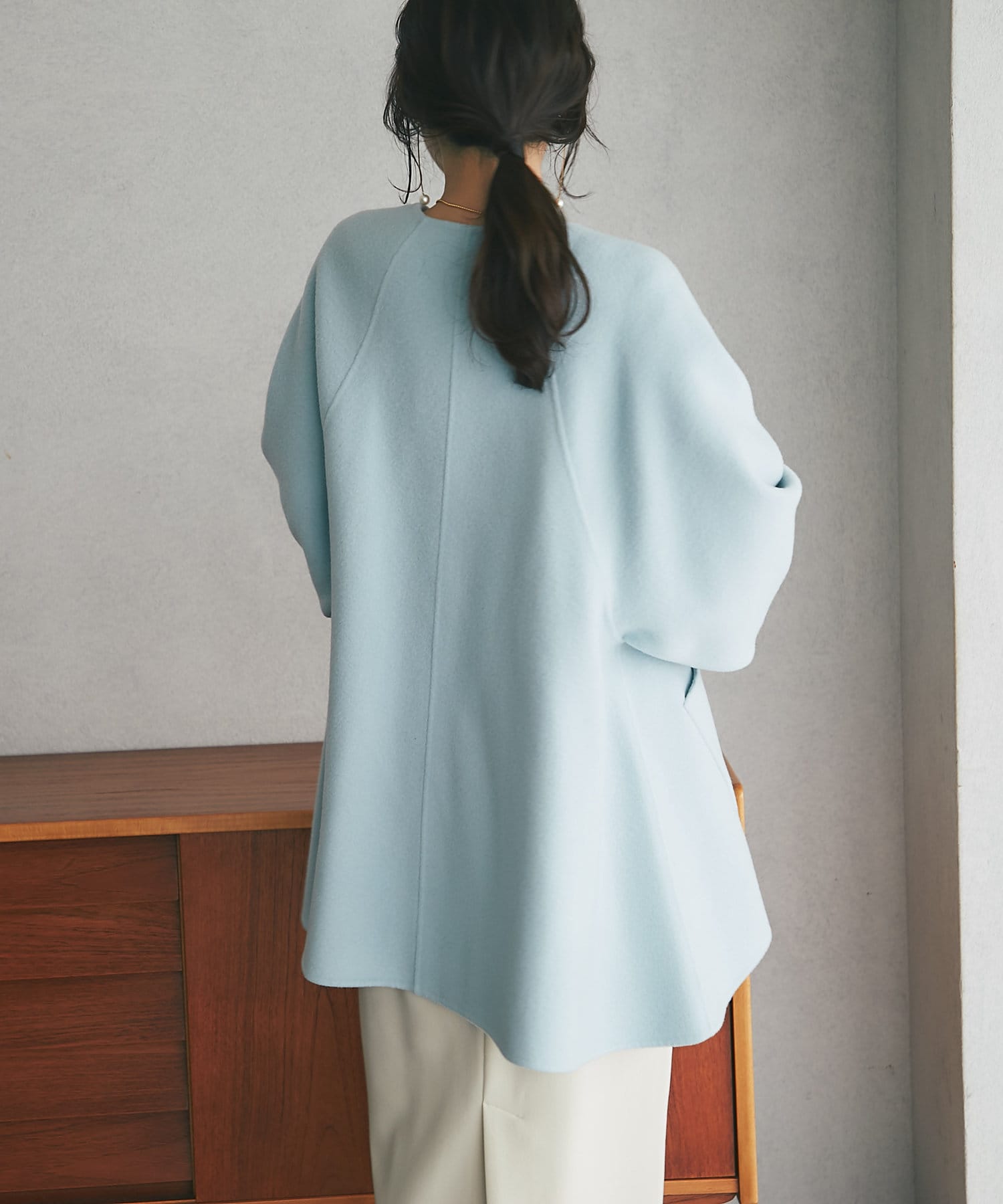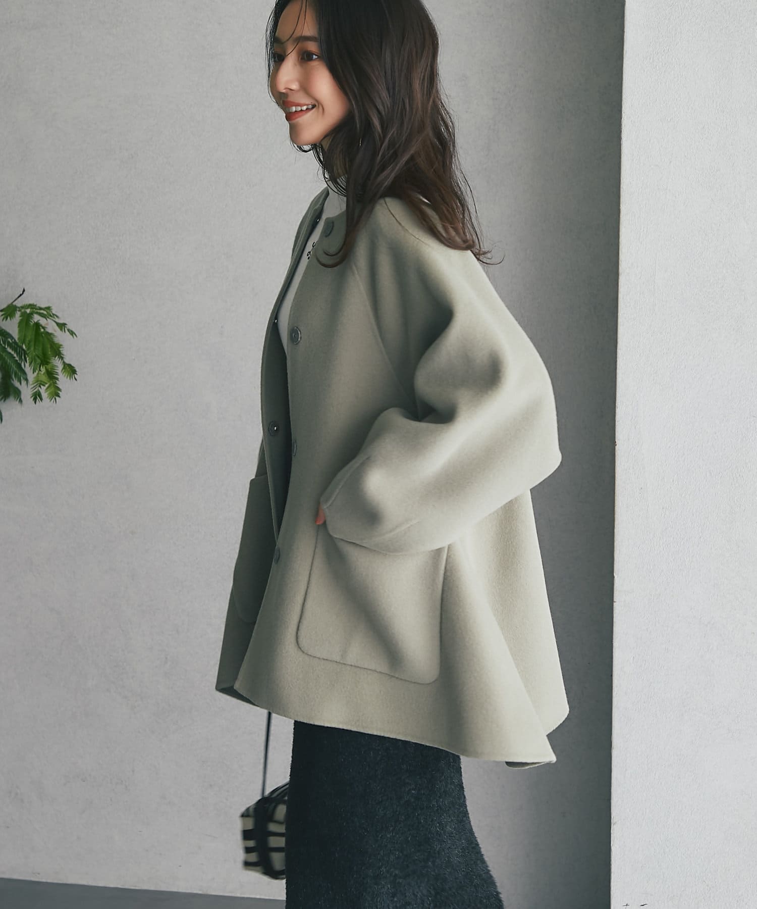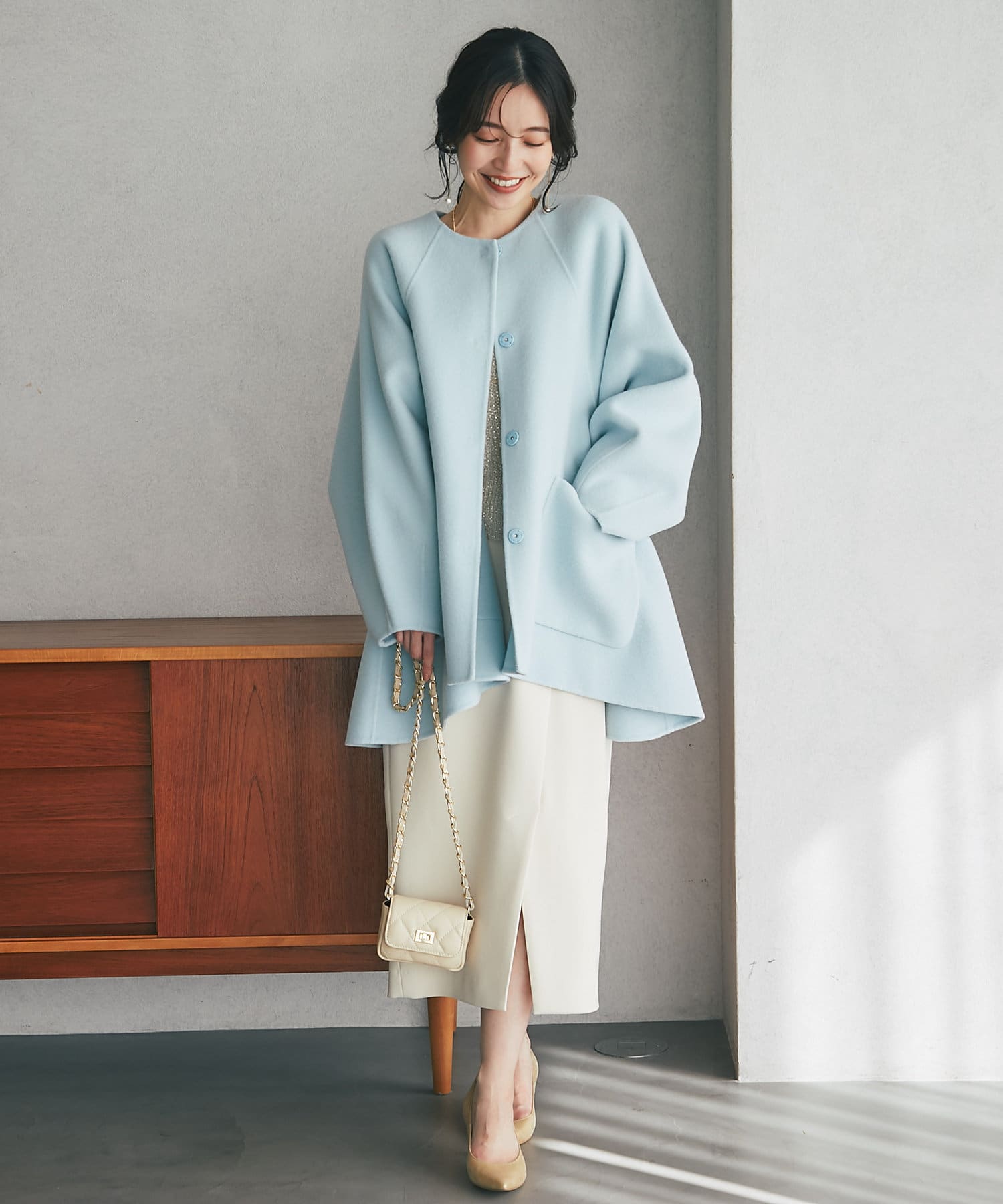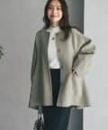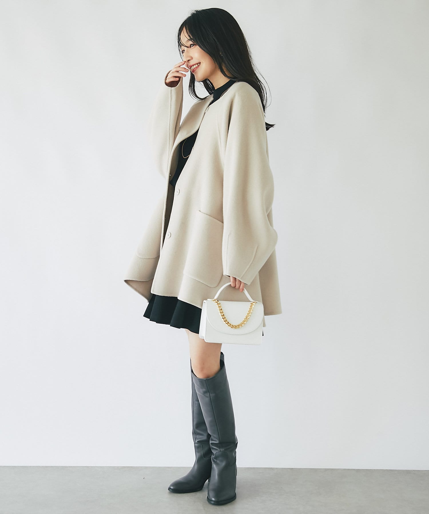 ノーカラーのクルーネックにゆったりシルエットのフレアラインコート。