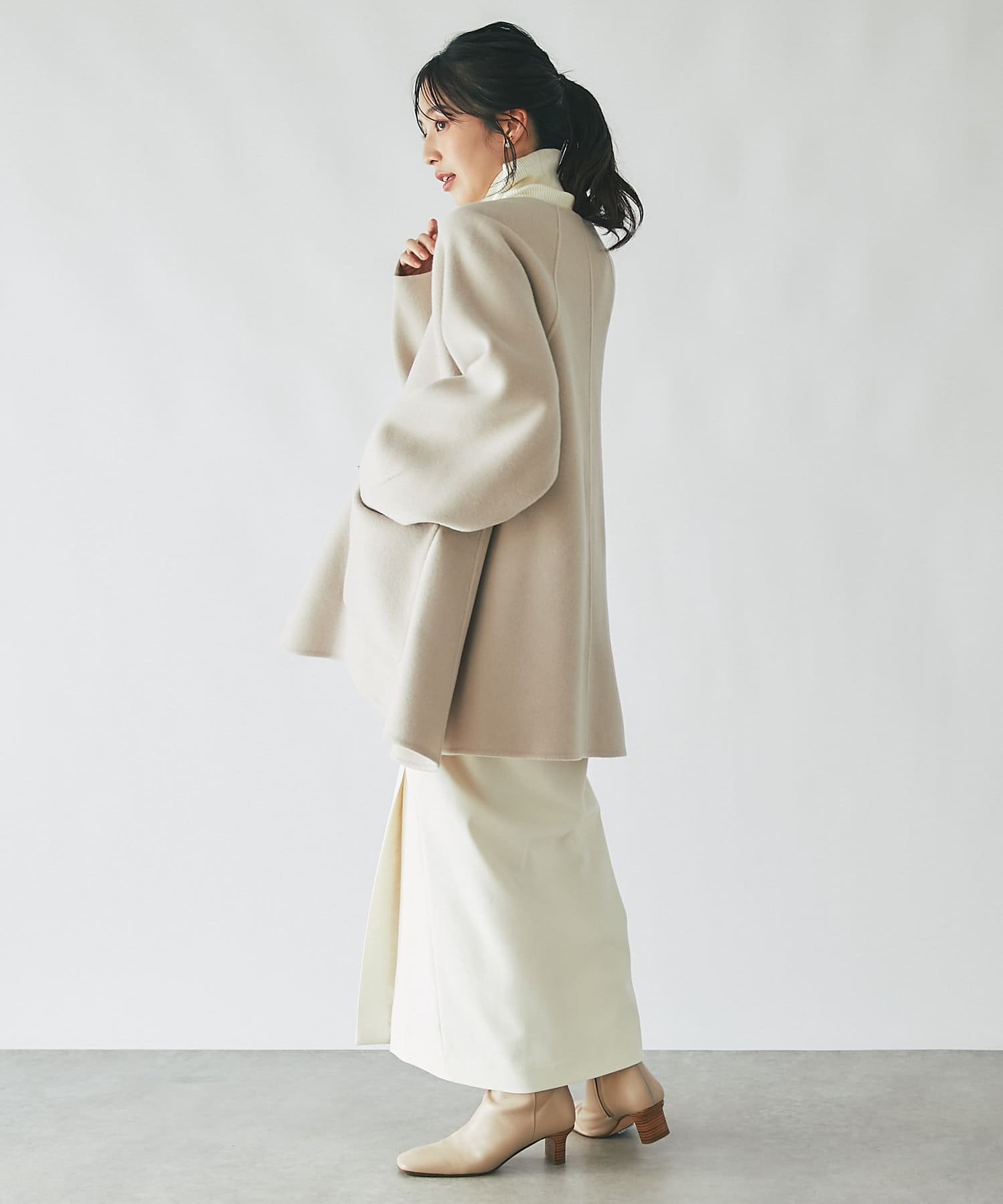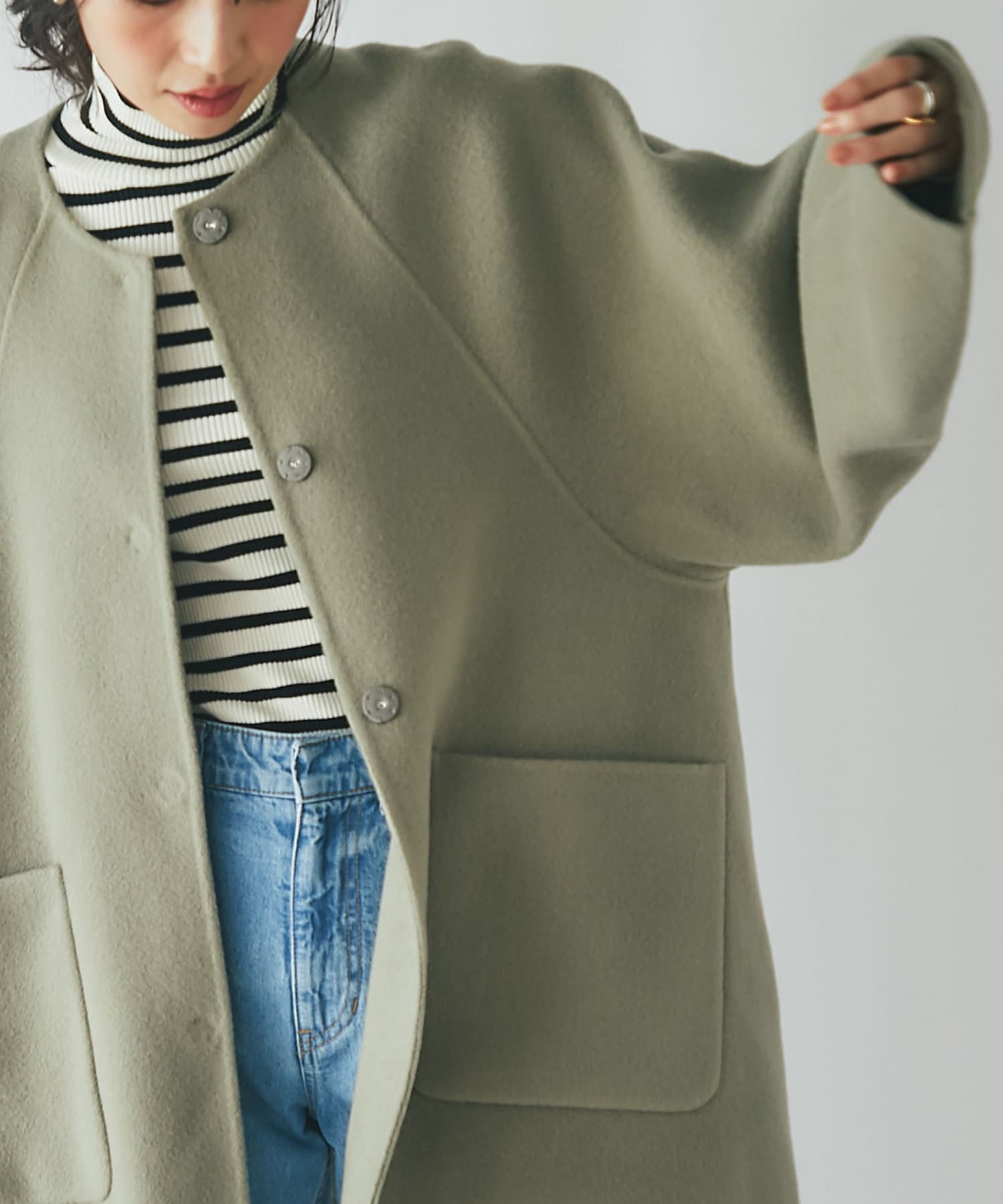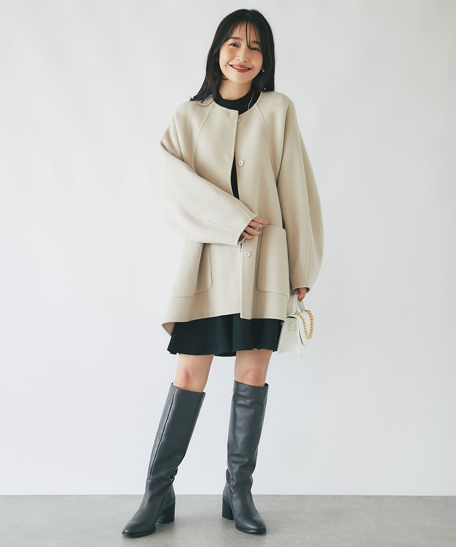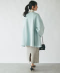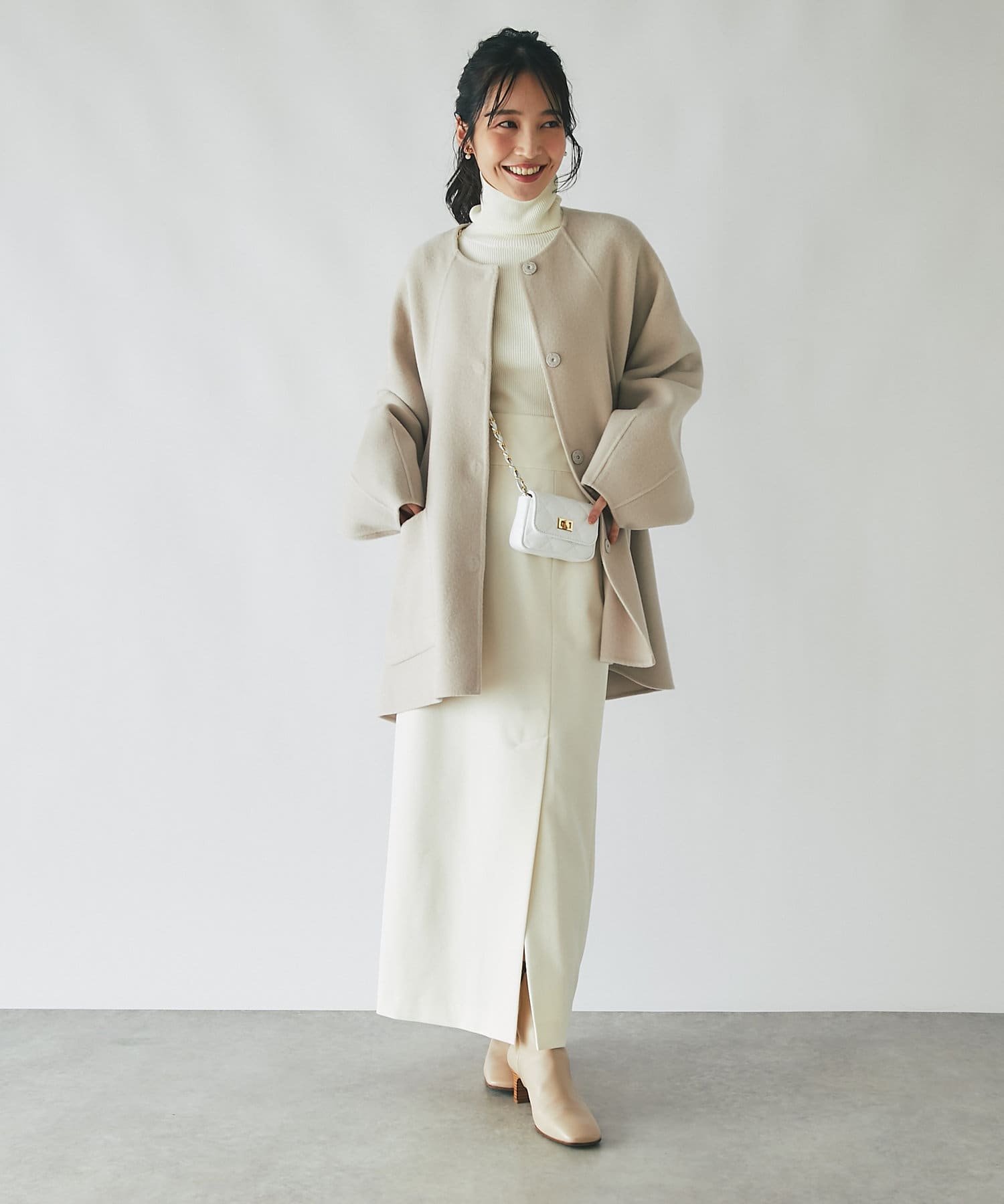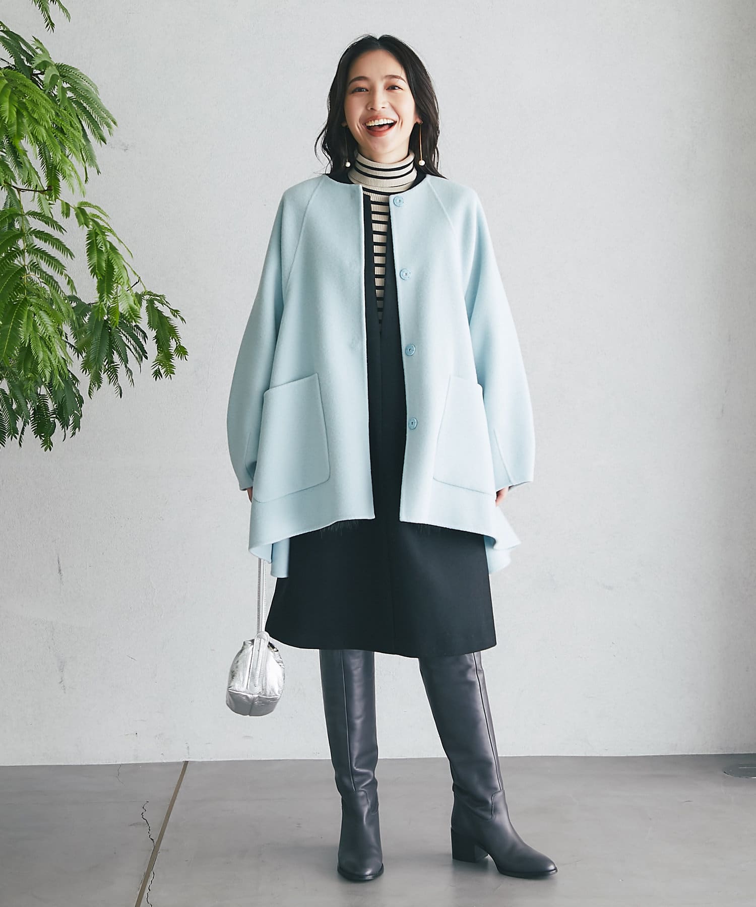 ノーカラーのクルーネックにゆったりシルエットのフレアラインコート。