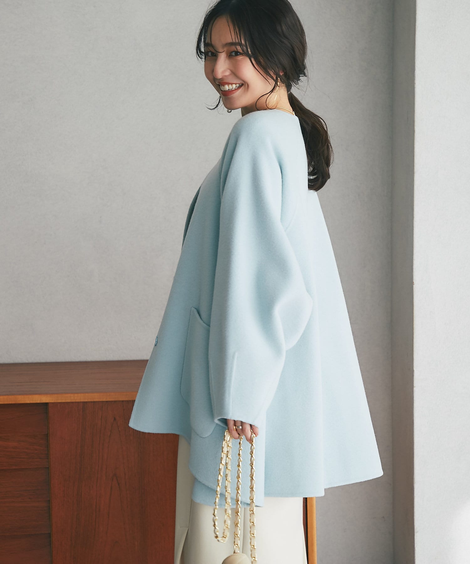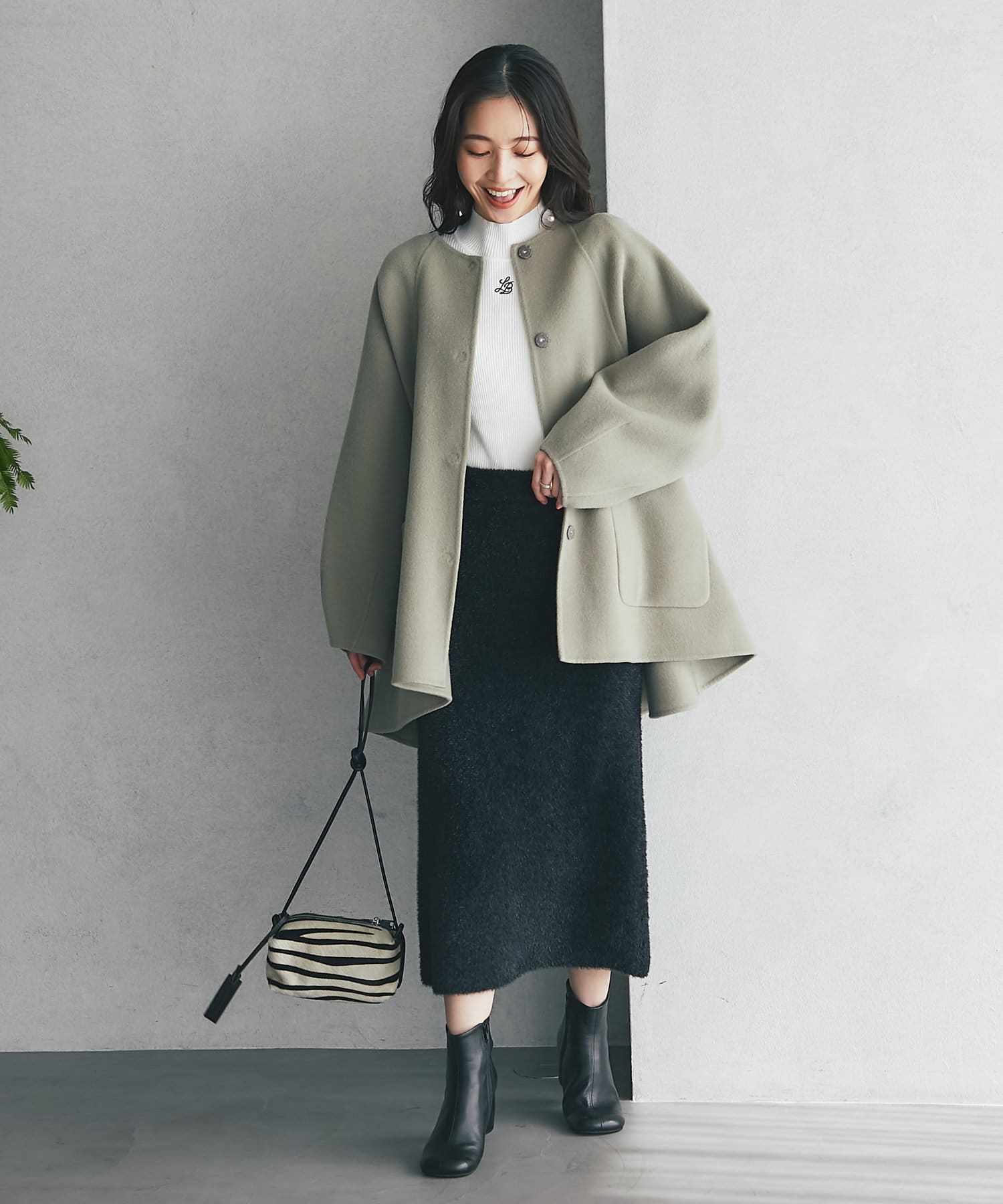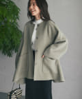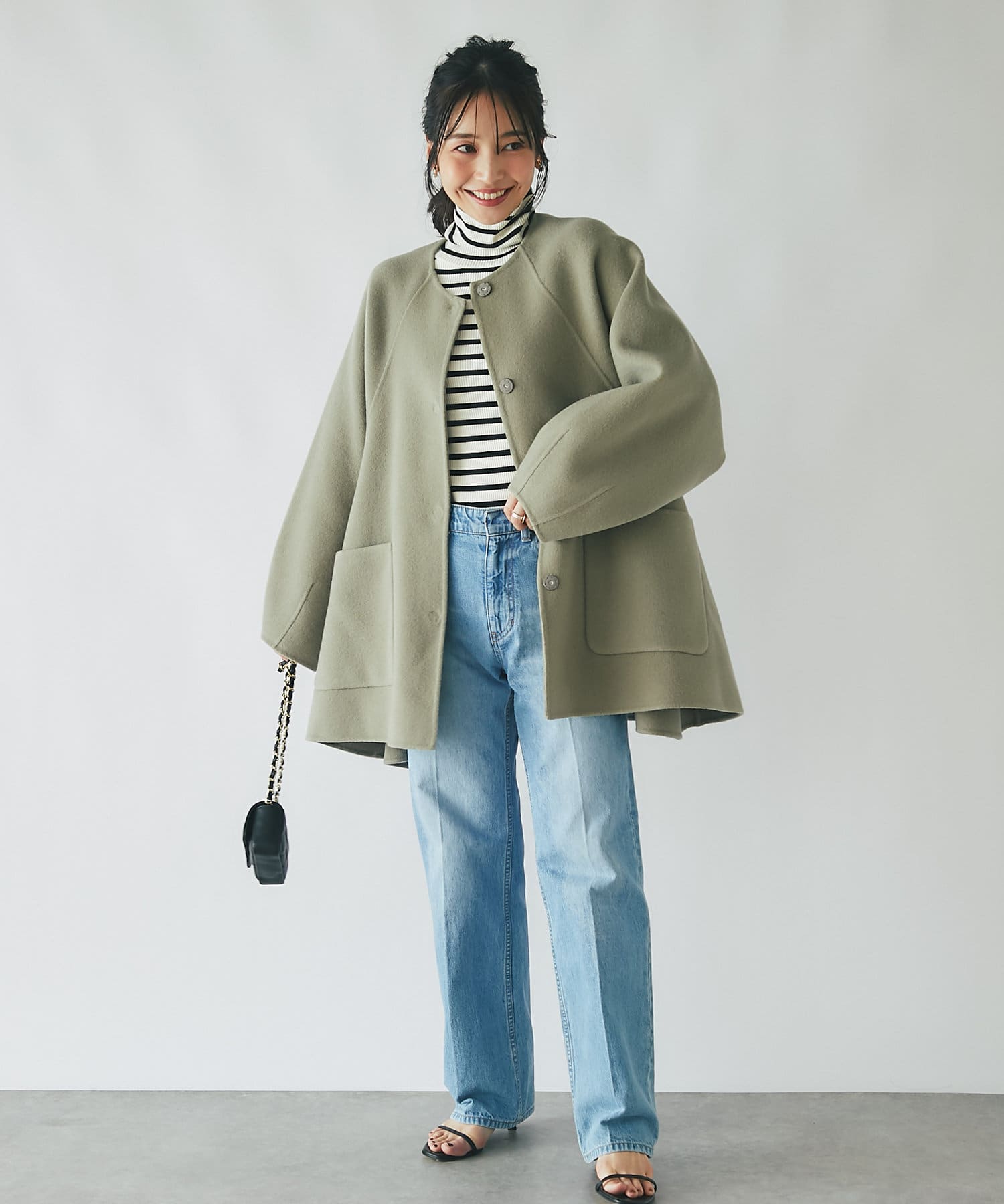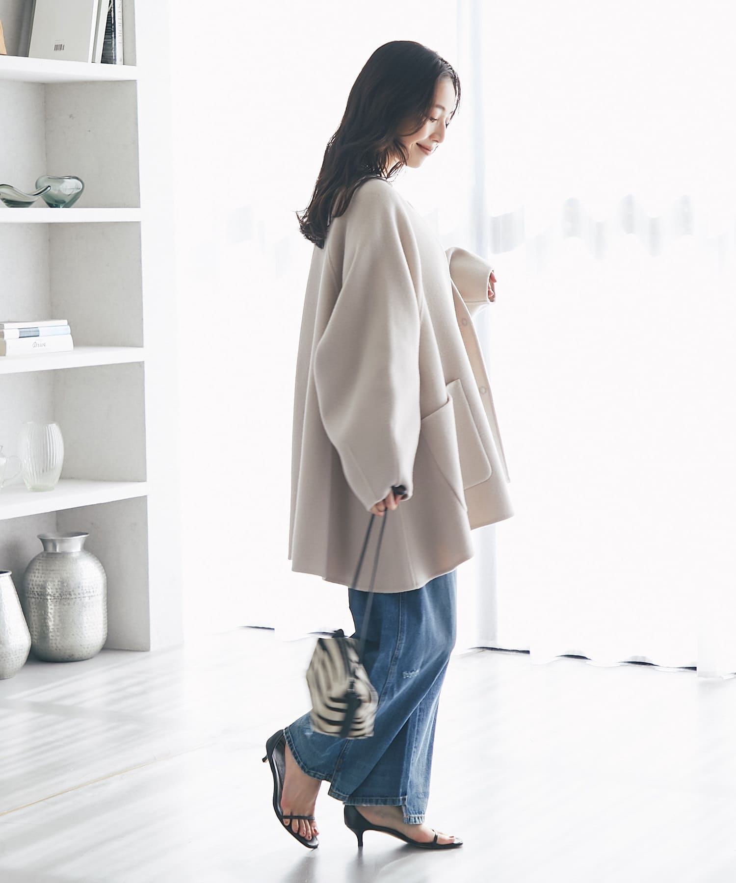 ノーカラーのクルーネックにゆったりシルエットのフレアラインコート。