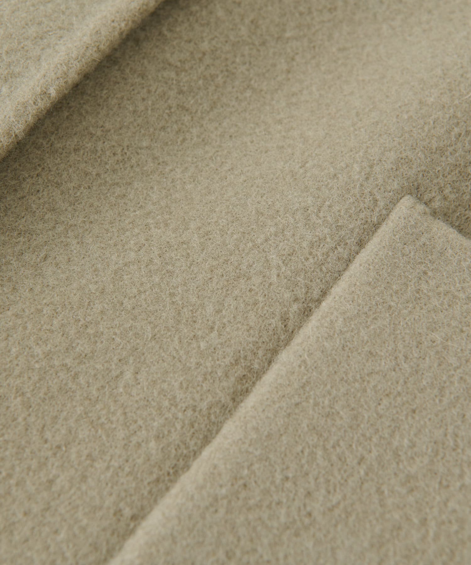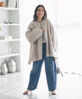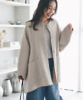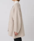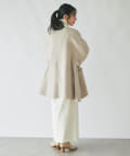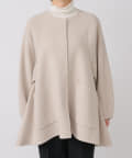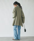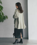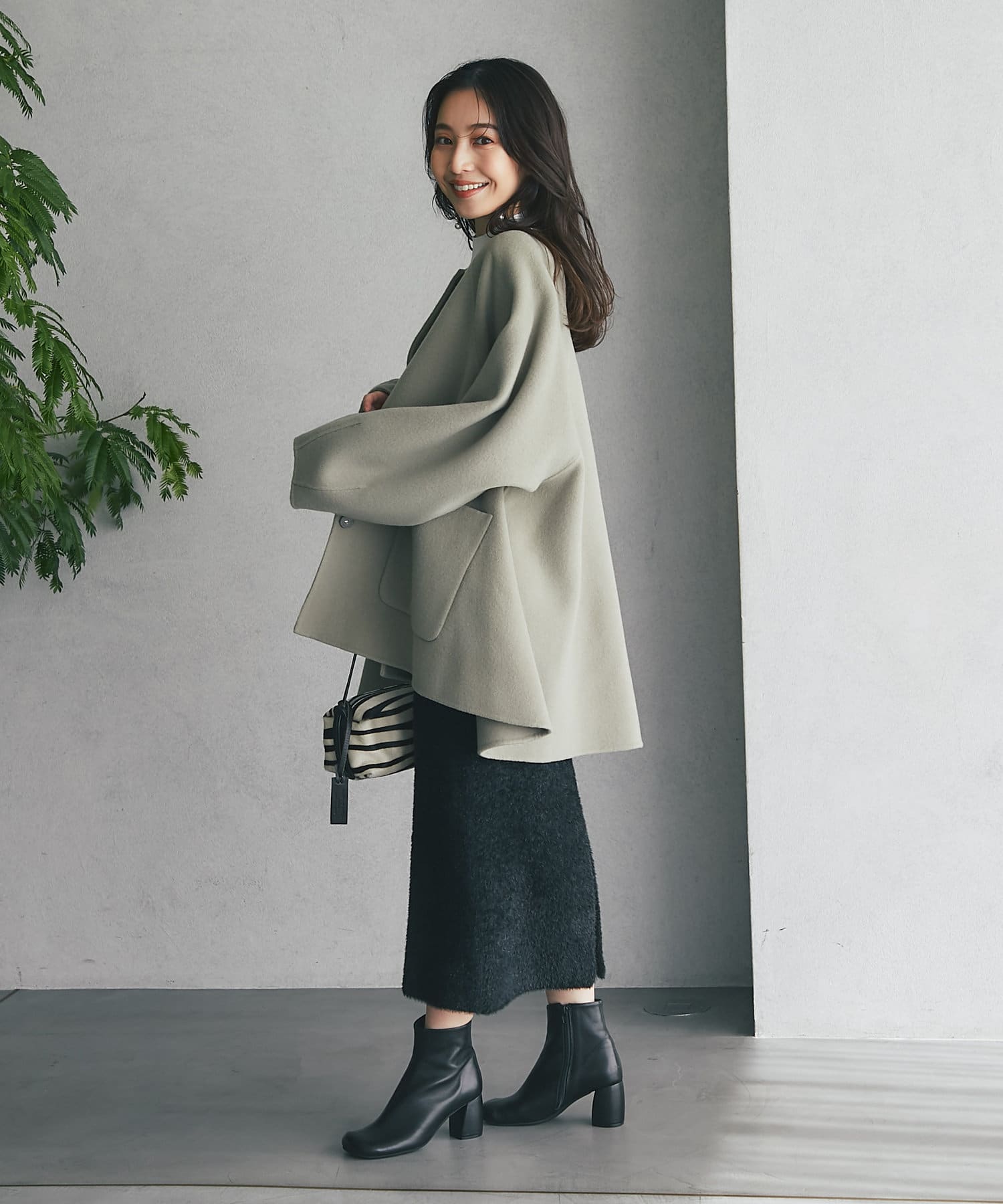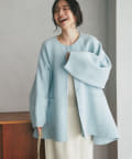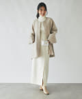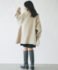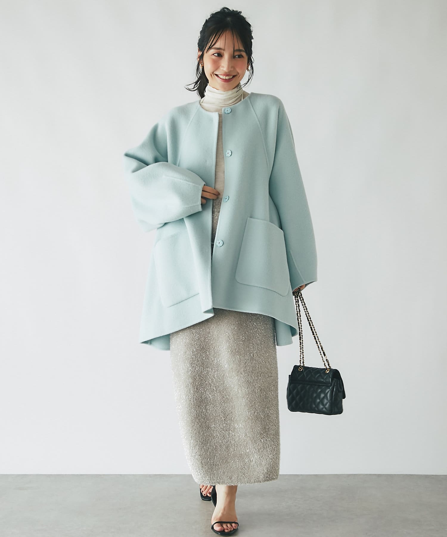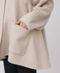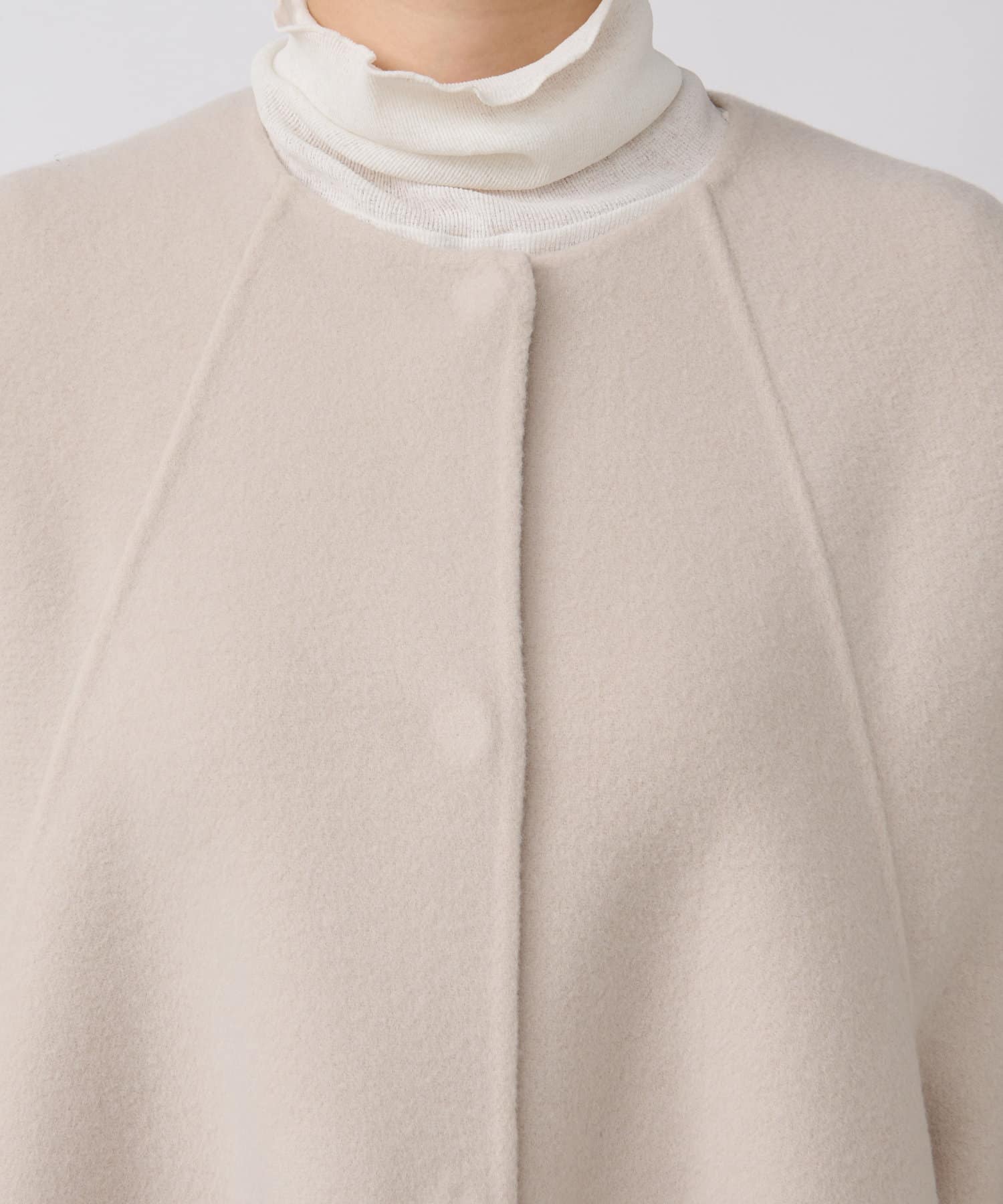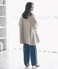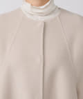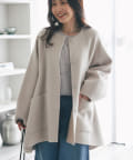 ノーカラーのクルーネックにゆったりシルエットのフレアラインコート。