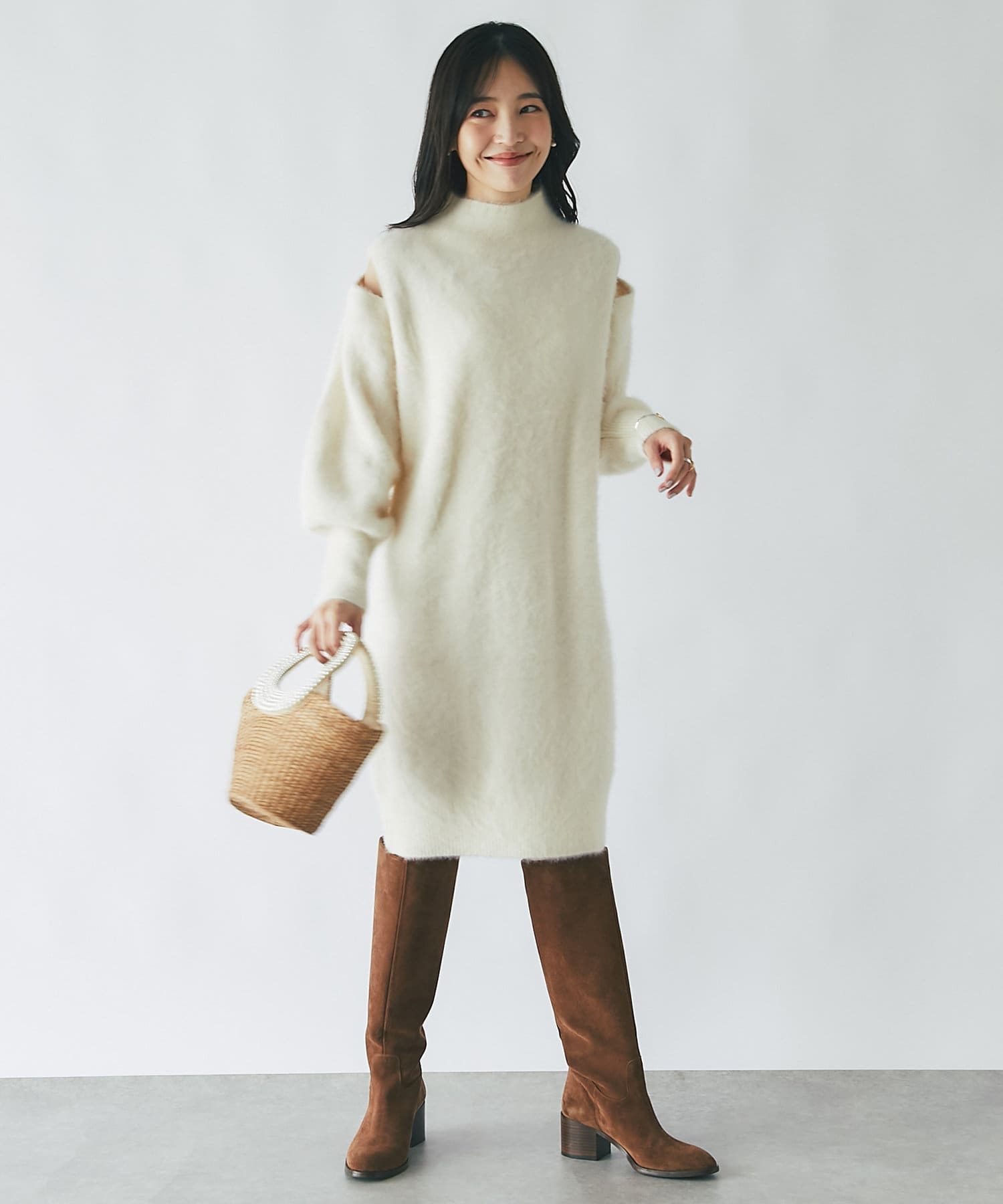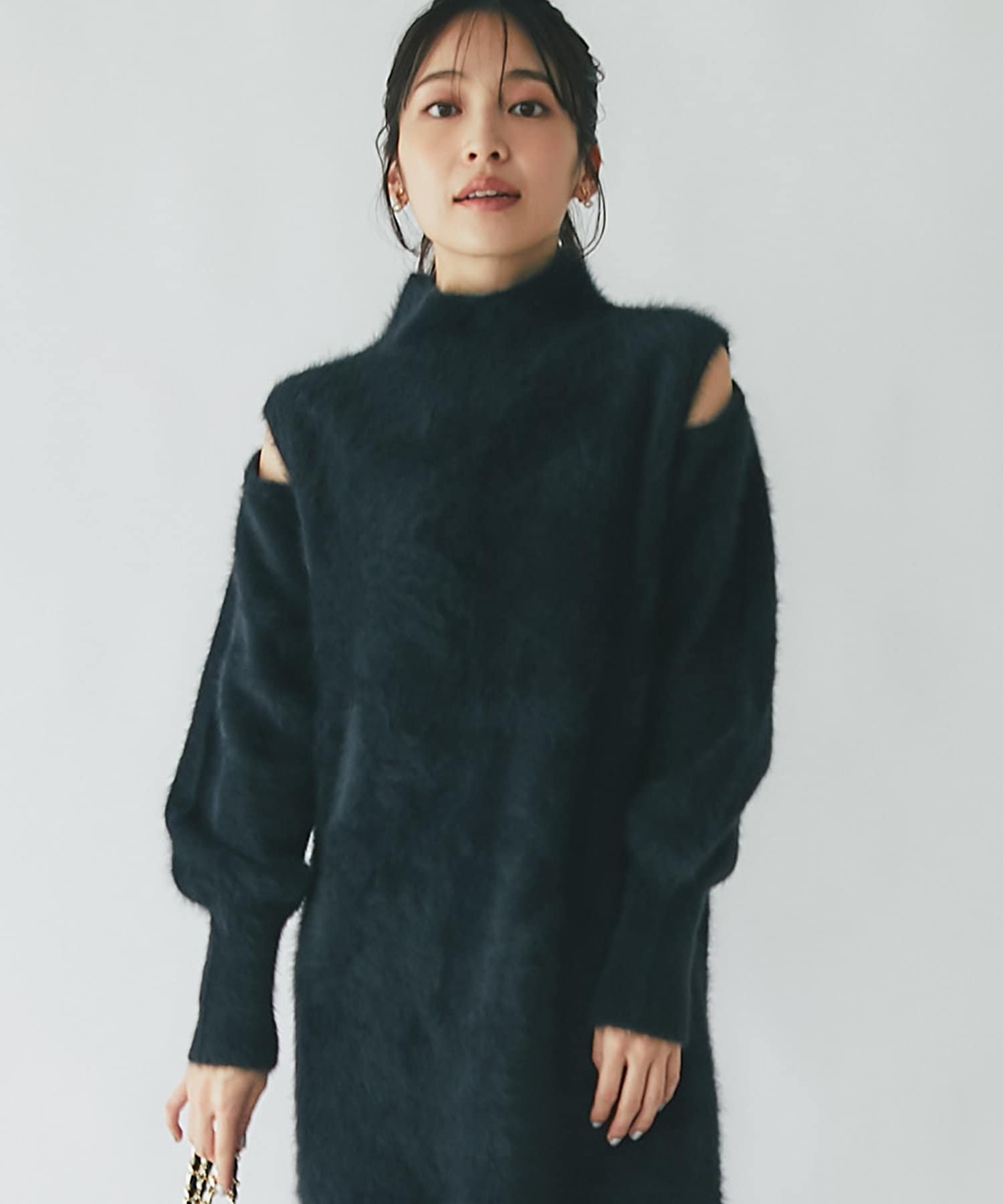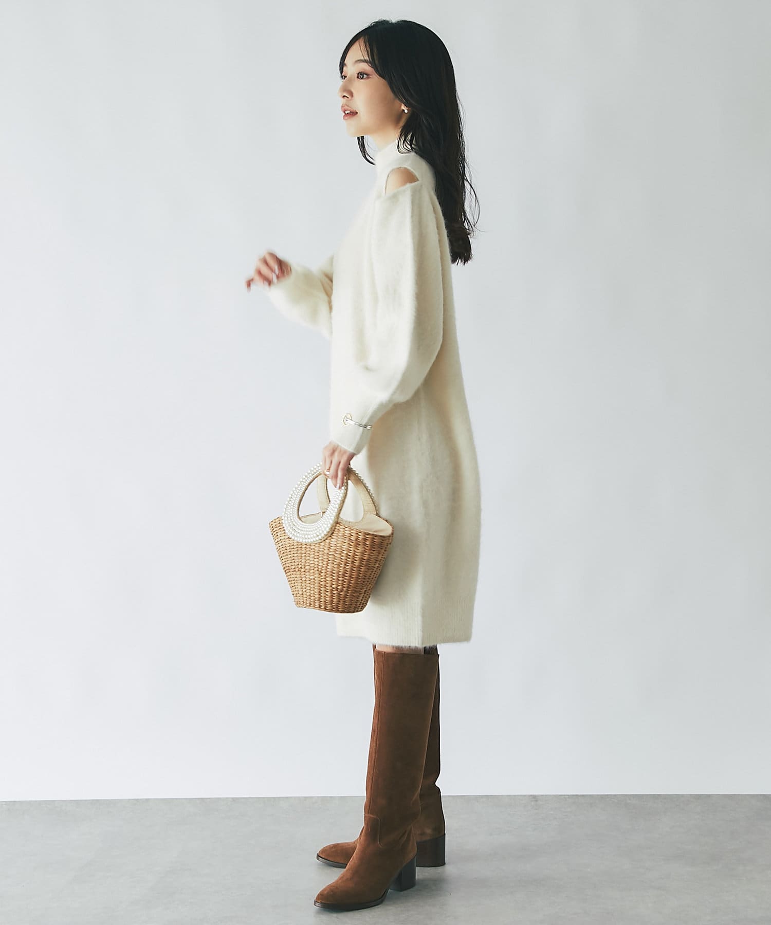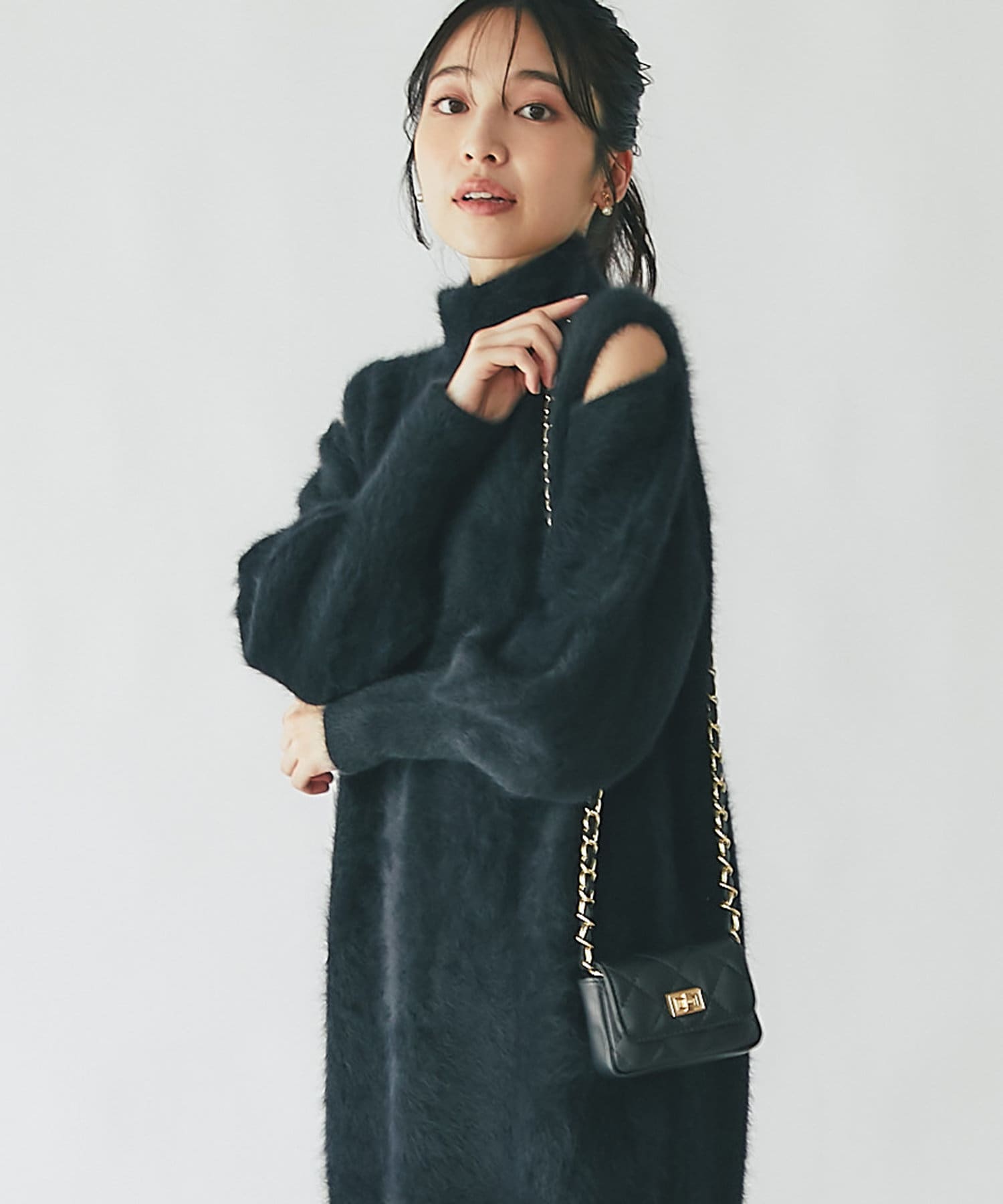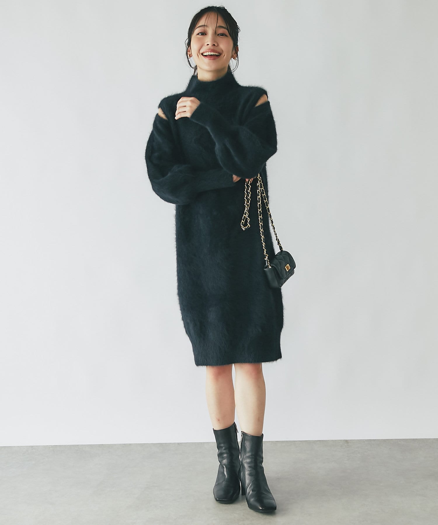 ハイネックで首元は露出を控えて、程よく肌見せができる大人のスタイルが叶います。