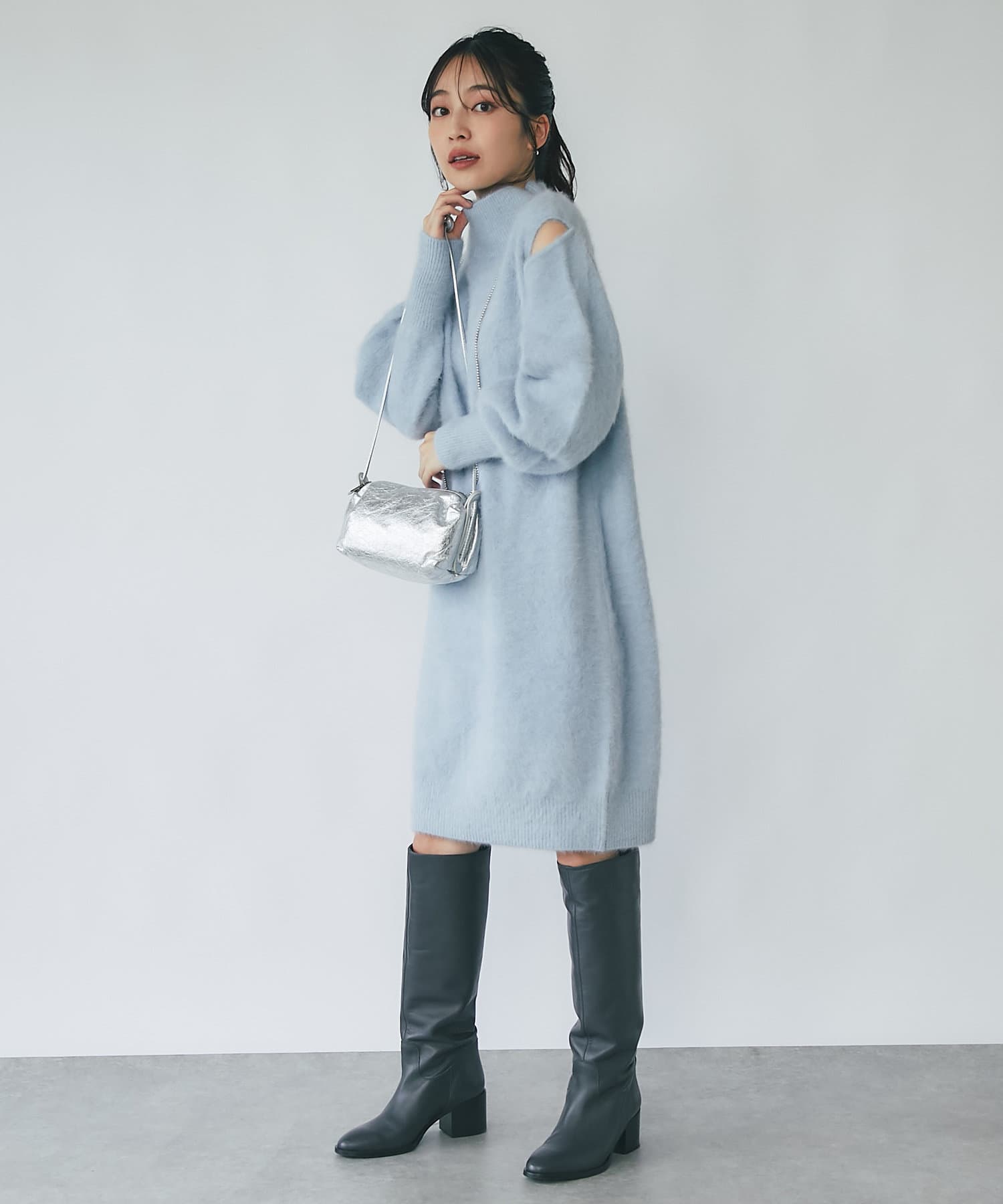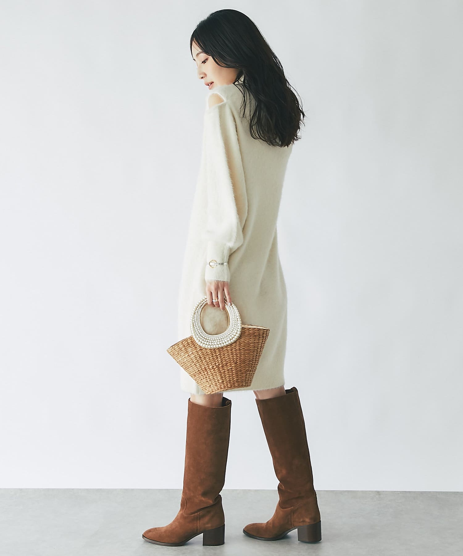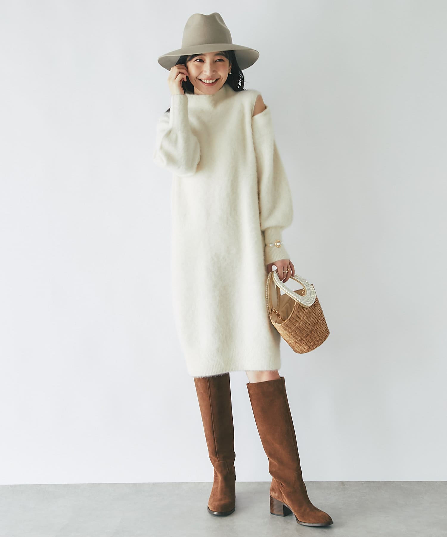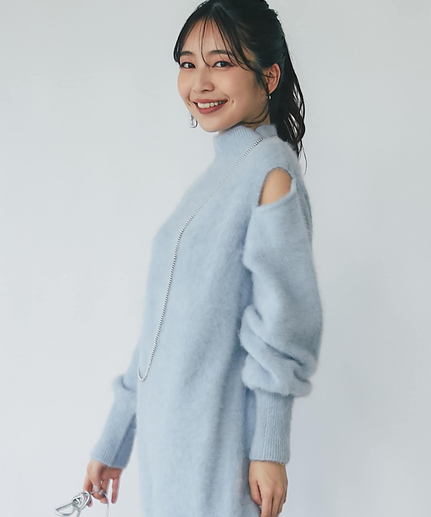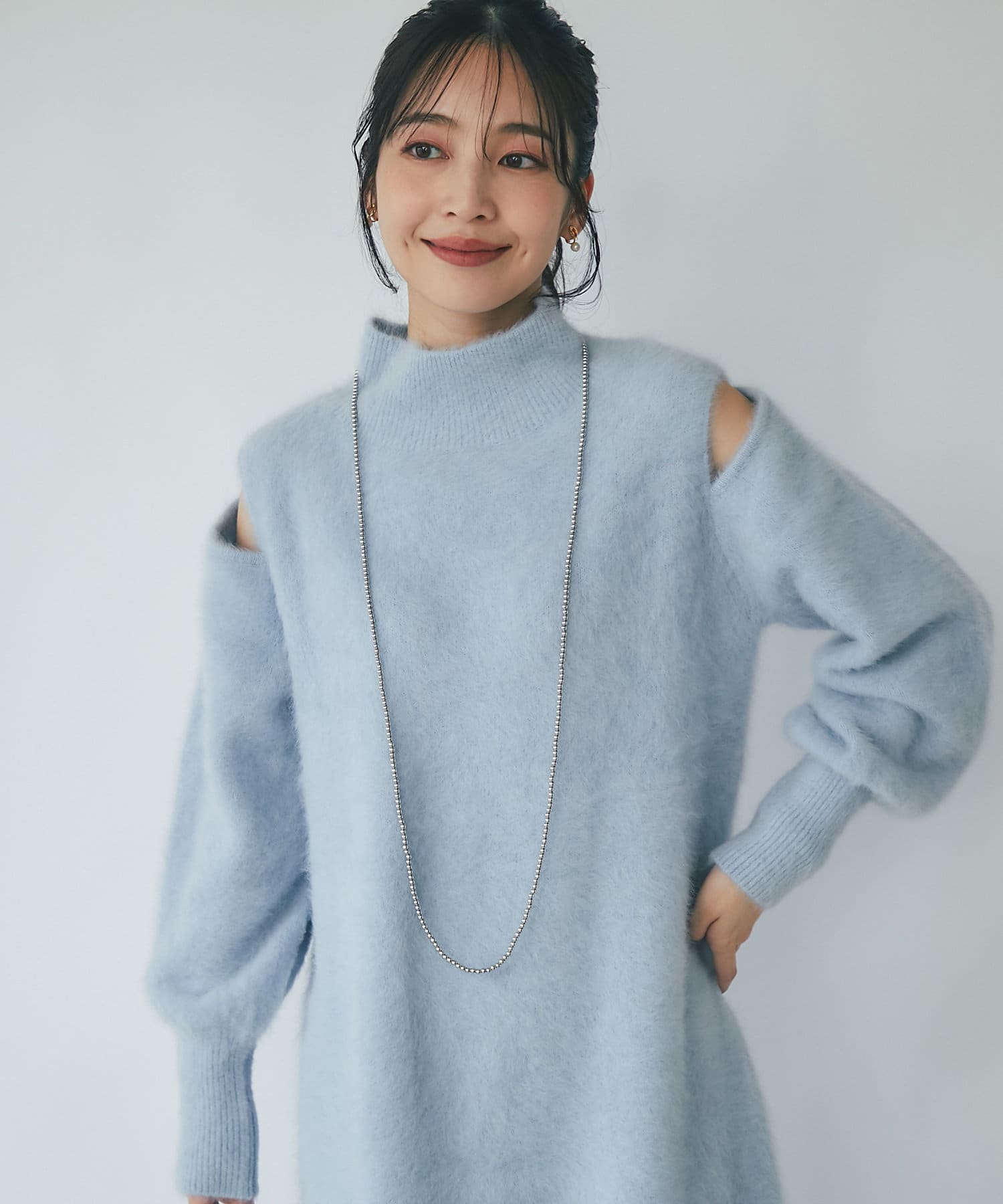 ハイネックで首元は露出を控えて、程よく肌見せができる大人のスタイルが叶います。