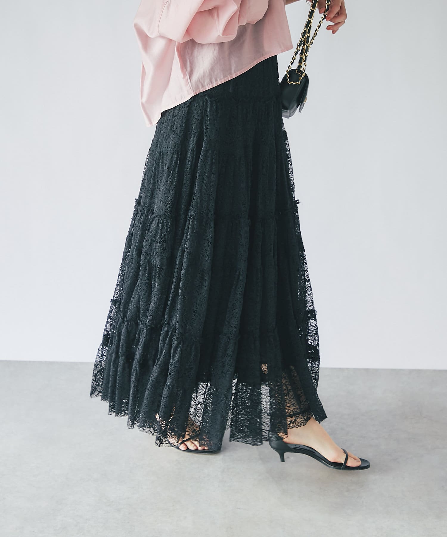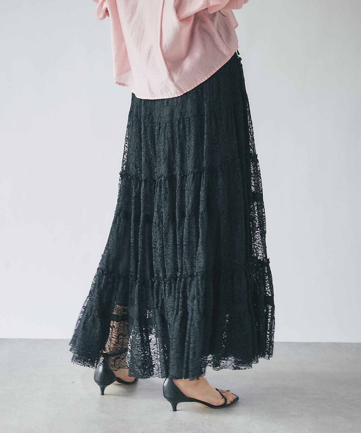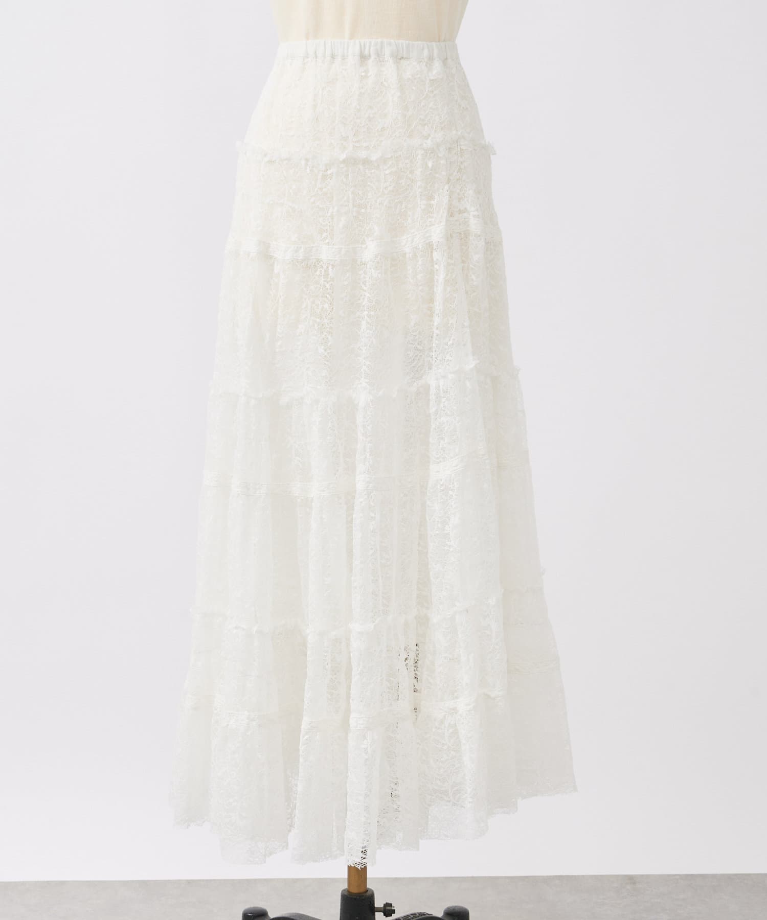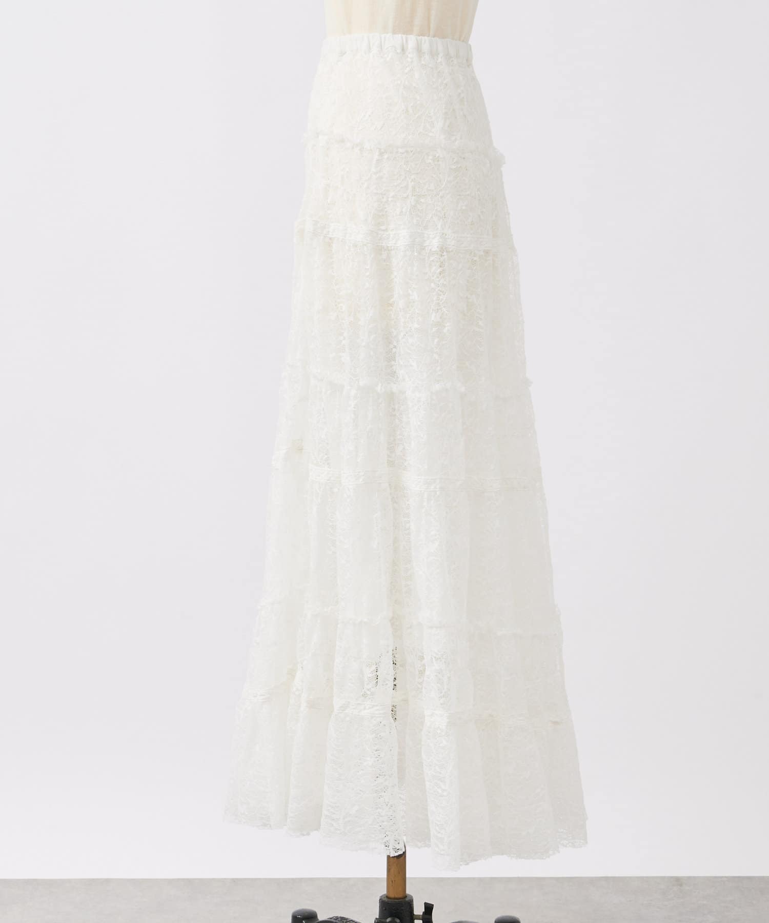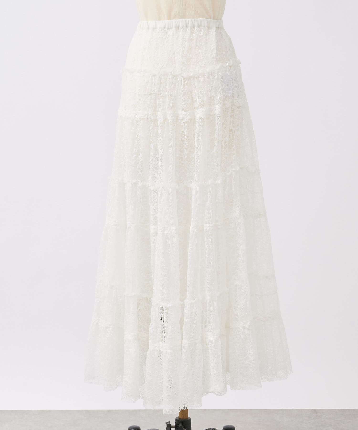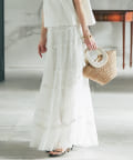 柔らかくて繊細なリバーレースで仕立てた贅沢なティアードロングスカート