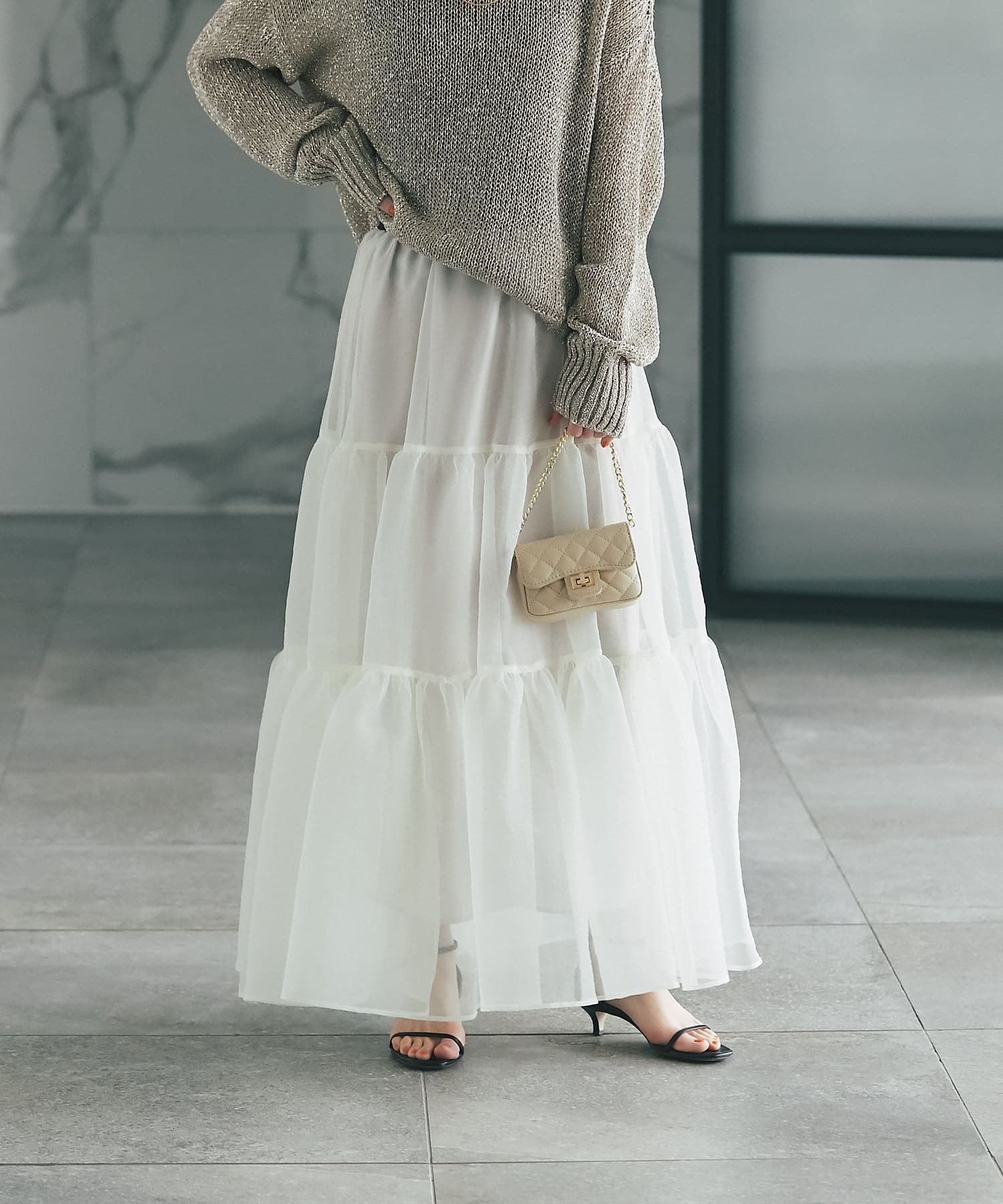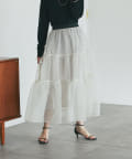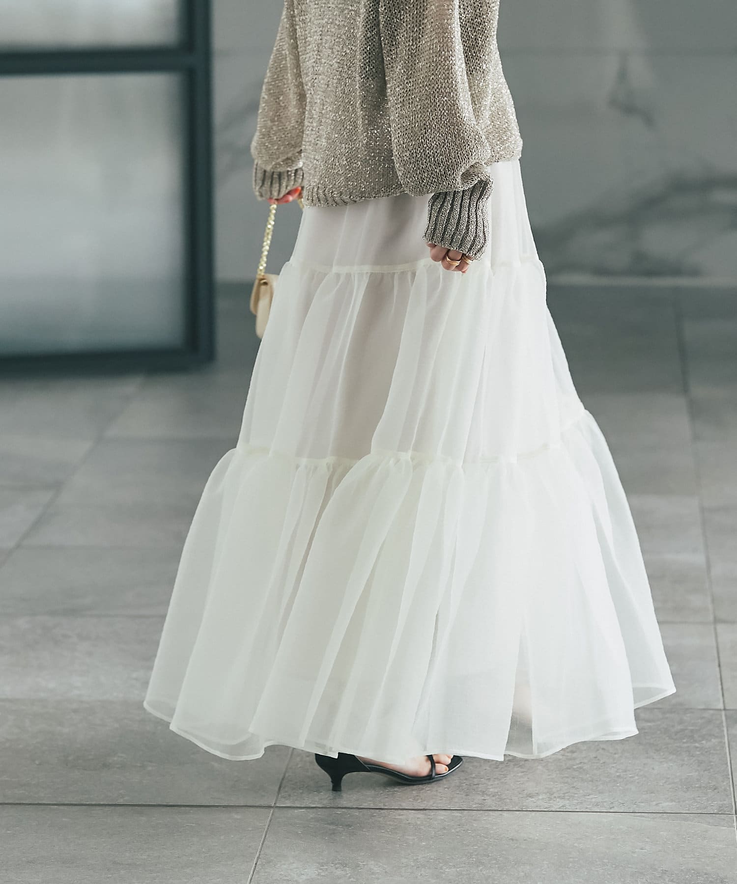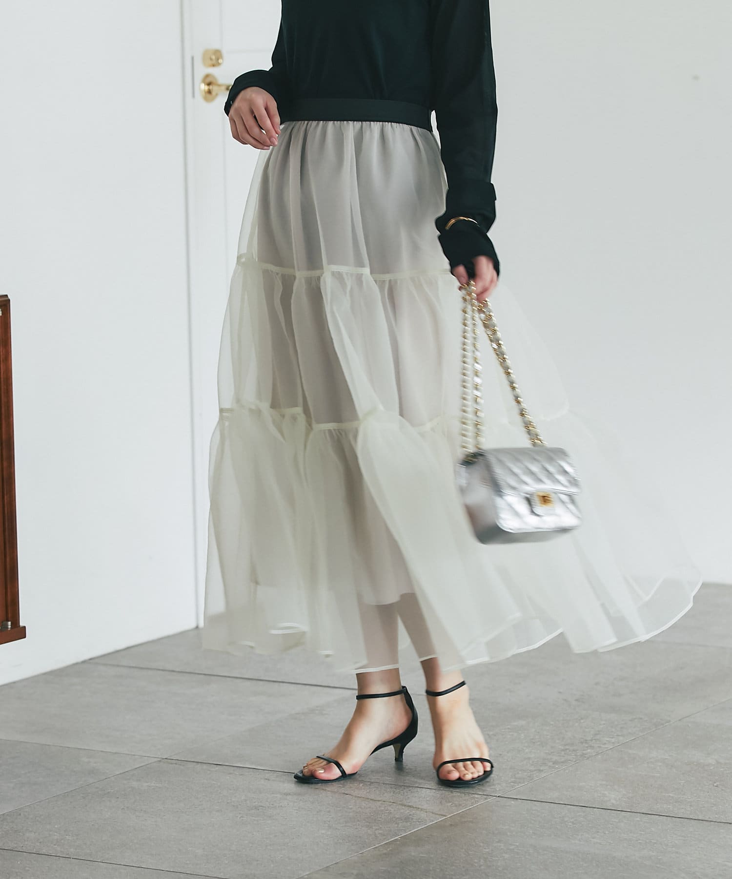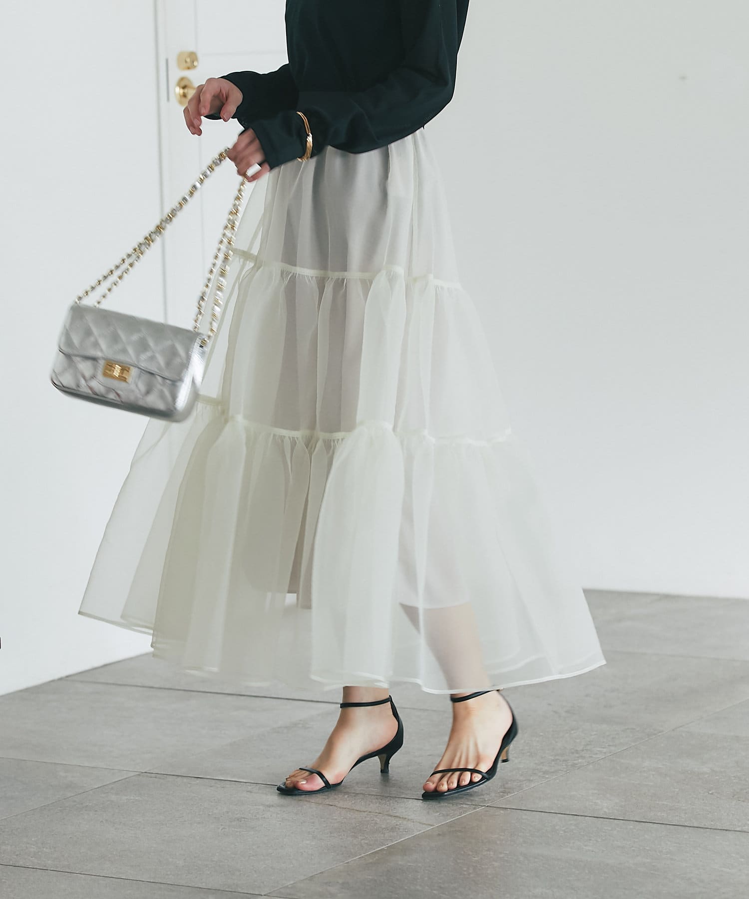 オーガンジー特有の軽やかさとふわっとしたシルエットが魅力的なティアードスカート。