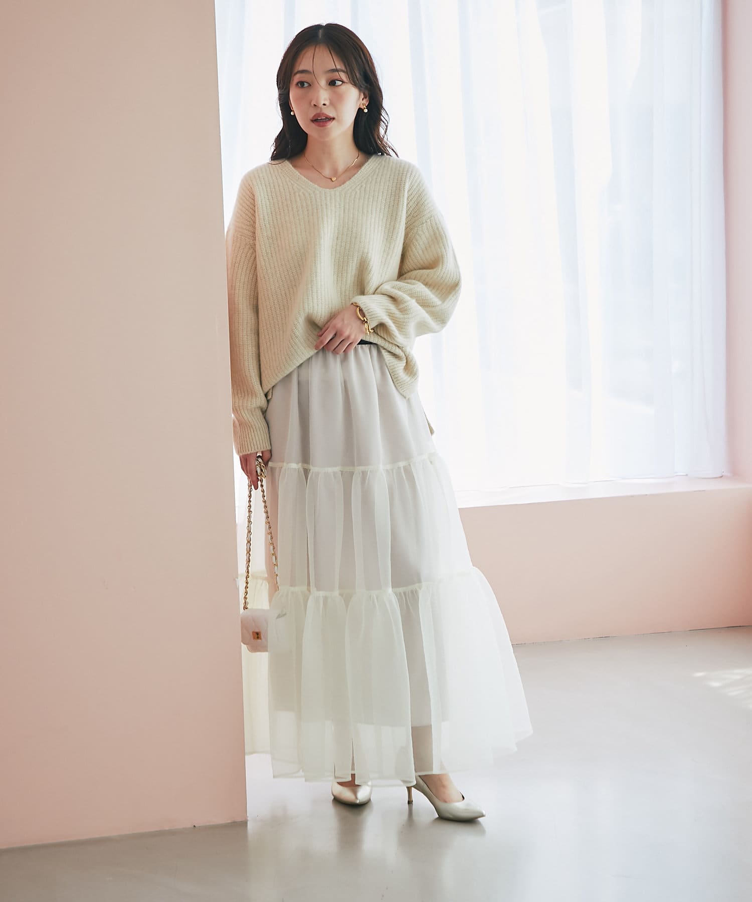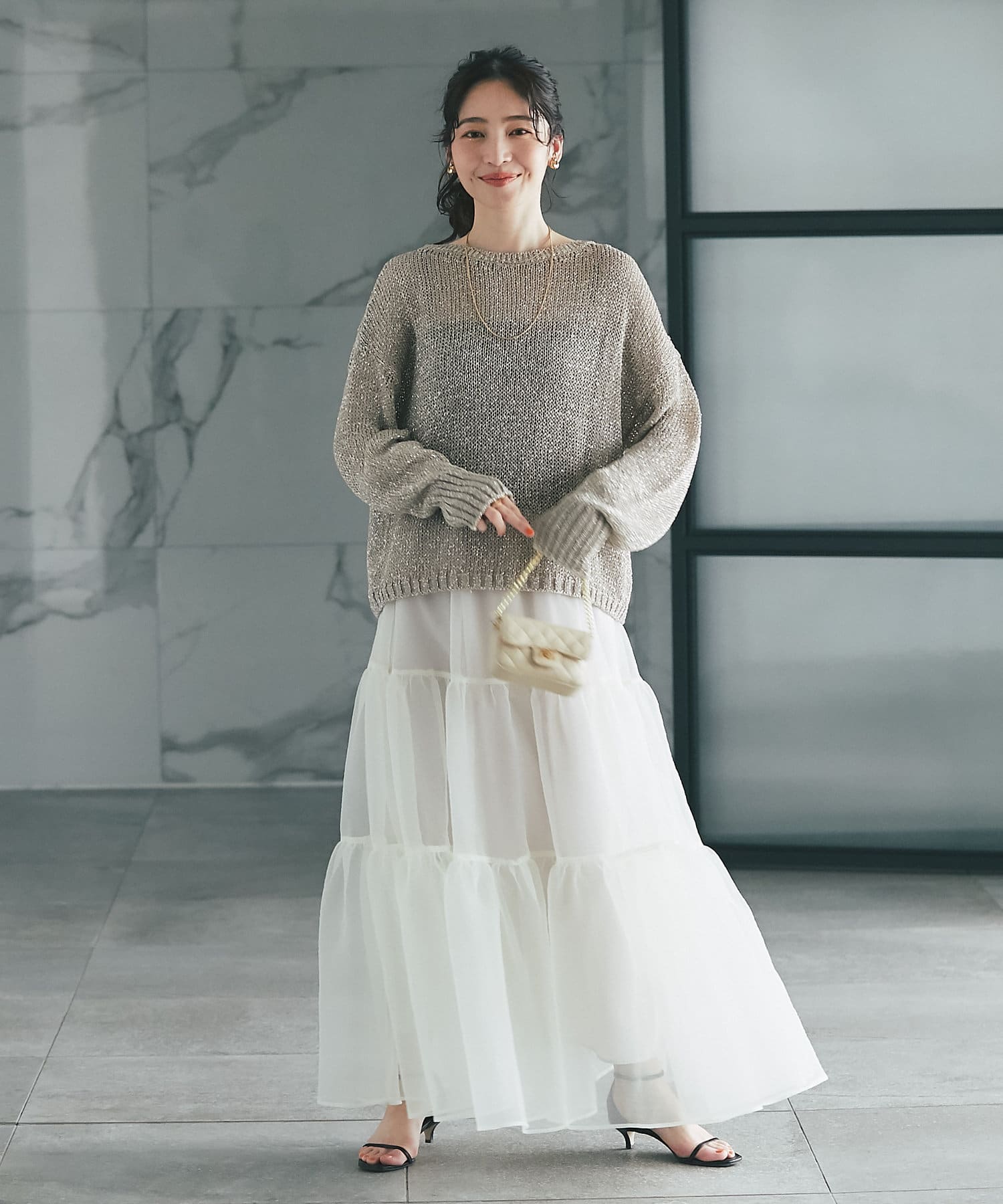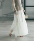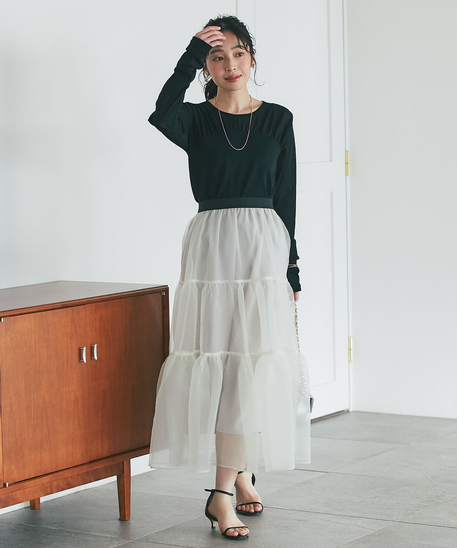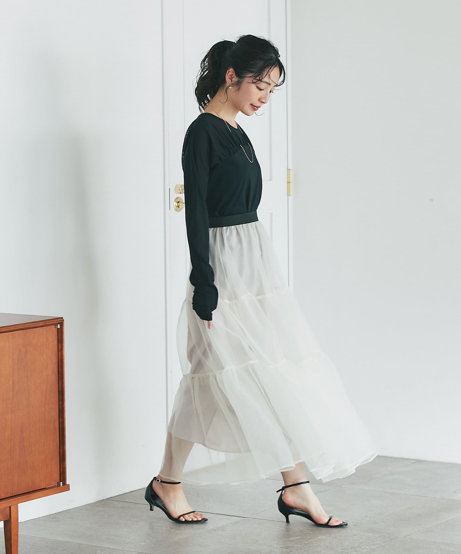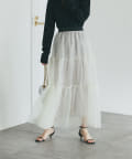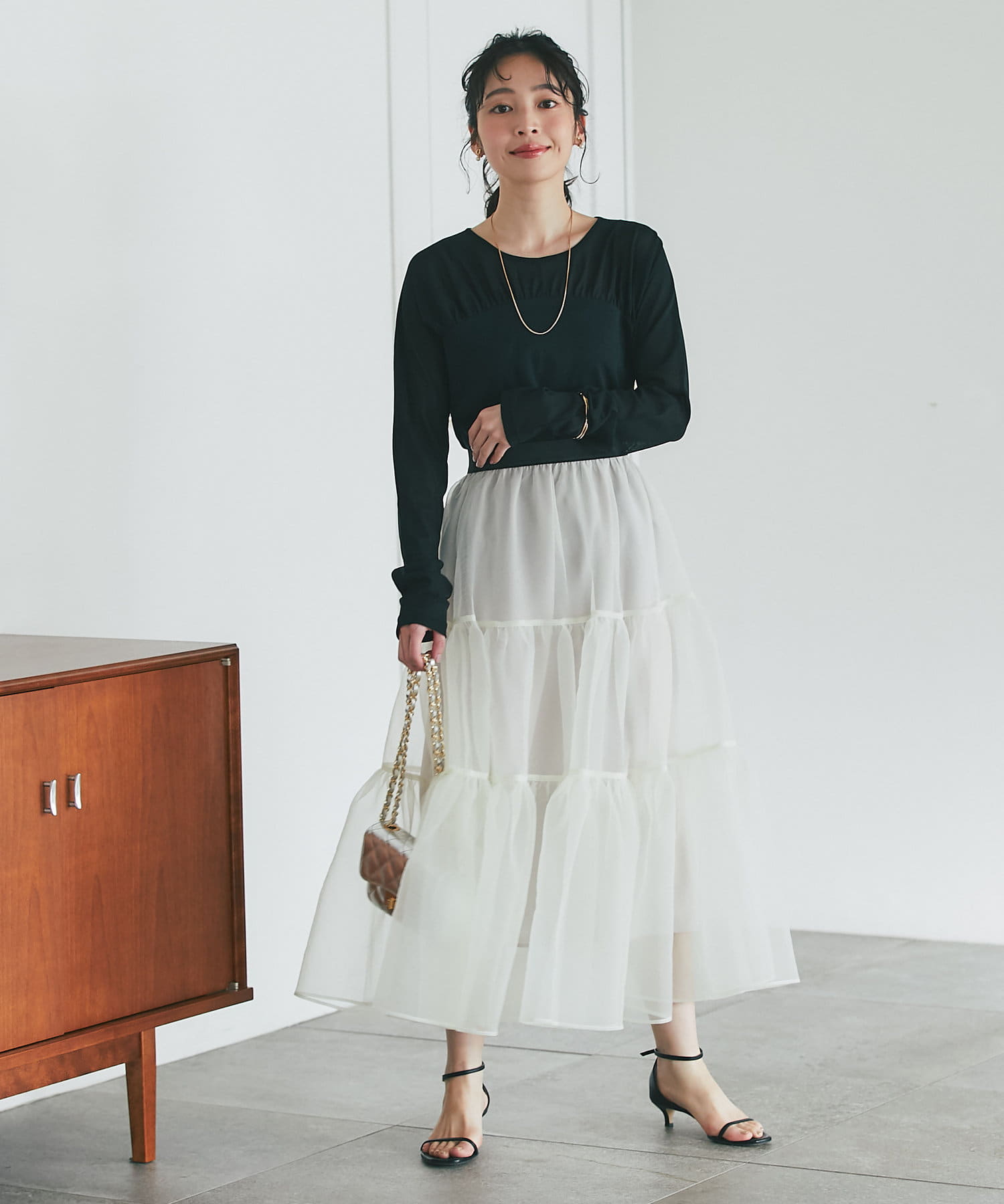 オーガンジー特有の軽やかさとふわっとしたシルエットが魅力的なティアードスカート。