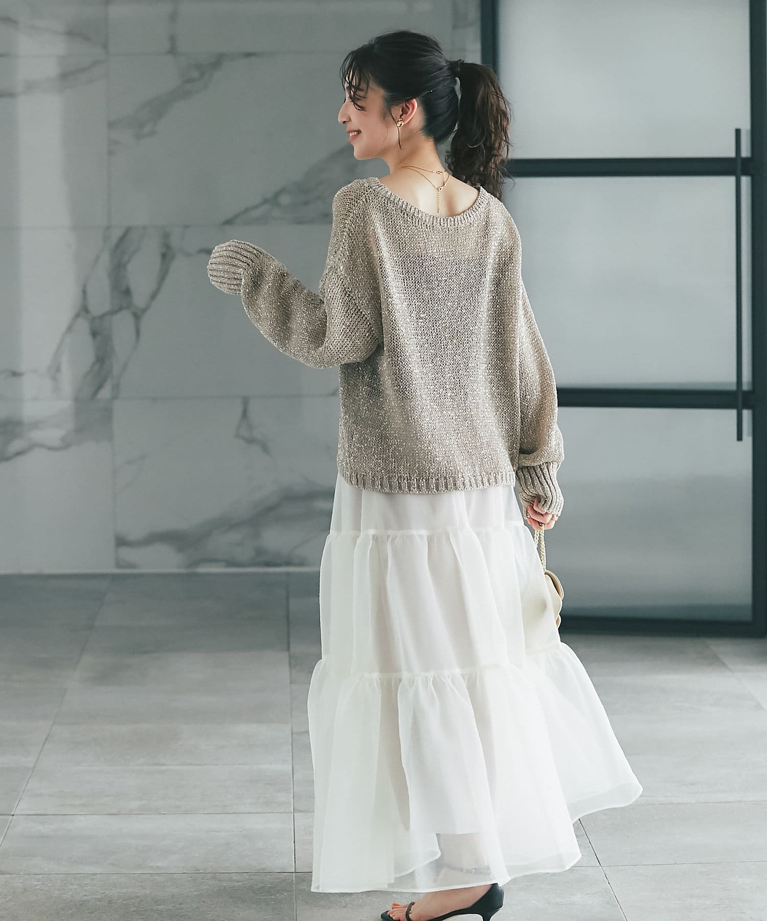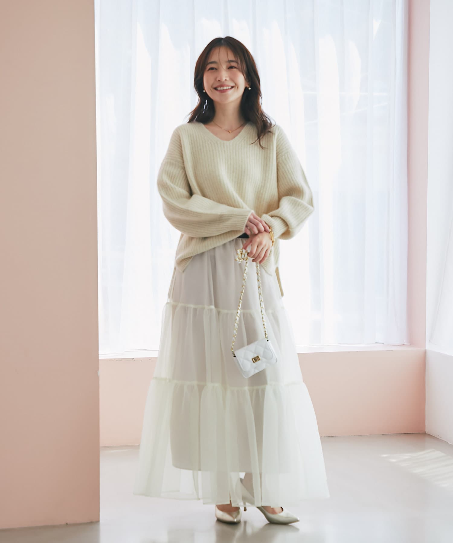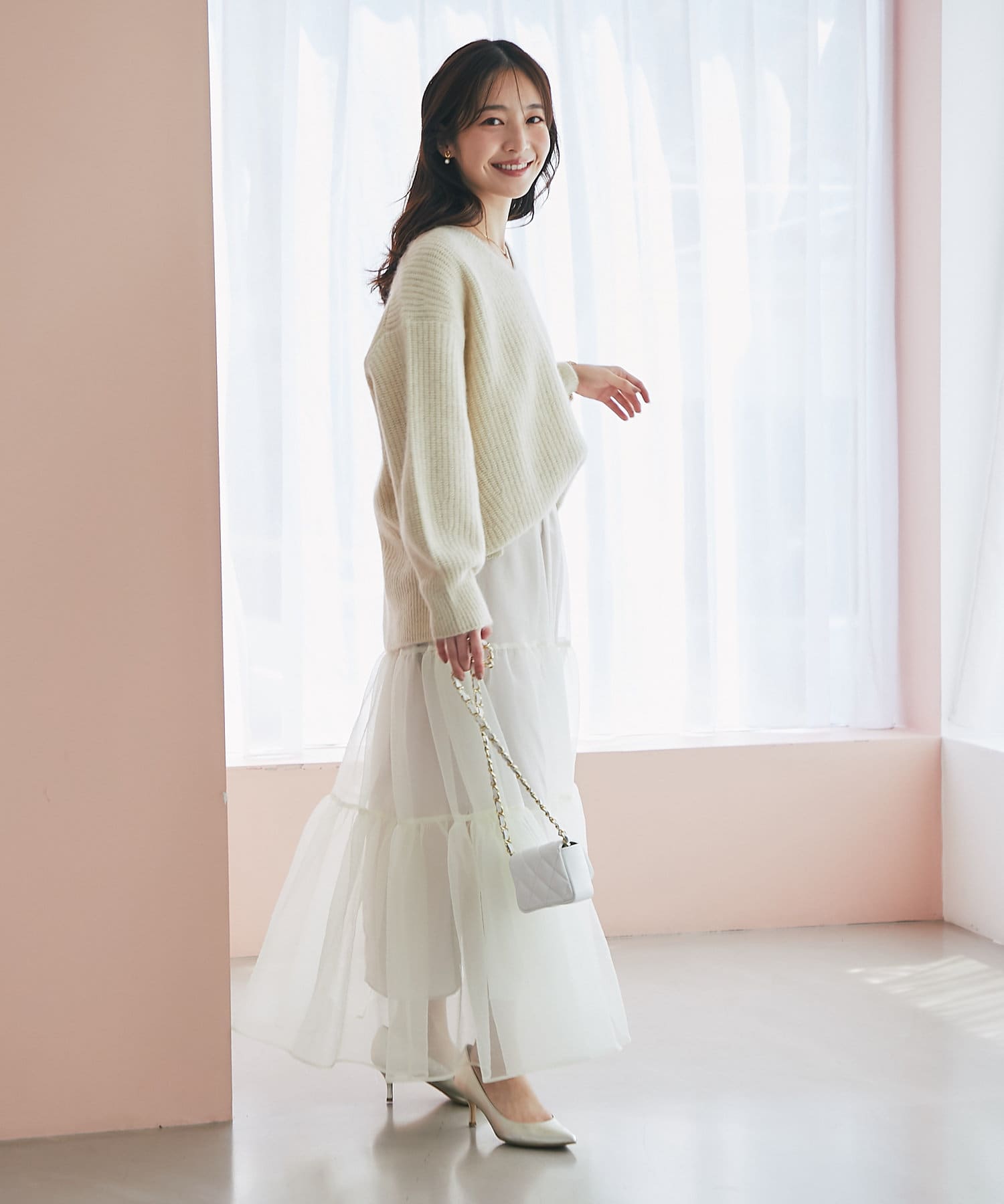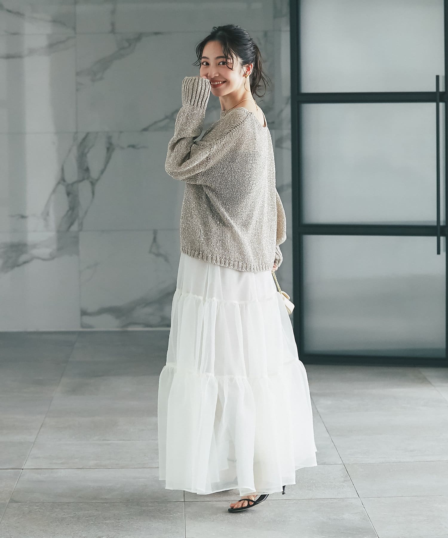 オーガンジー特有の軽やかさとふわっとしたシルエットが魅力的なティアードスカート。