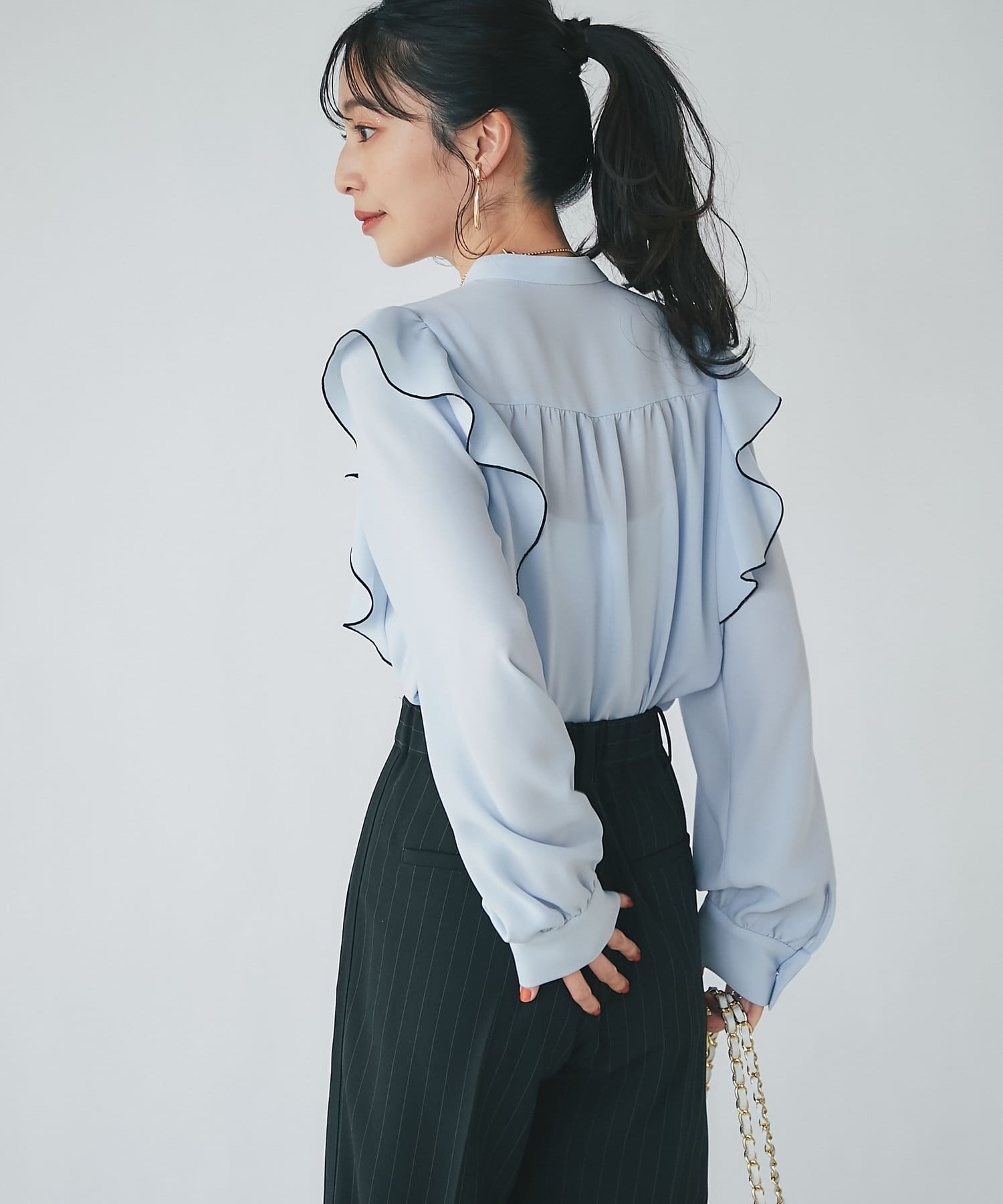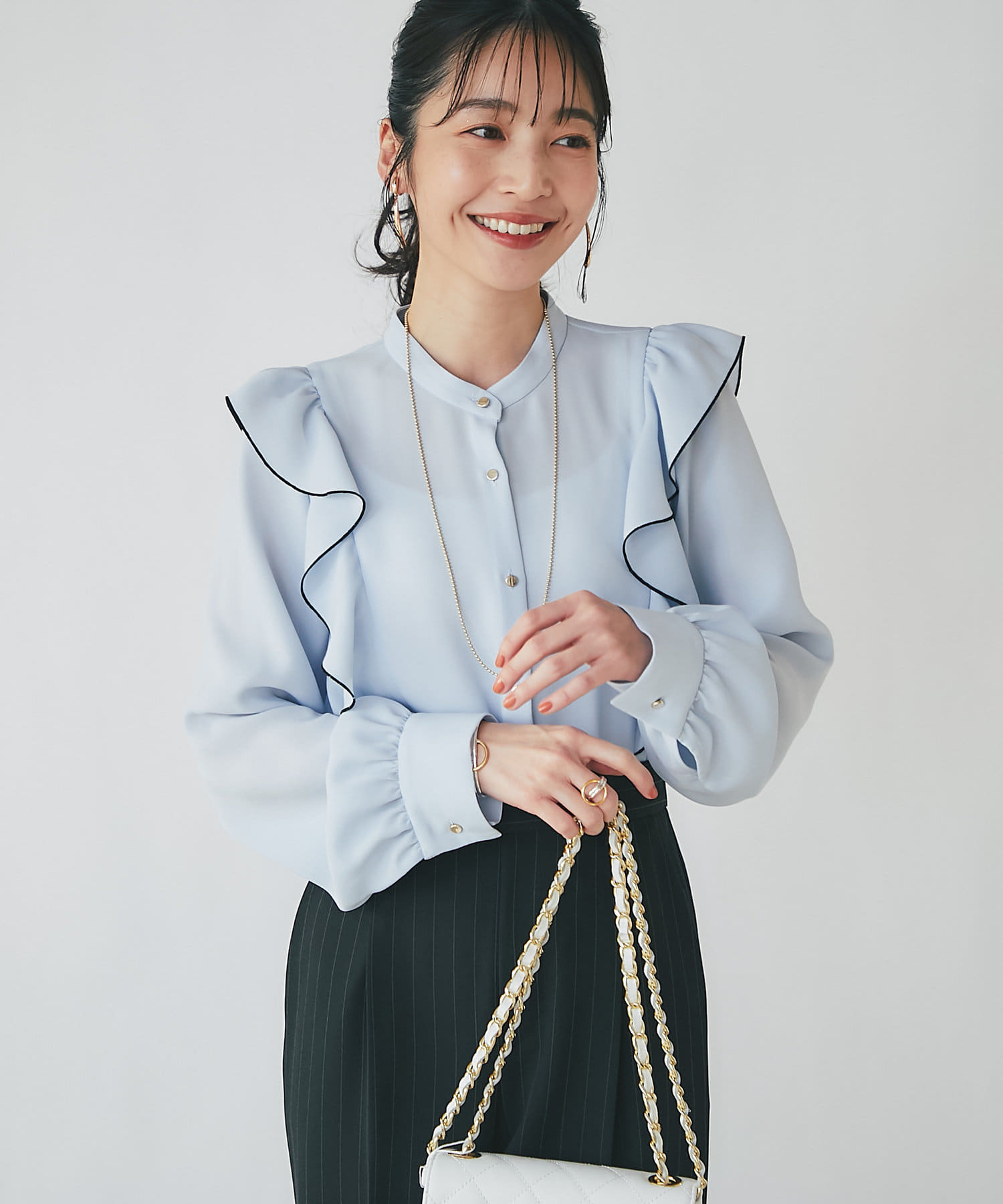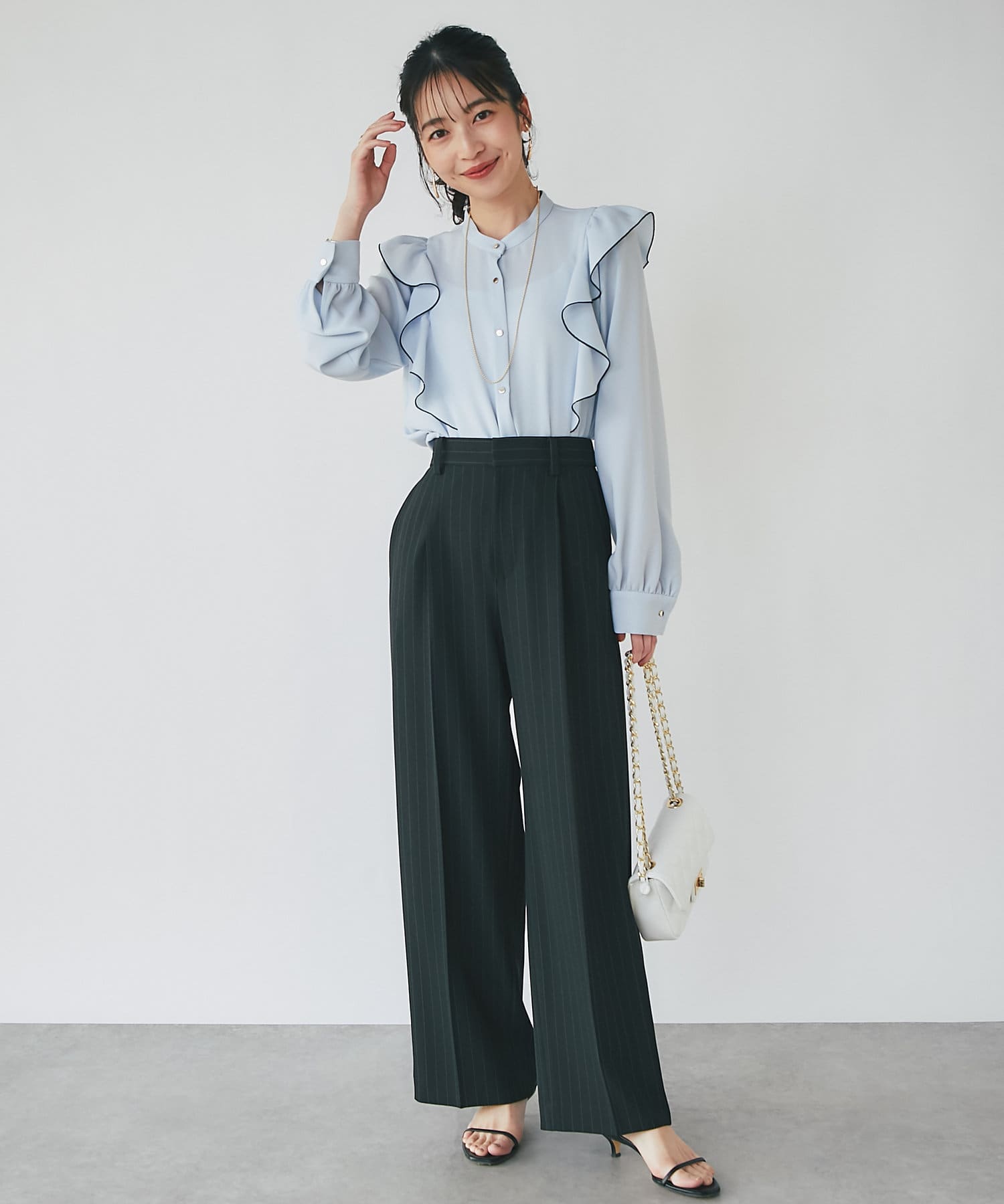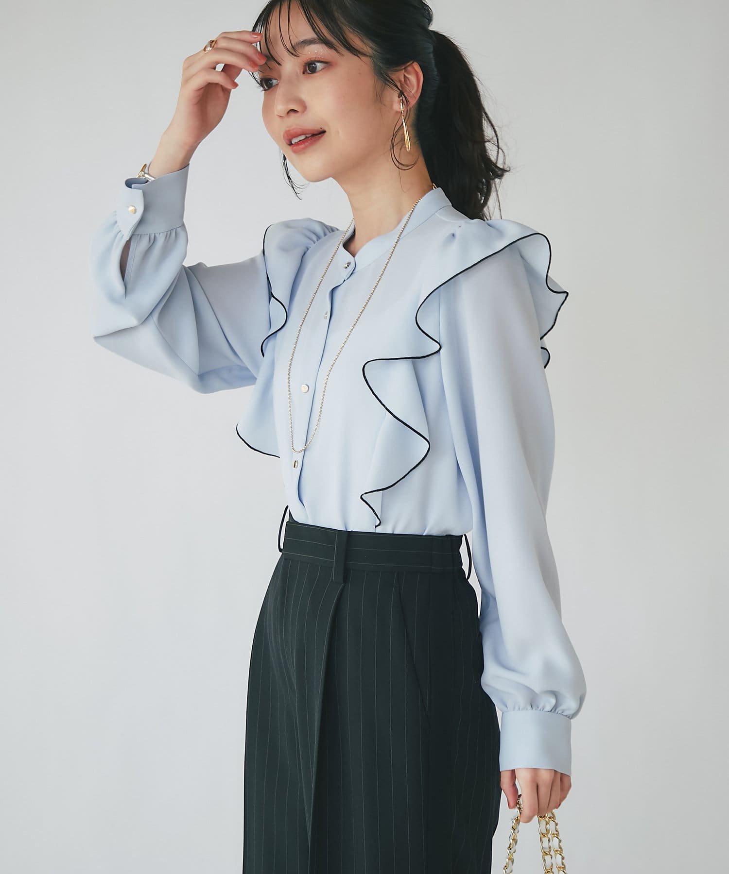 人気のラッフルブラウスをアップデート