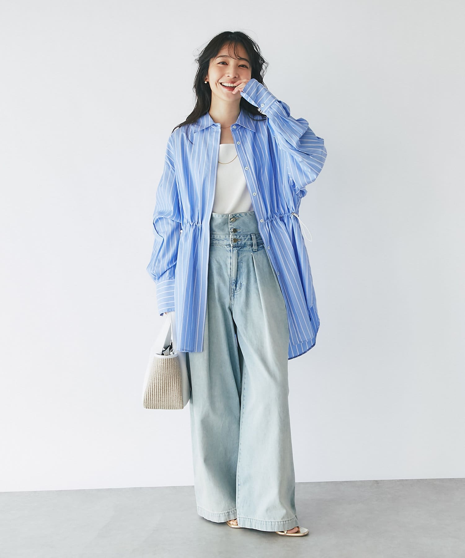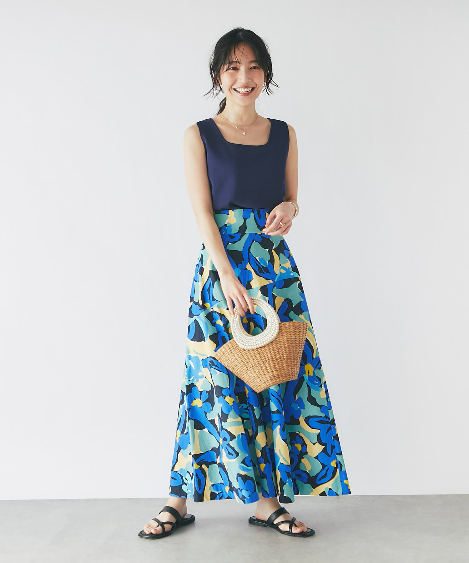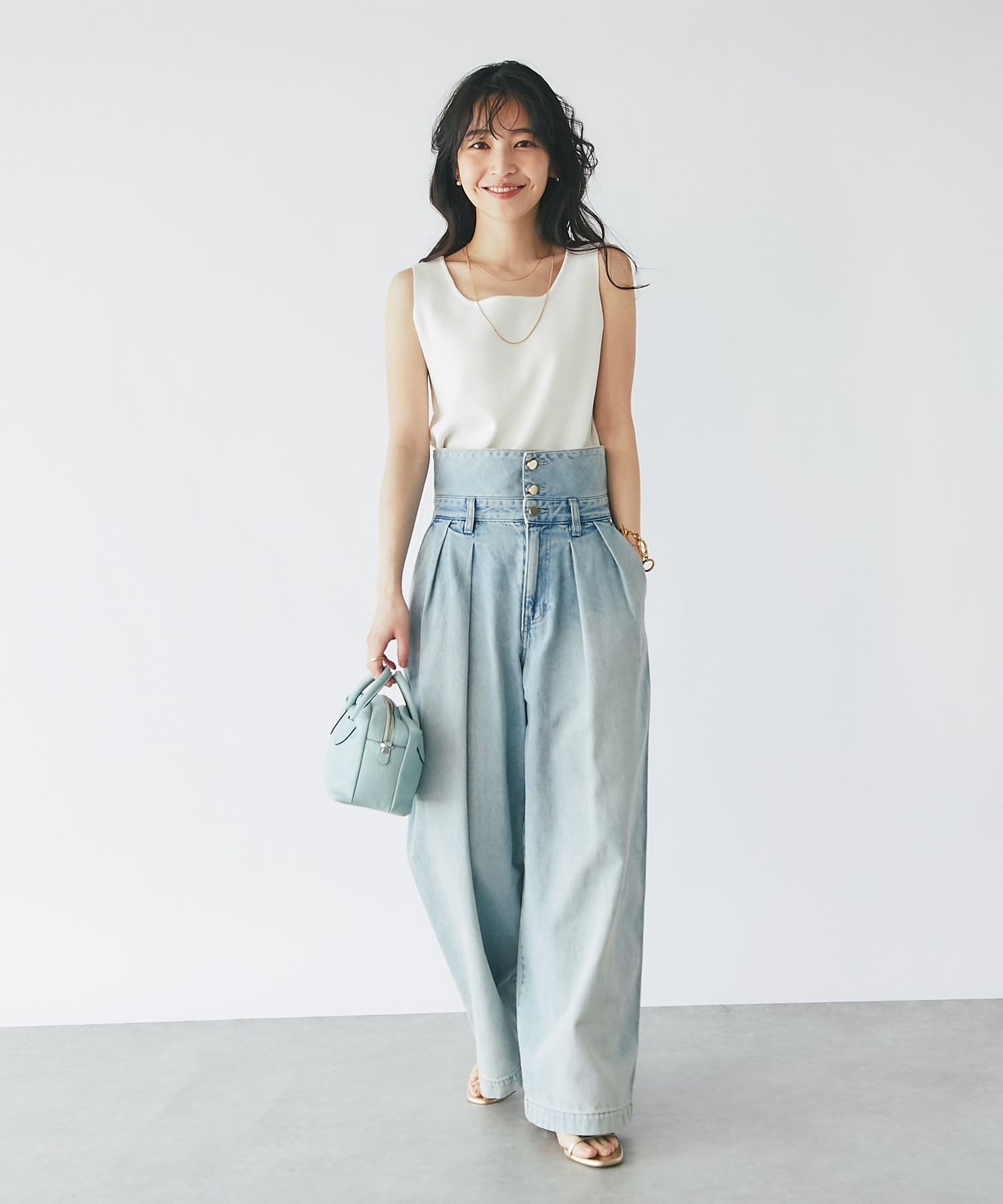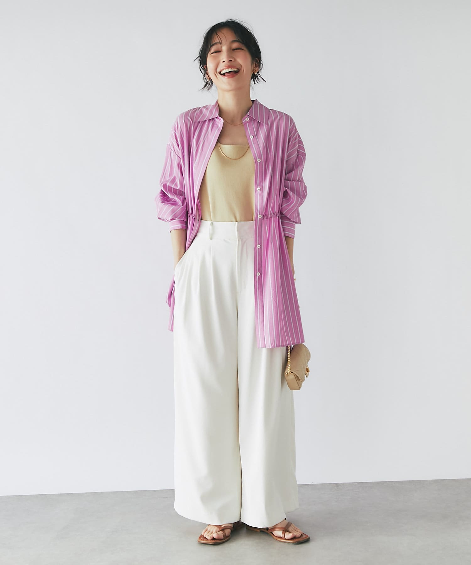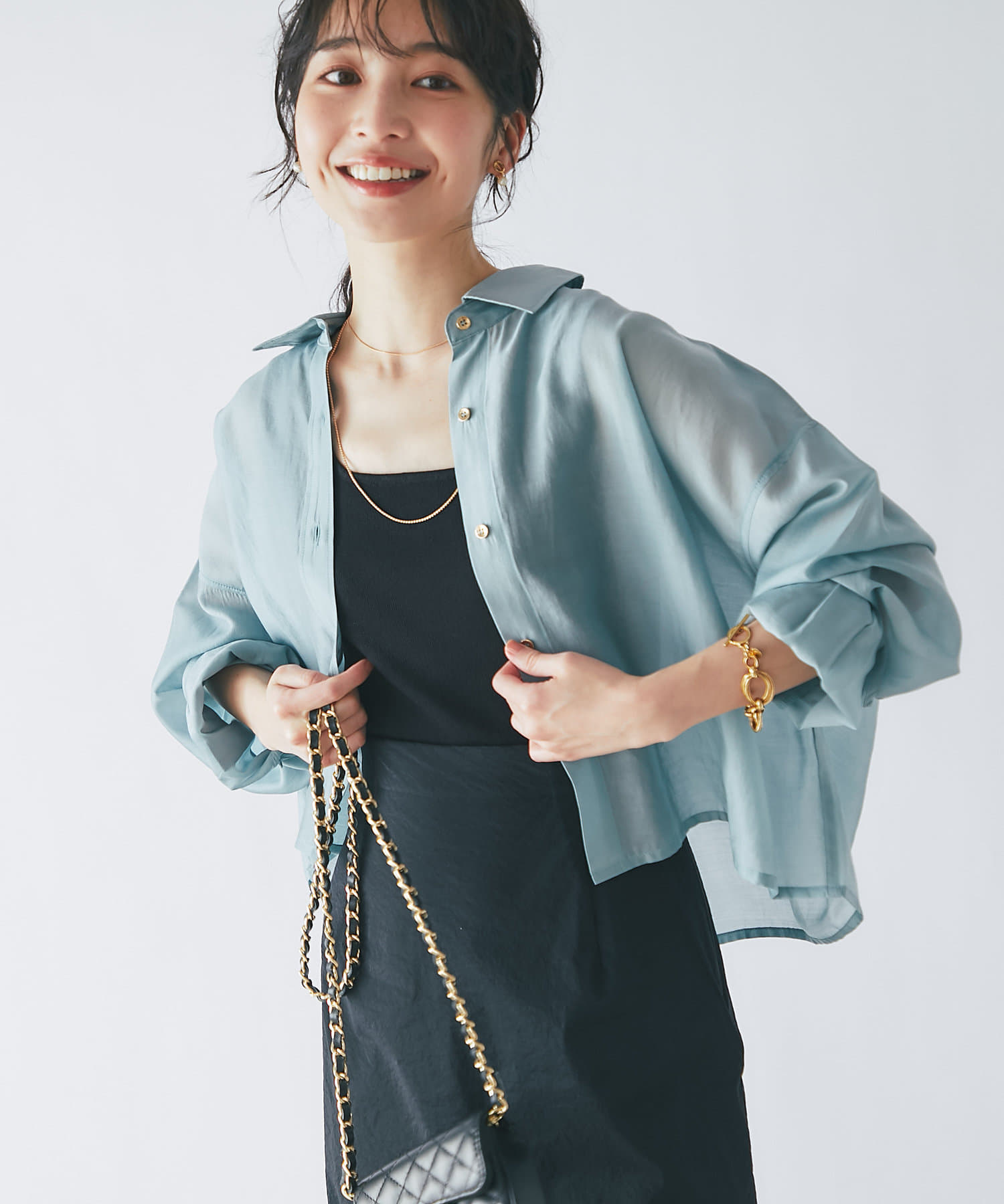 シャツの下やあみあみのニットの下に合わせてます。生地がしっかりとしているので、真夏でも一枚でさらっと着れます。