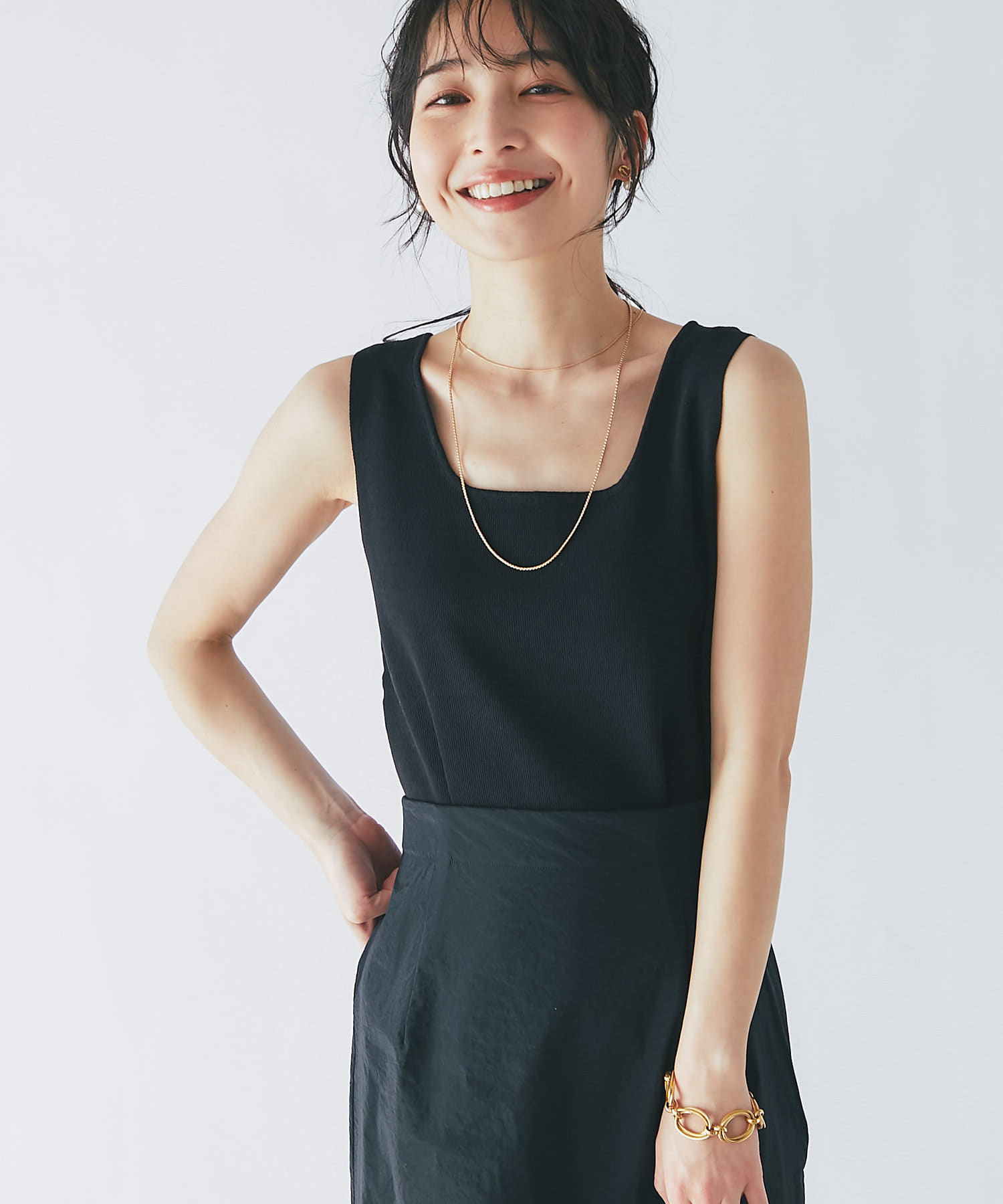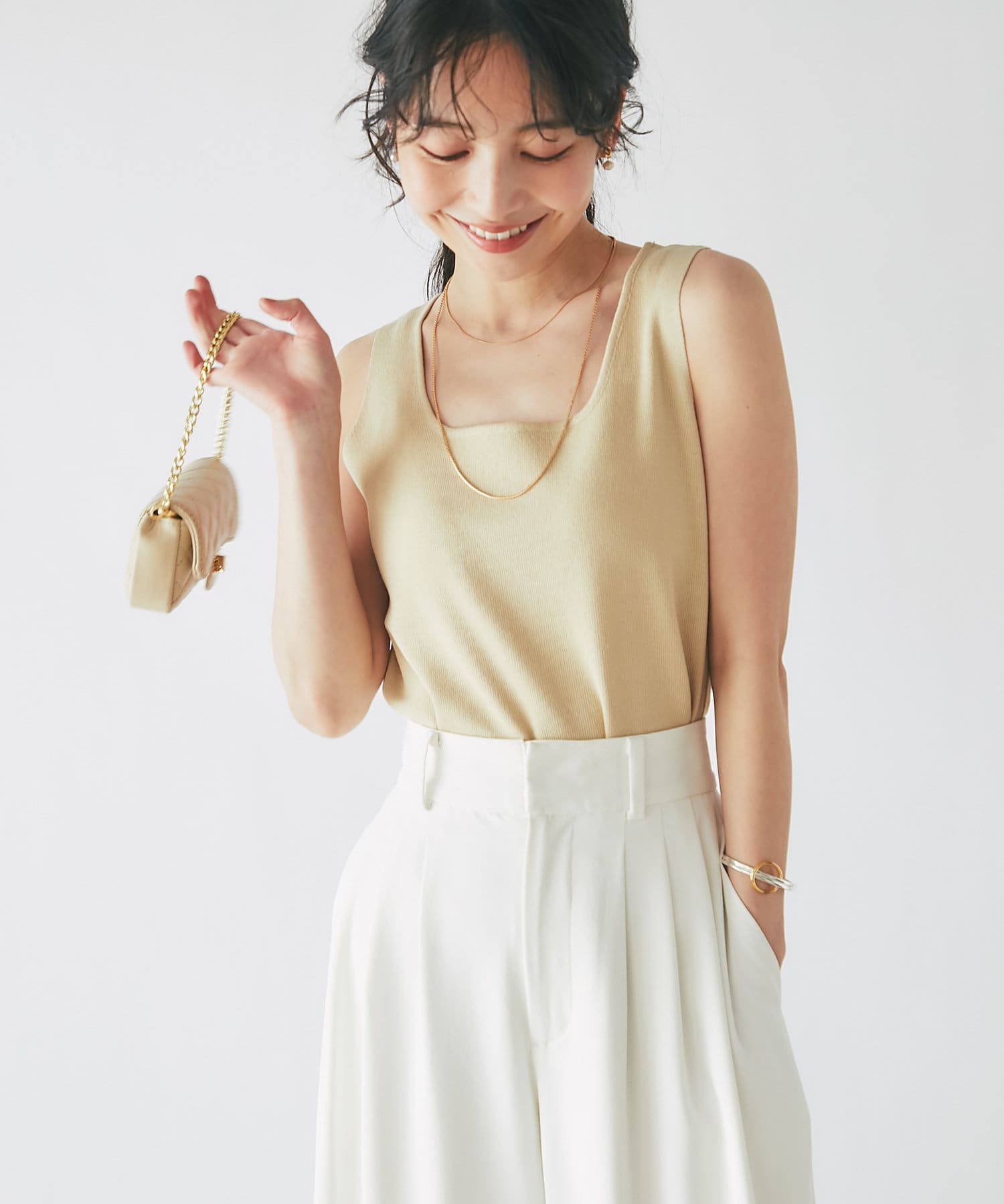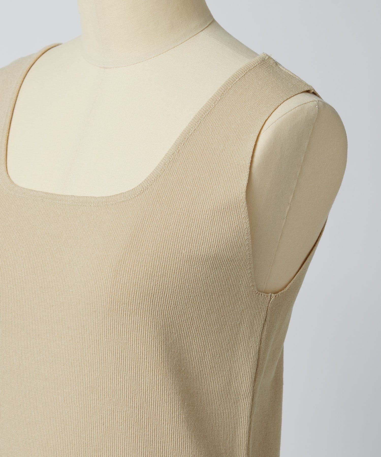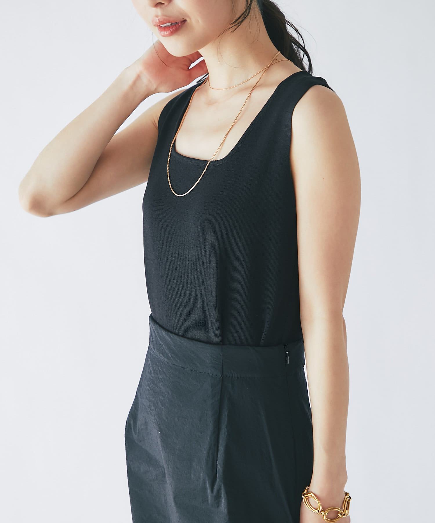 ドライ感がありながらも、肌なじみの良い滑らかさも併せ持つニットタンク。