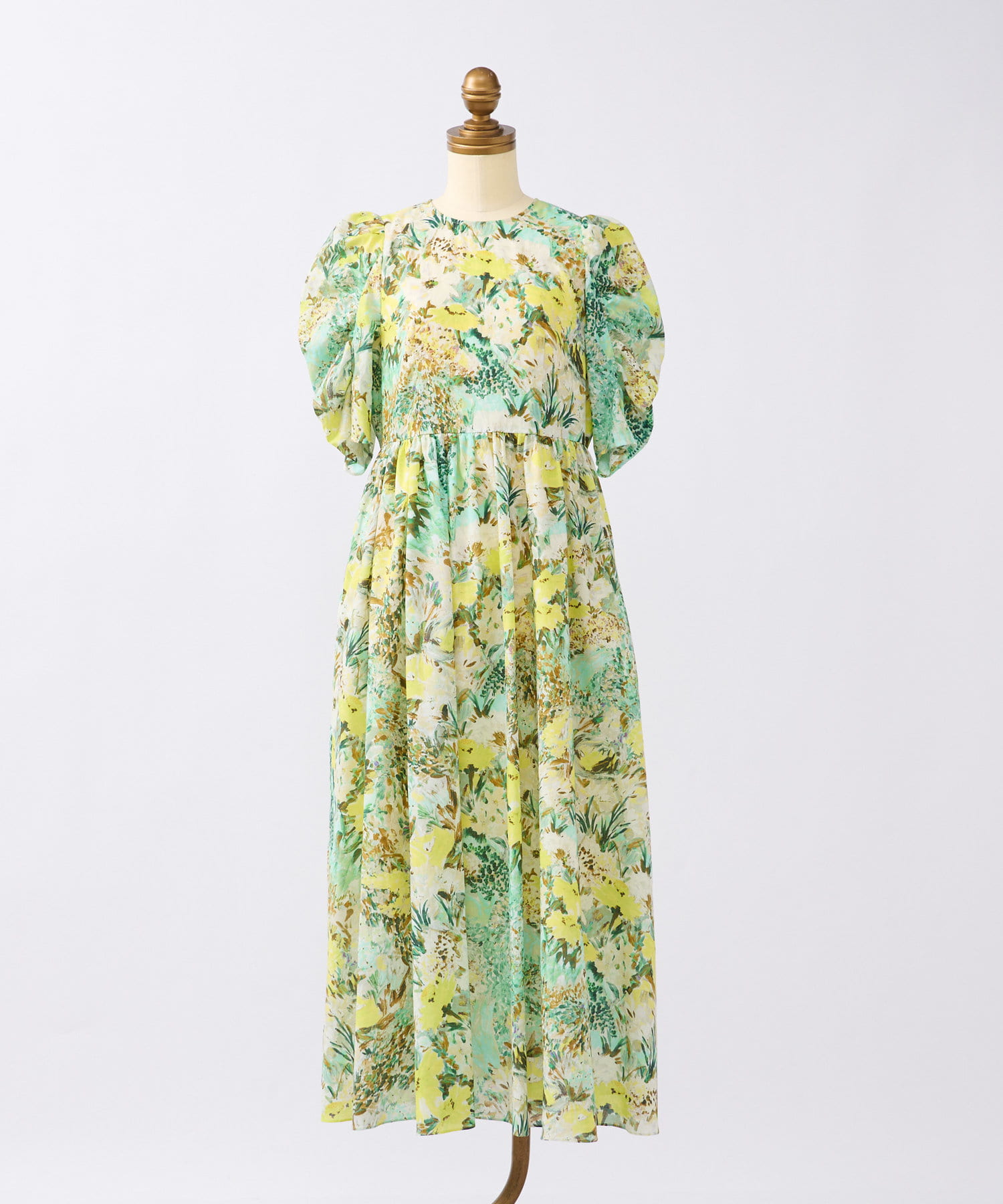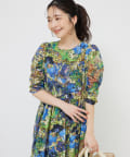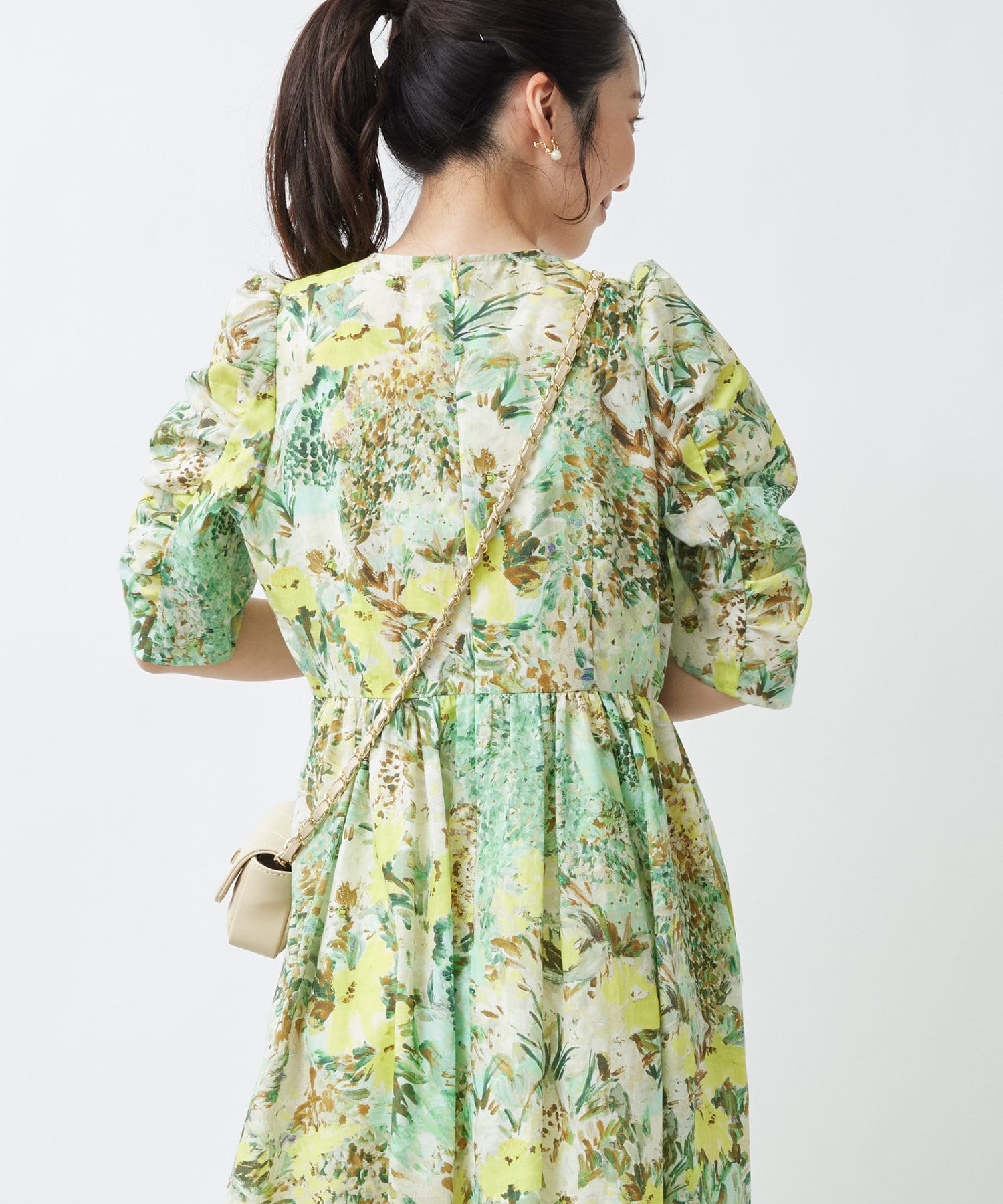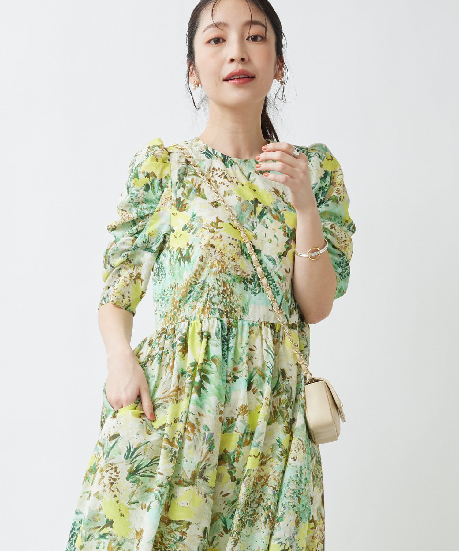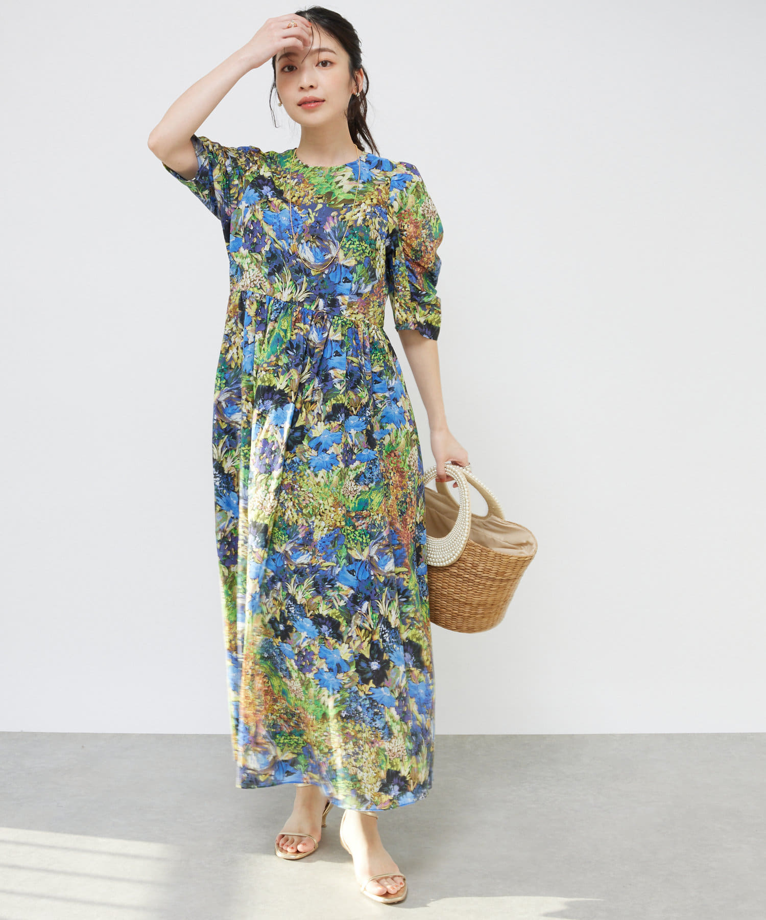 【華やぎ・映えカラー】花柄ギャザースリーブワンピース
