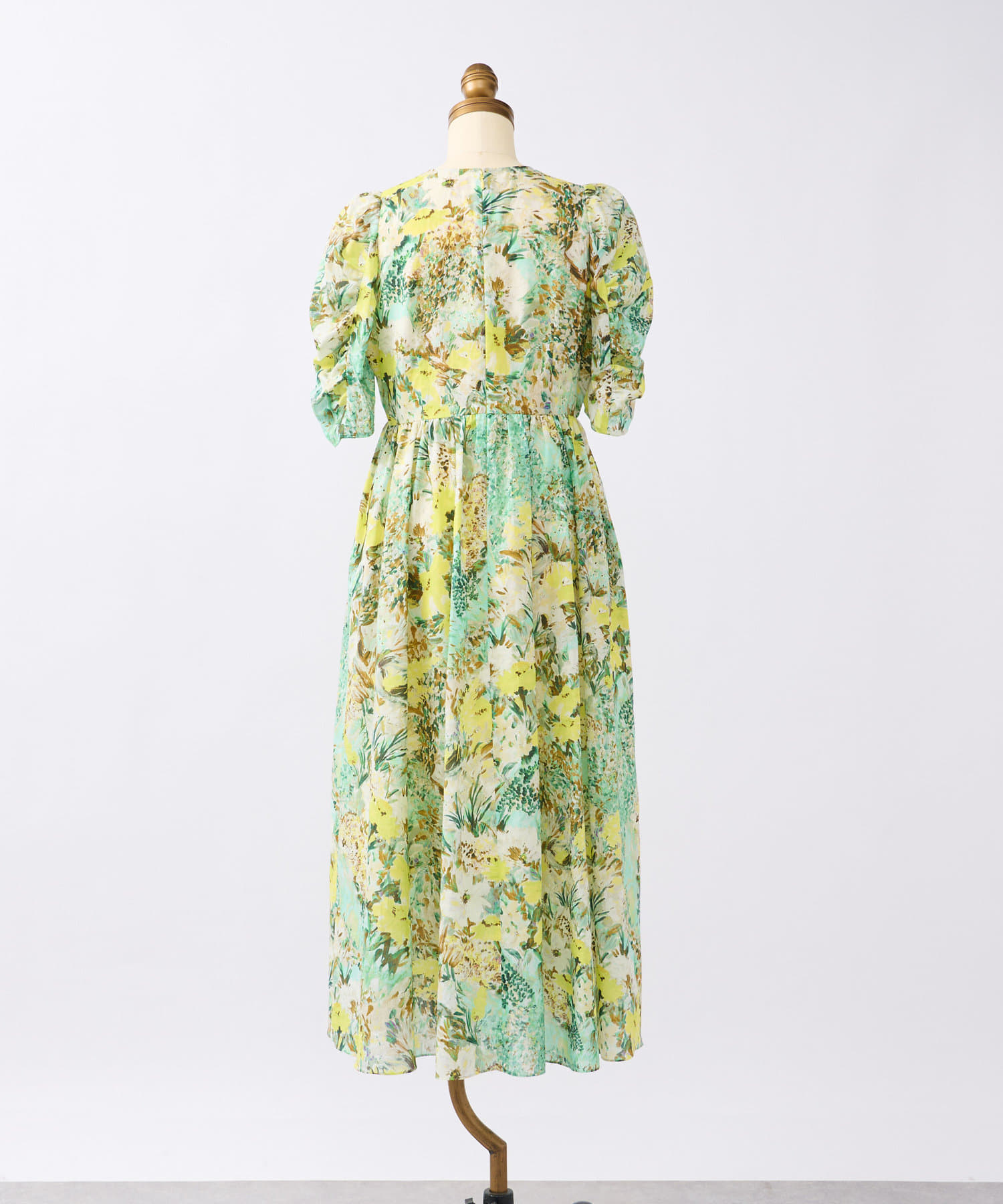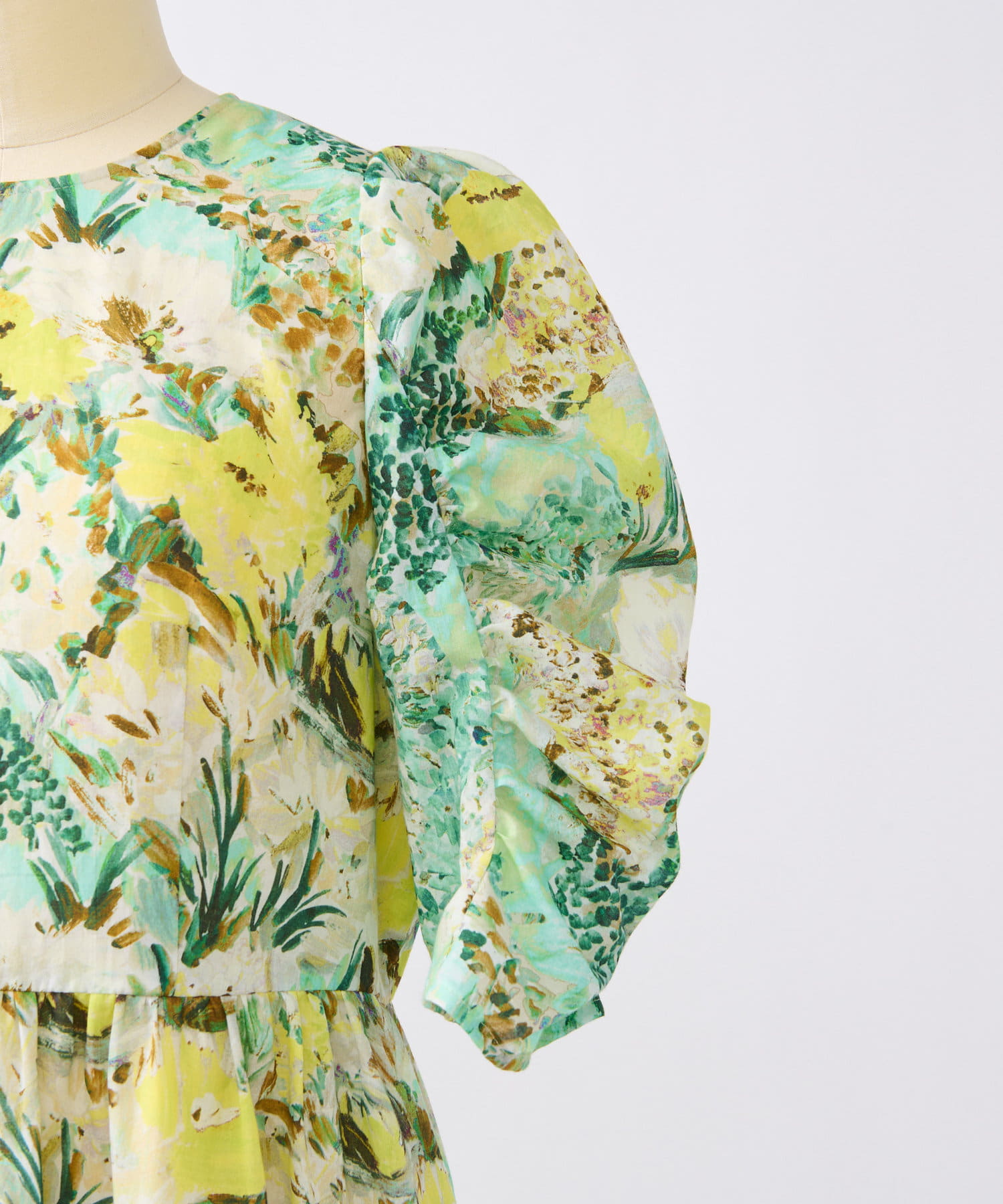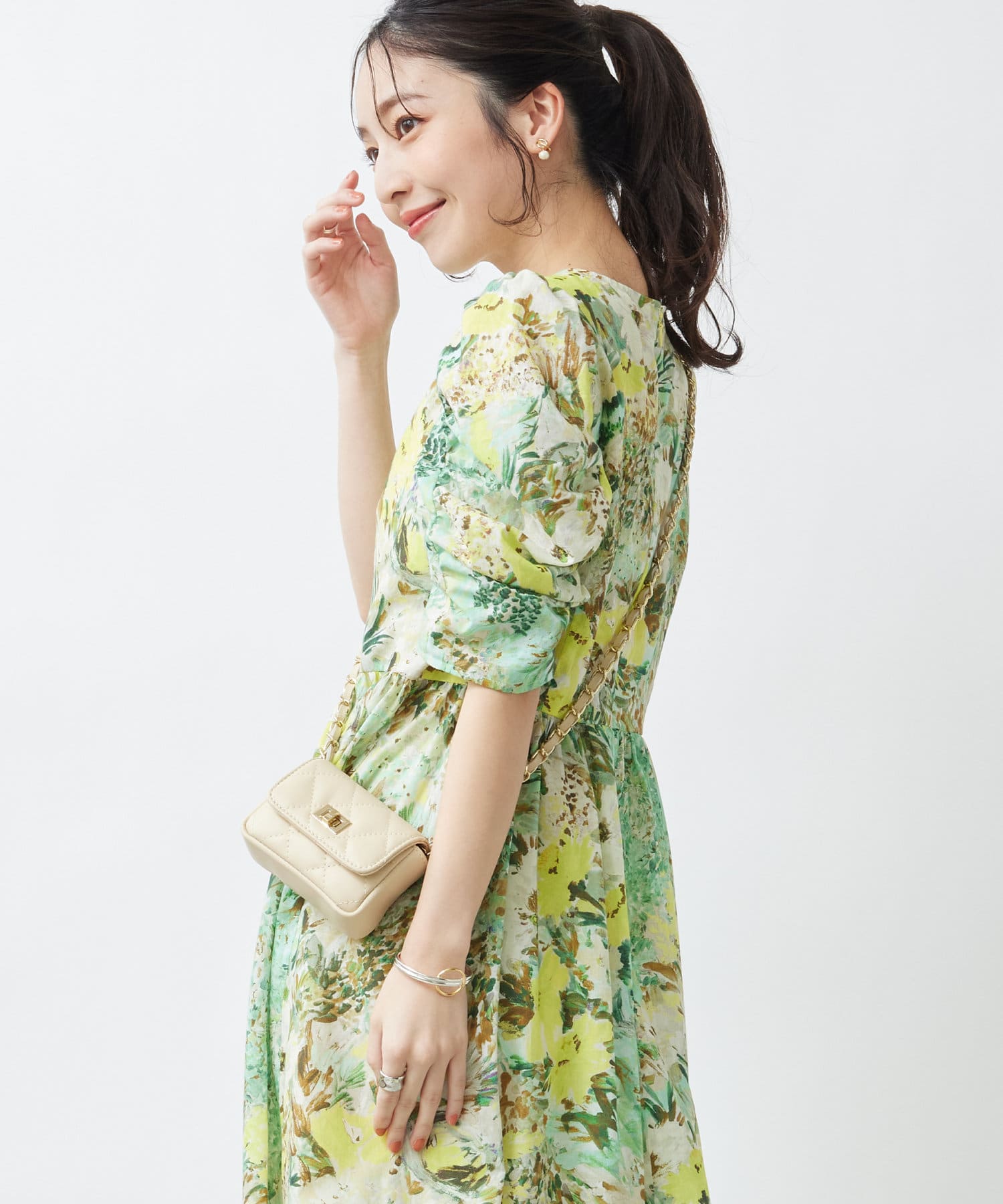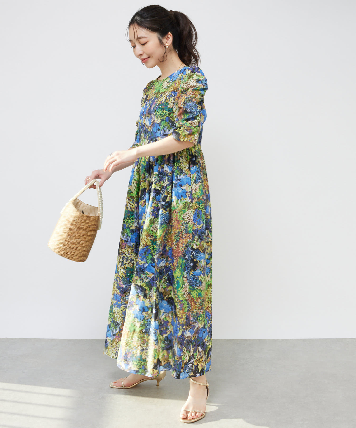 【華やぎ・映えカラー】花柄ギャザースリーブワンピース