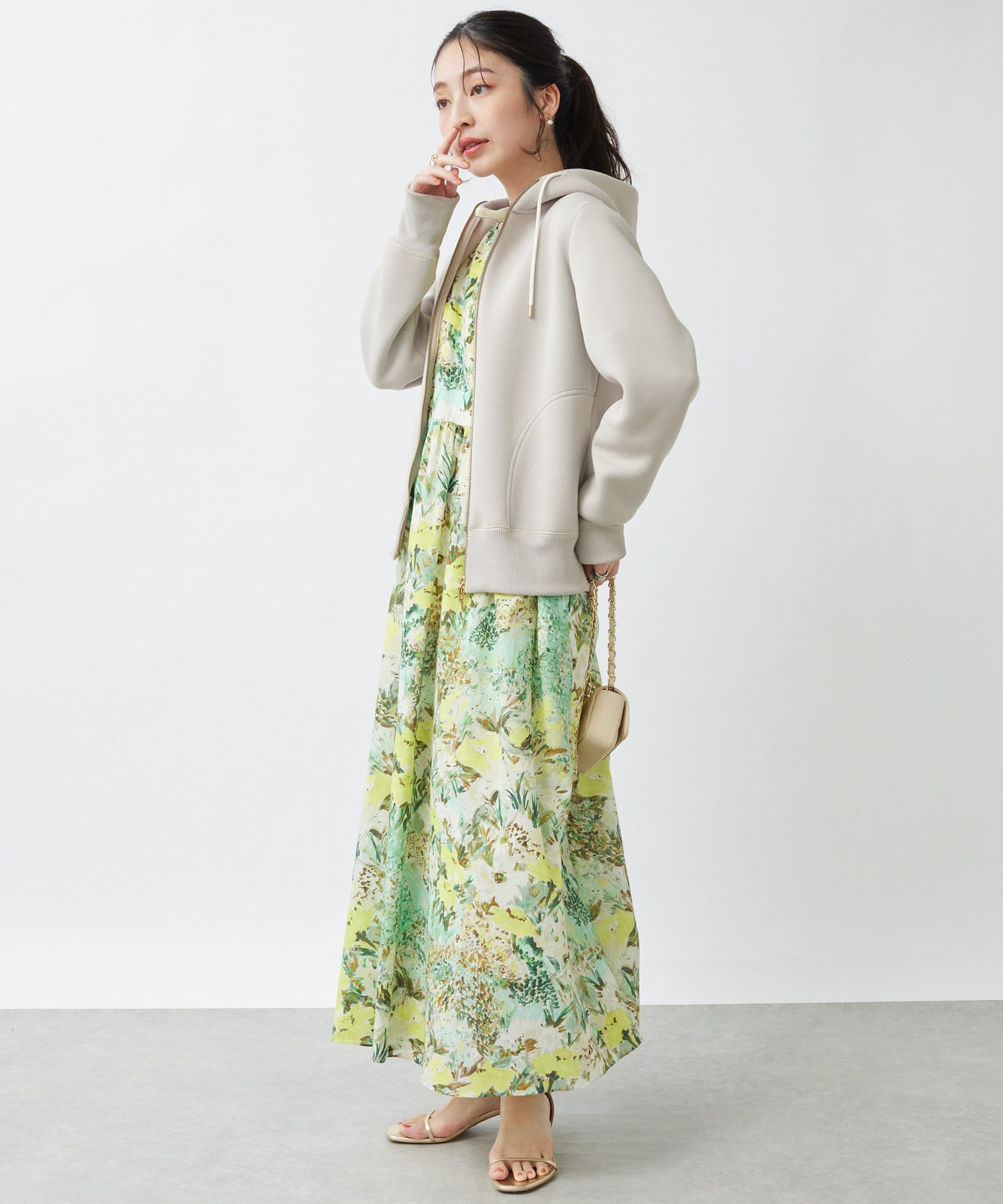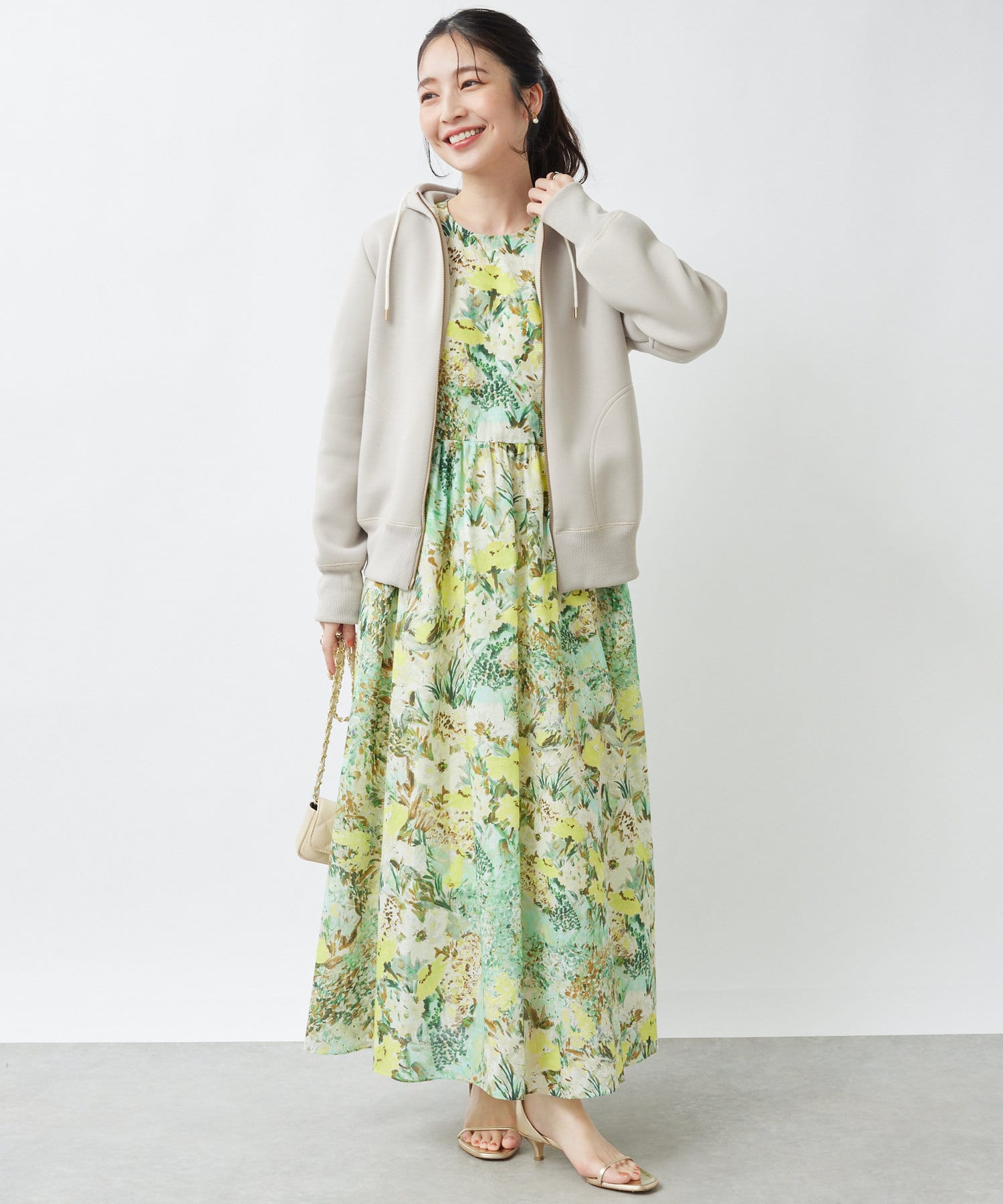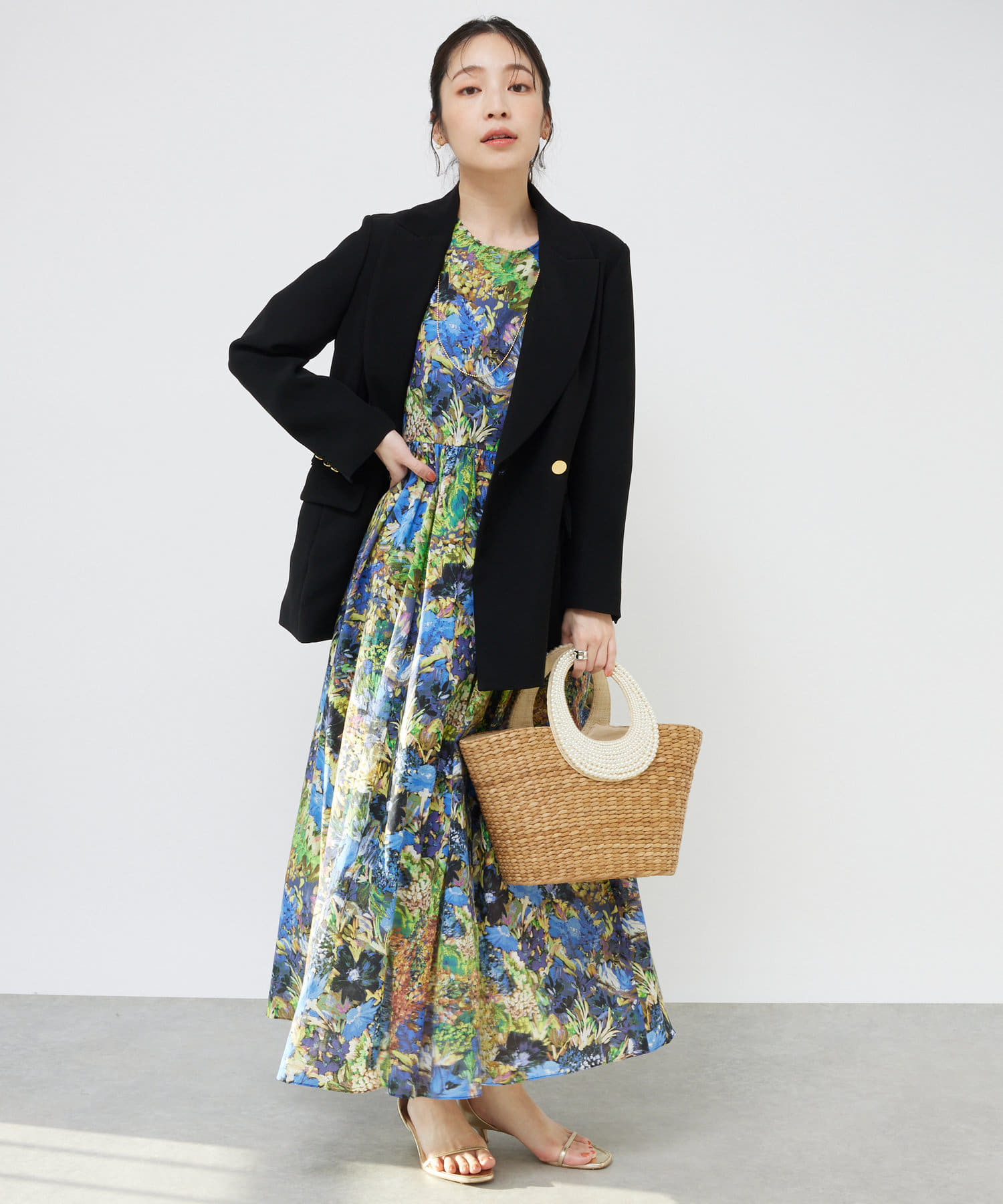 生地を贅沢に使用した、印象的な花柄のロングワンピースです。