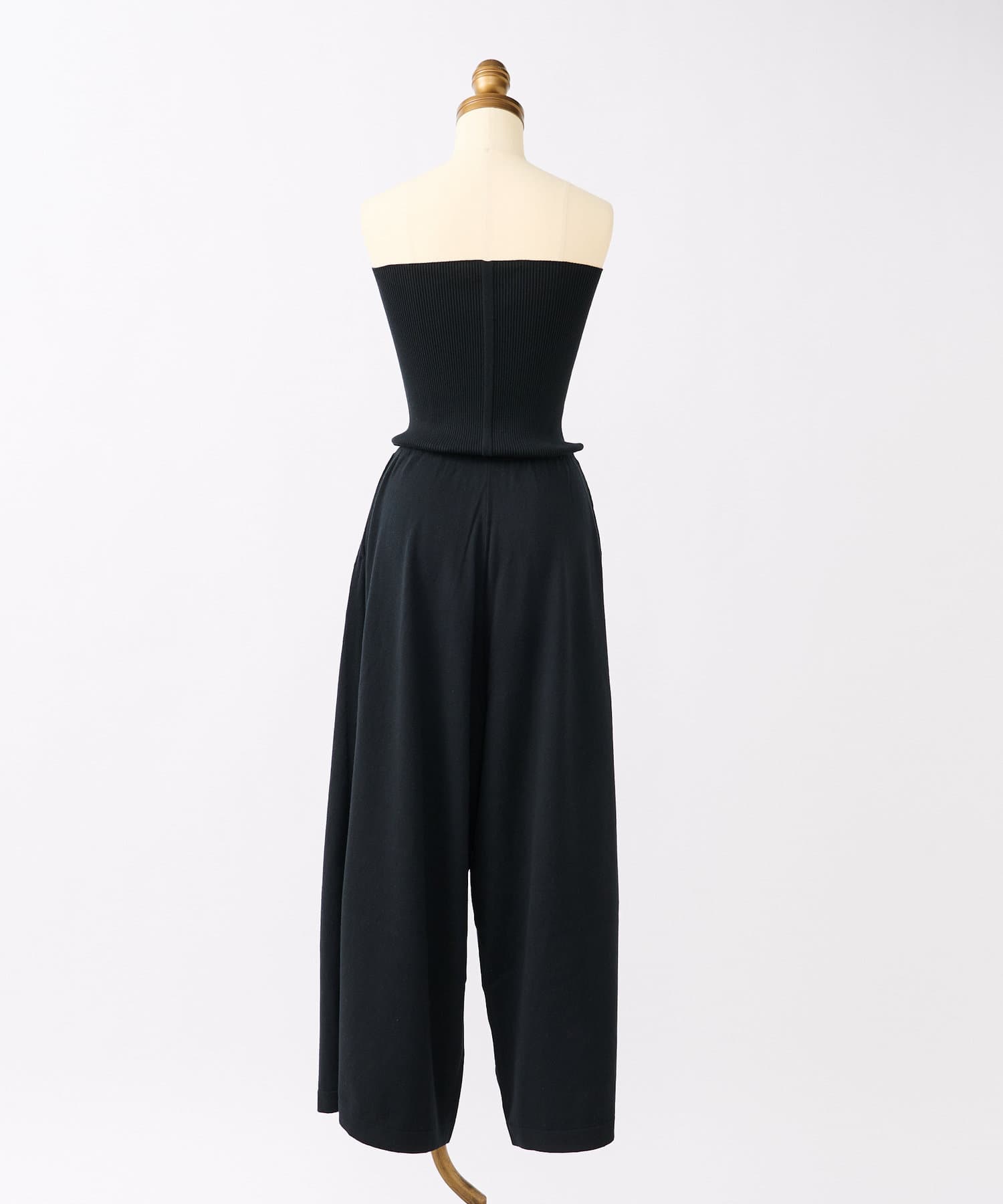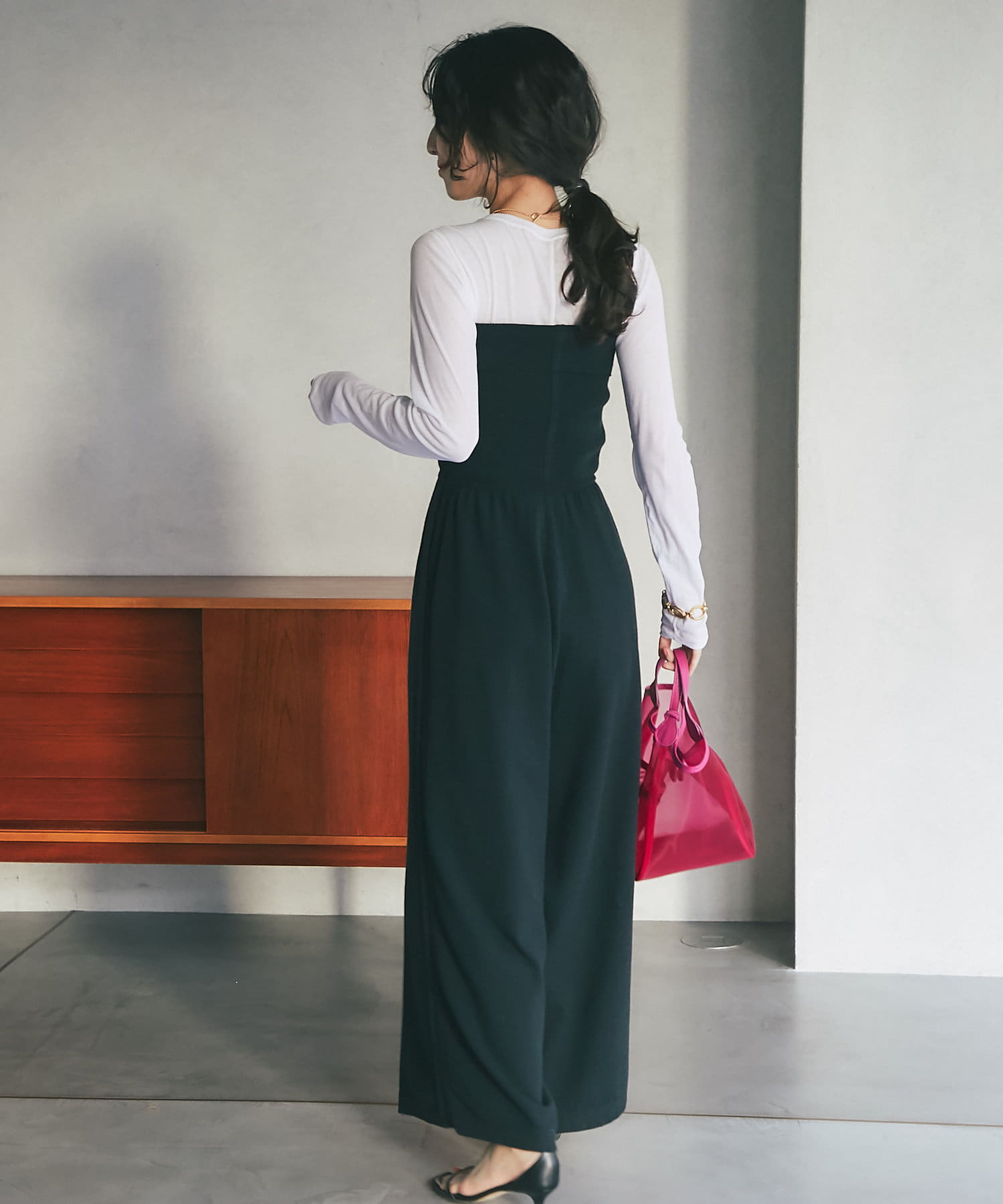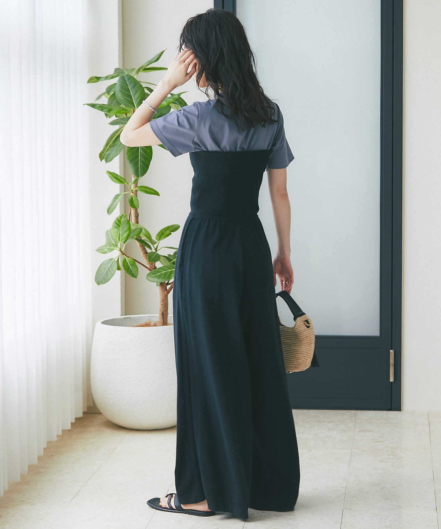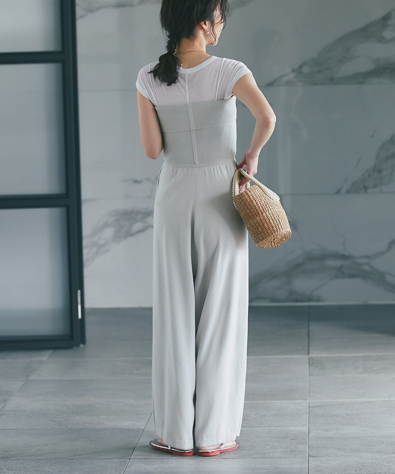 上身頃はリブ編みでフィットするようにストレッチを効かせたフェミニンオールインワン。
