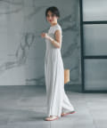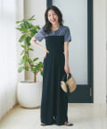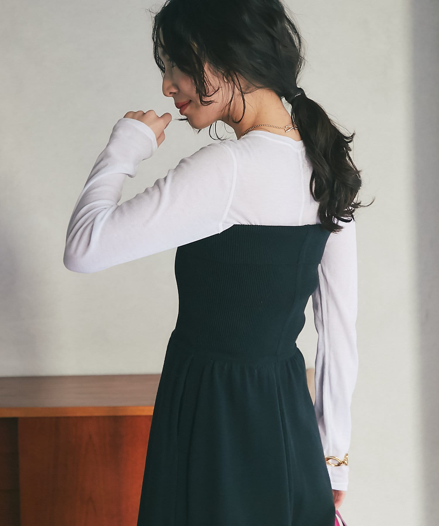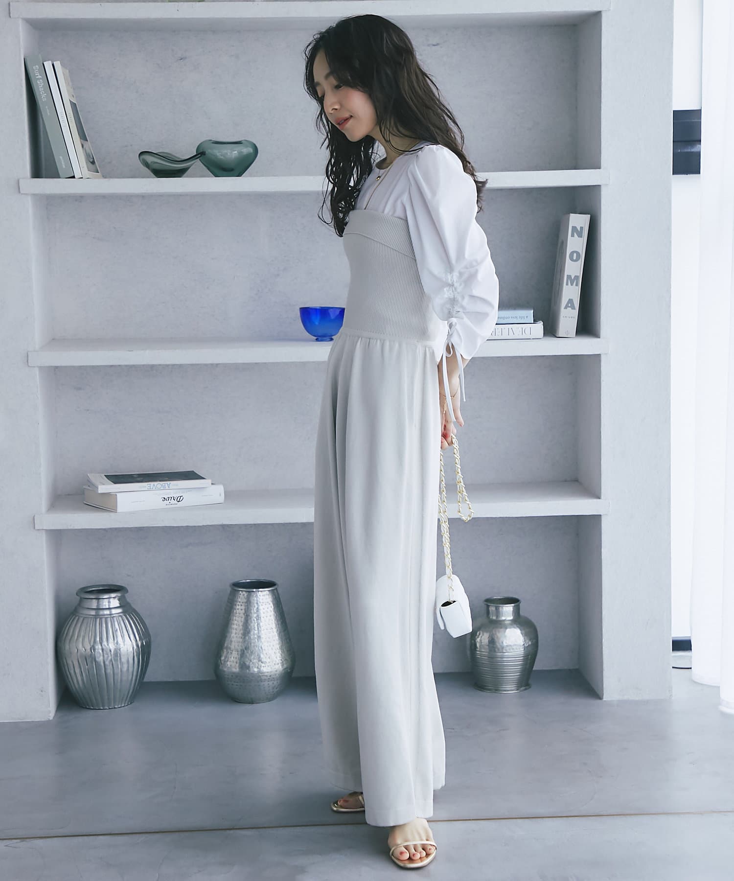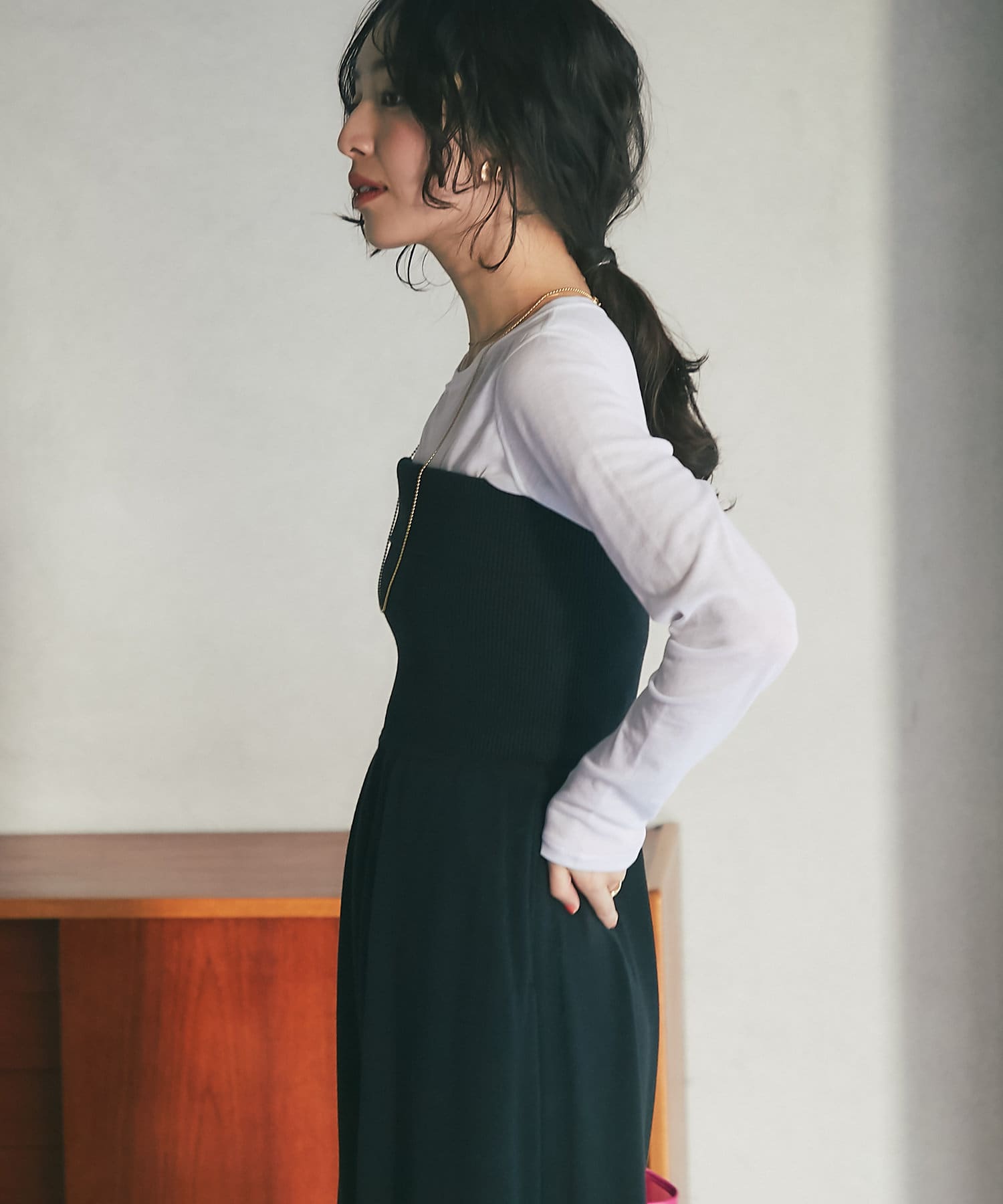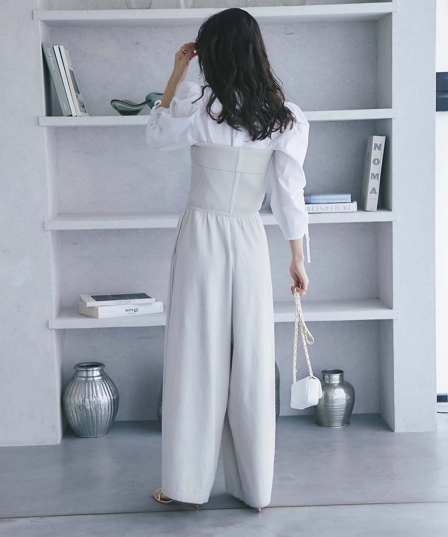 上身頃はリブ編みでフィットするようにストレッチを効かせたフェミニンオールインワン。