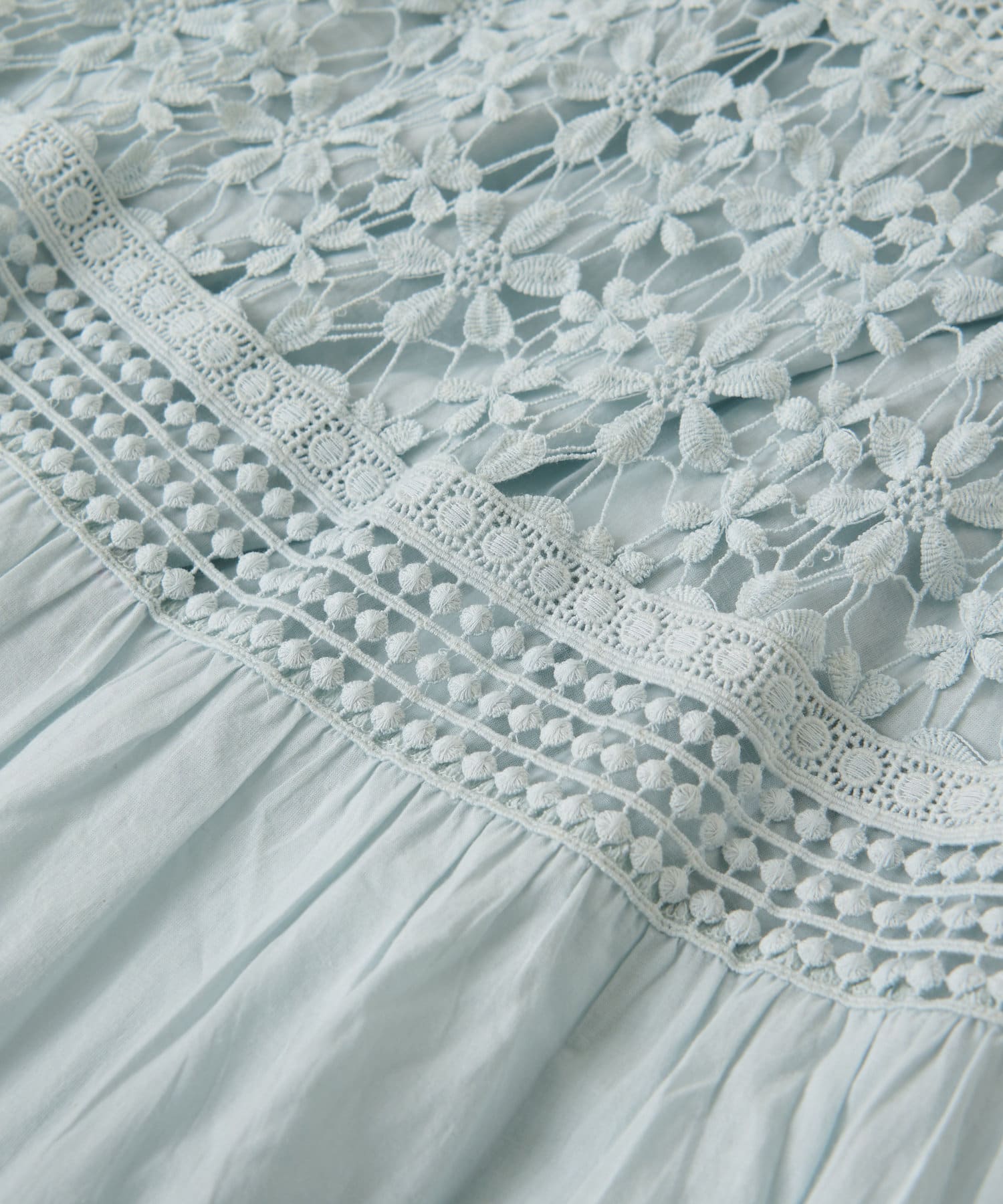 ふっくらした編み地のインドレースが特徴的で、生地もインドの繊細な透け感と柔らかみのあるものを使用しています。