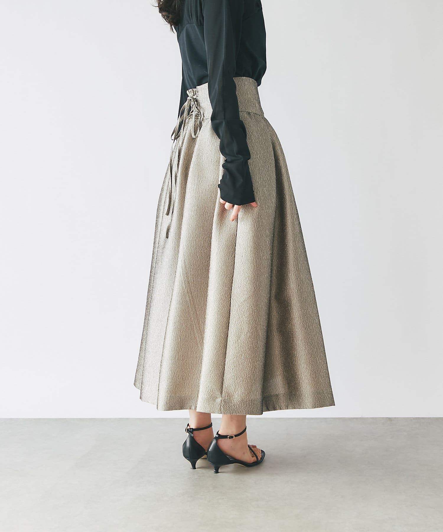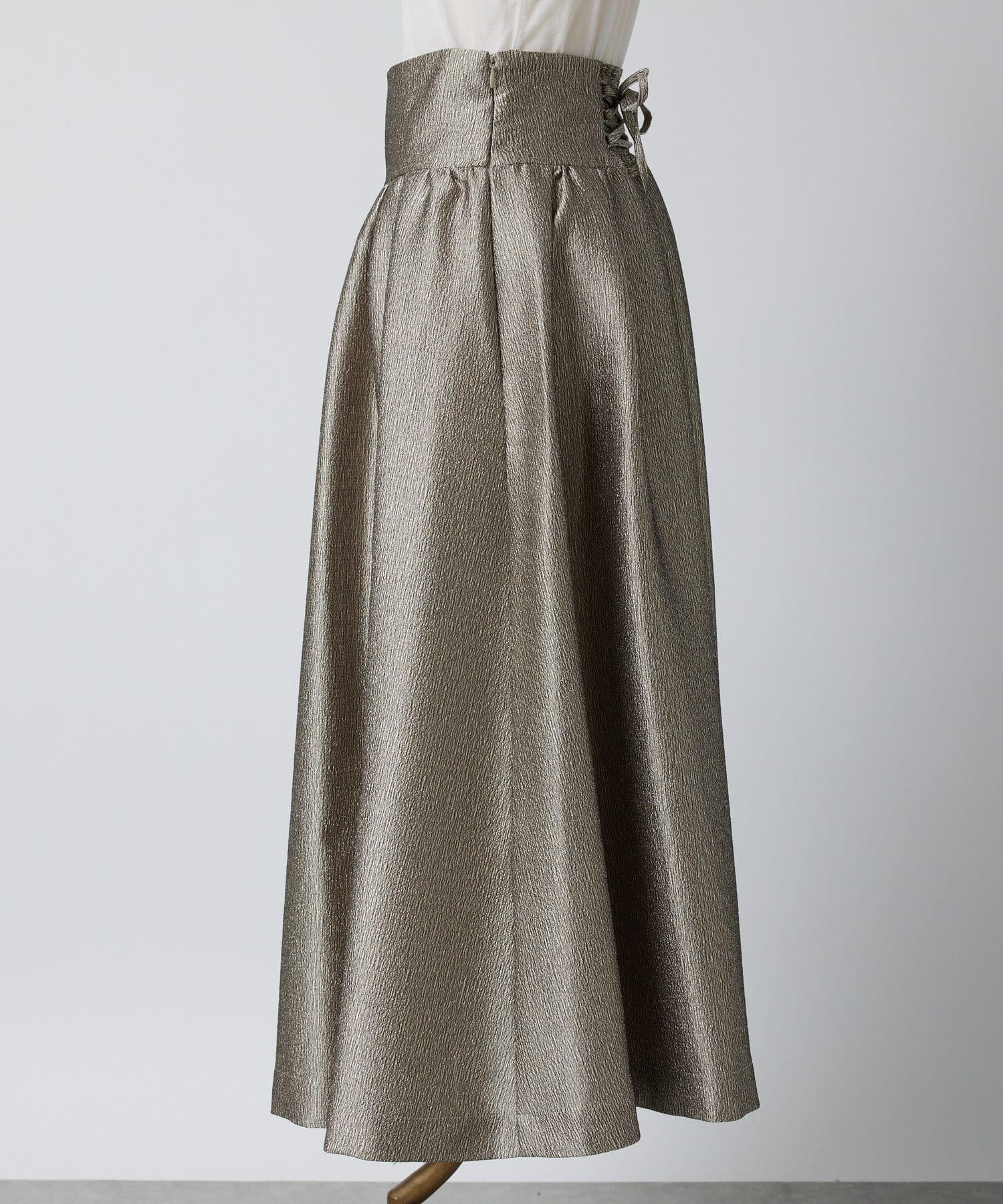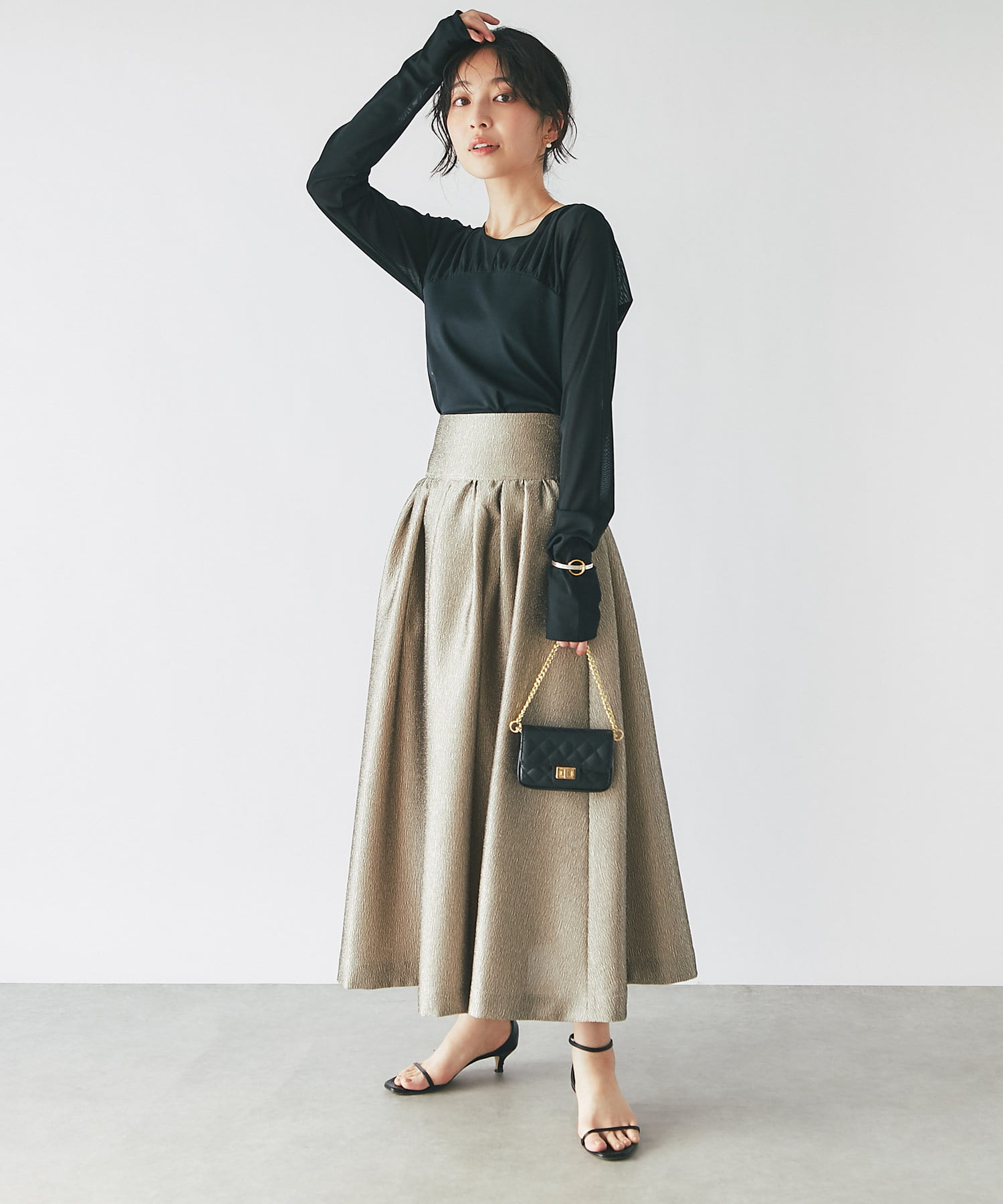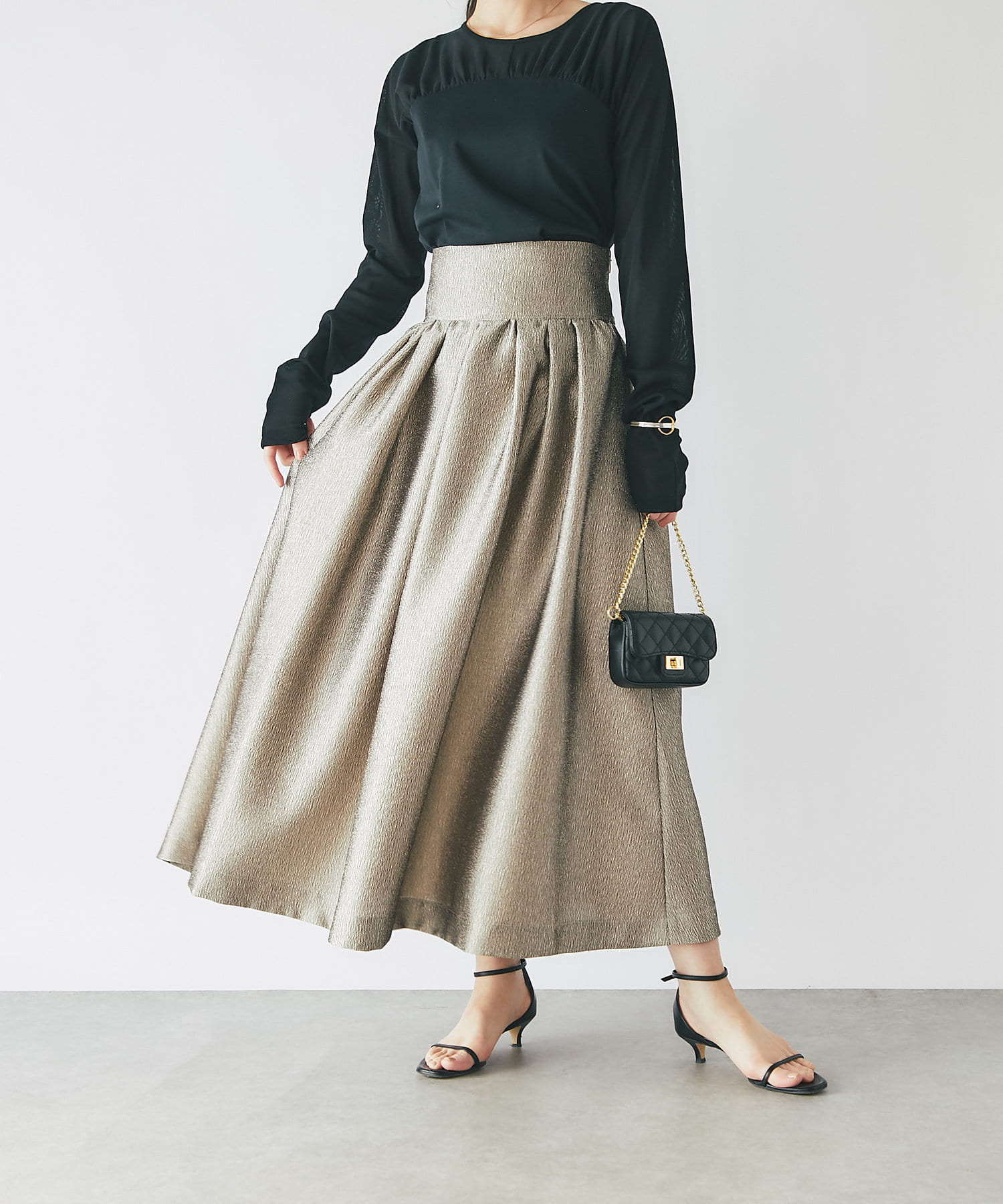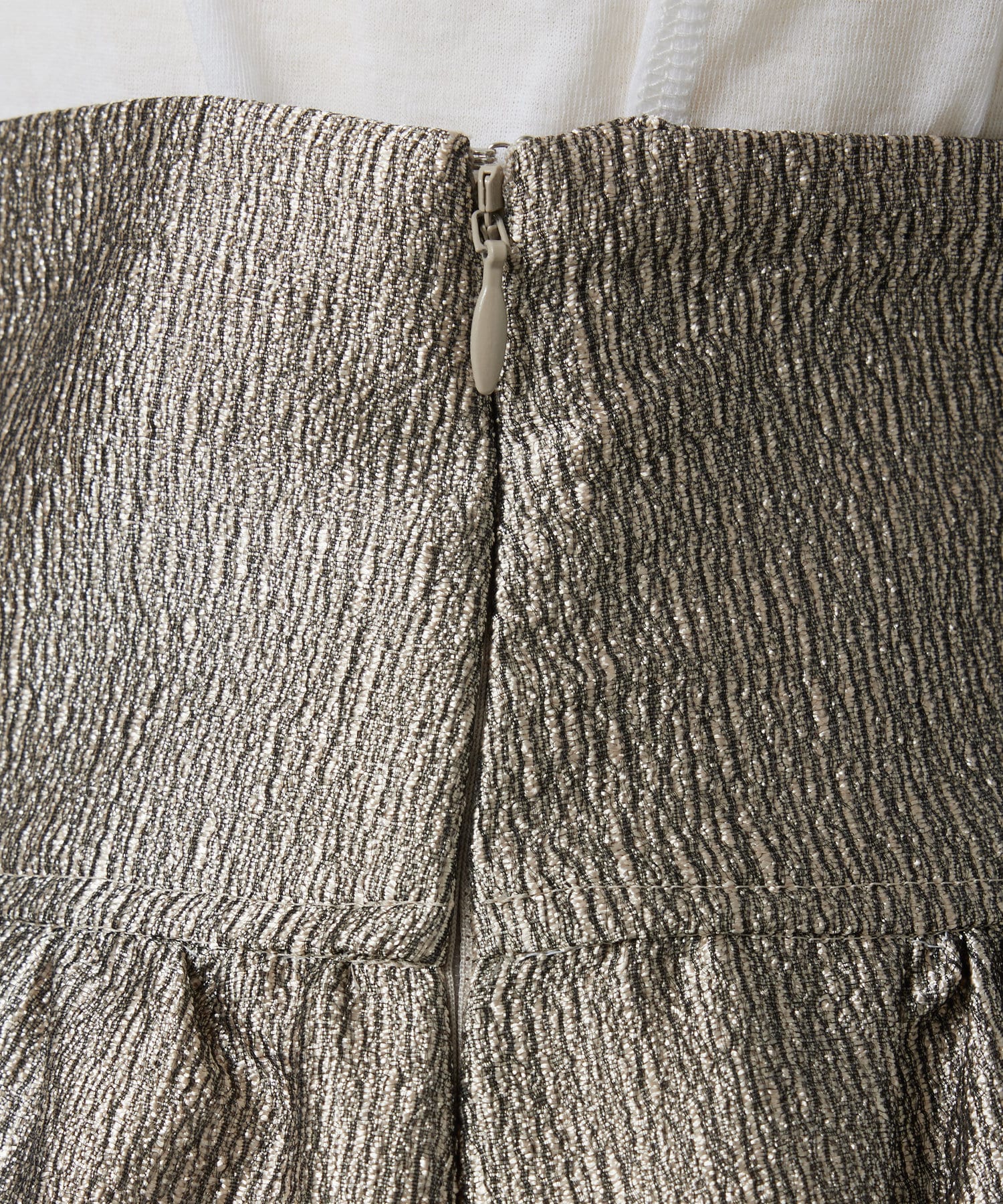 メタリックの煌めきある立体的なジャガード素材を使用した華やかなフレアスカート。
