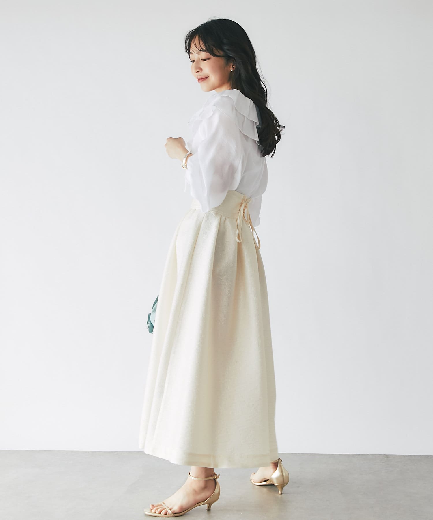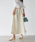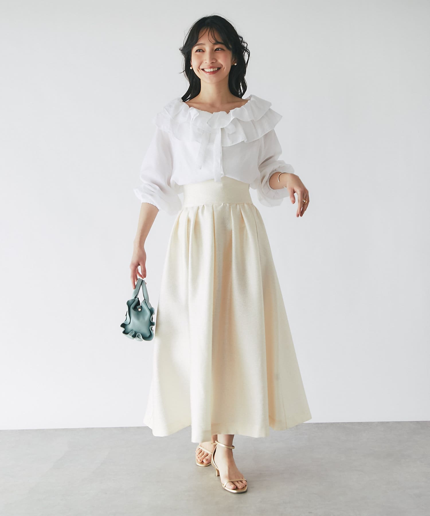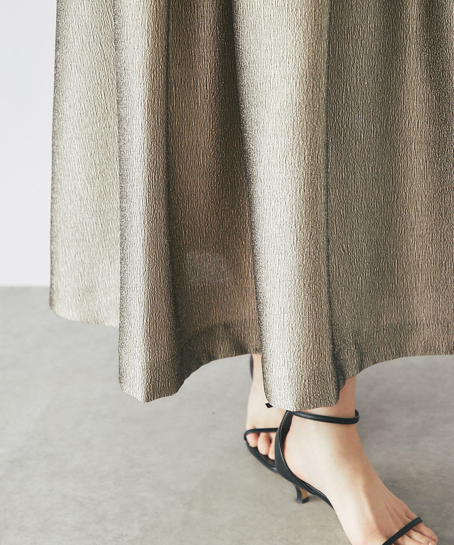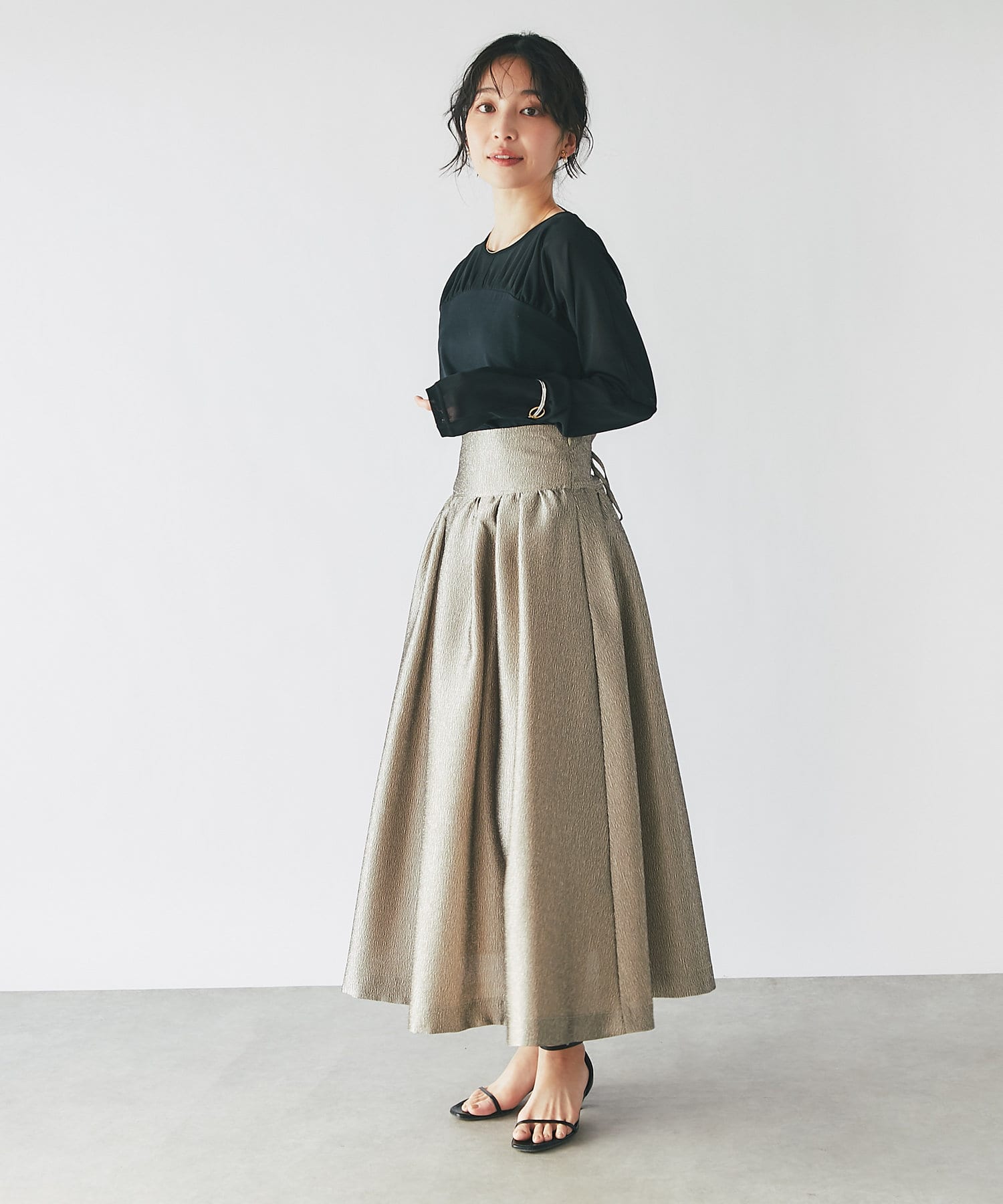 メタリックの煌めきある立体的なジャガード素材を使用した華やかなフレアスカート。