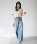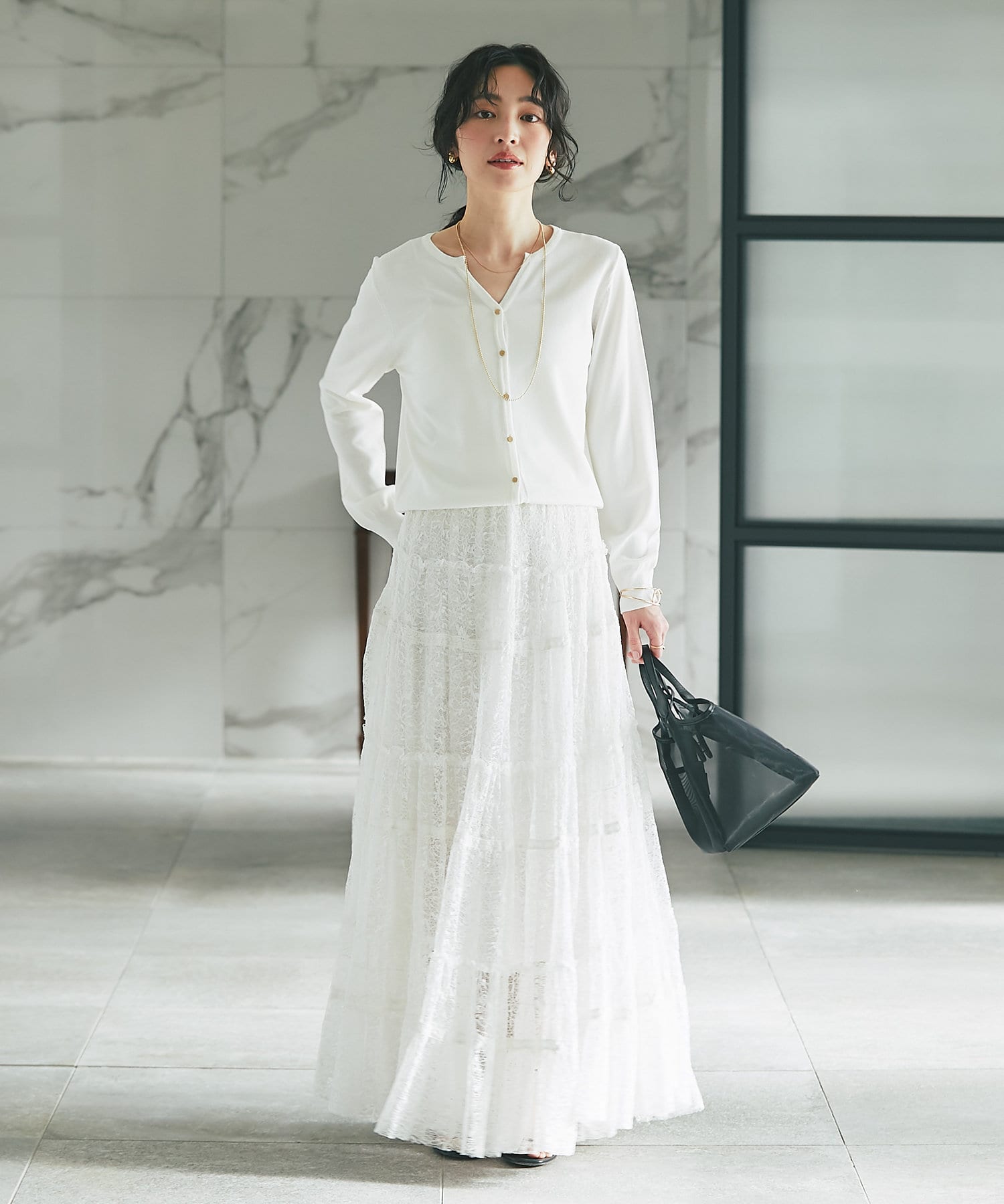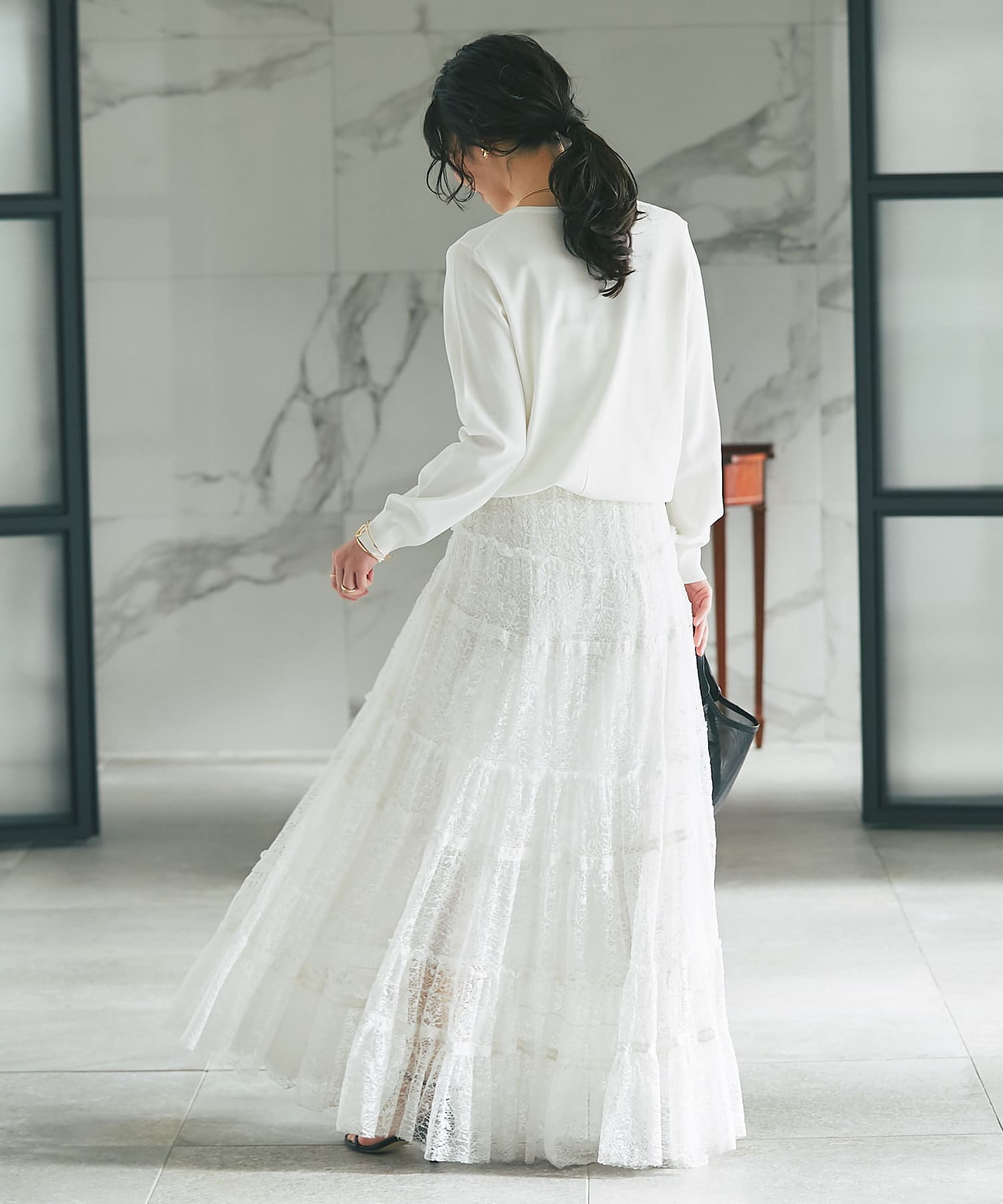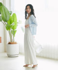 柄スカートなど華やかなボトムの合わせもおすすめです。