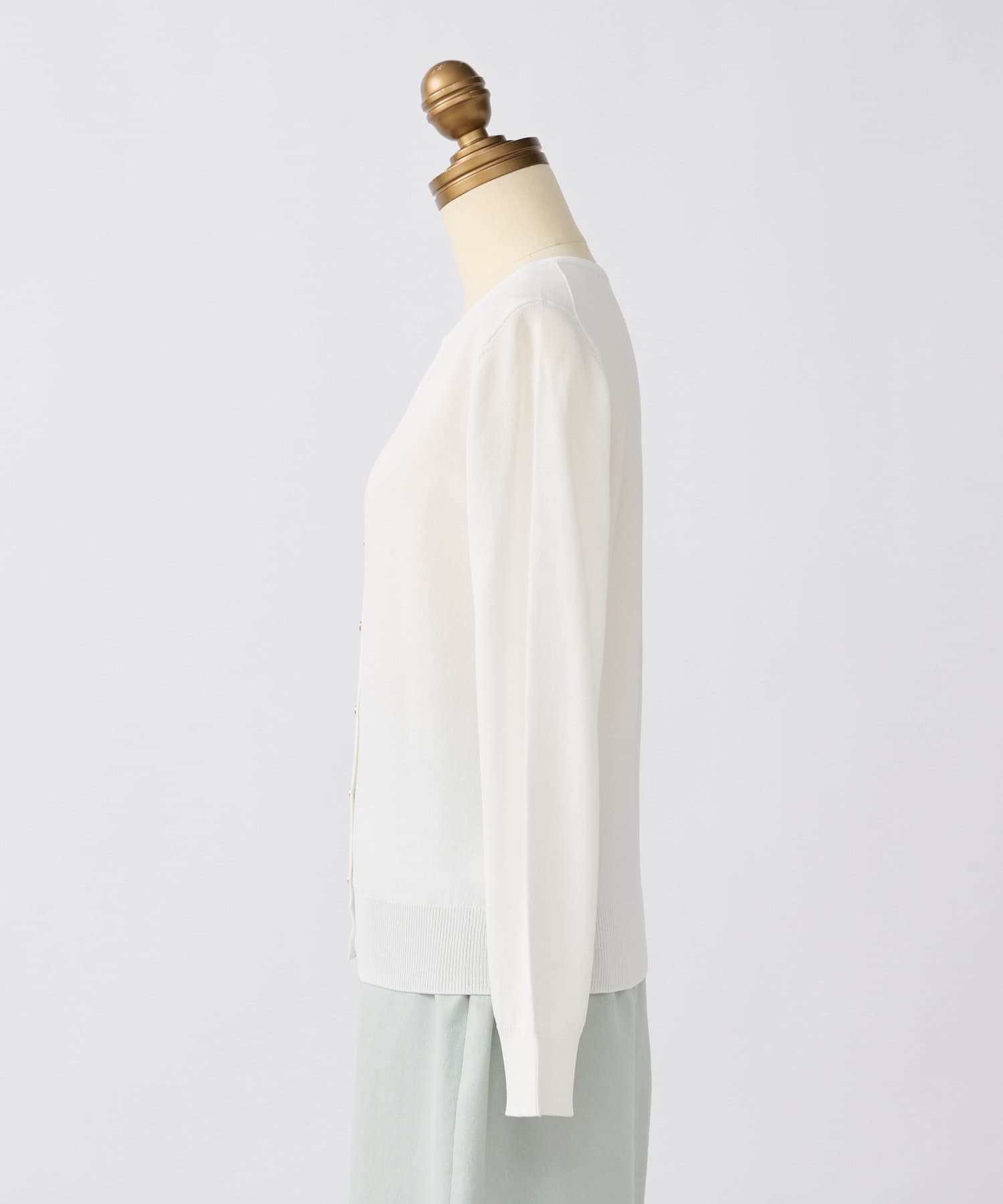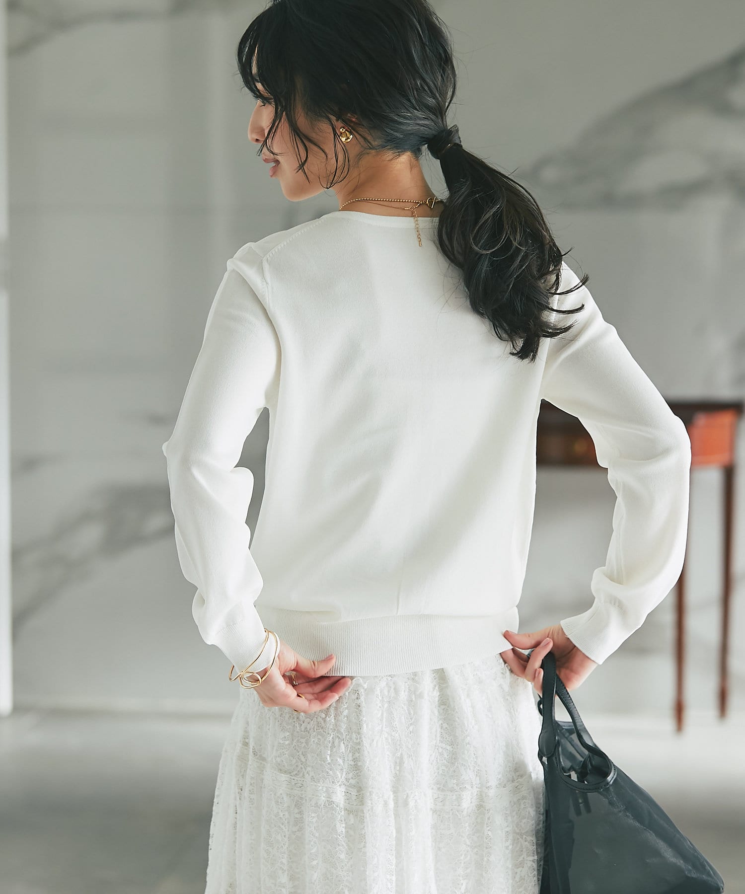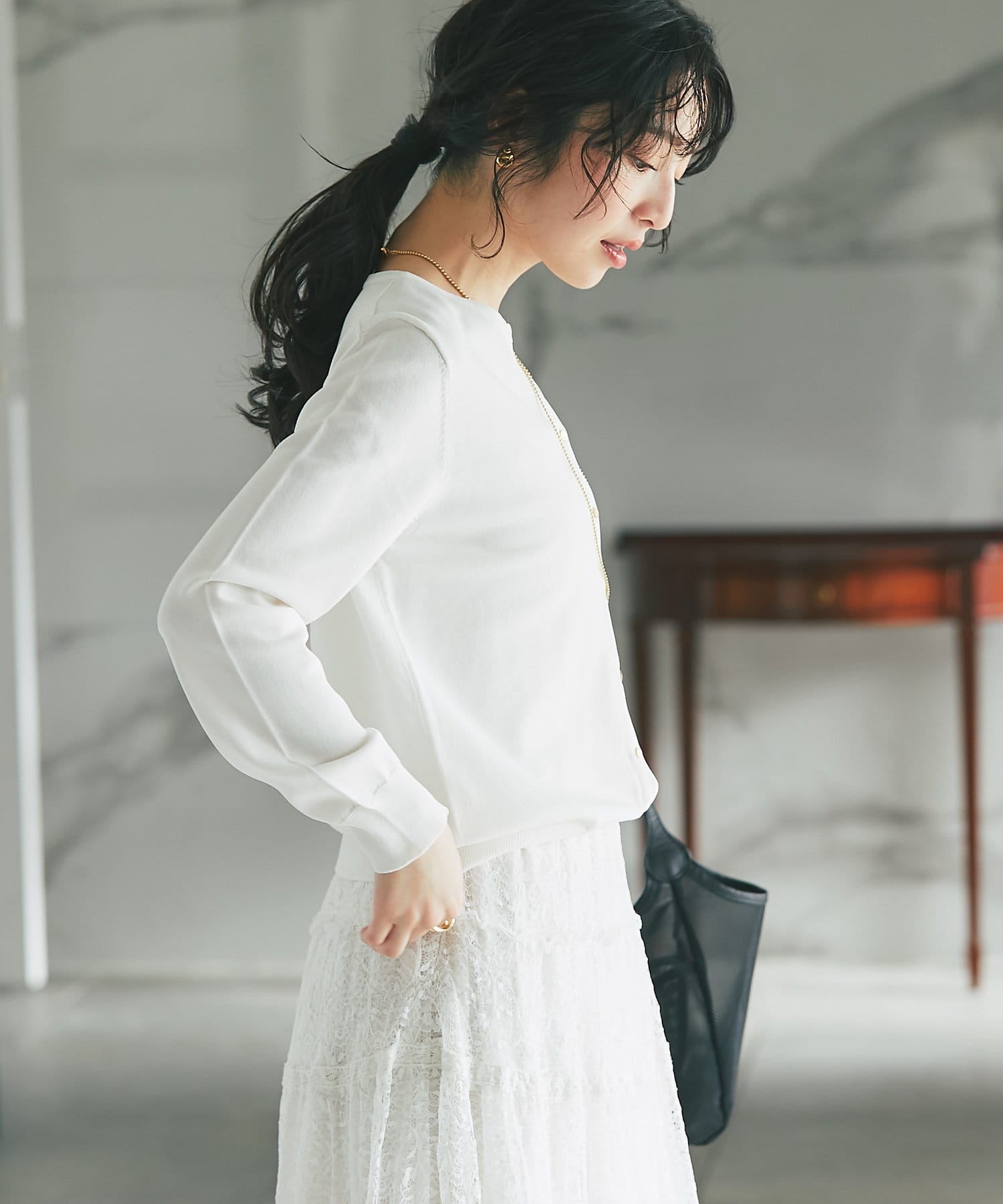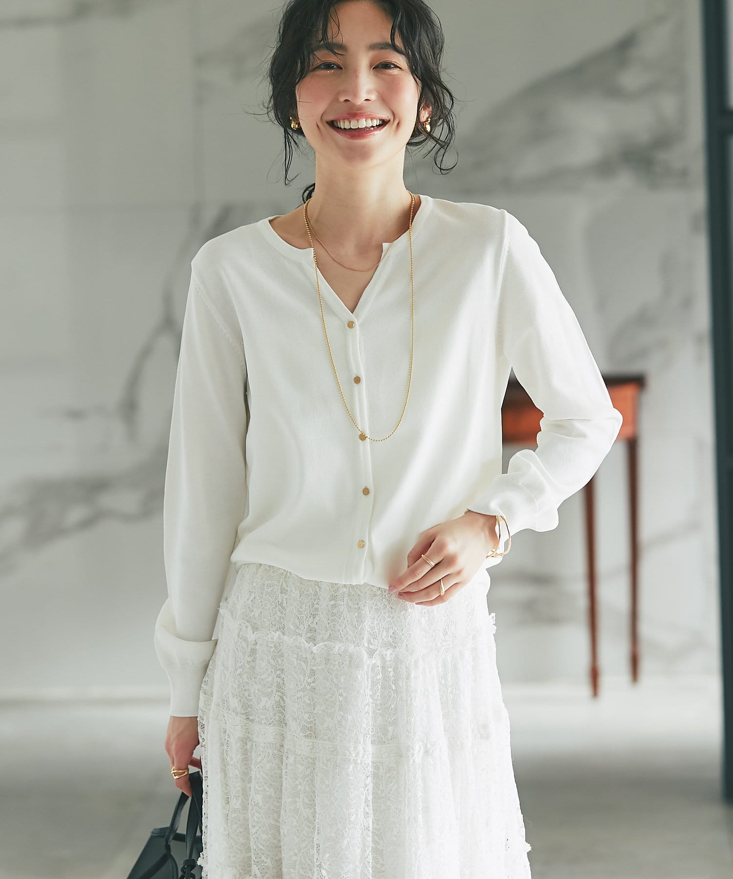 鎖骨をきれいに見せてくれるスキッパーネックのフェミニンなカーディガン。