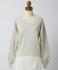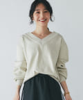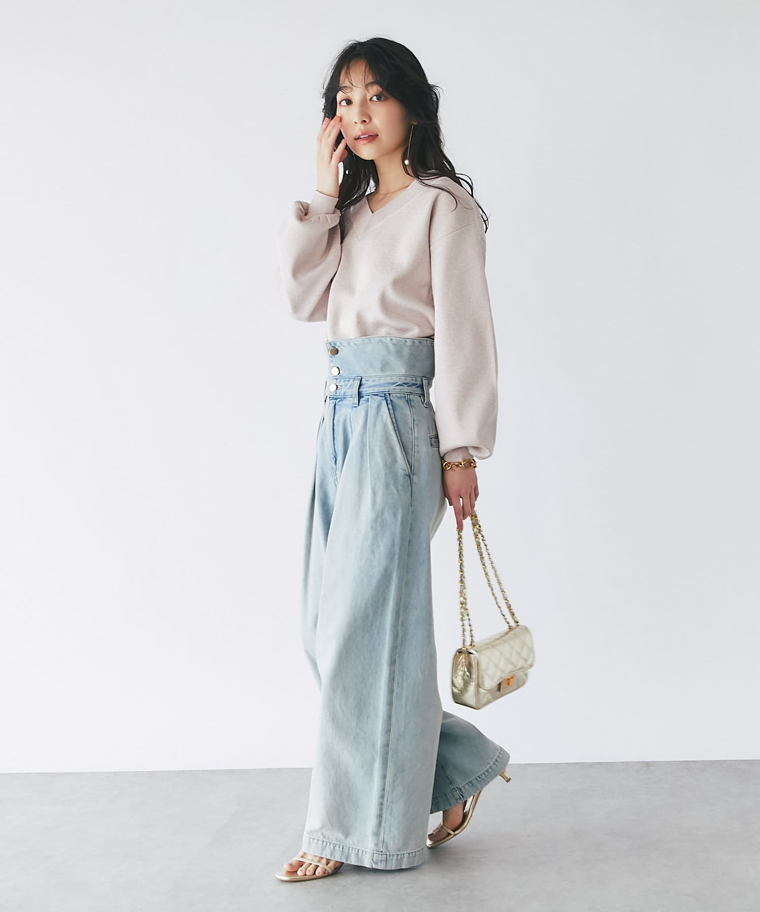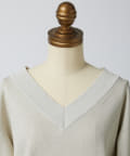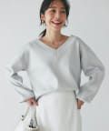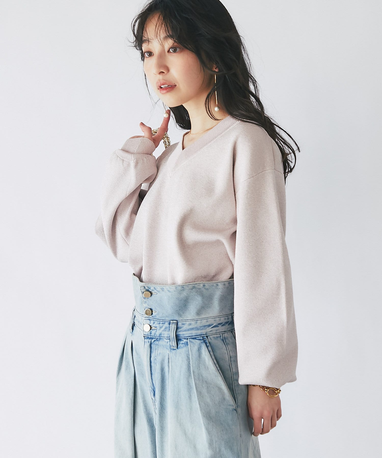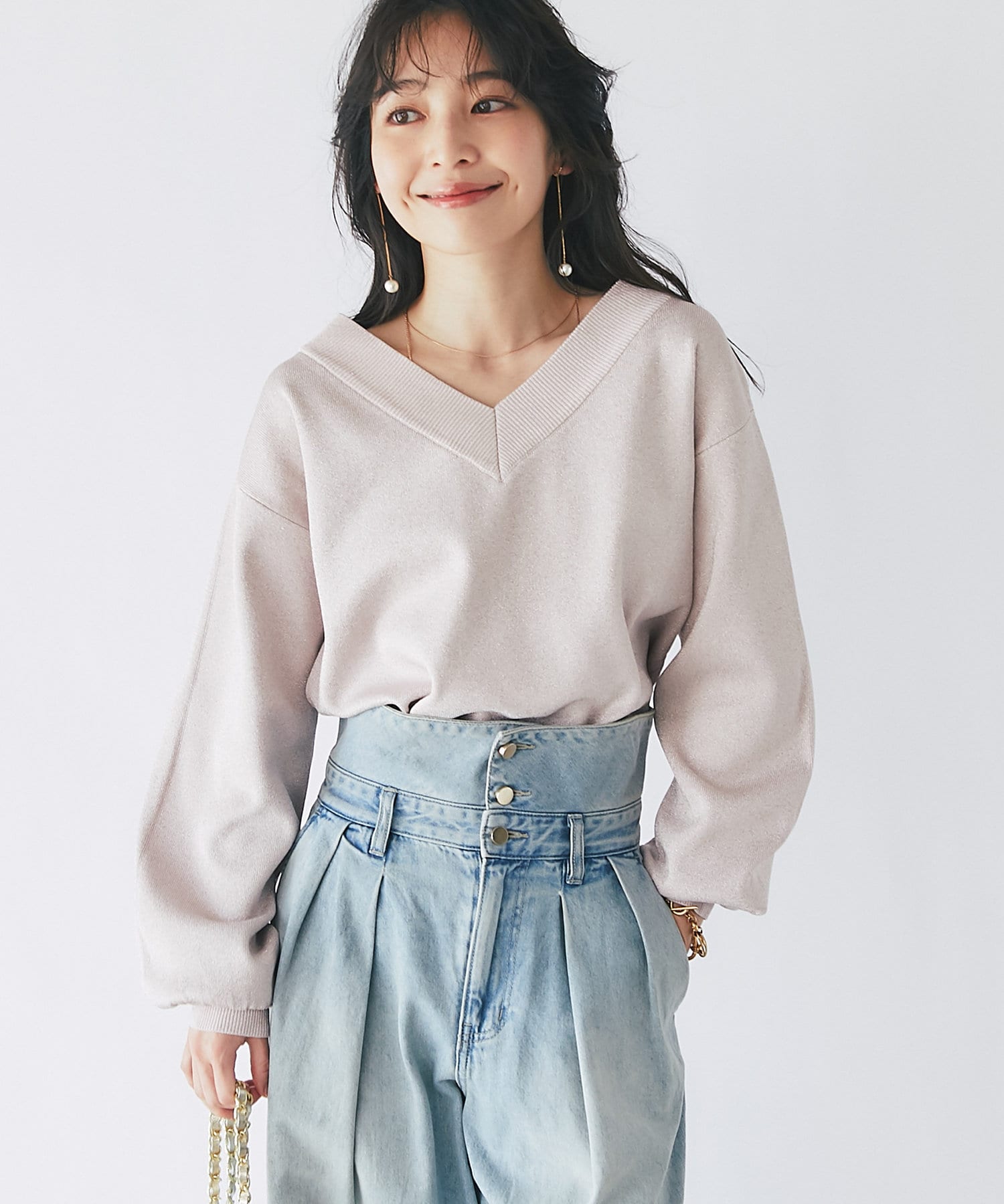 幅広いリブのVネックは首元をすっきり見せ、コーディネートに抜け感をプラス。