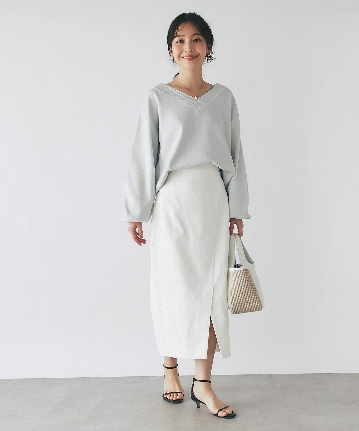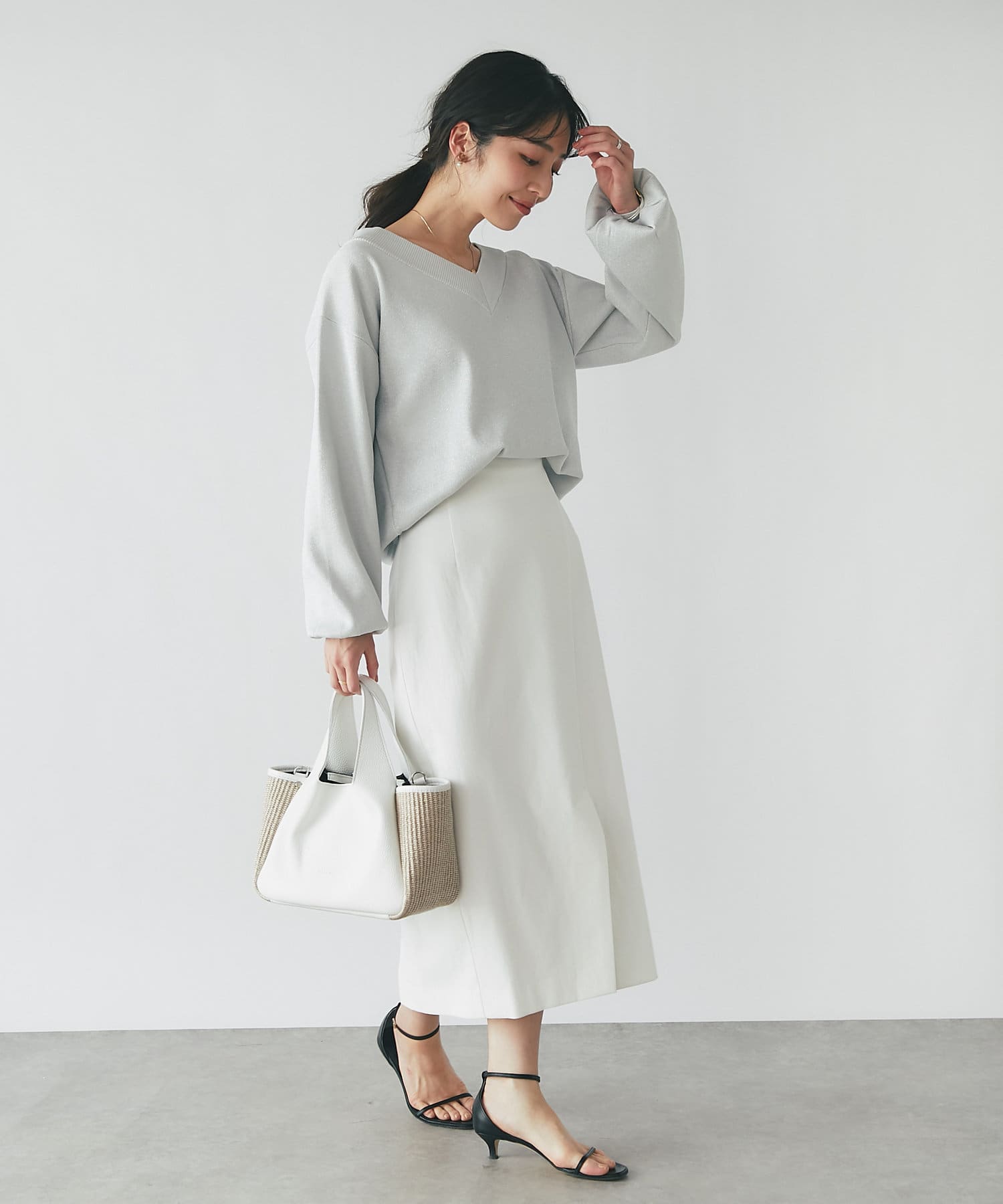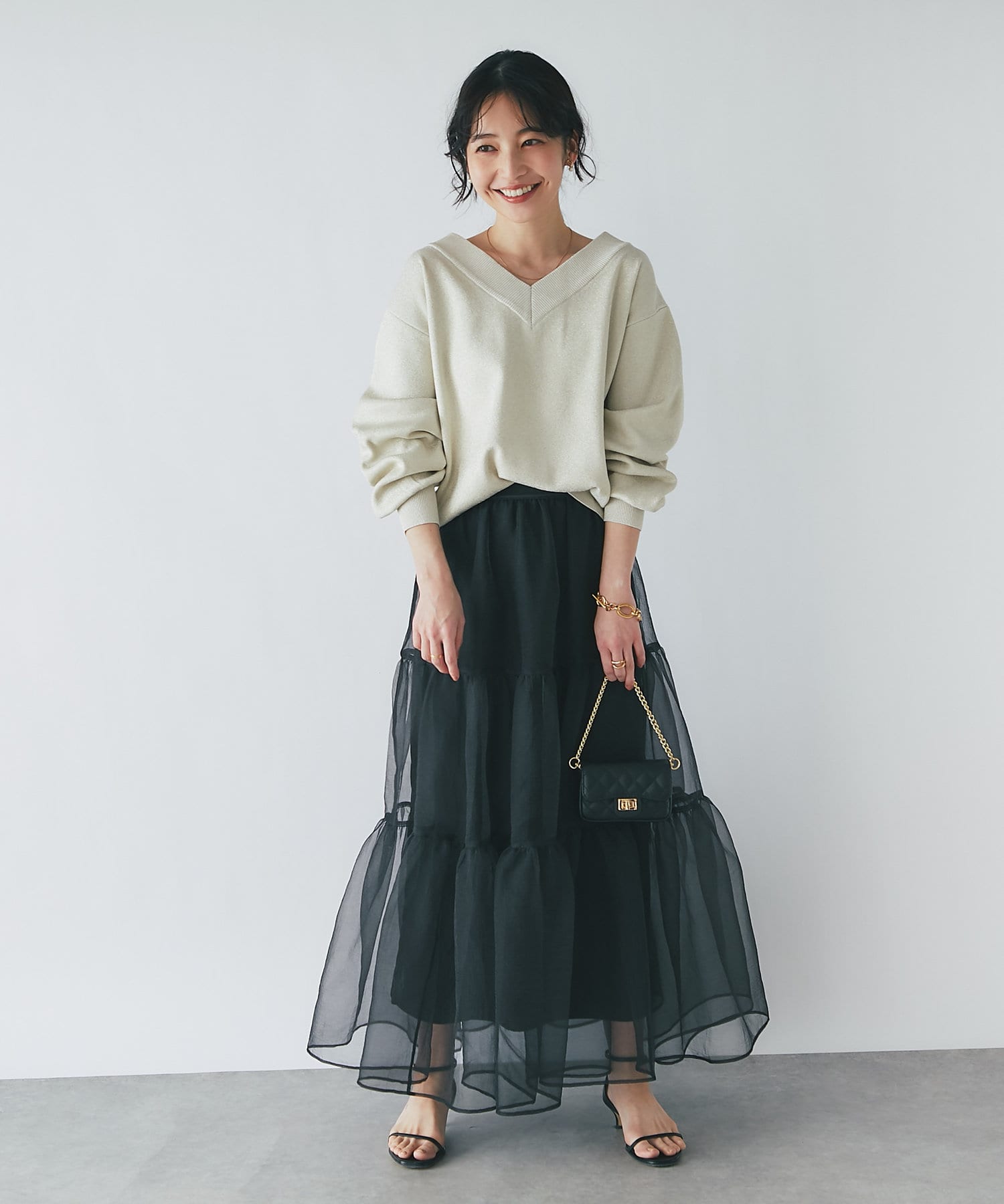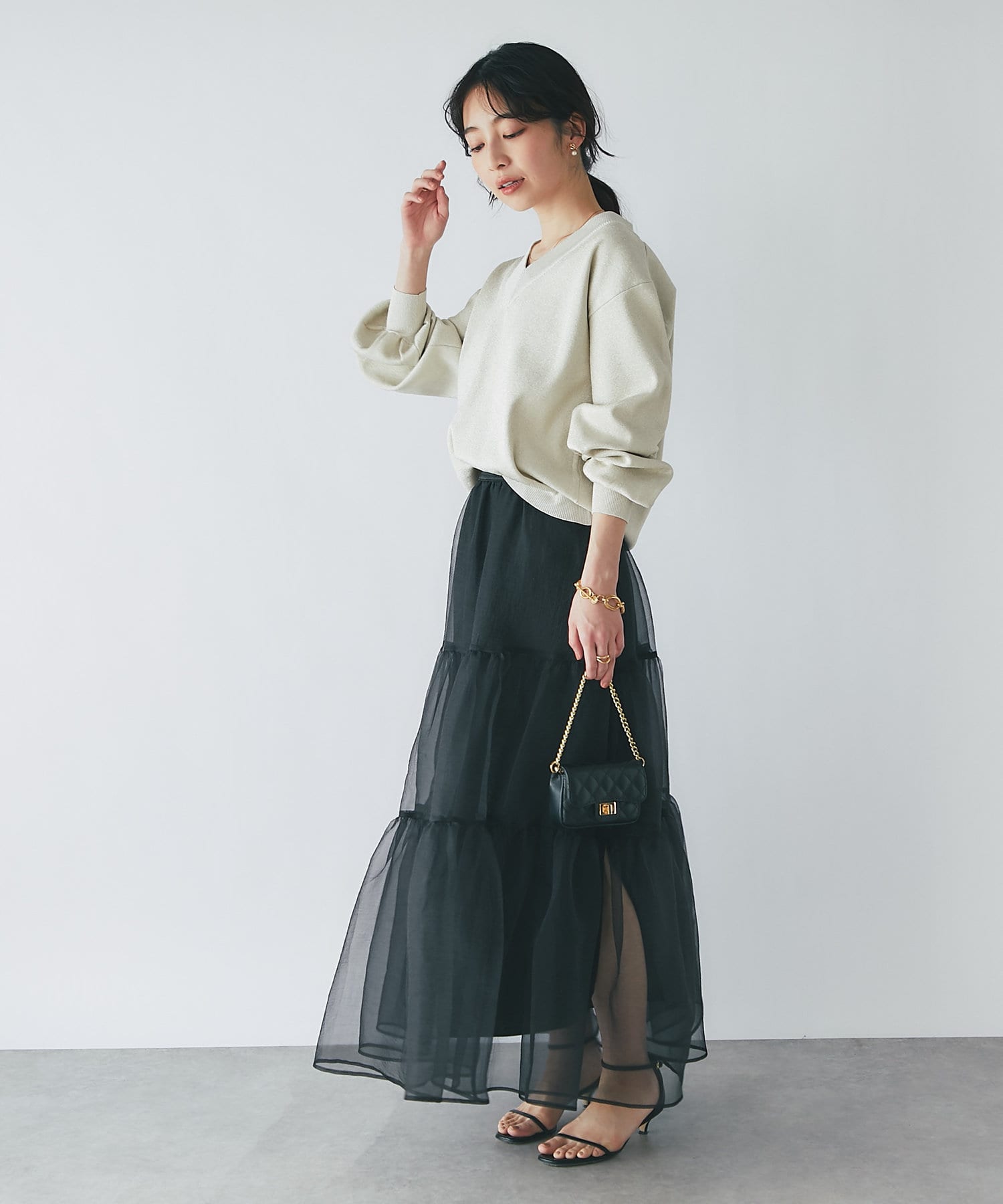 キレイ目なスカート合わせでちょとしたお出かけコーデとしてもおすすめです。
