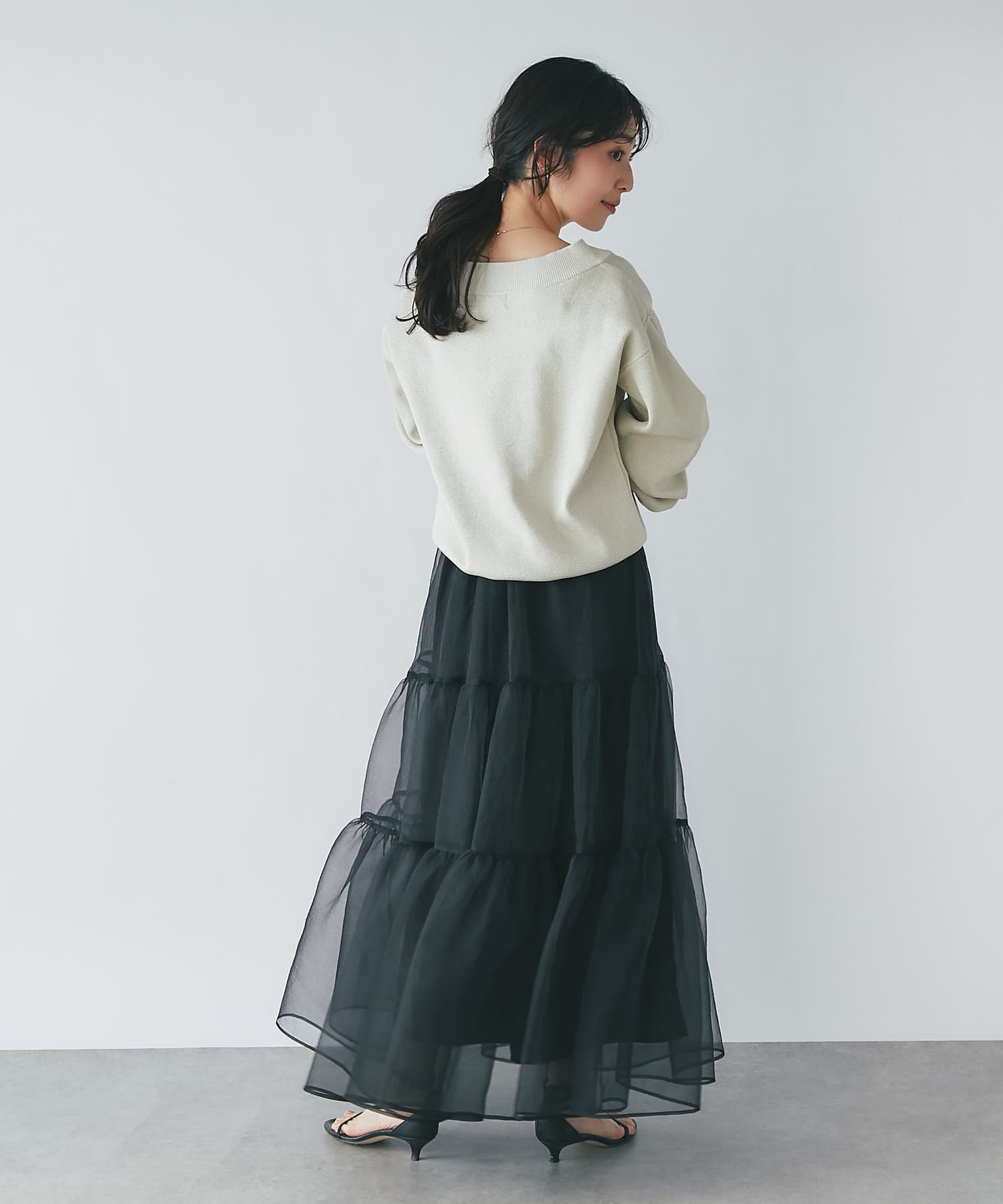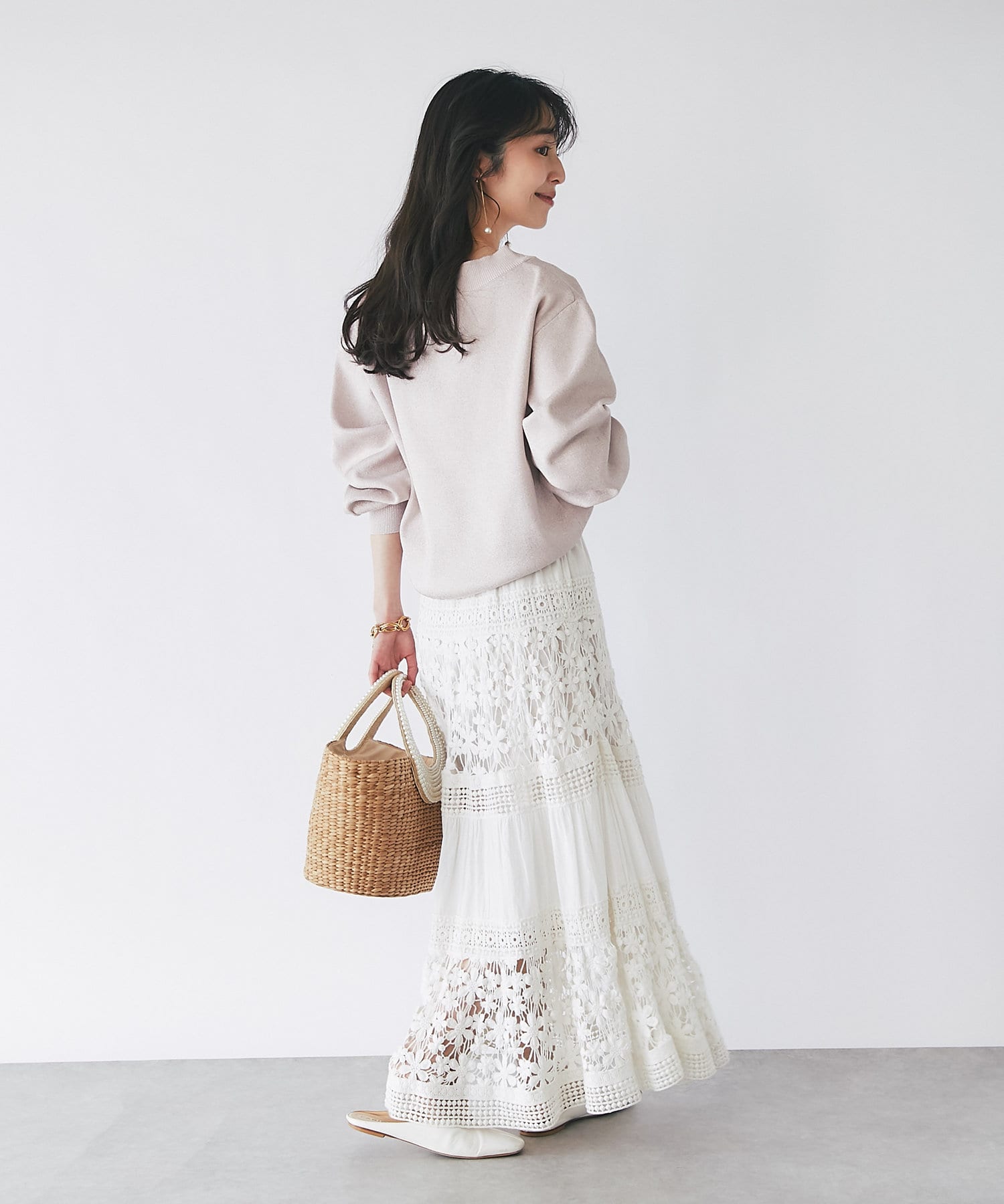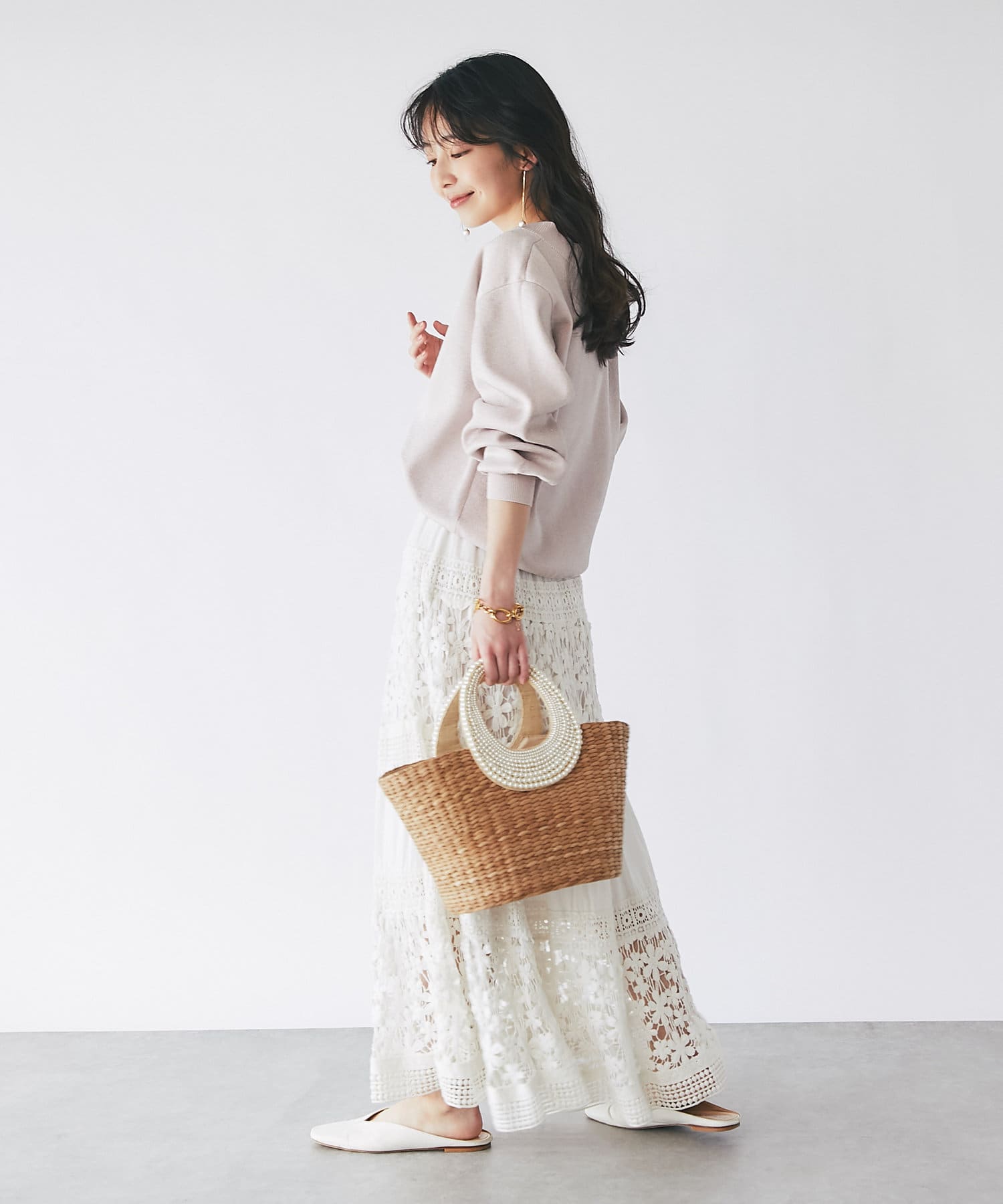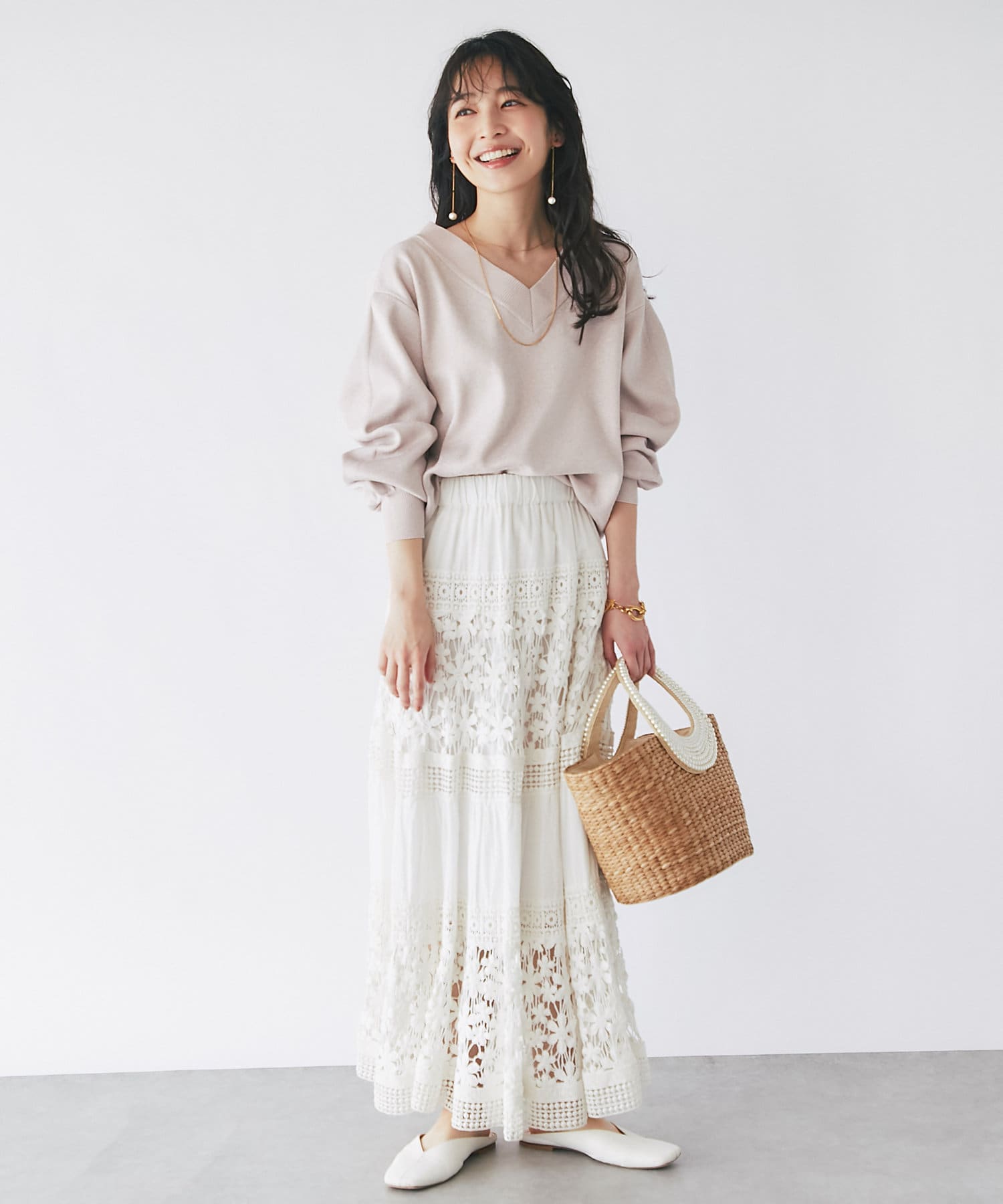 キレイ目なスカート合わせでちょとしたお出かけコーデとしてもおすすめです。