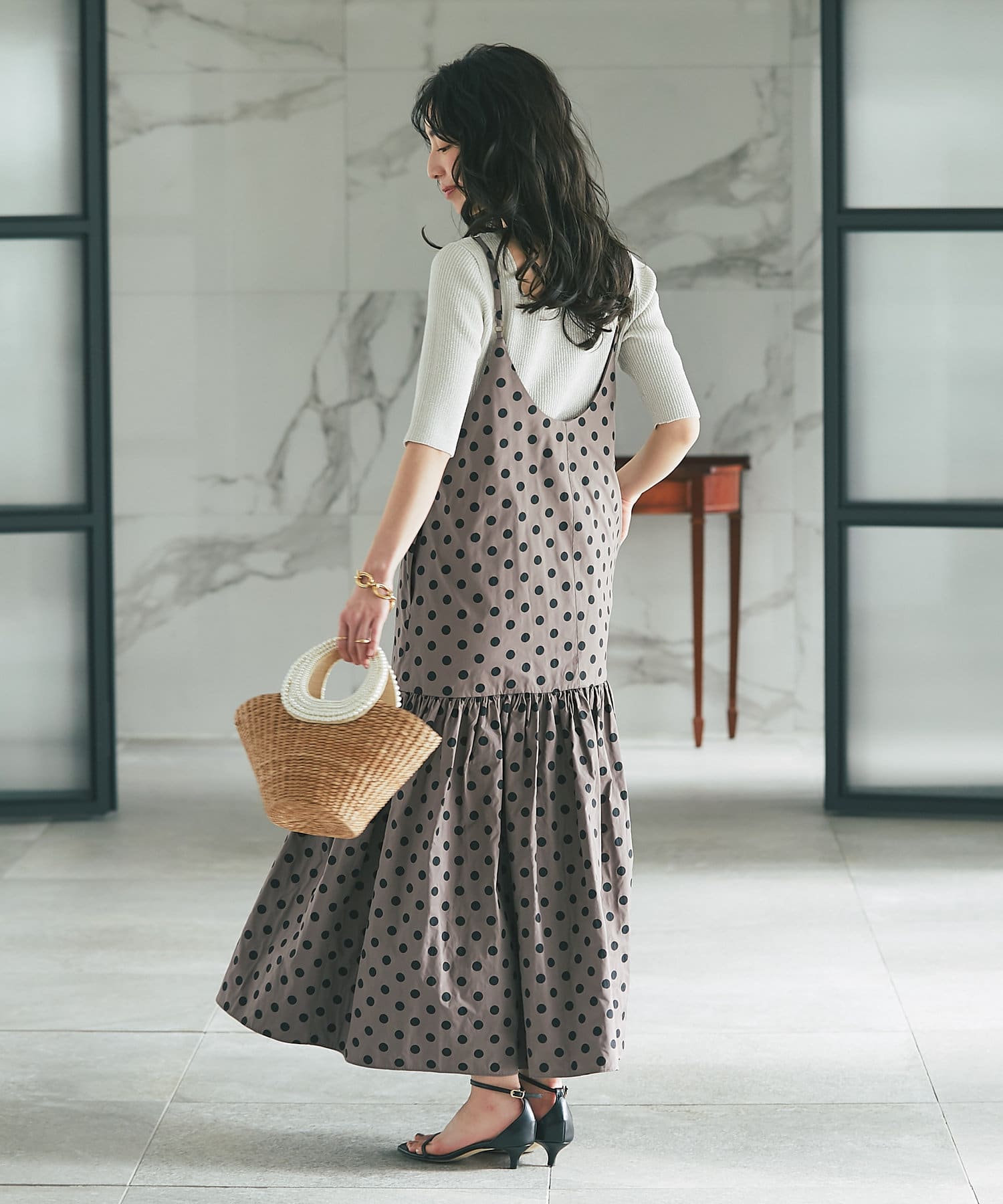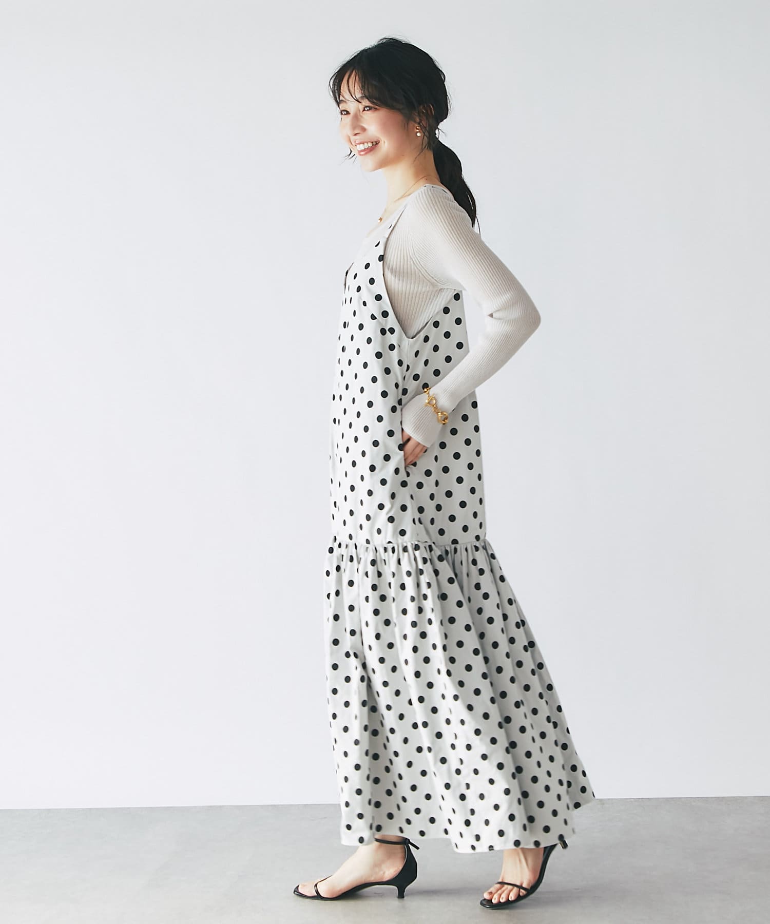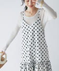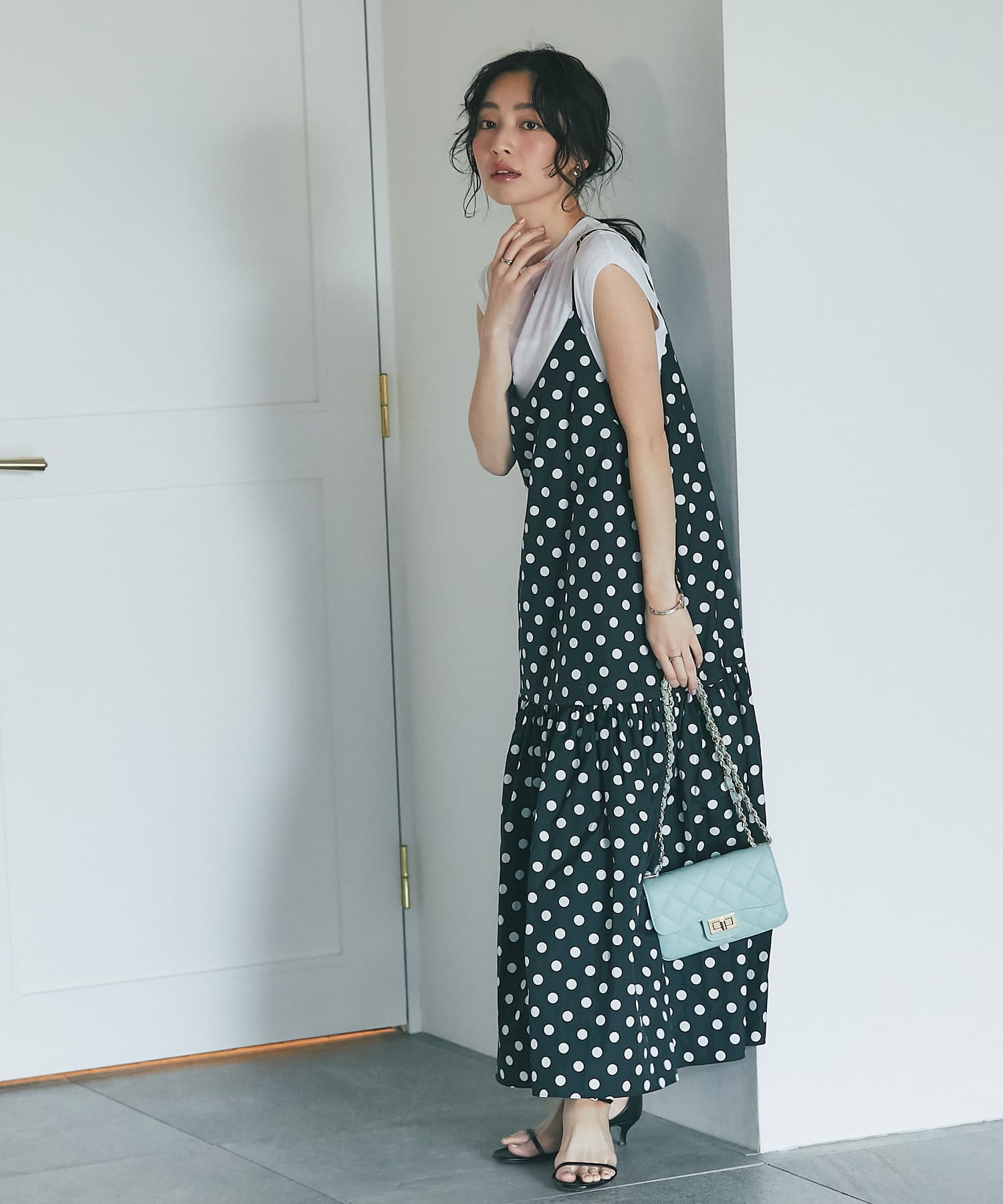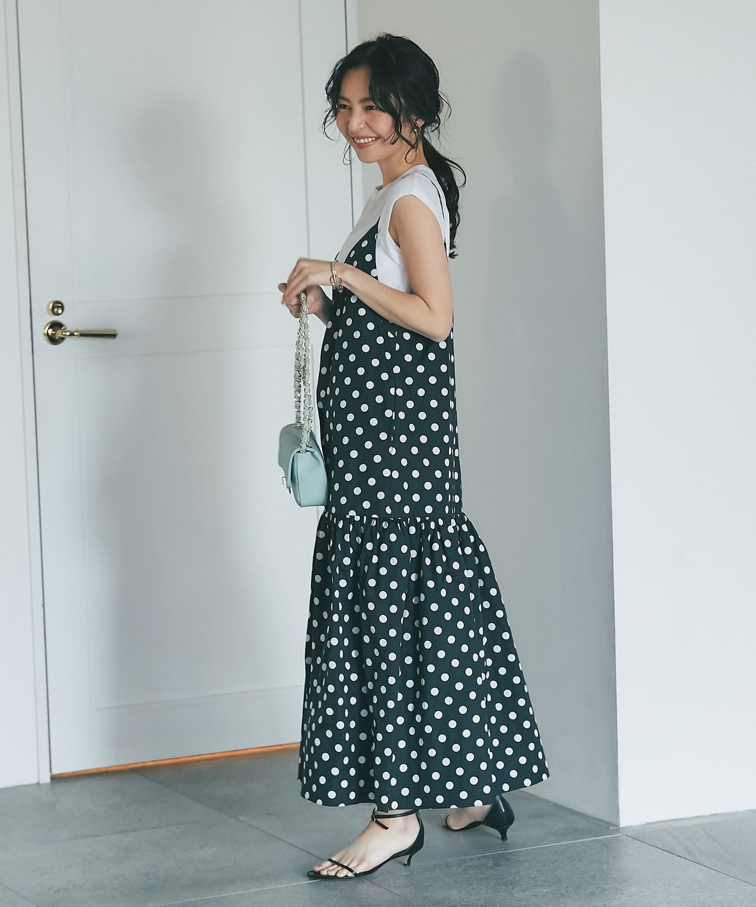 大人ガーリーな雰囲気を演出するドットプリントワンピース