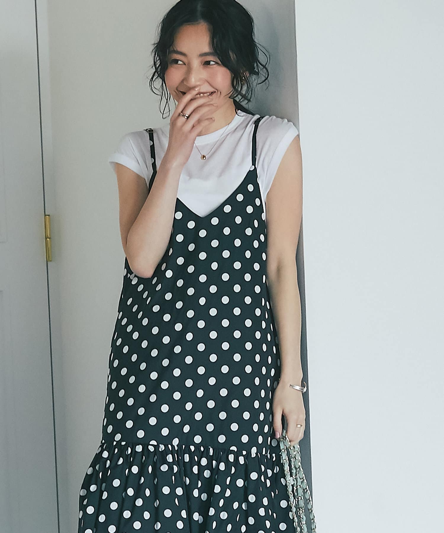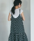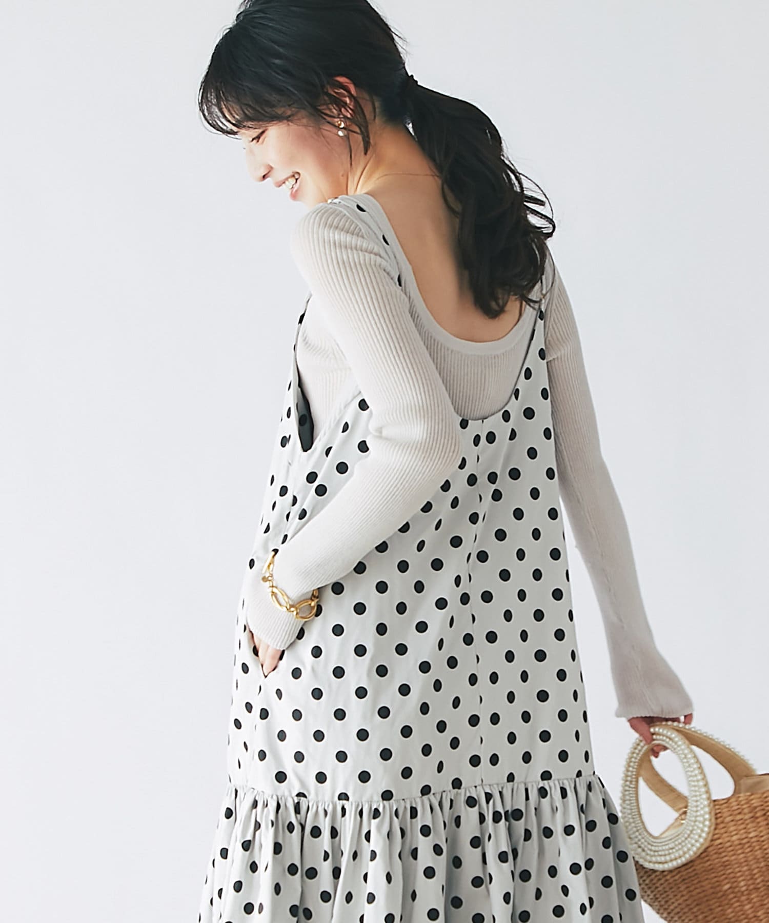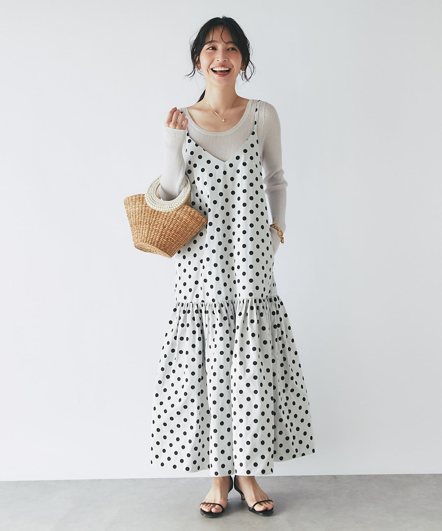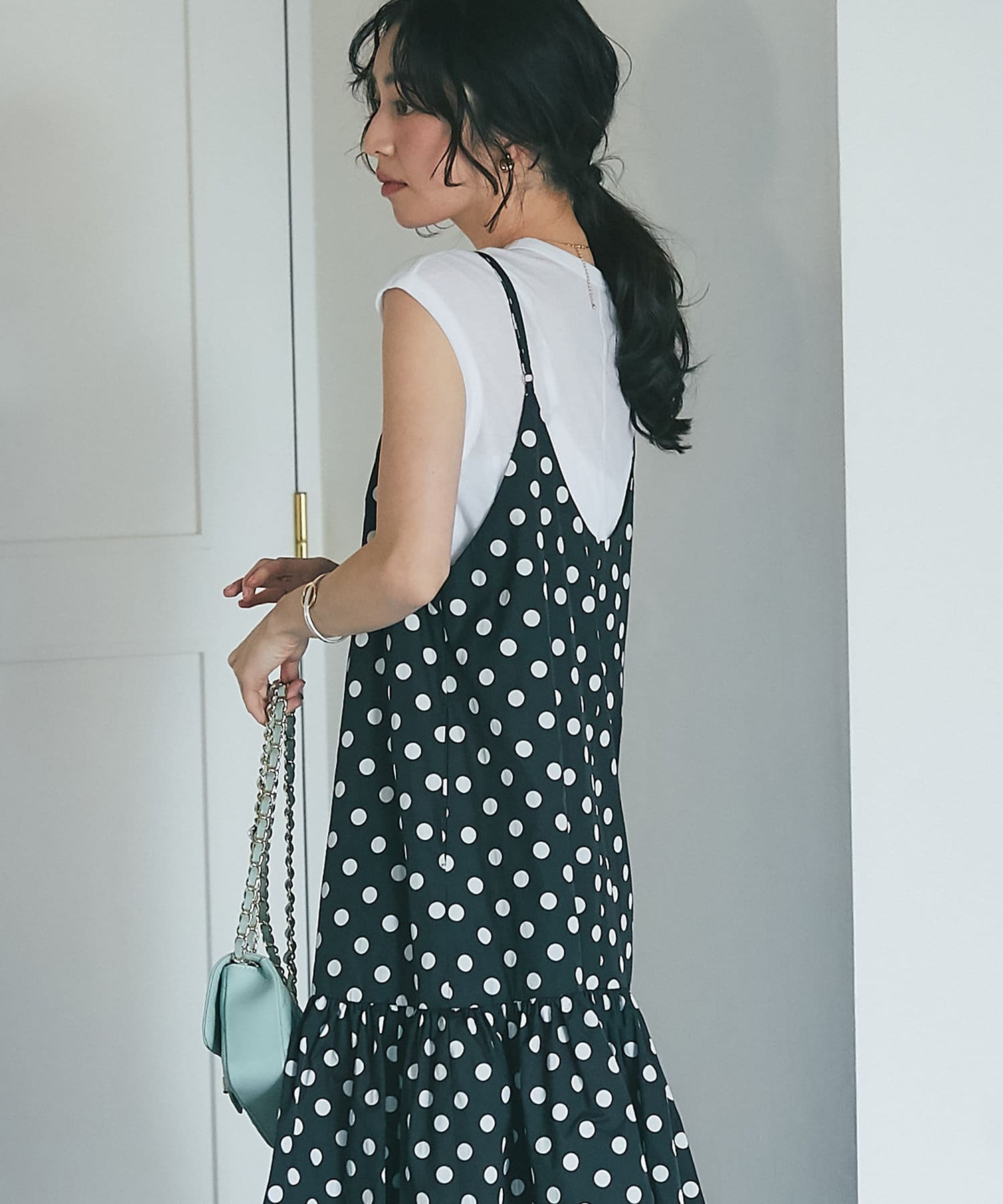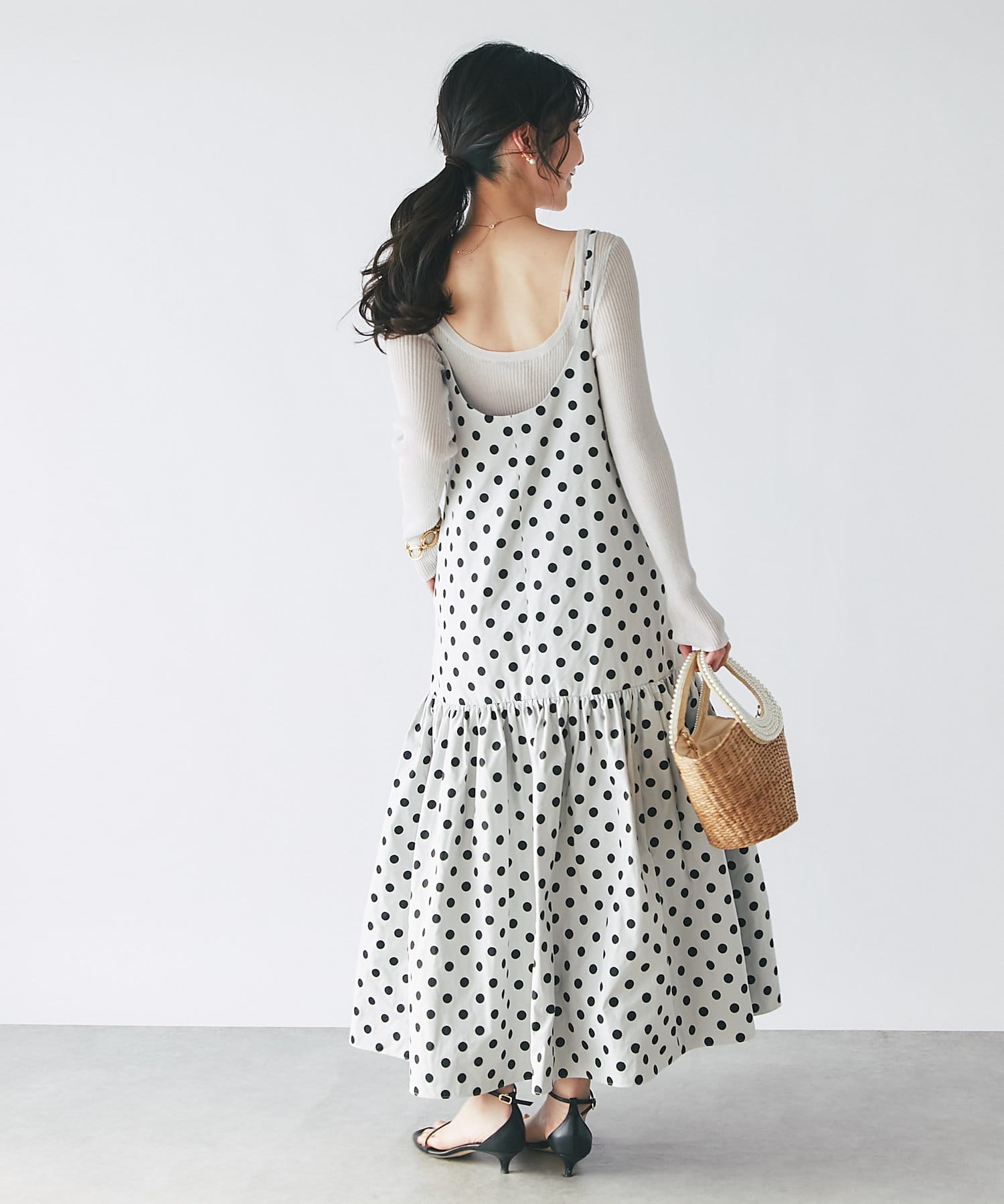 大人ガーリーな雰囲気を演出するドットプリントワンピース