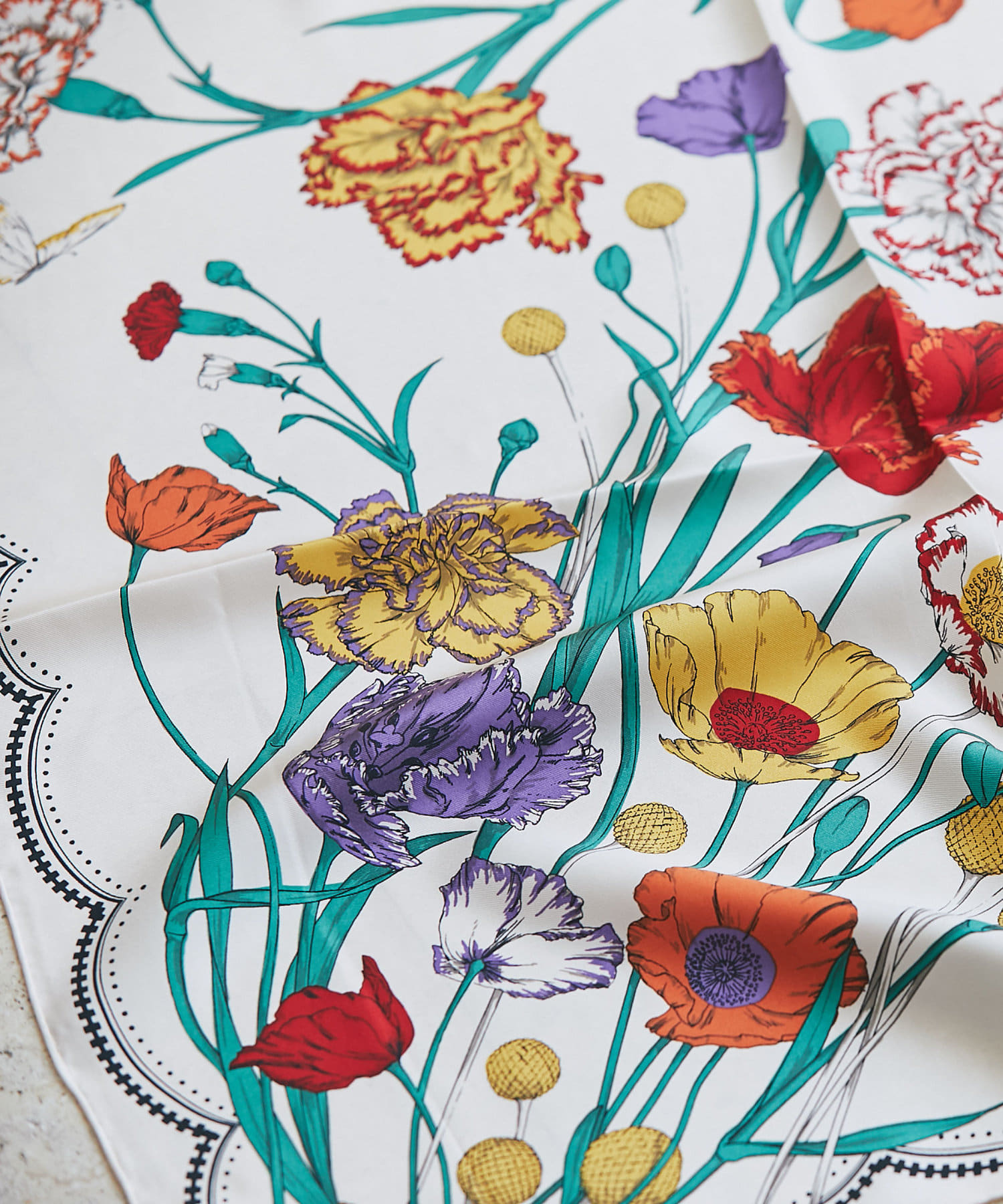 ヴィンテージスカーフからインスピレーションを得てつくられるスカーフやストールは、全て熟練の職人により一版ずつ手作業で丁寧に染め上げる手捺染(ハンドプリント)で作られています。