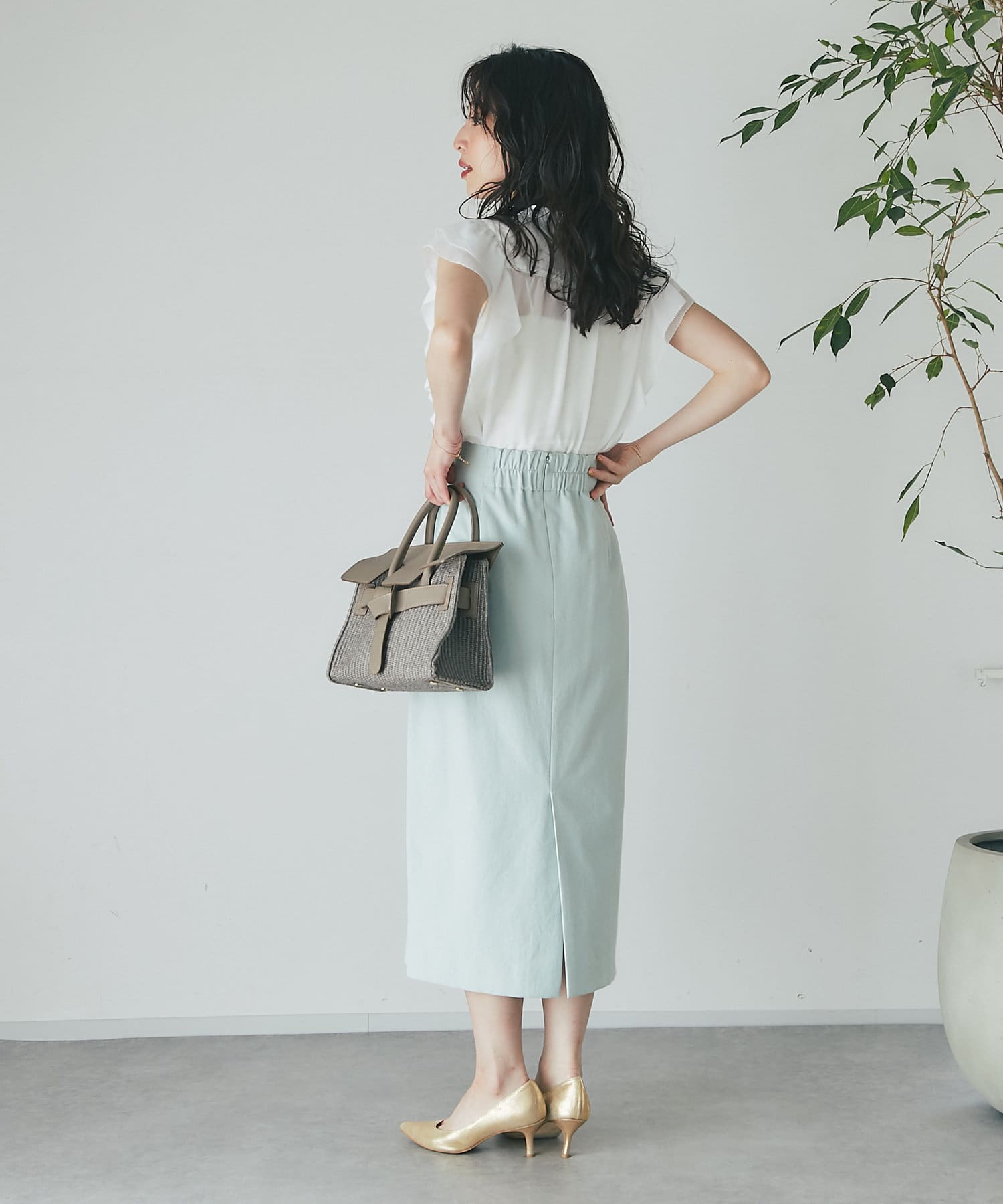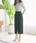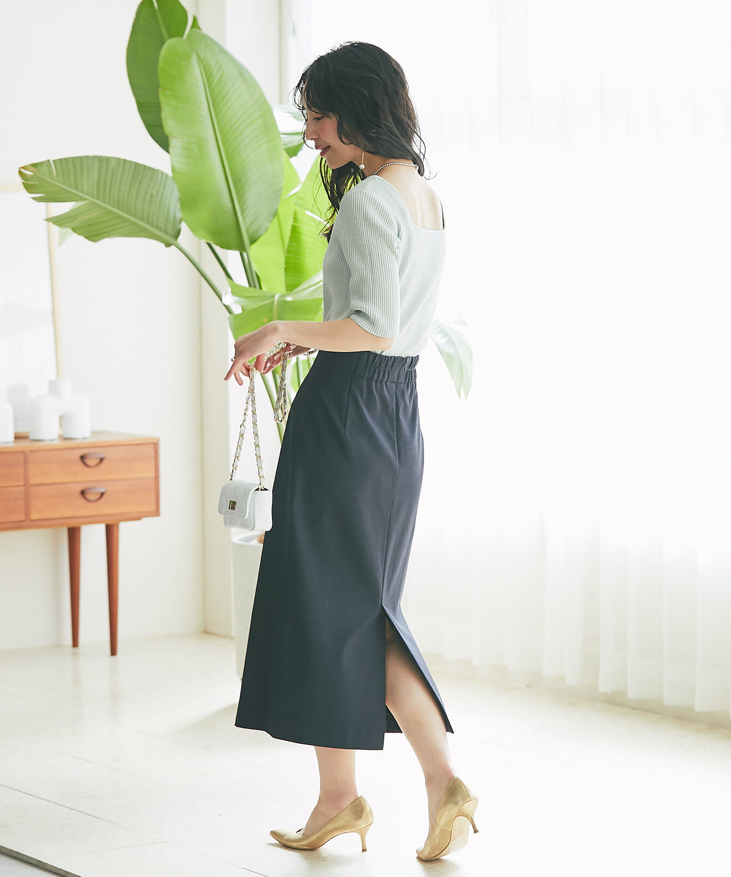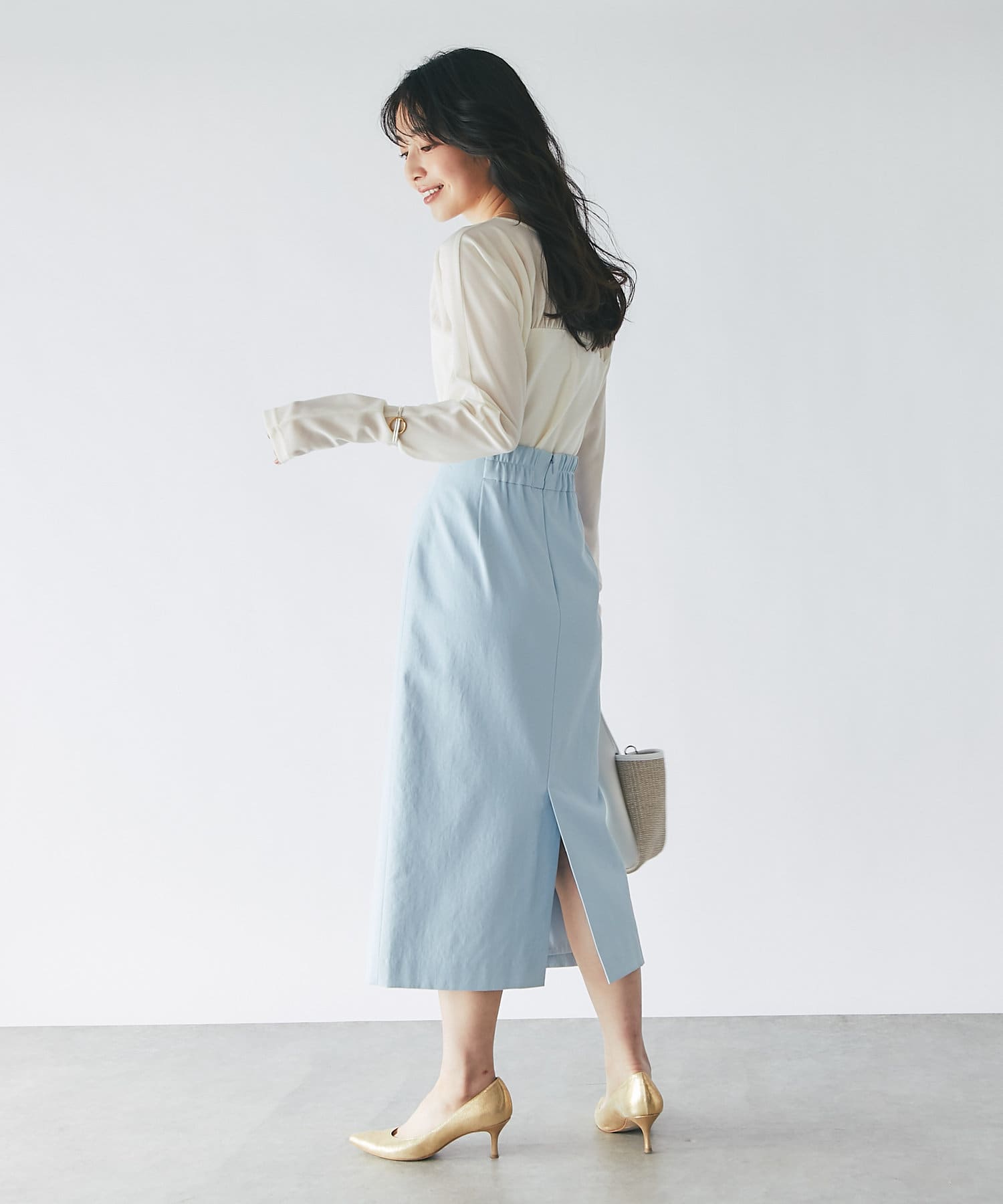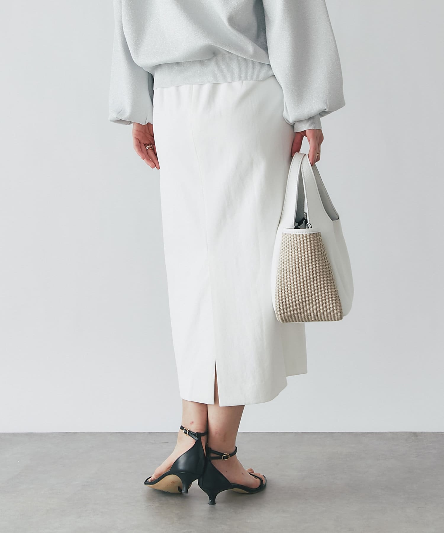 身体のラインを拾いすぎず、スリム見えするナロースカート。