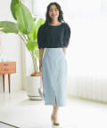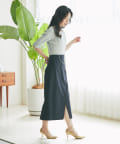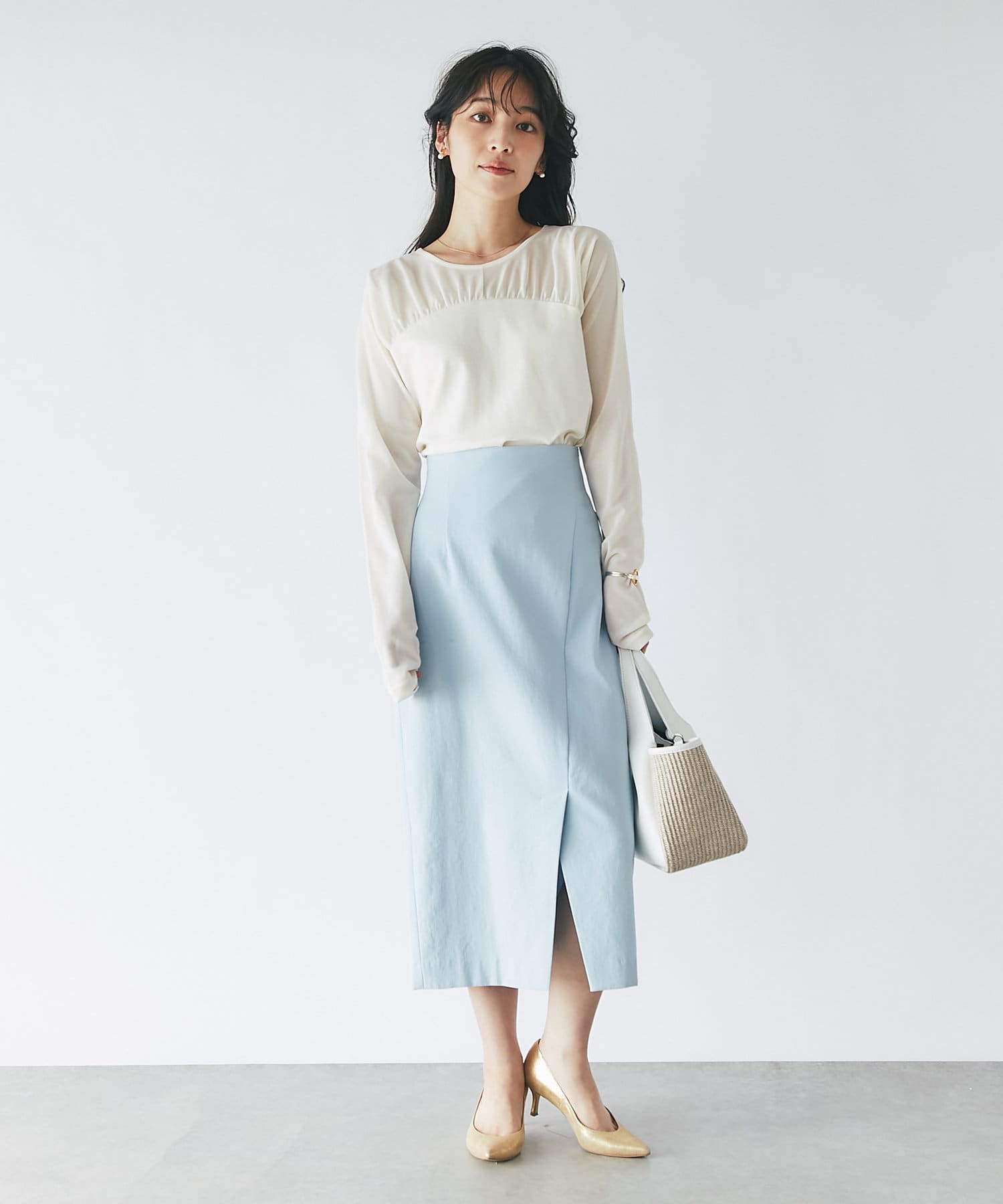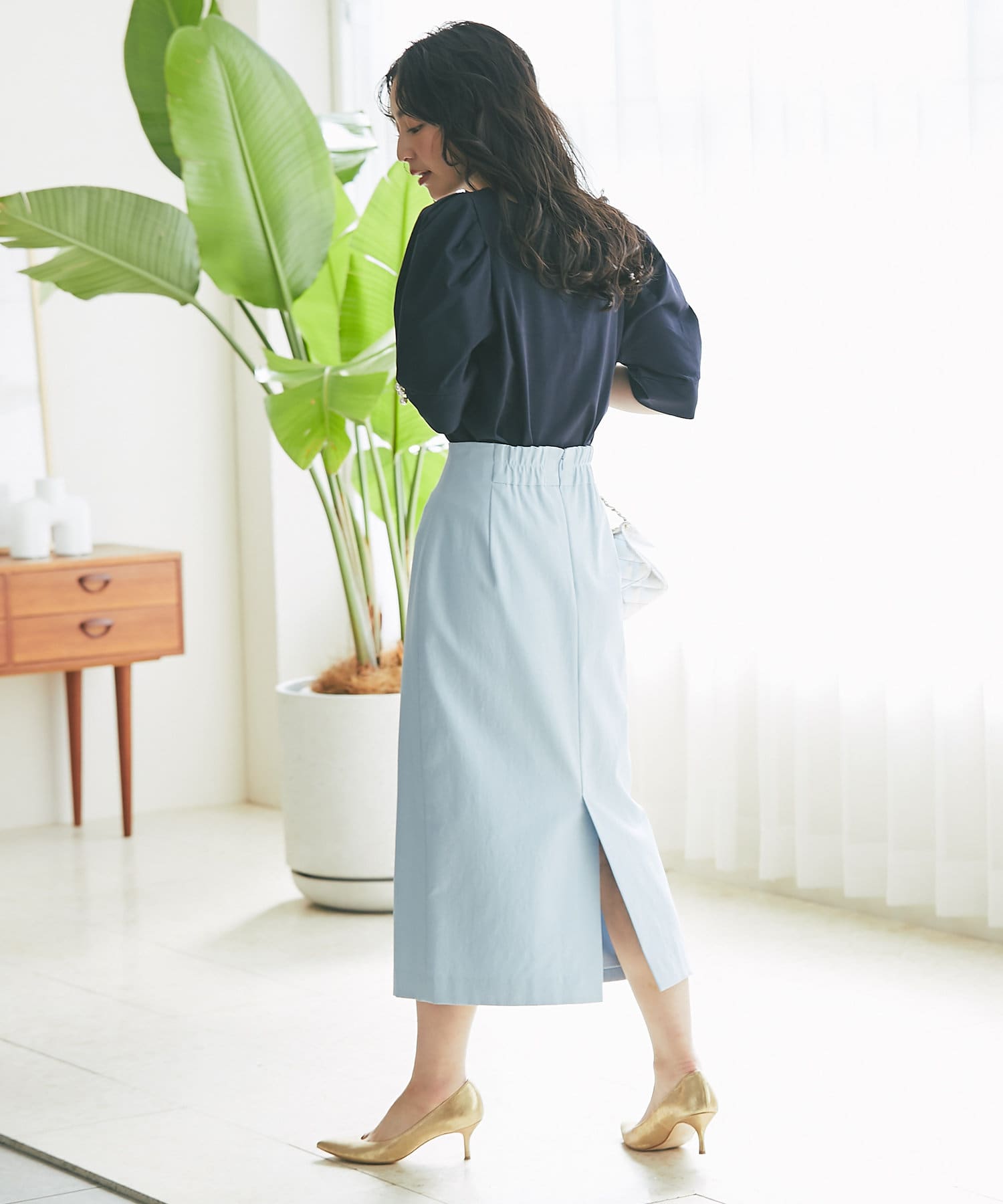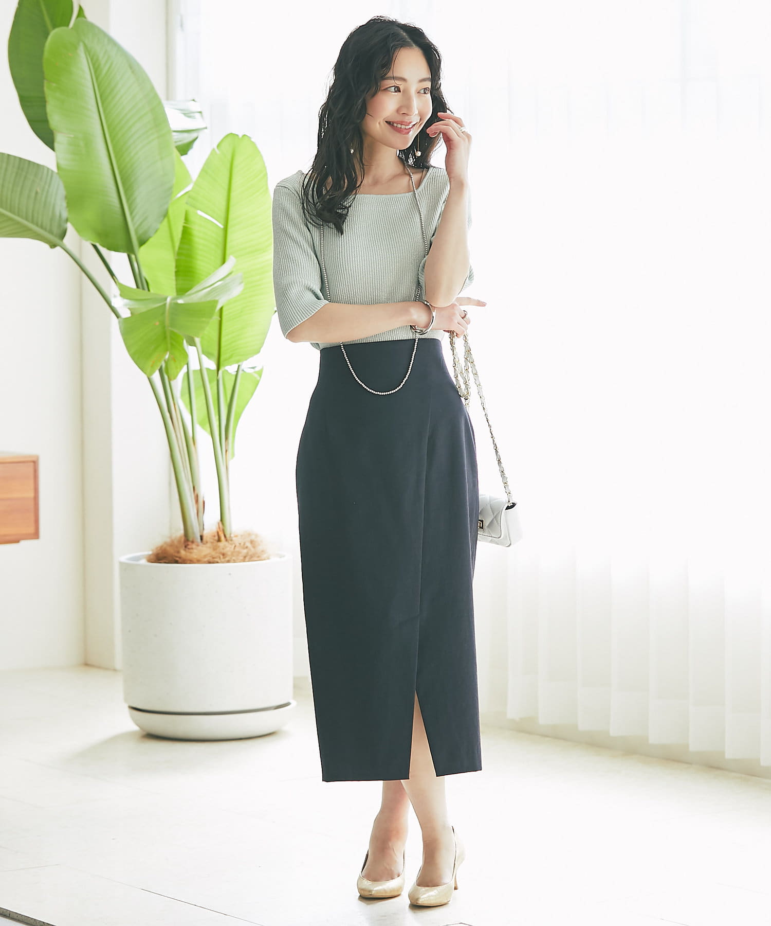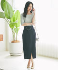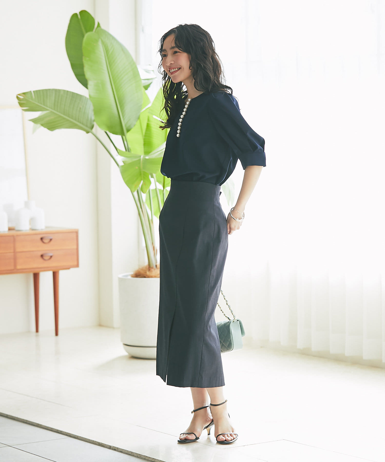 身体のラインを拾いすぎず、スリム見えするナロースカート。