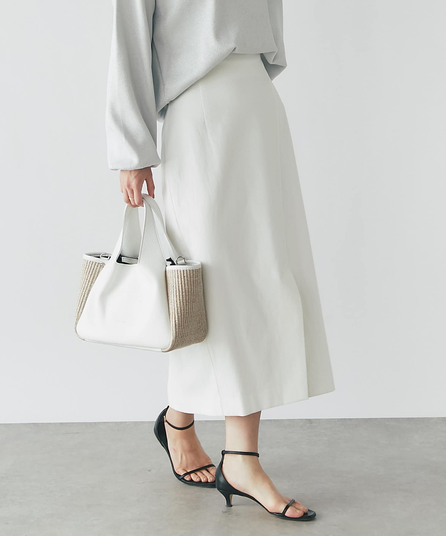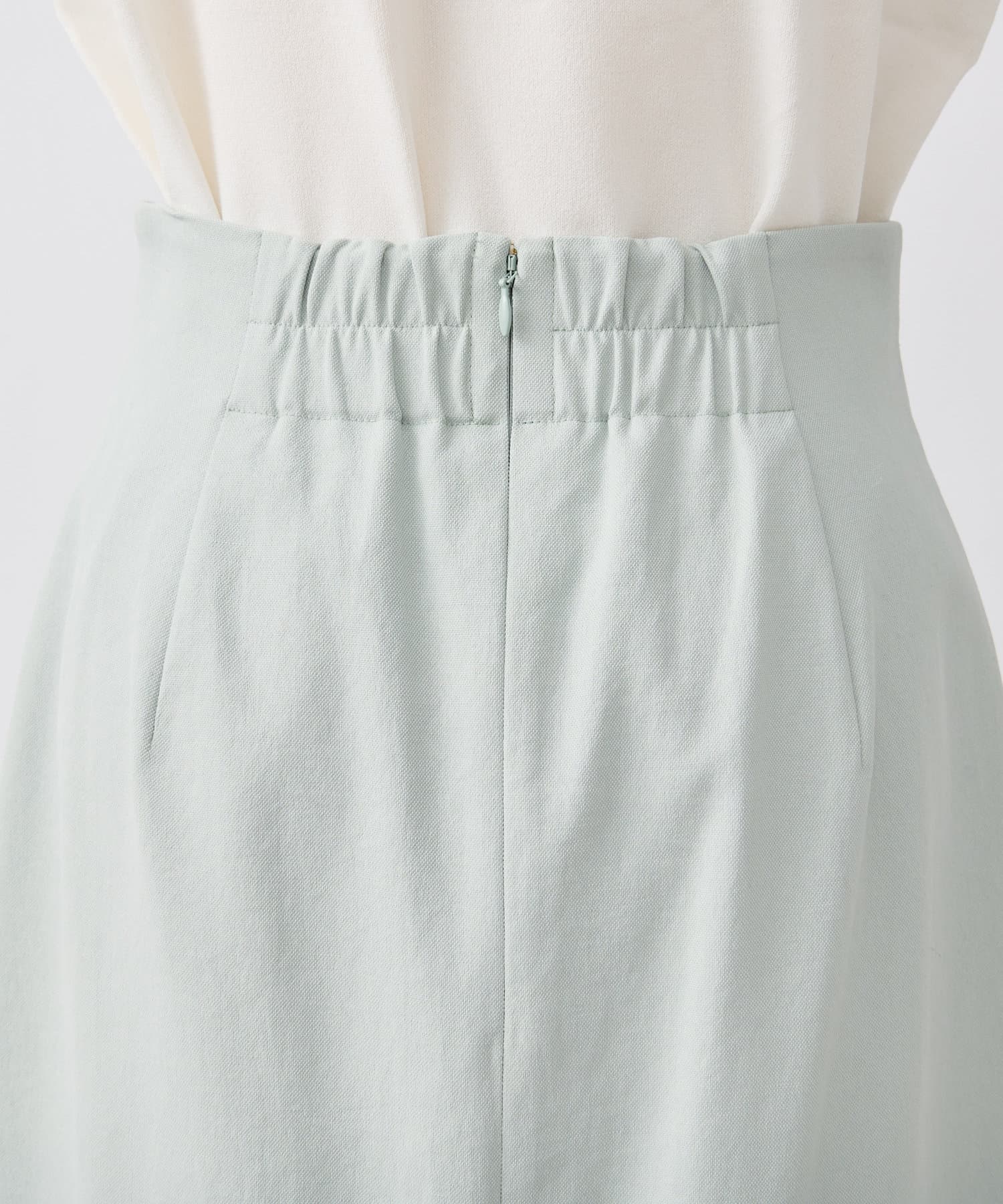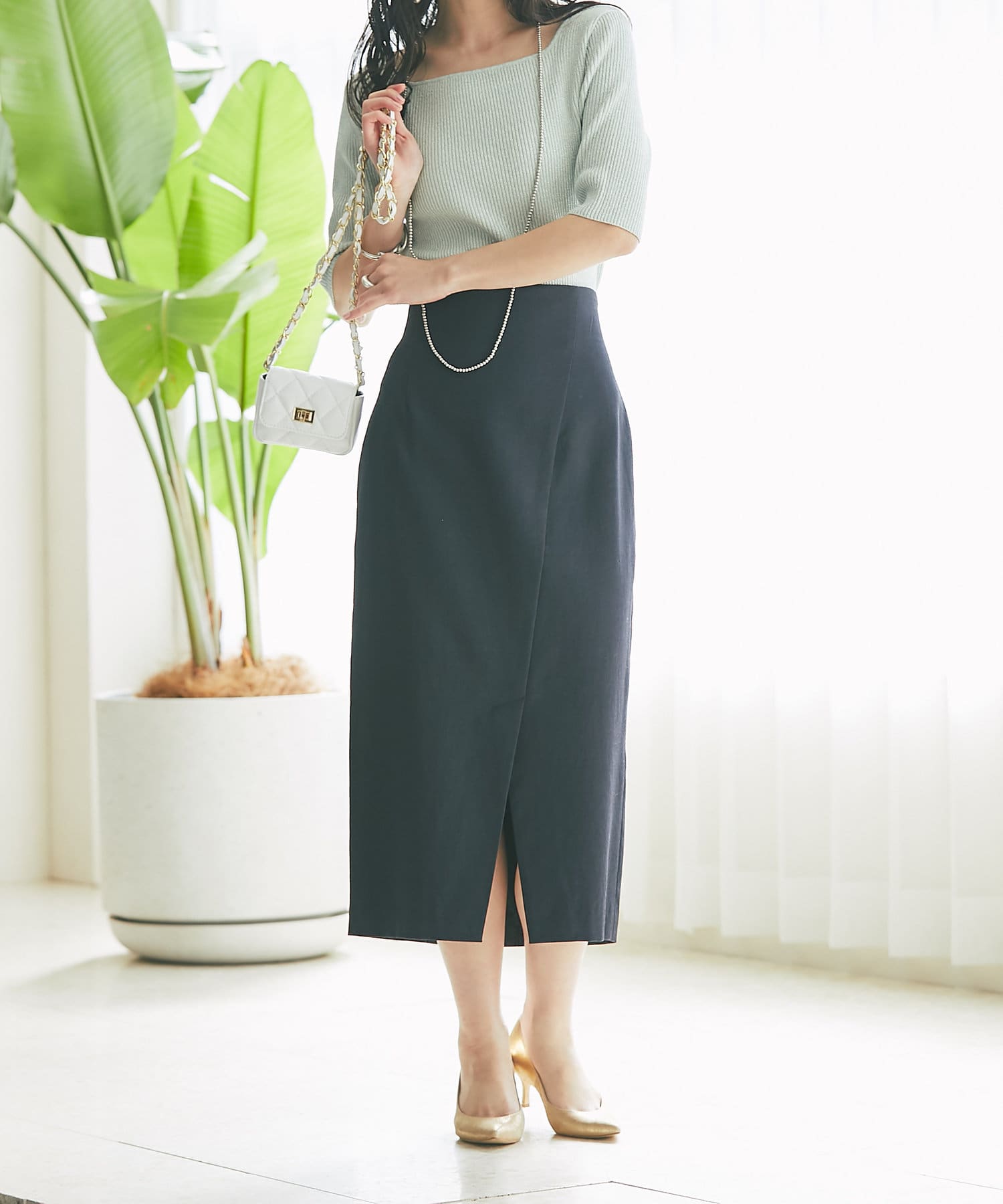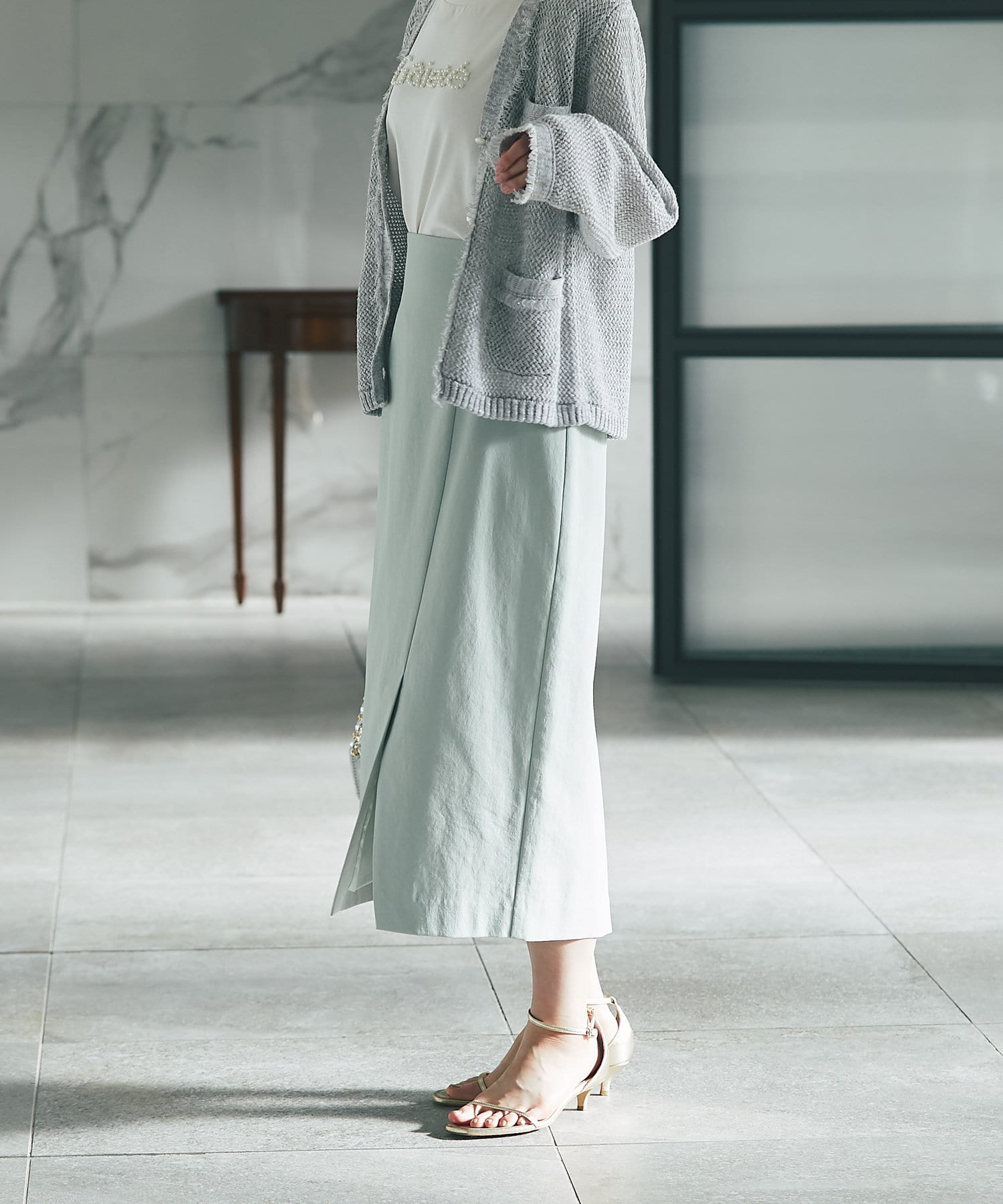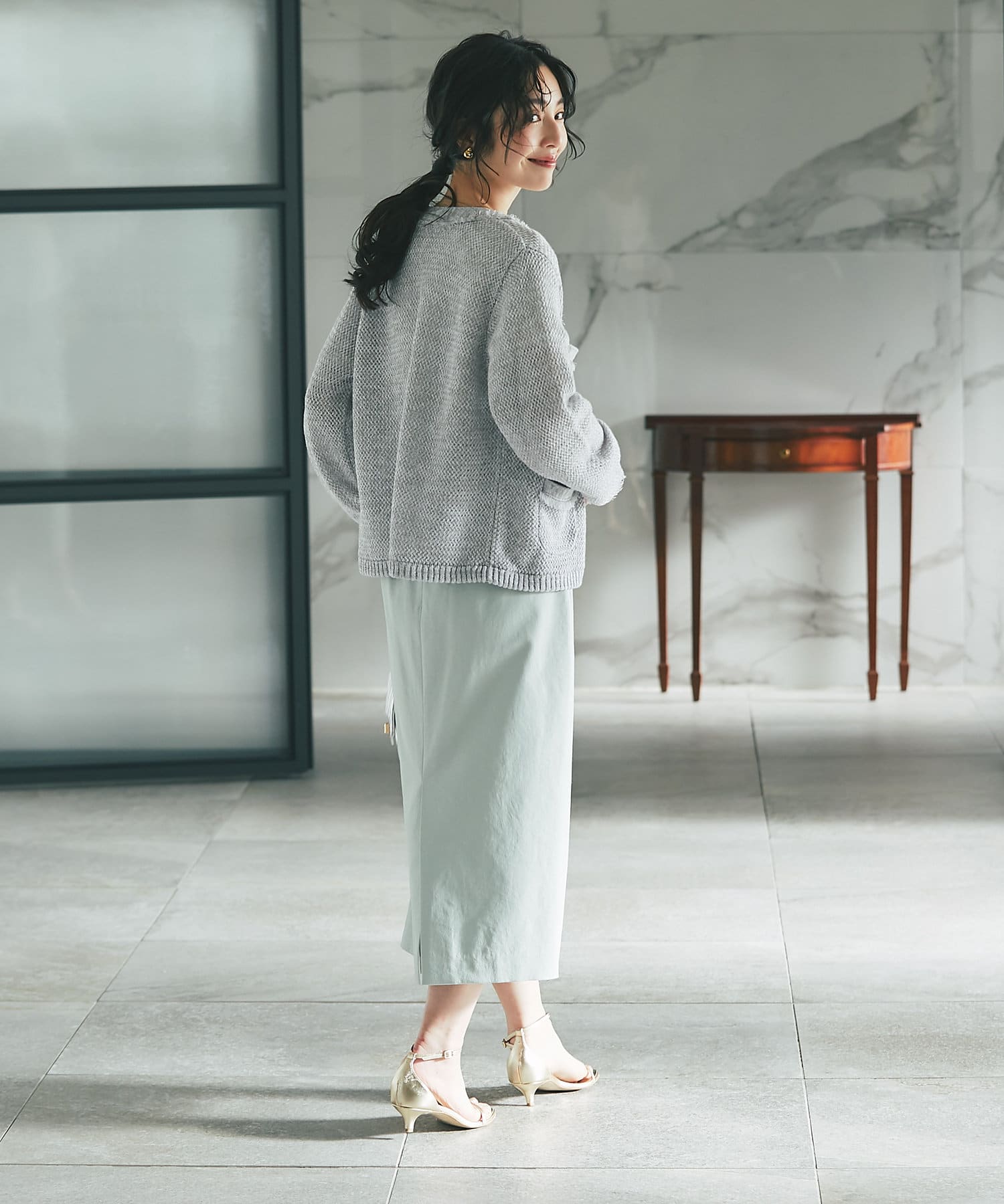 身体のラインを拾いすぎず、スリム見えするナロースカート。
