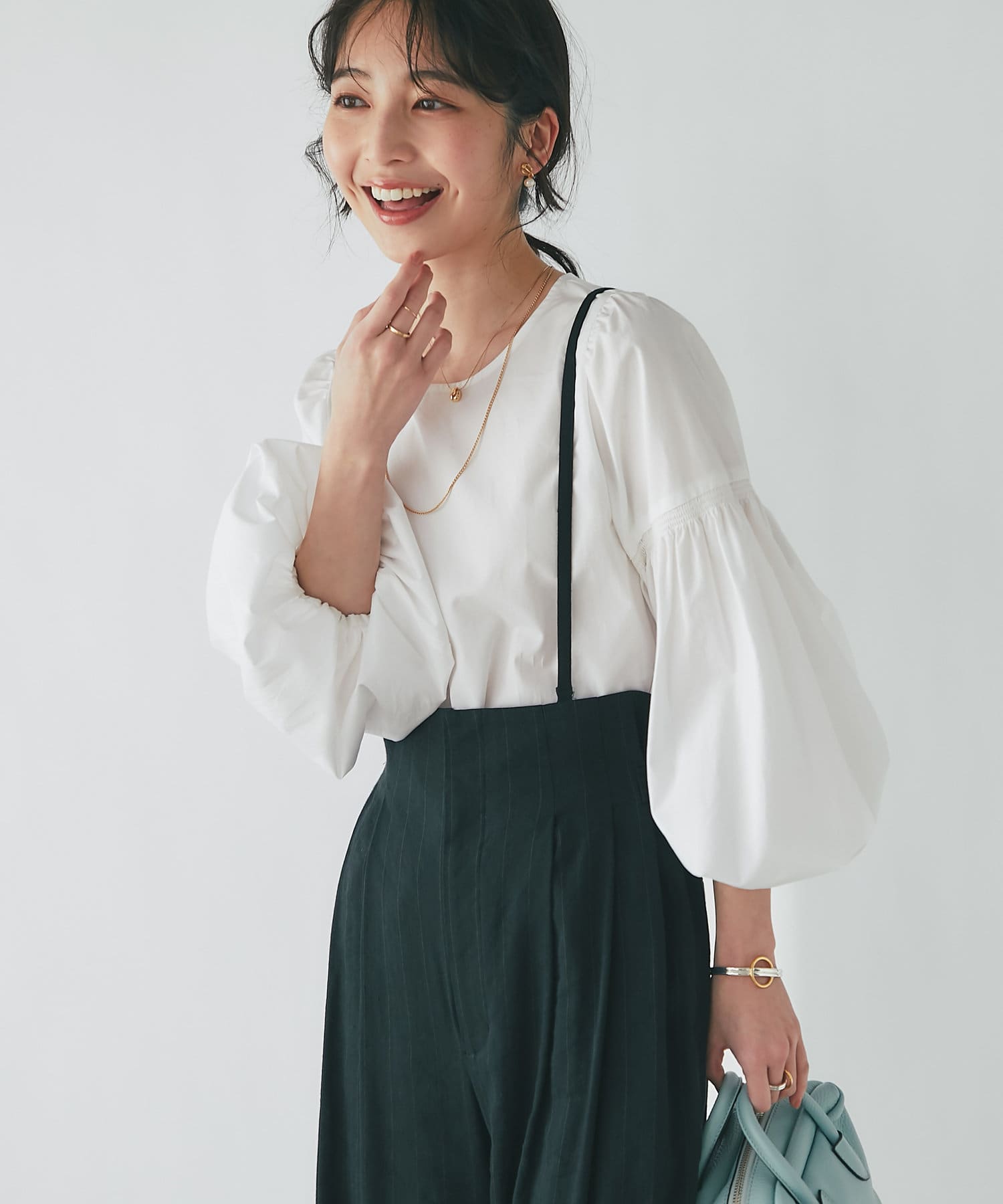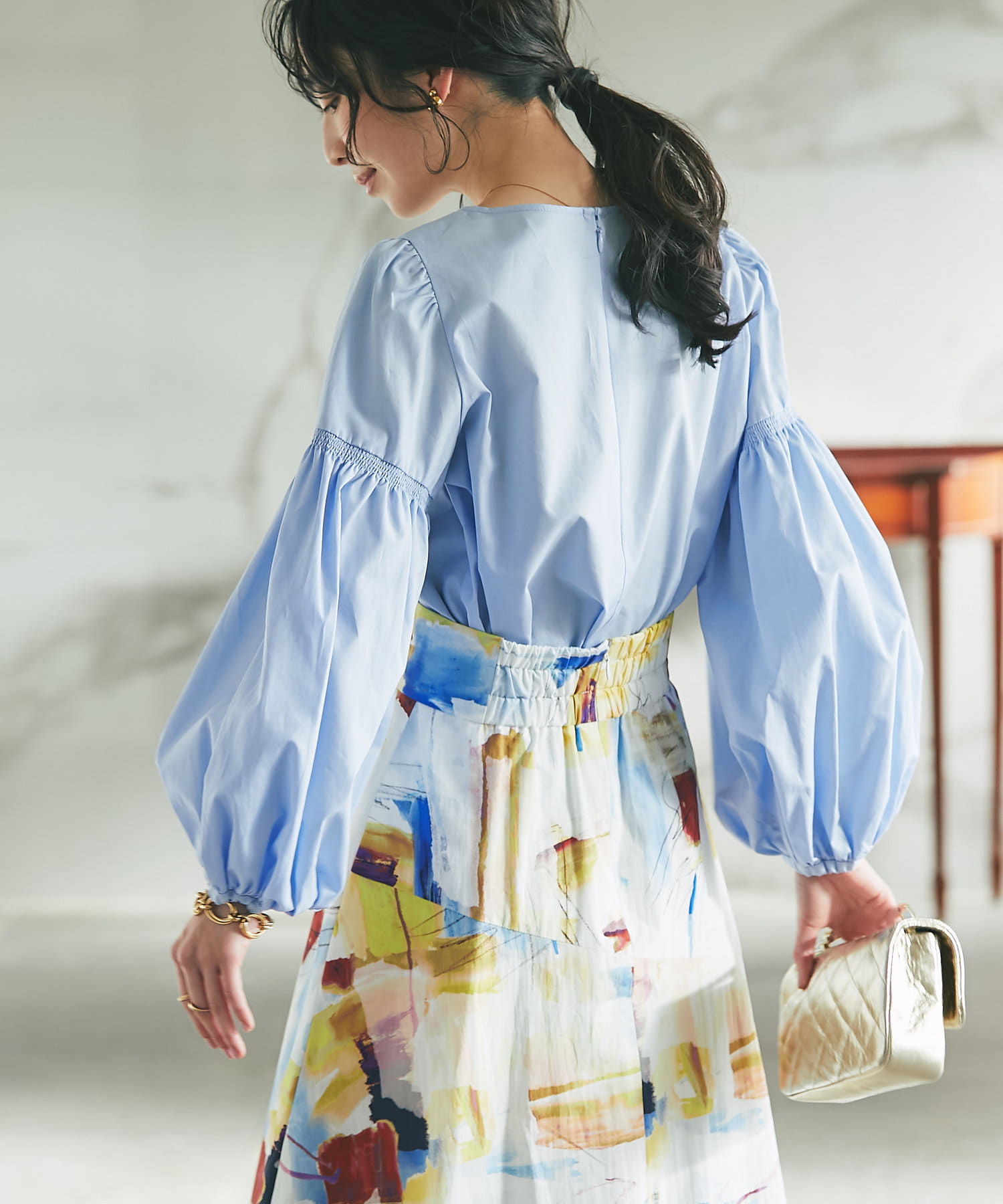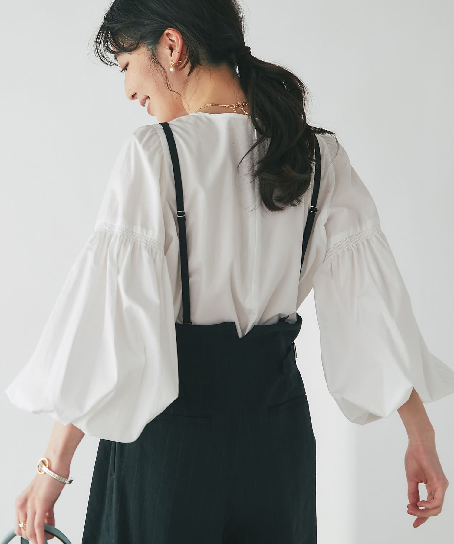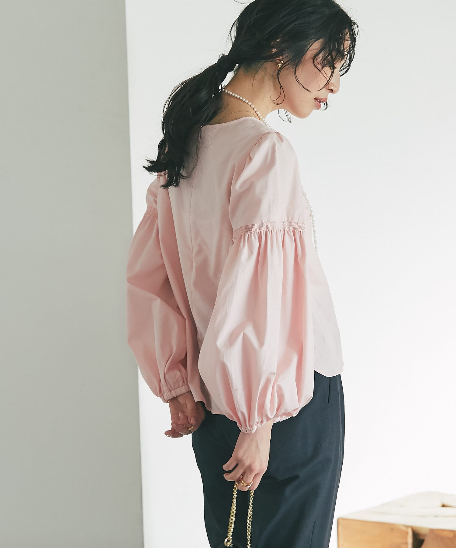 ふんわりとしたバルーンスリーブが目を引くデザインブラウス