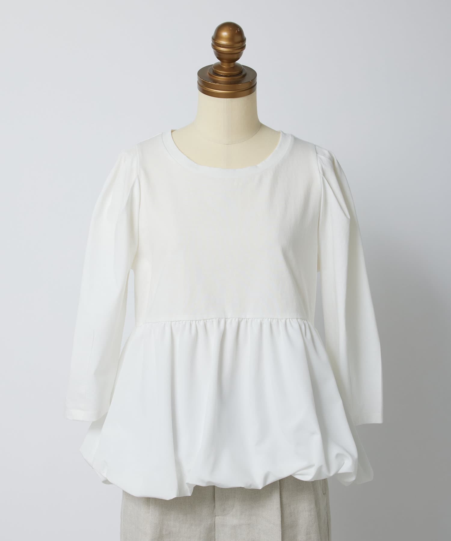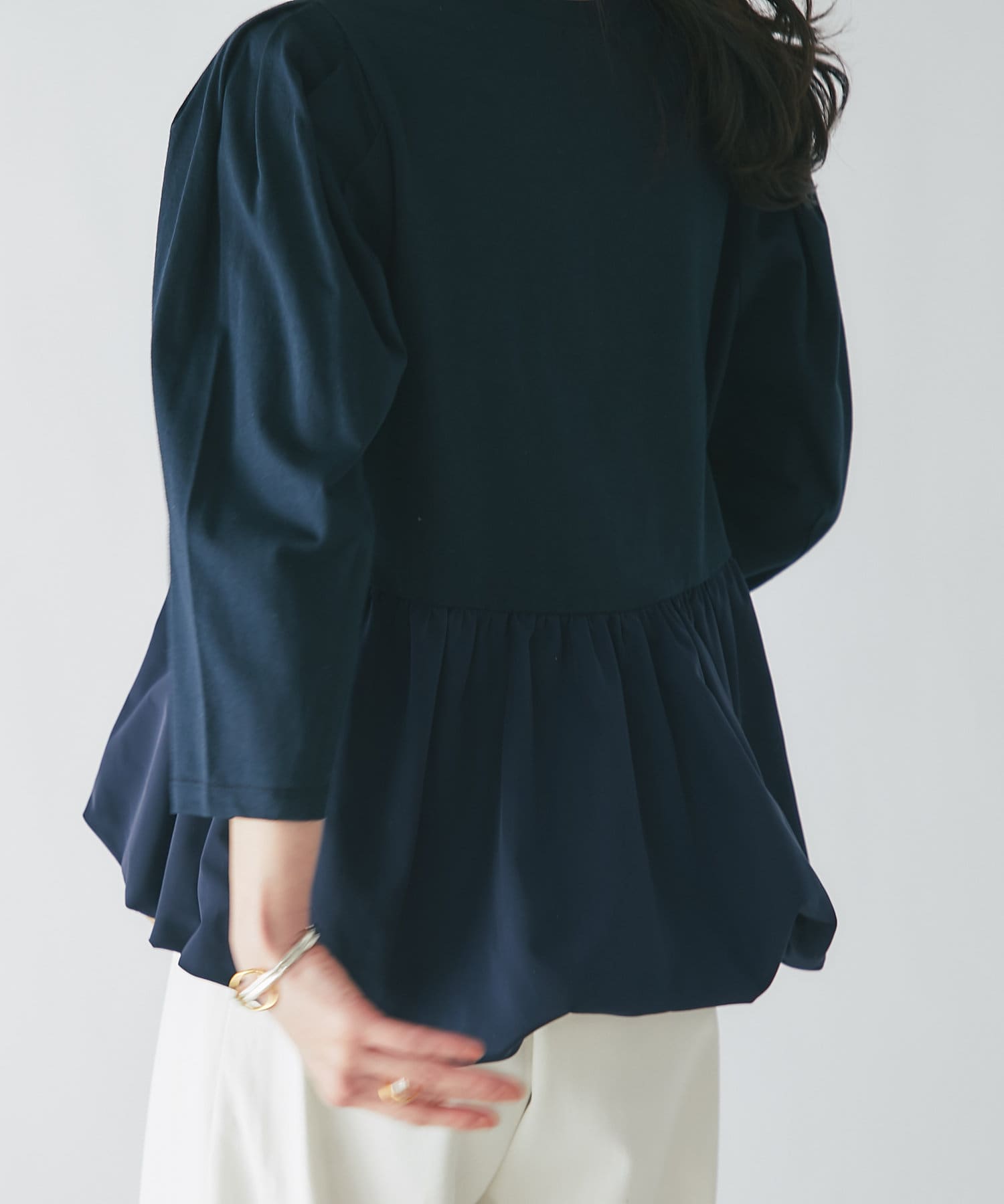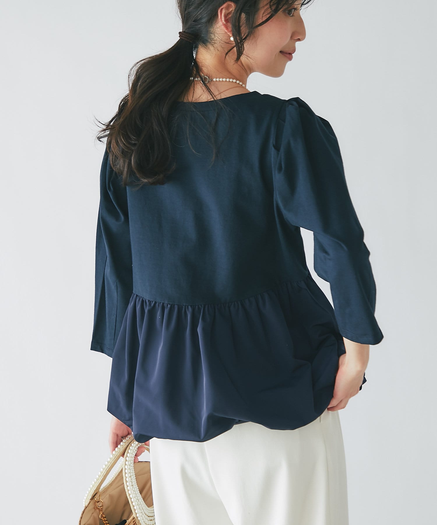 異素材の布帛生地をドッキングさせたペプラムカットソーです。