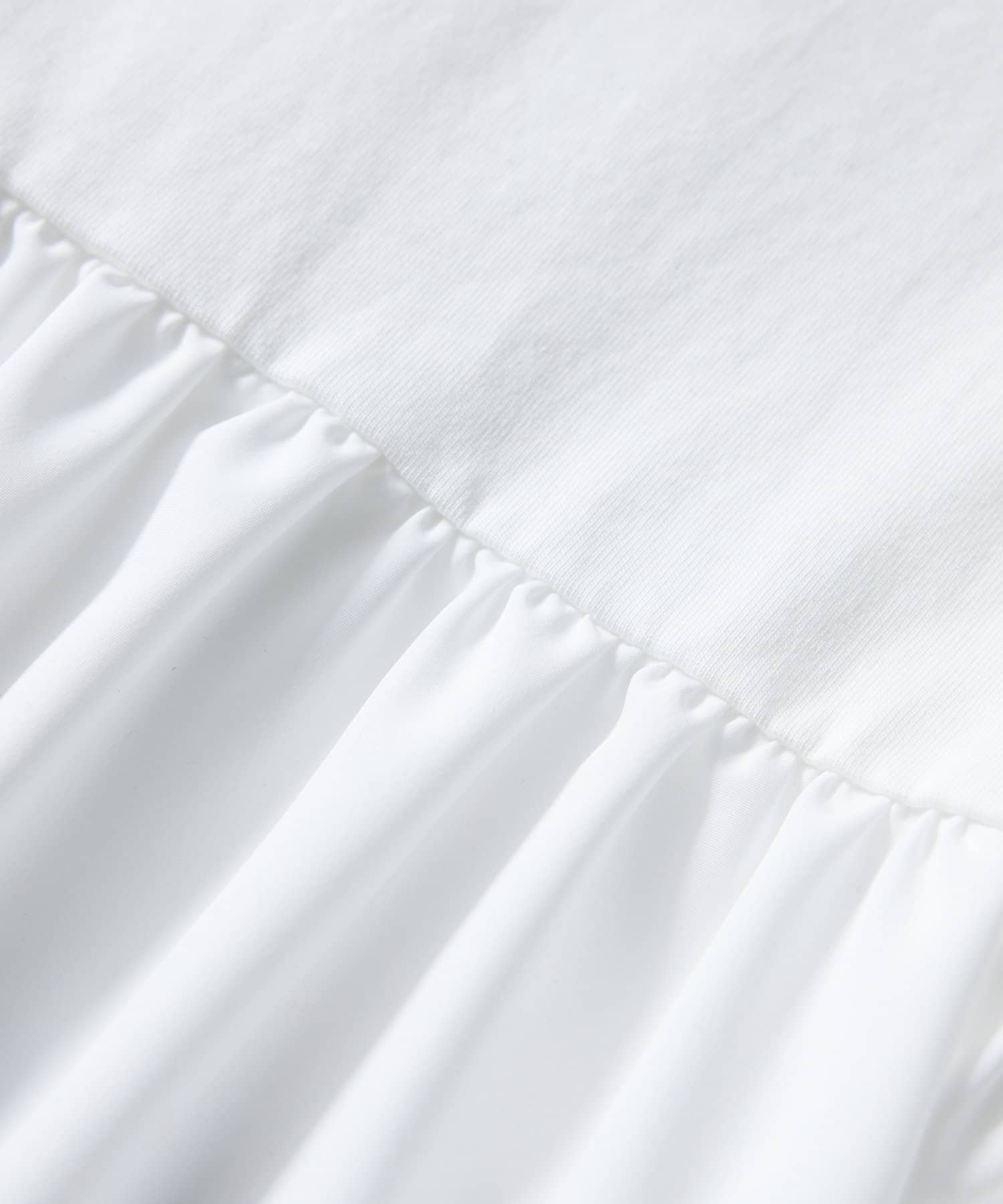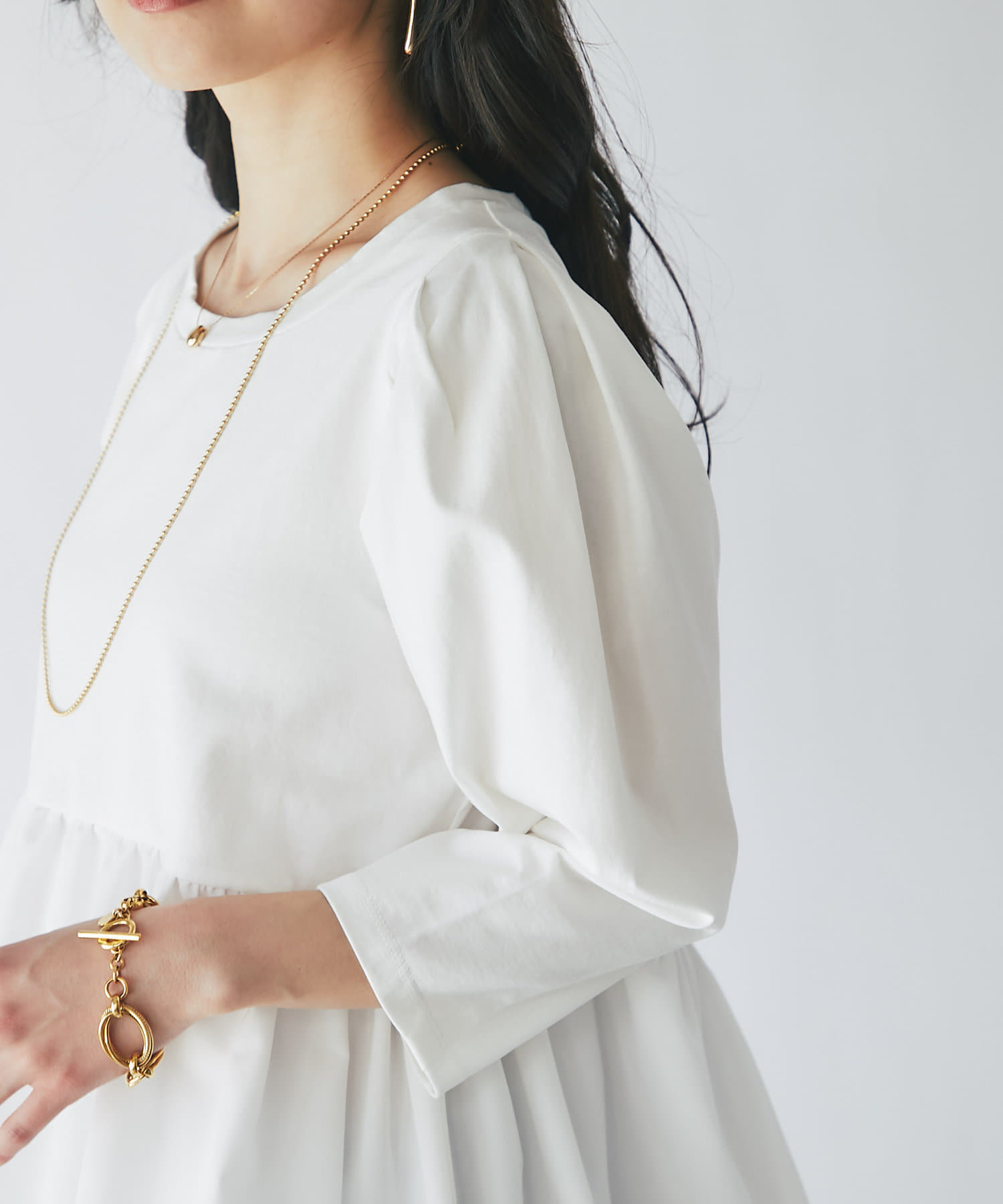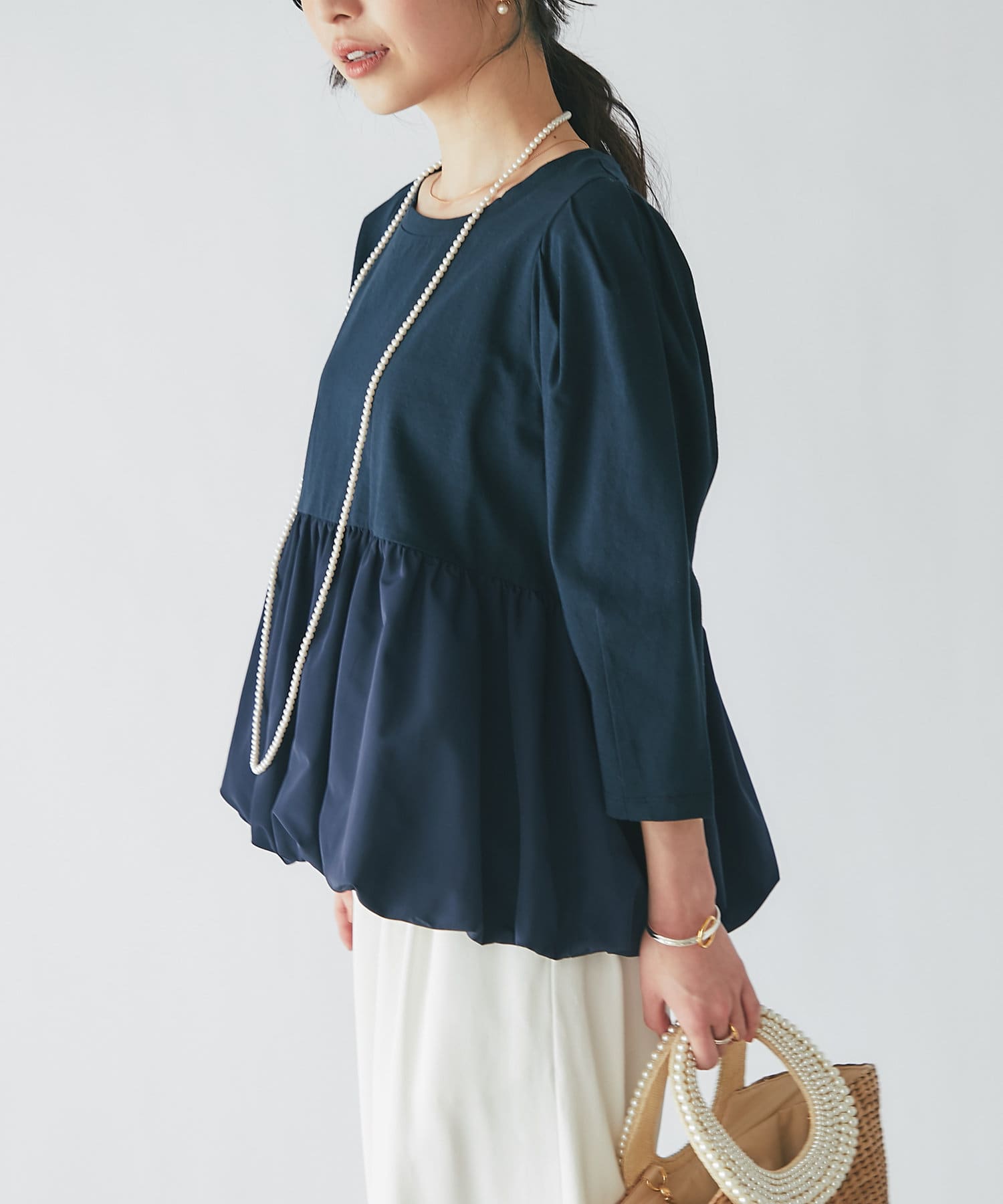異素材の布帛生地をドッキングさせたペプラムカットソーです。