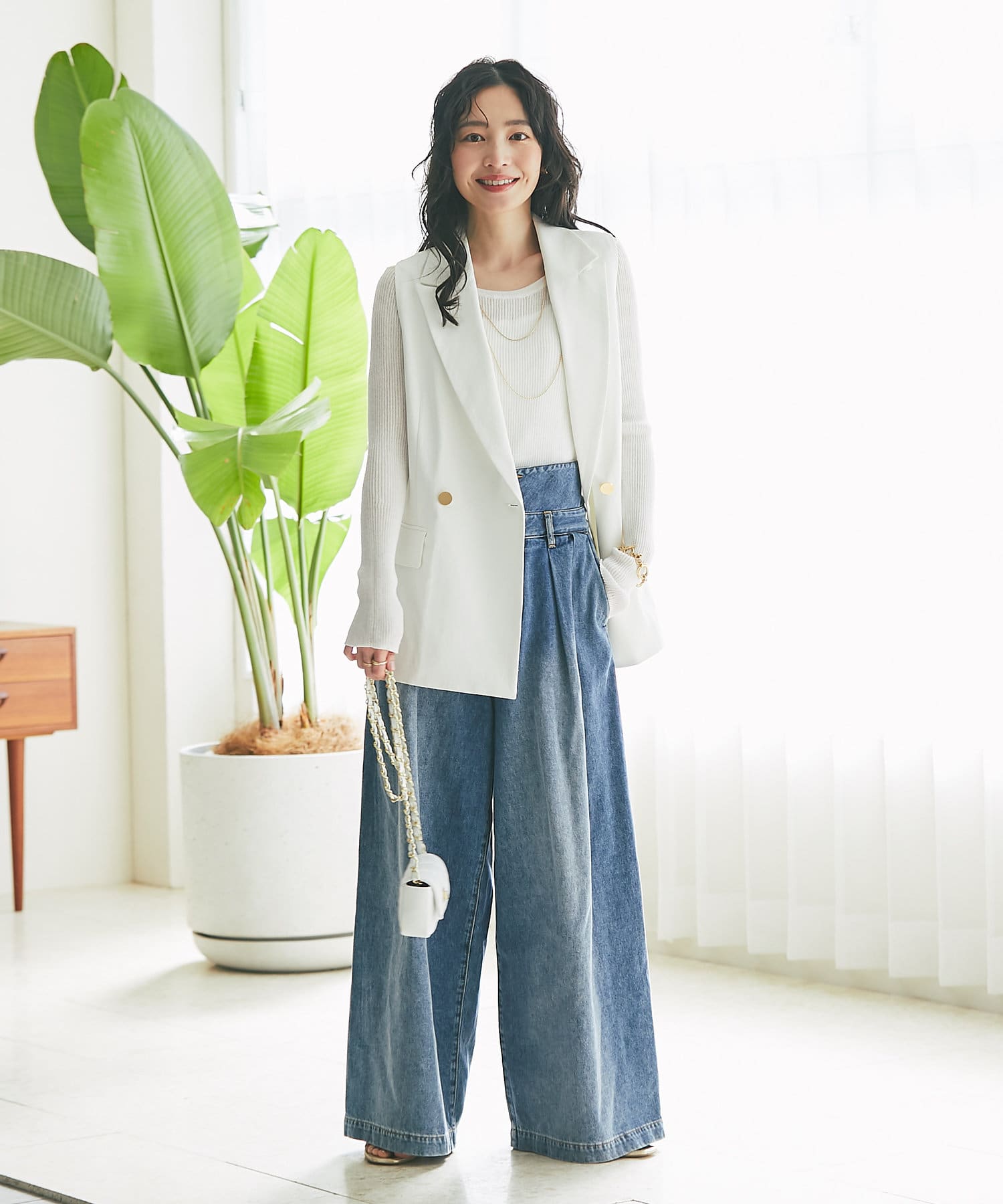 デニムやTシャツなどのカジュアルなアイテムと合わせると抜け感が出て大人のカジュアルスタイルに。