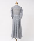 シャツカラーのパワショルスリーブにスカート部分はアシメのラッフルでカシュクール風。