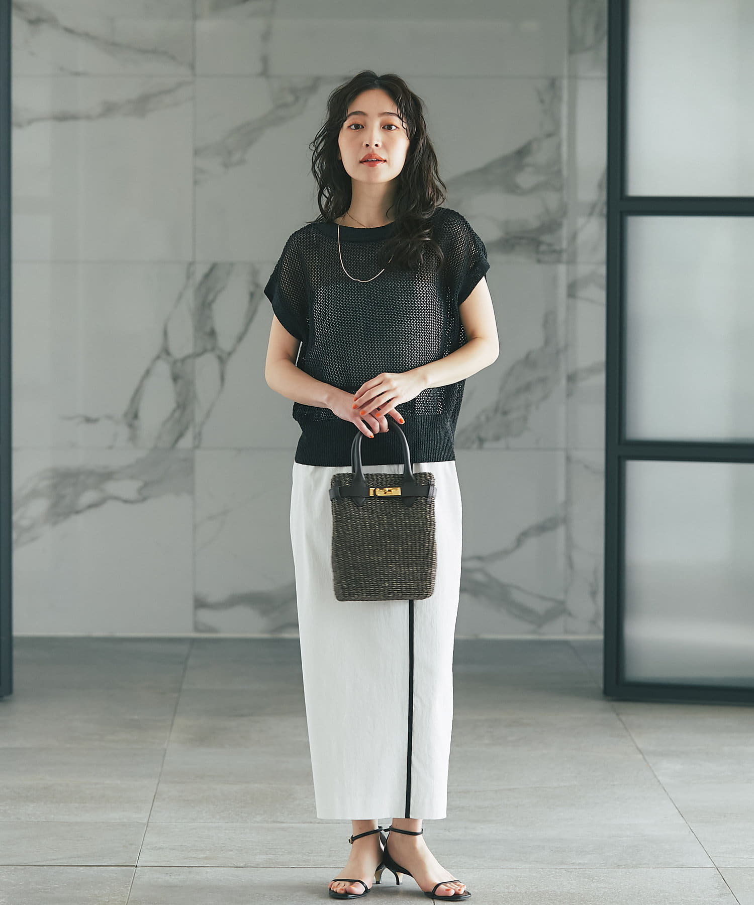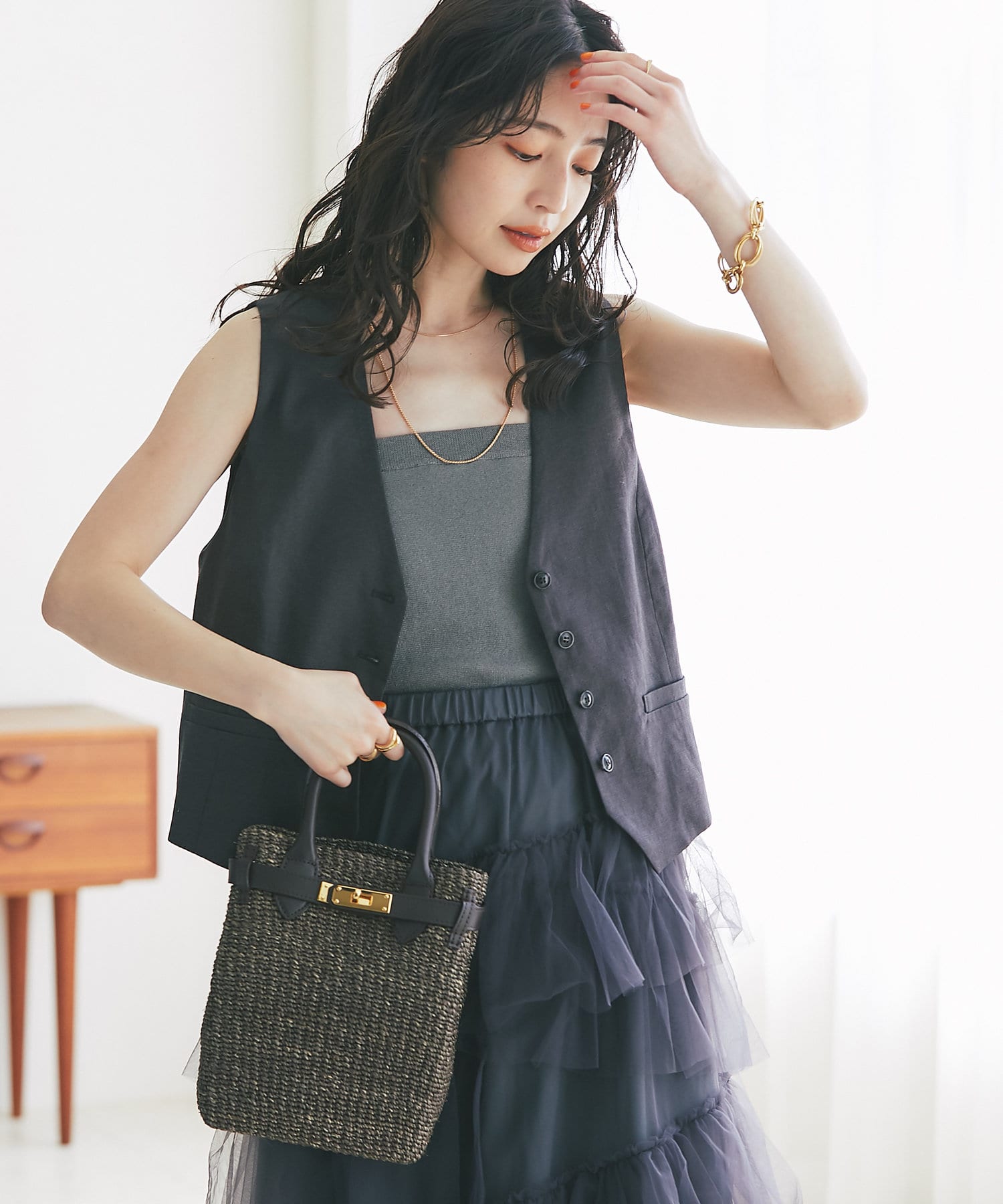 かごバッグならではのカジュアルさと、ゴールドの金具が上品さを演出し