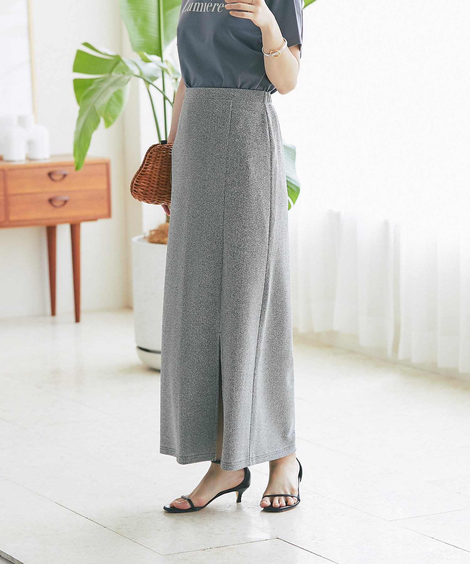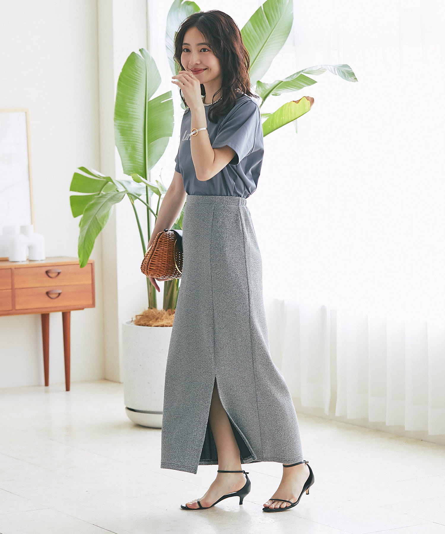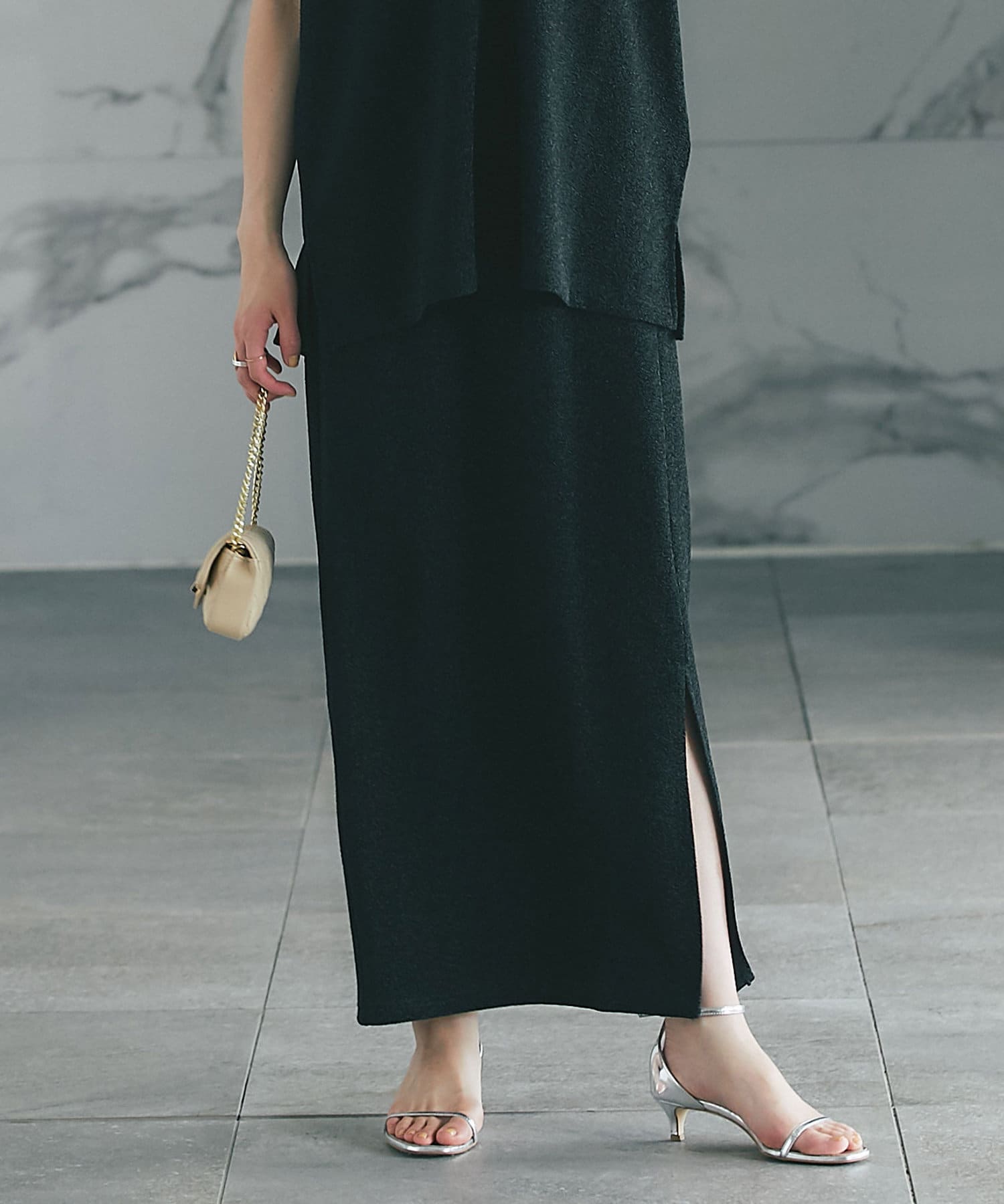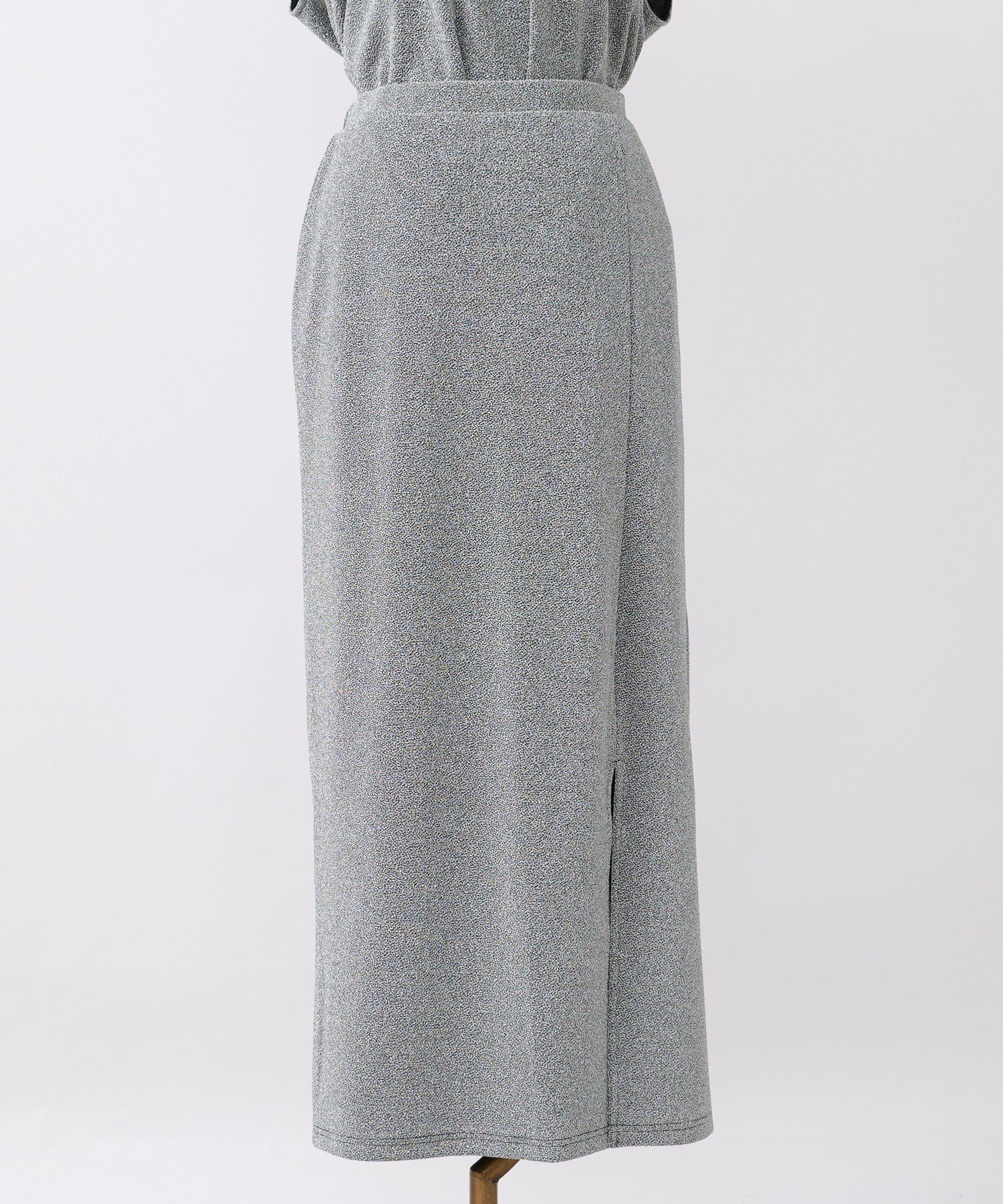 スタイリングのアクセントになるラメ素材を使用したナローシルエットのスカートです。