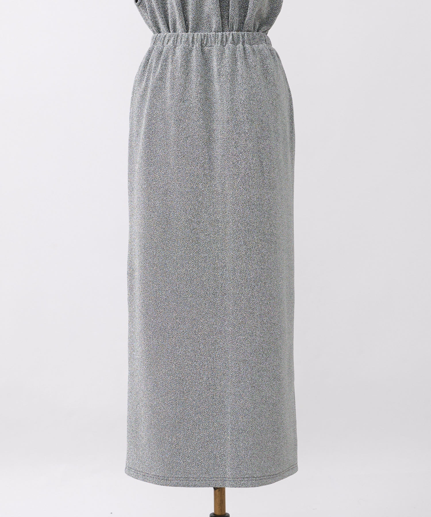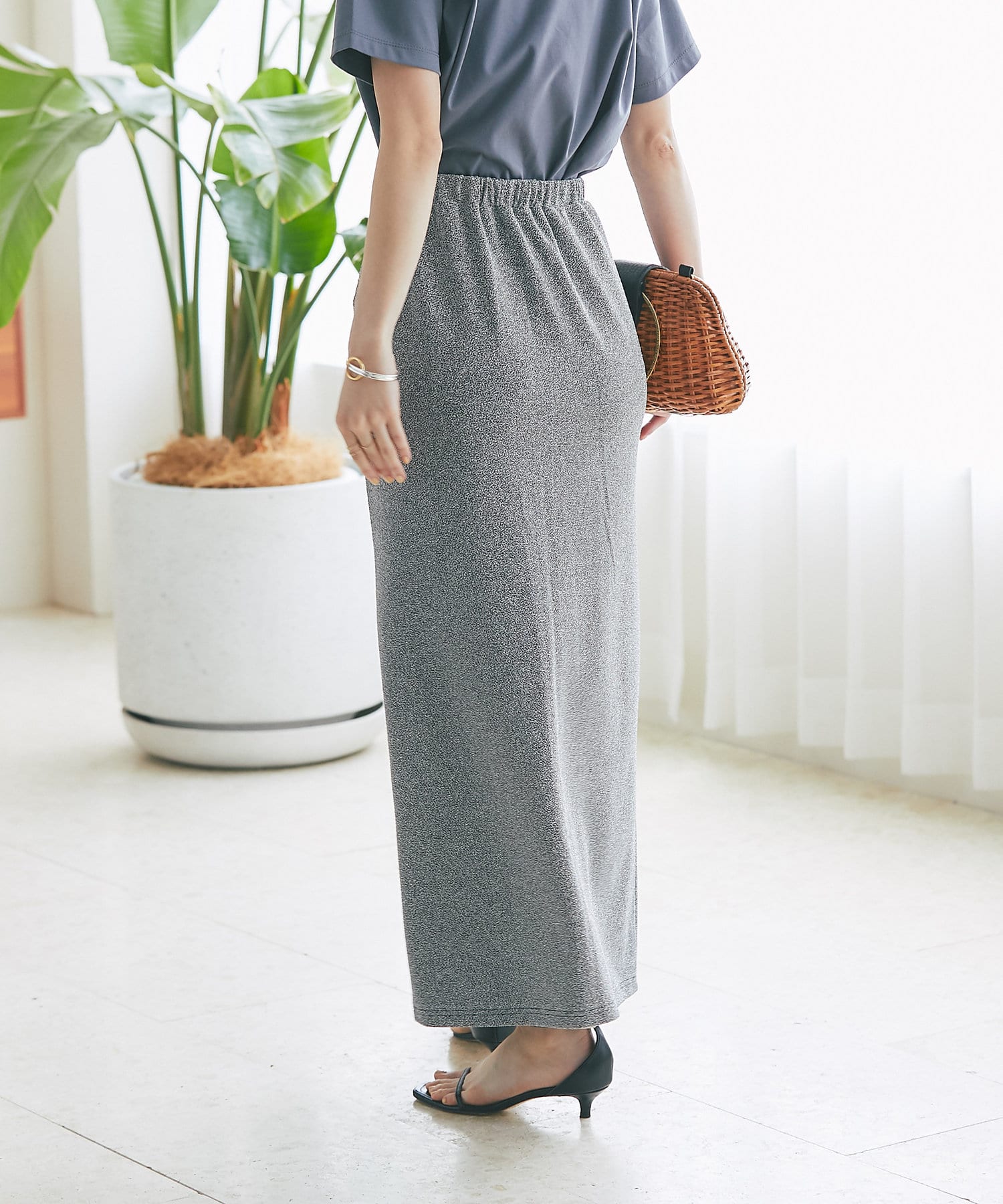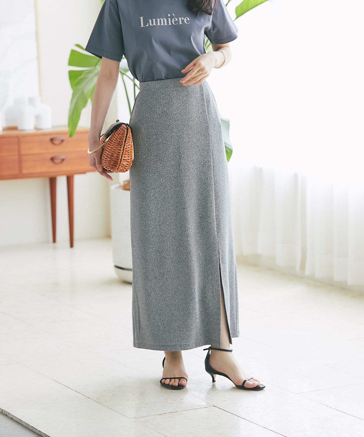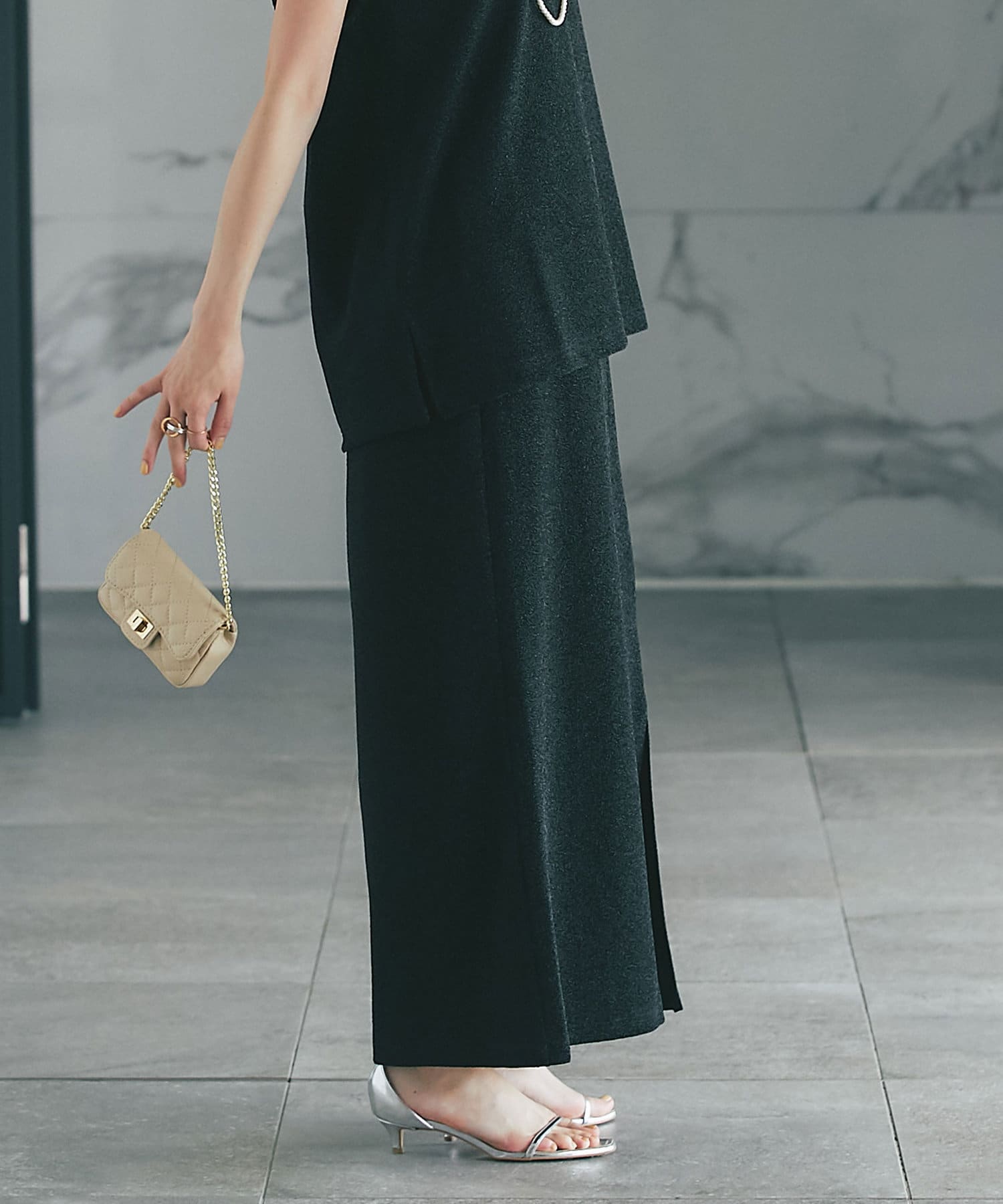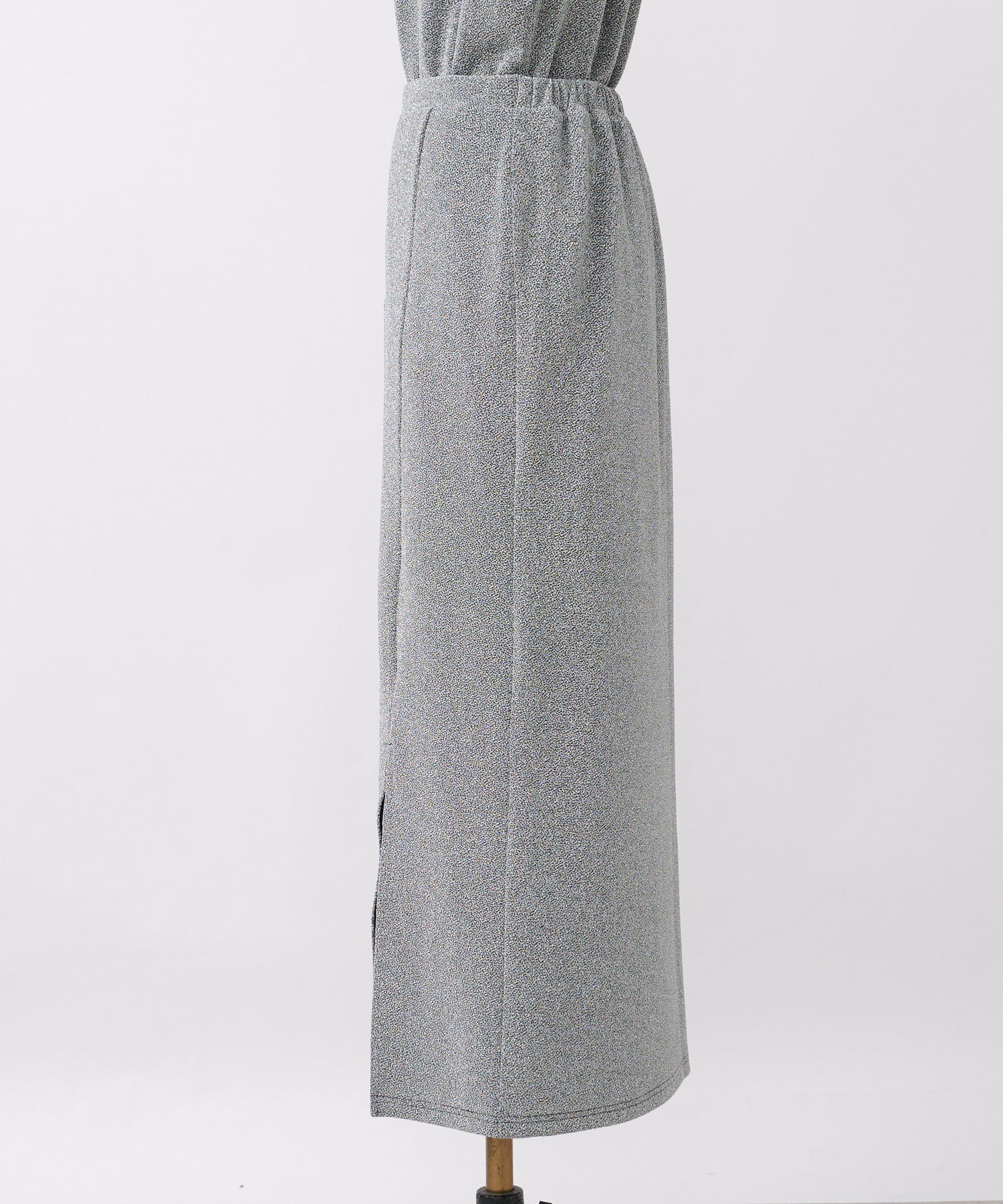 スタイリングのアクセントになるラメ素材を使用したナローシルエットのスカートです。
