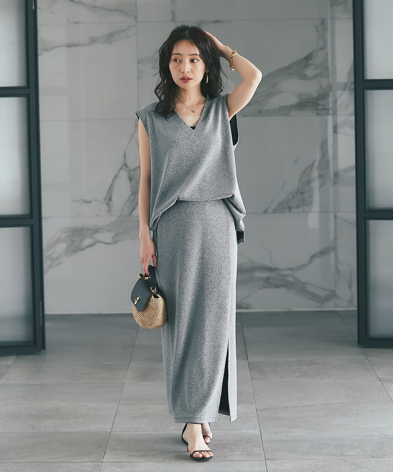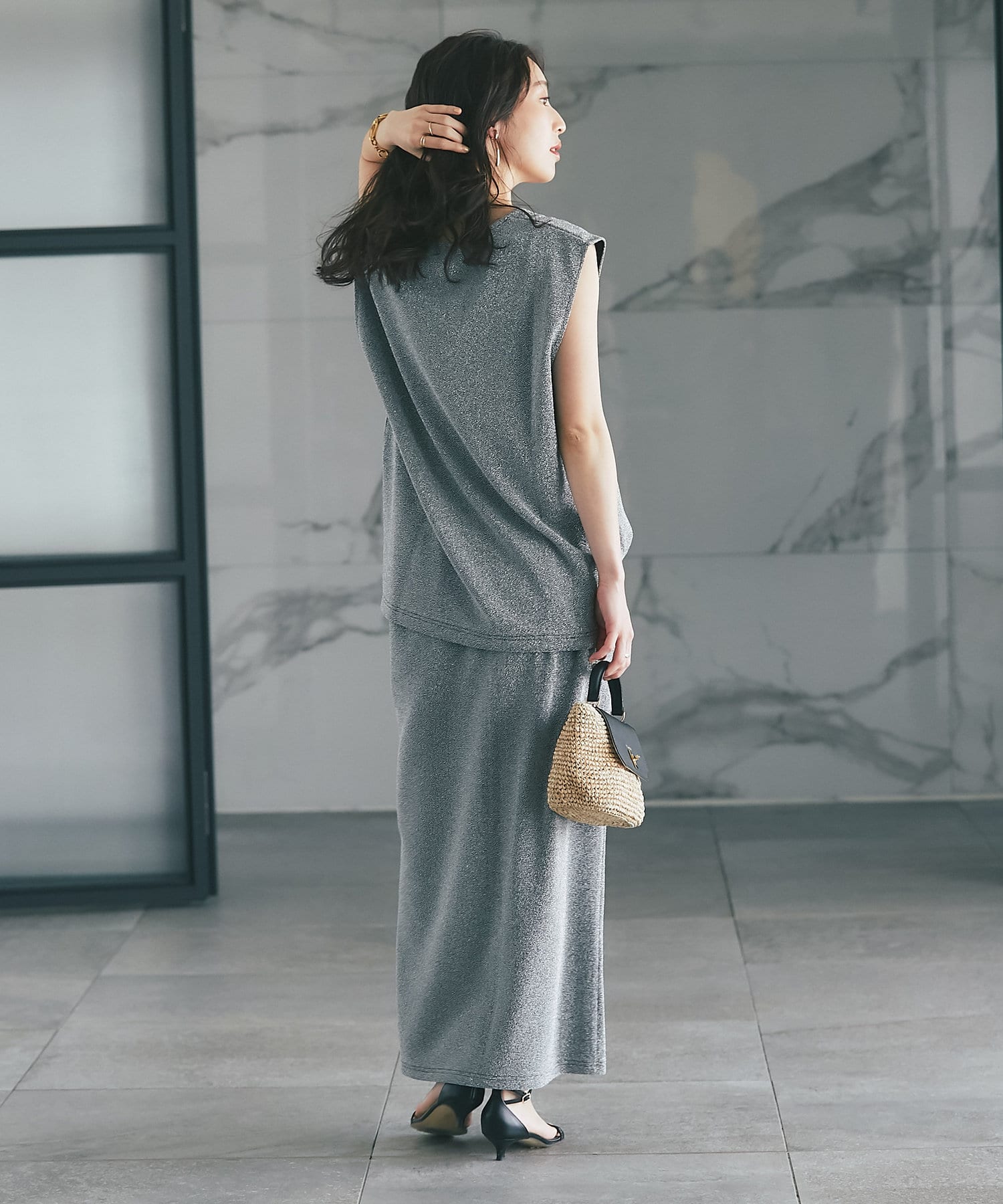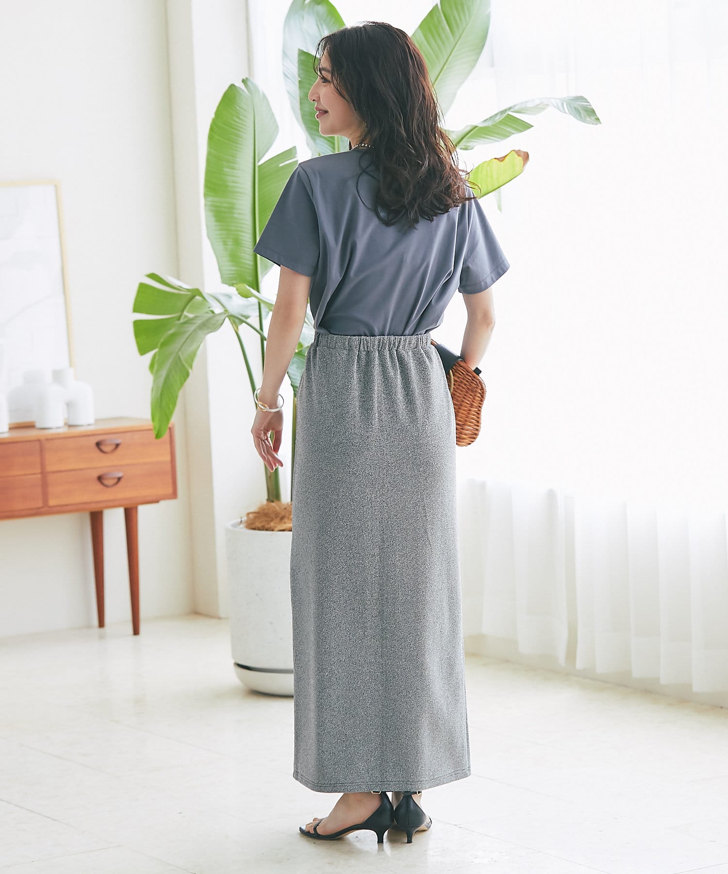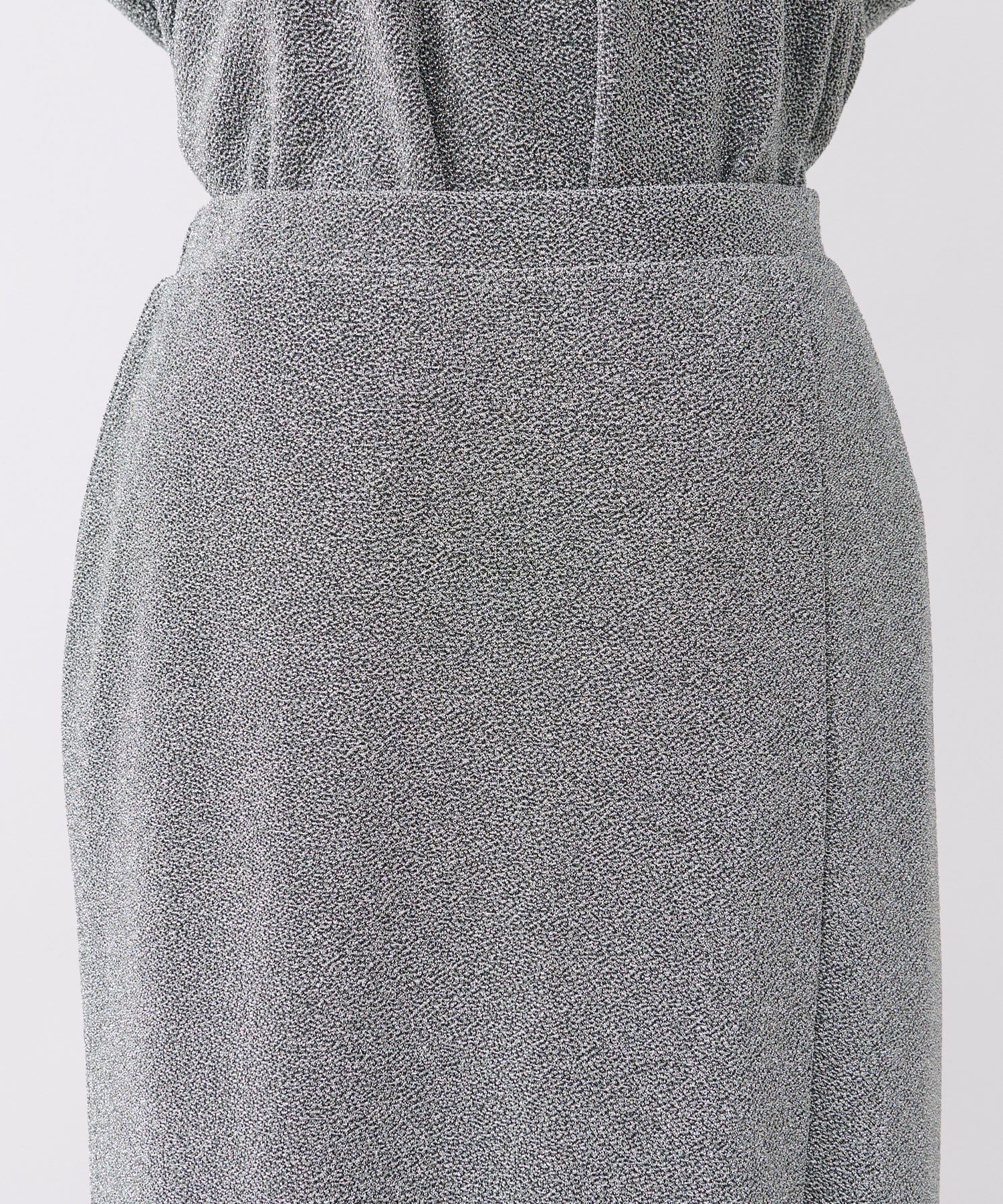スタイリングのアクセントになるラメ素材を使用したナローシルエットのスカートです。