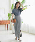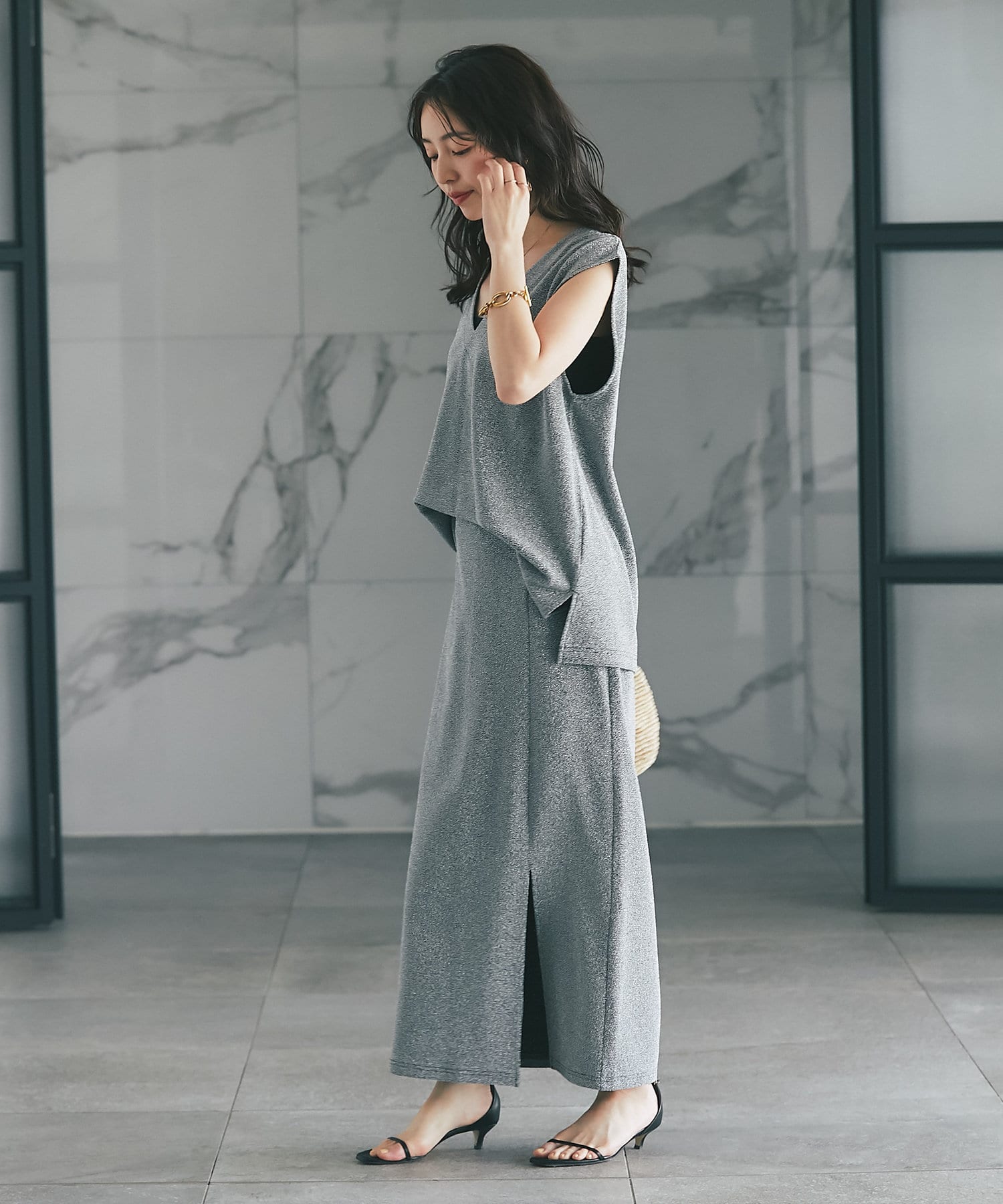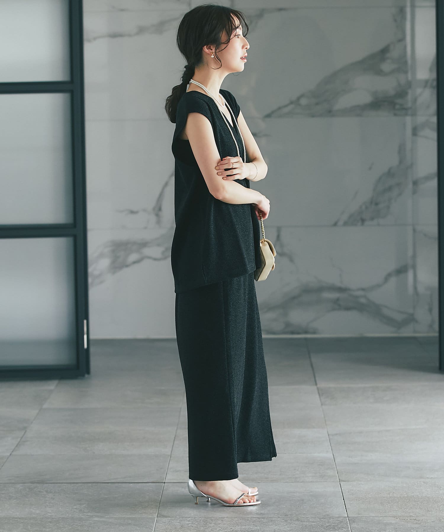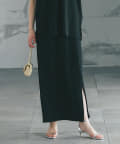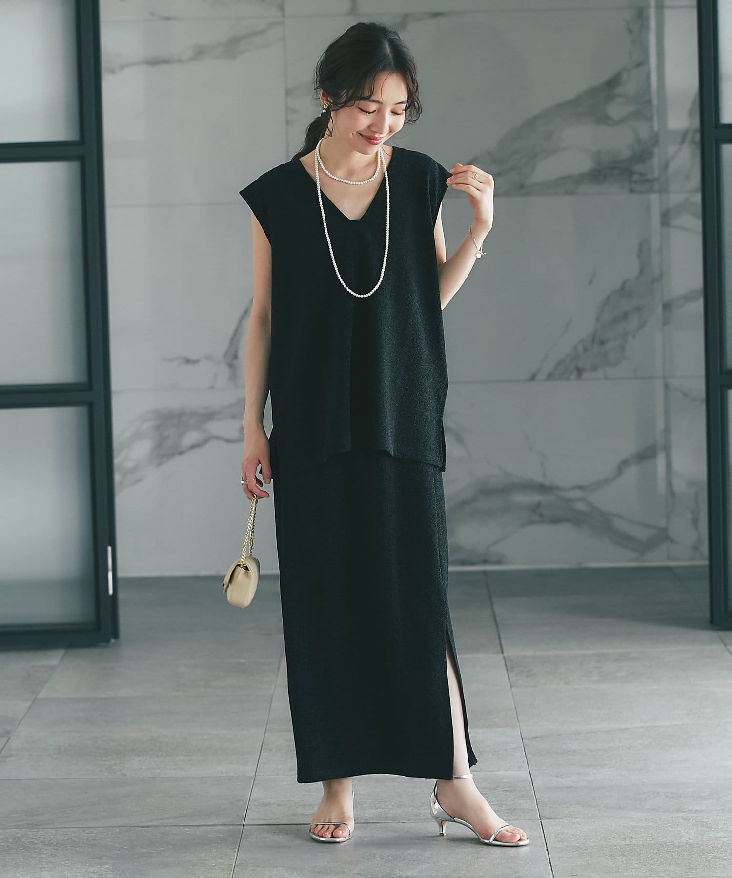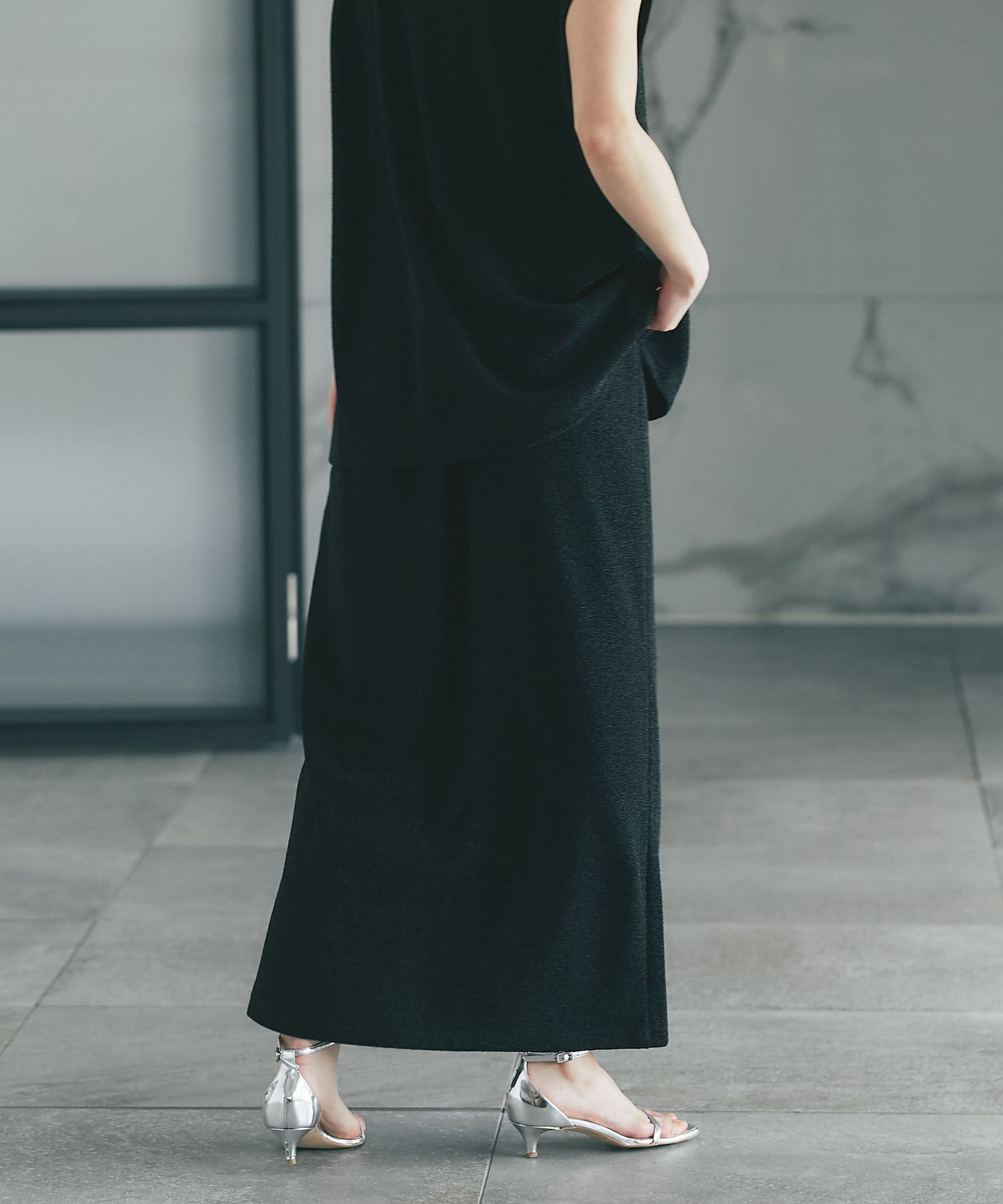 スタイリングのアクセントになるラメ素材を使用したナローシルエットのスカートです。